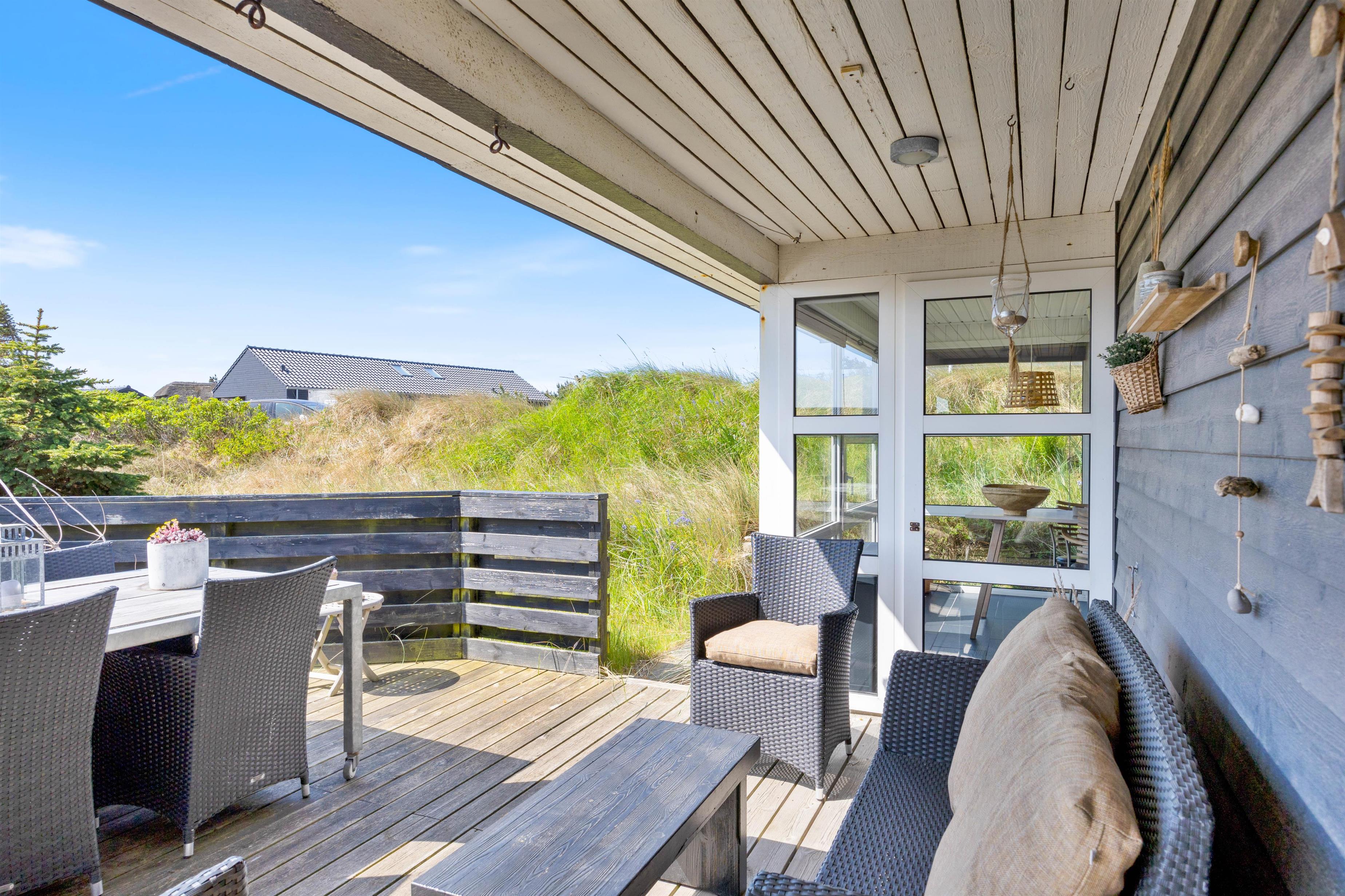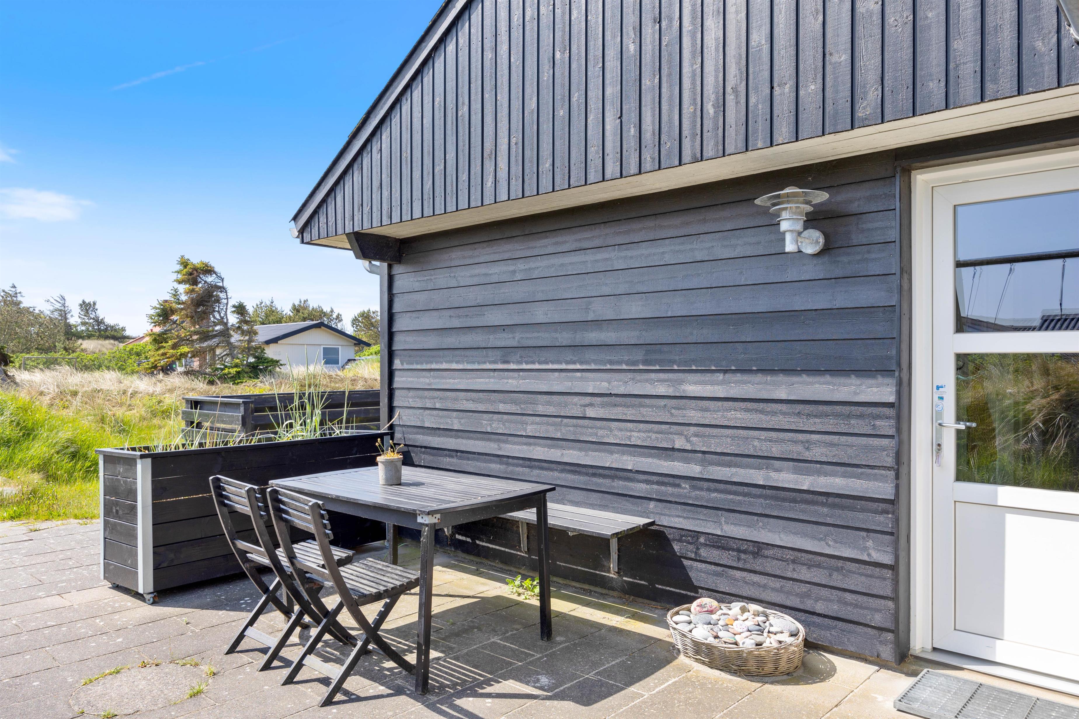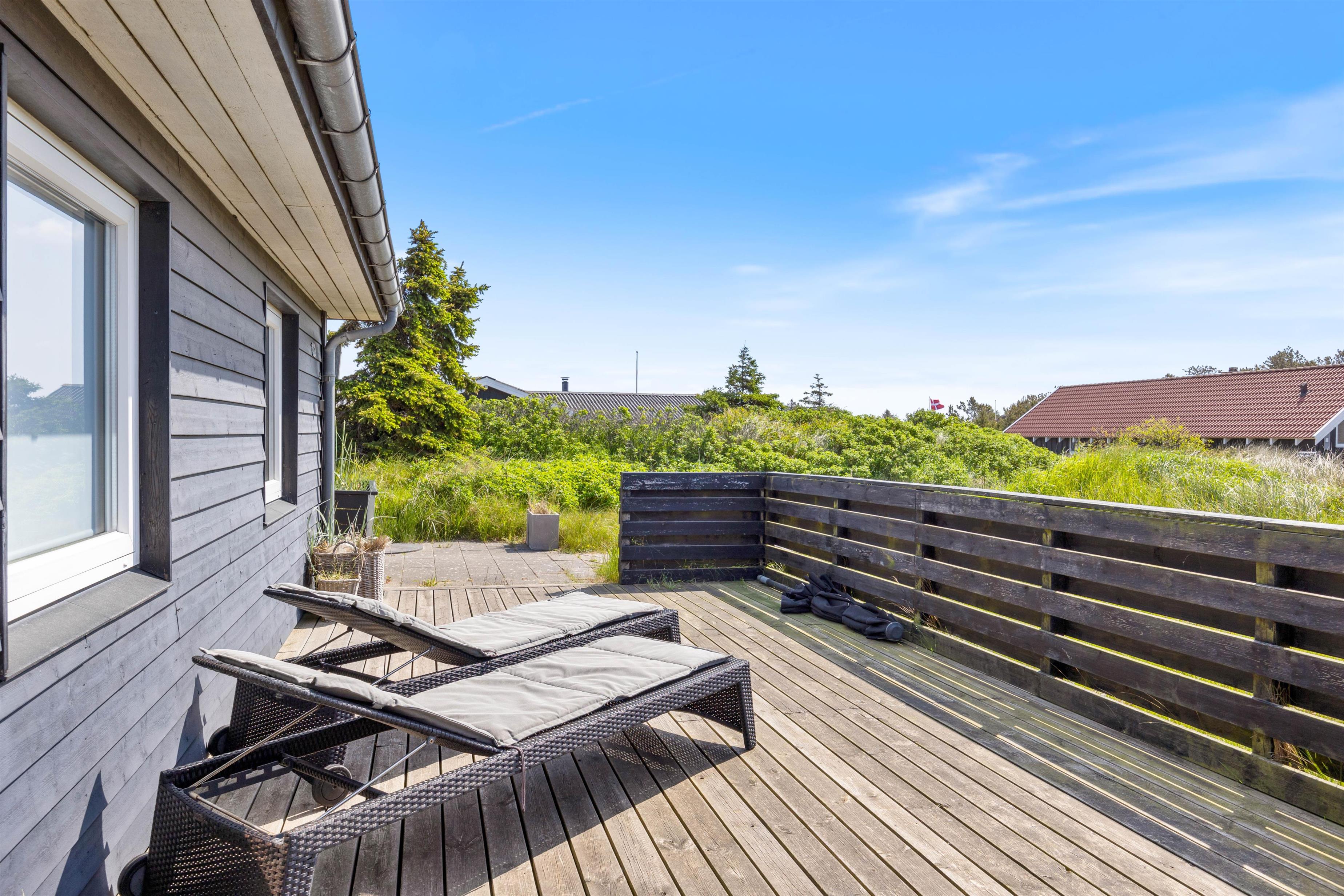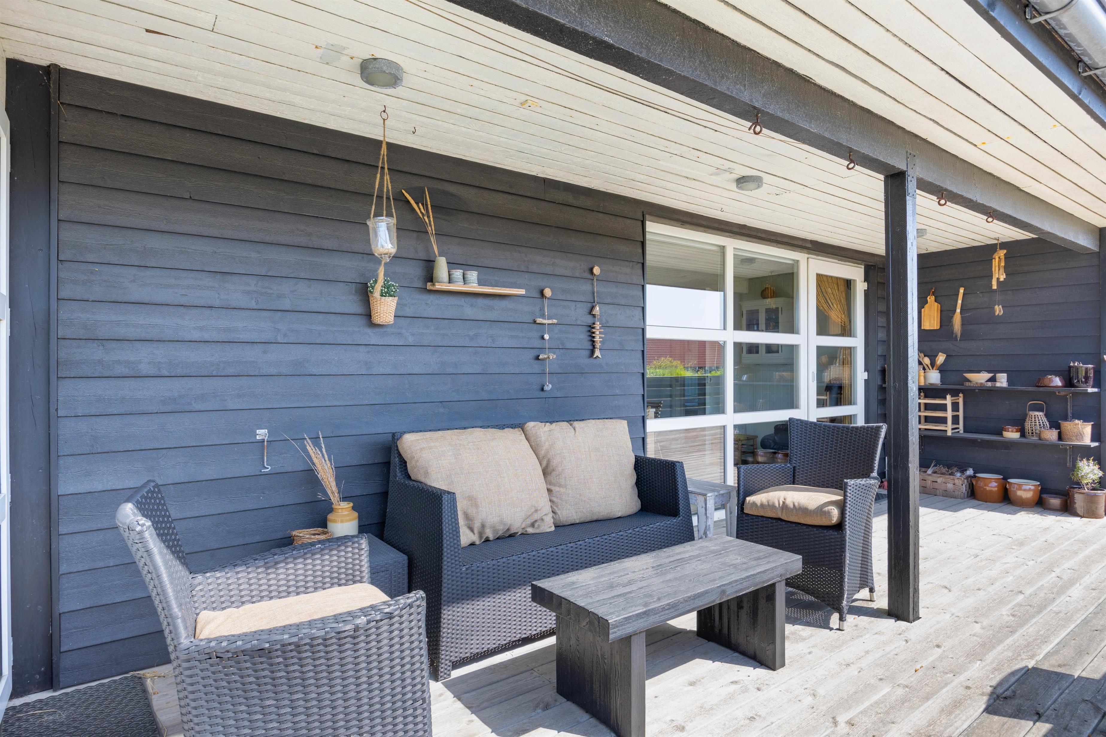 Udenfor husets vægge er der også flere muligheder for afslapning. Huset har nemlig to terrasser. Den ene terrasse som vender mod øst er perfekt til at nyde solens stråler om morgenen og formiddagen. Denne terrasse kan også tilgås fra køkkenalrummet, og terrassen er udstyret med lille loungesofa, liggestole og andre begahagelige havemøbler. Den sydvendte terrasse er perfekt til sommeraftenerne. Her er der opsat noget stakit, der både sørger for læ og privatliv. Hvem vil ikke sidde her med sine nærmeste, og nyde noget godt at spise og kolde drikkevarer?