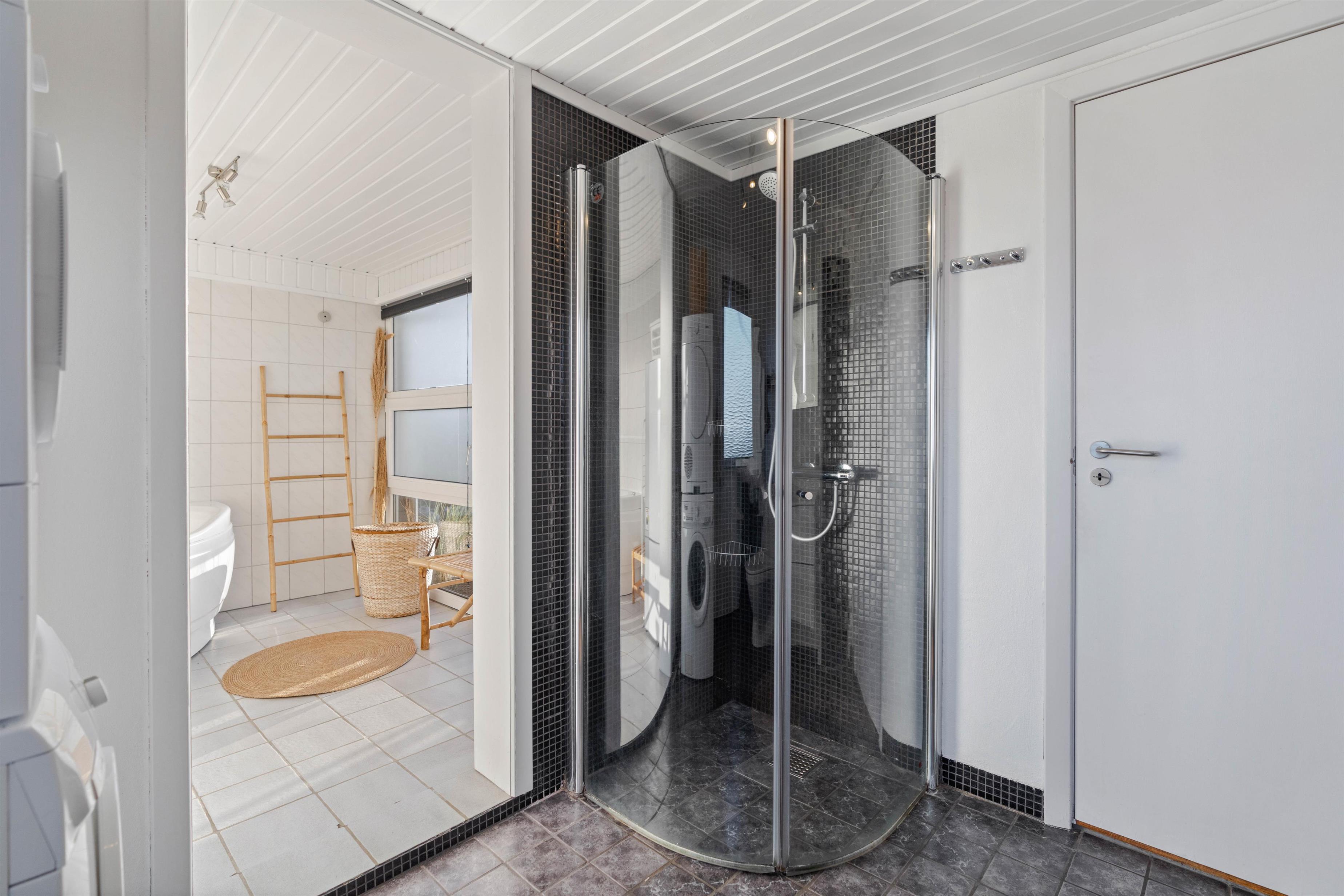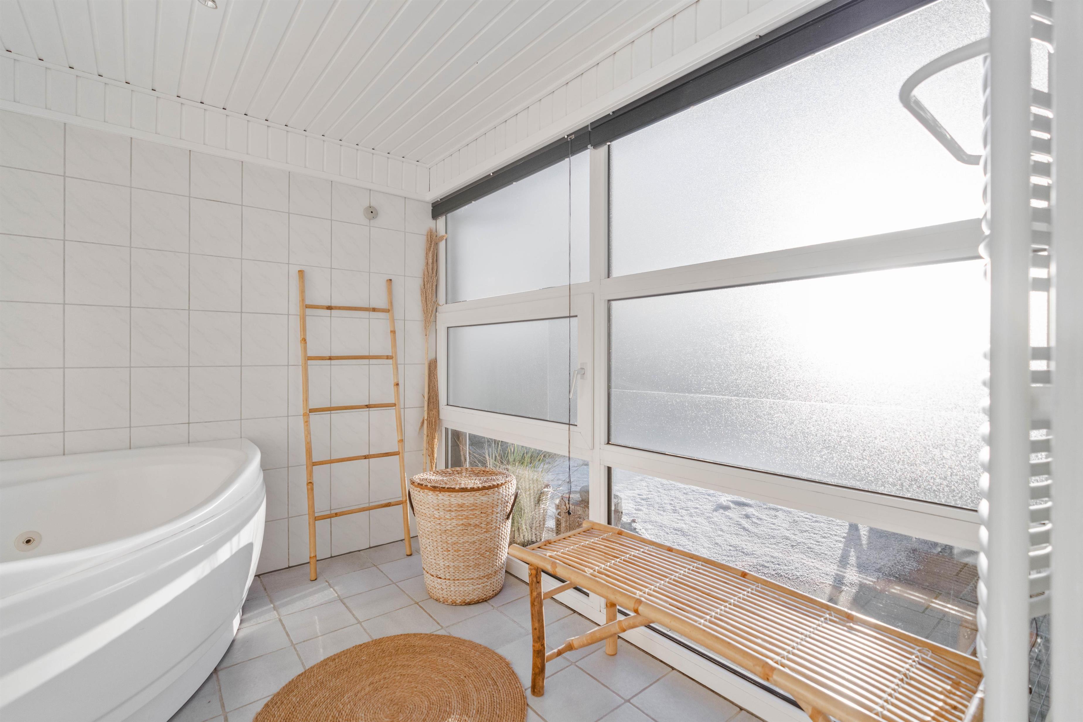 Husets badeværelse er med både sauna og spa. Her kan du sidde i det varme vand, mens du nyder udsigten gennem det store vinduer, der går fra gulv til loft. Det giver ro til både krop og sjæl. Saunaen garanterer også, at I kan slappe helt af og slippe væk fra hverdagens stress og jag.