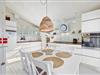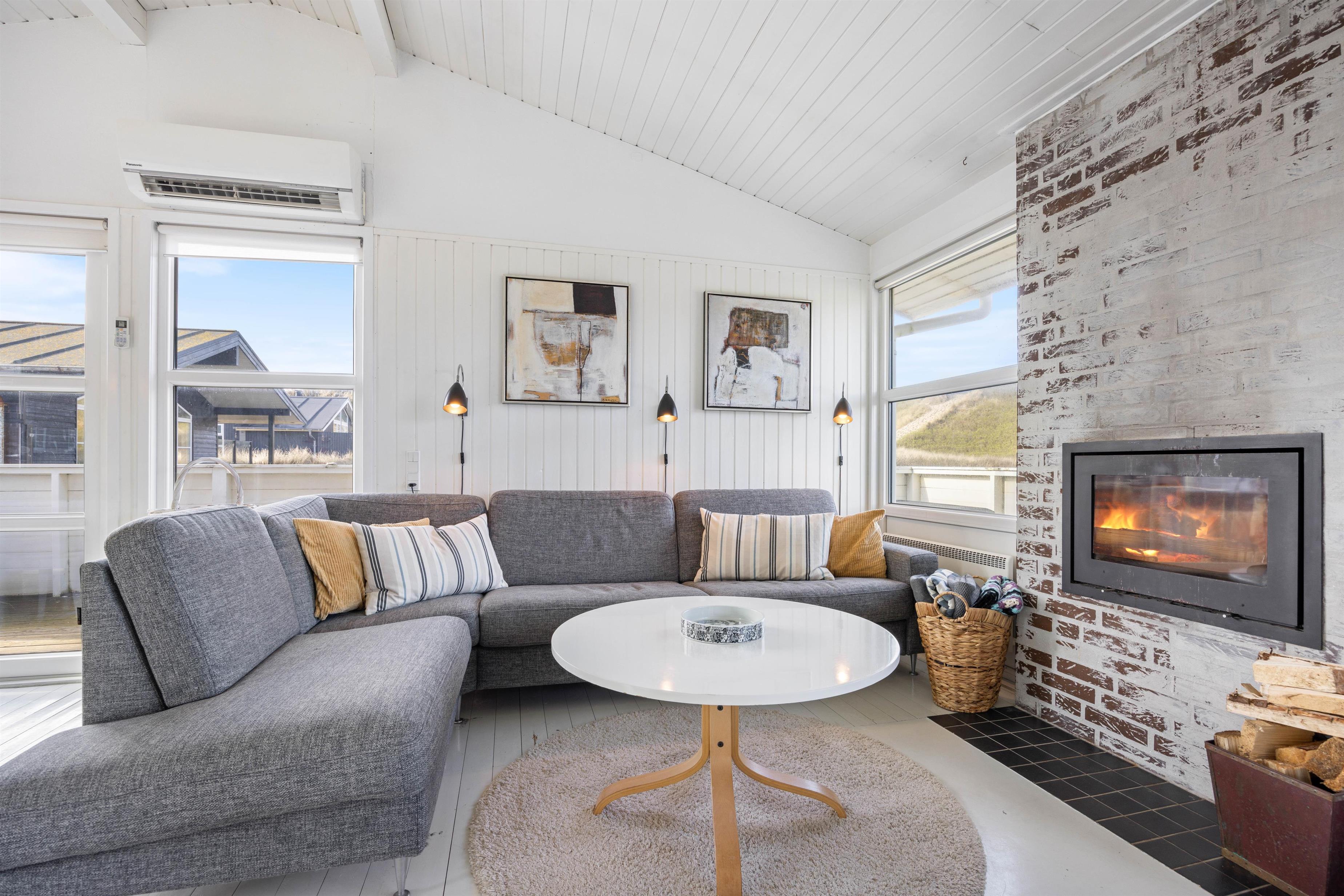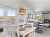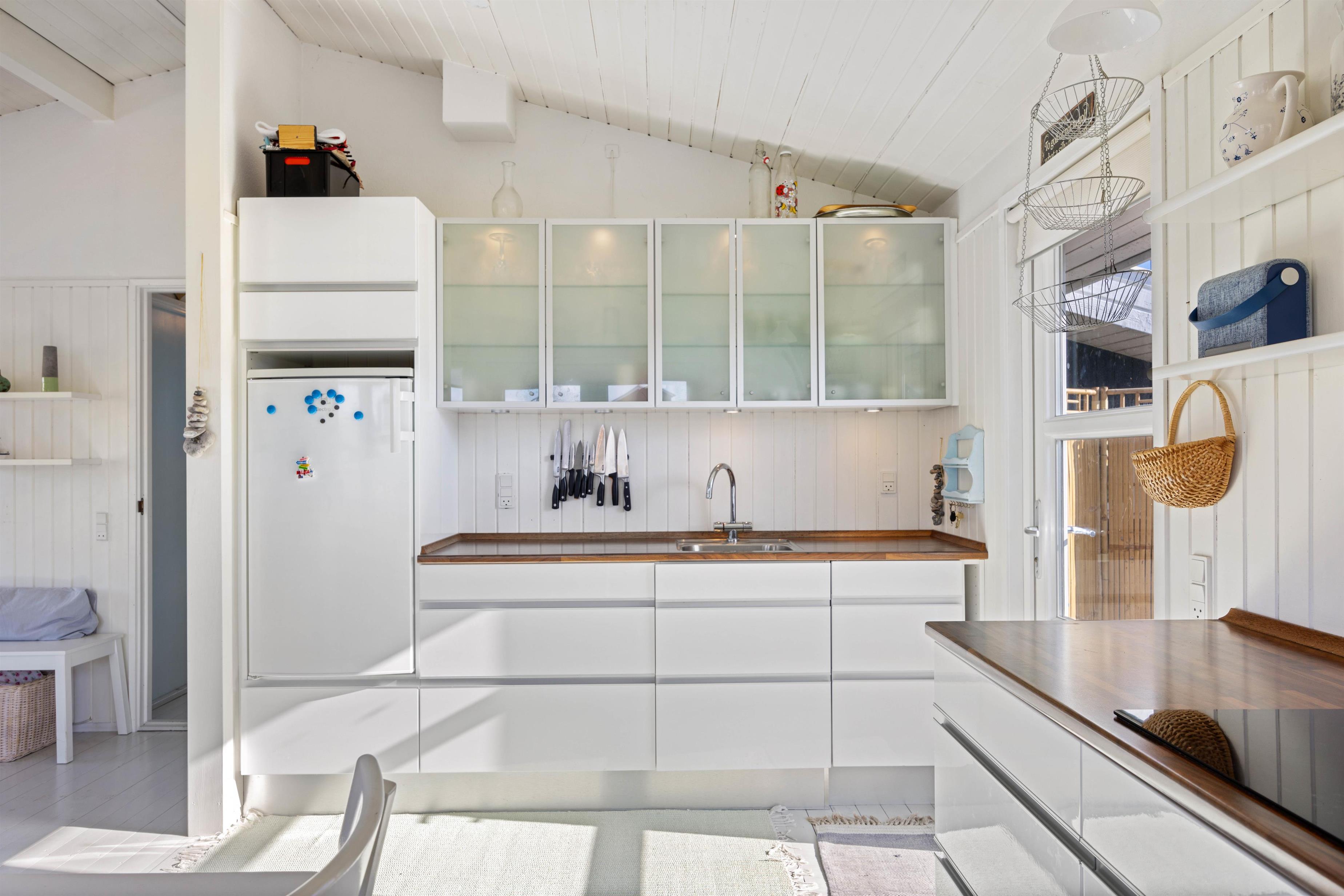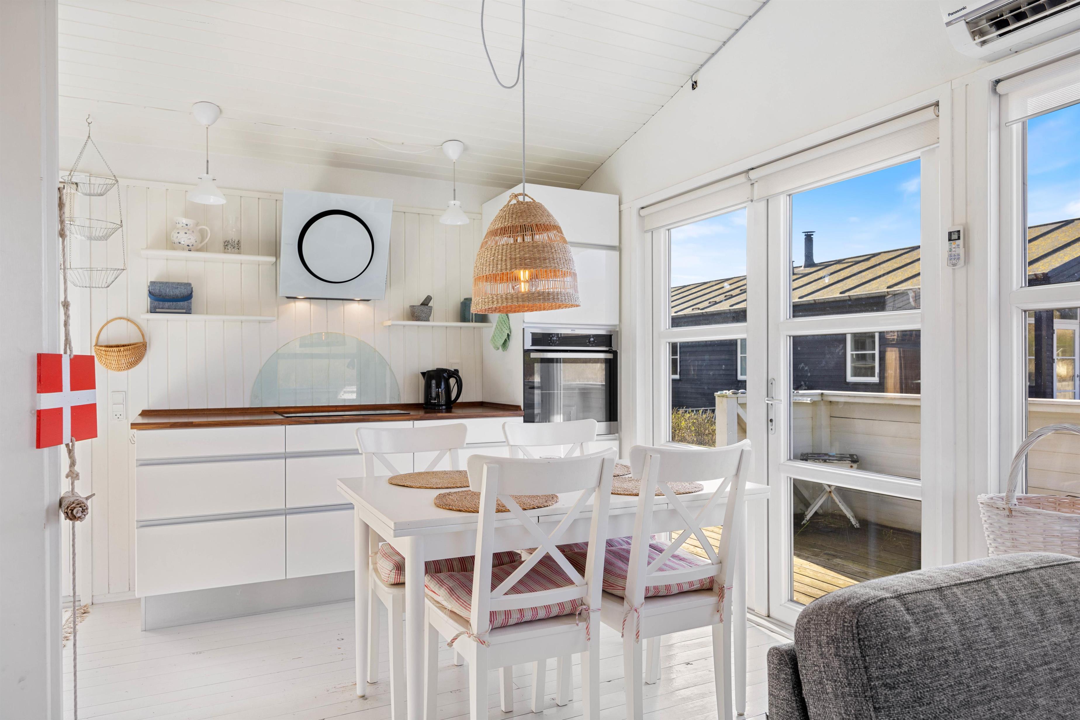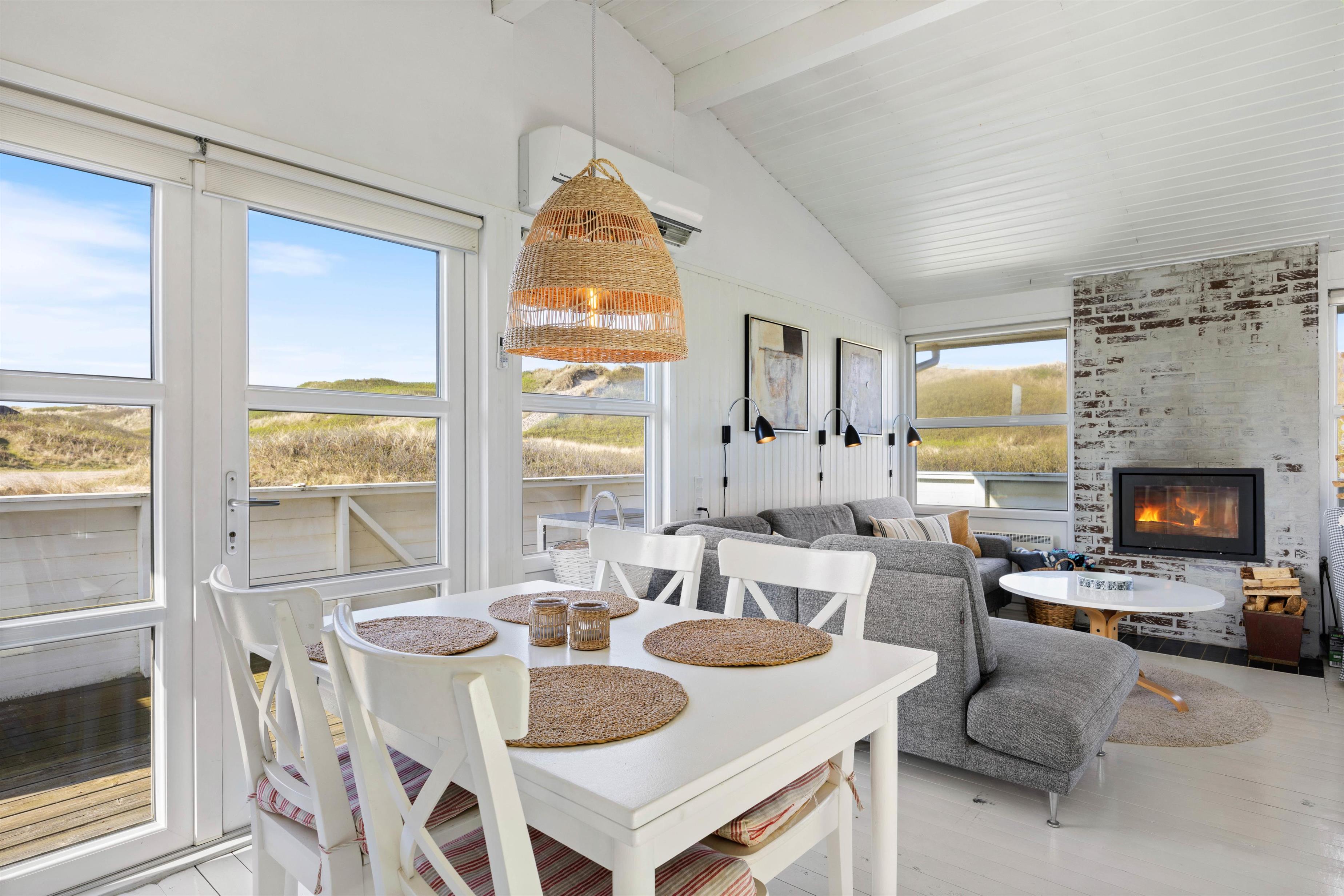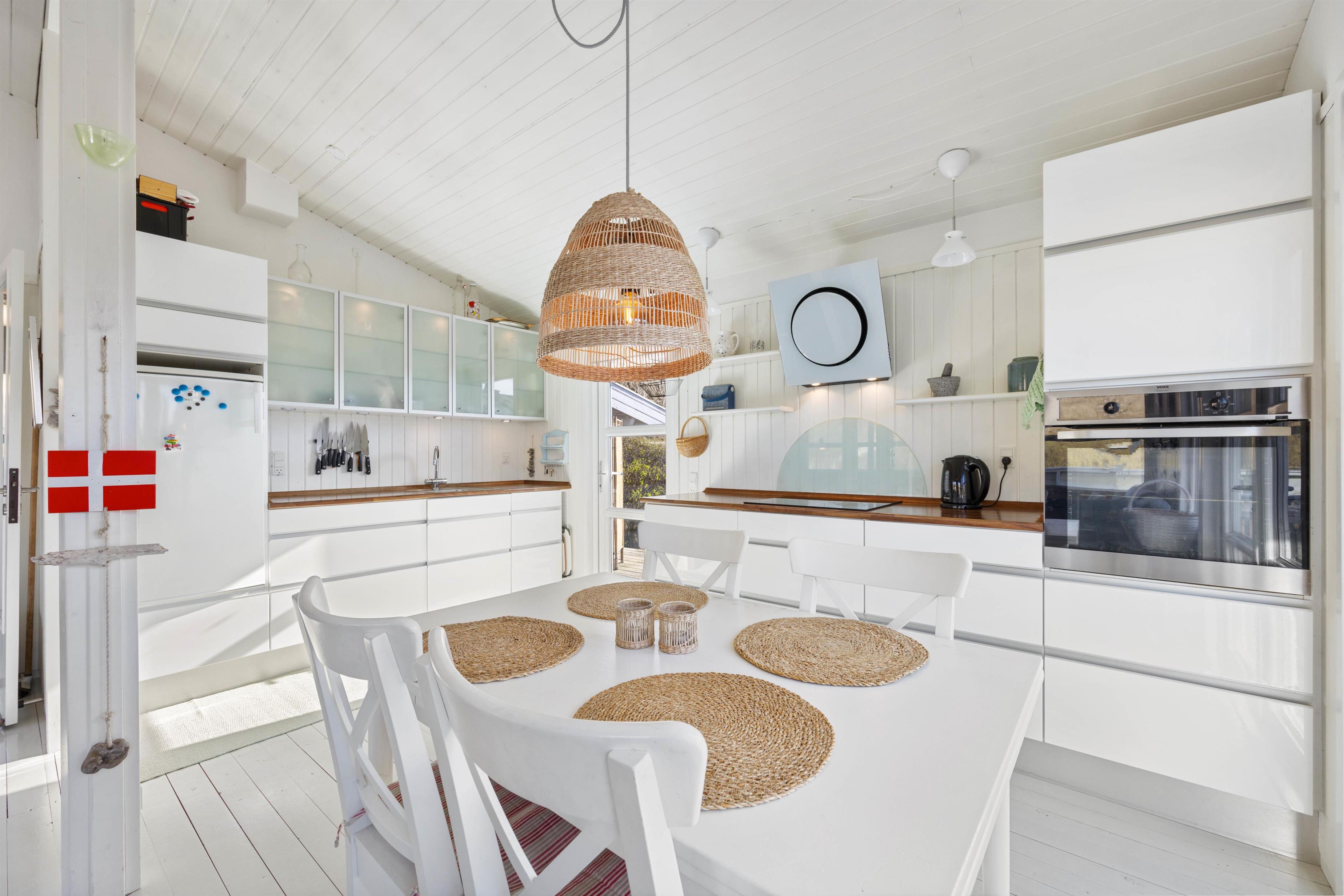 I vil, lige så snart I træder ind i entreen, opleve det hyggeligste, lyse og indbydende feriehus. I kan inde fra stuen nyde de betagende klitter, imens brændeovnen på de kolde dage knitrer i baggrunden. Feriehuset er indrettet med et køkkenalrum, så I kan have en samtale sammen, uanset om I står og laver et lækkert måltid i køkkenet, eller sidder i sofaen og ser fjernsyn. Det hvide læfter går hele vejen til kip, og her kan de fine, store egetræsbjælker også ses, hvilket er med til at skabe en god rummelighed og dejlig atmosfære.