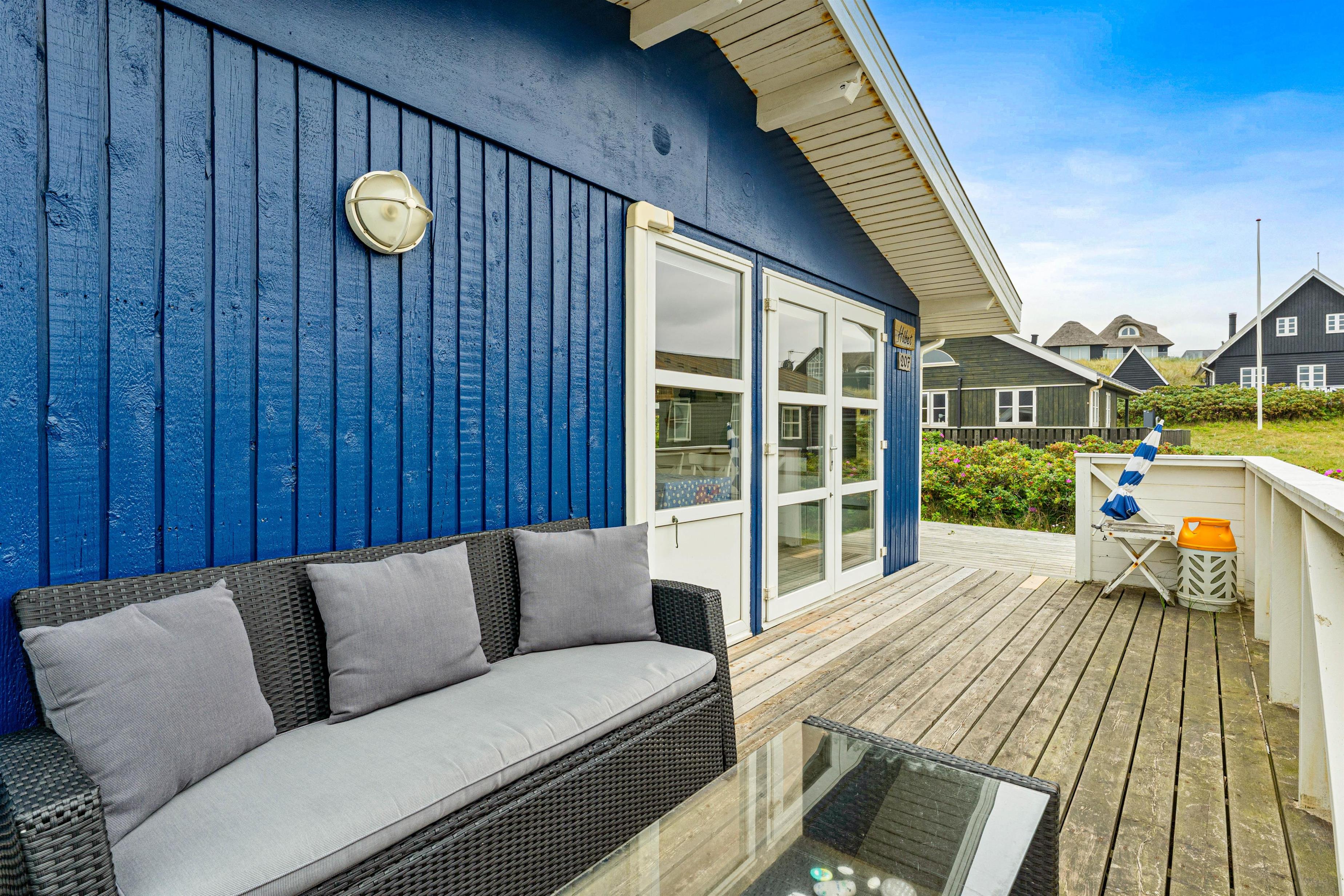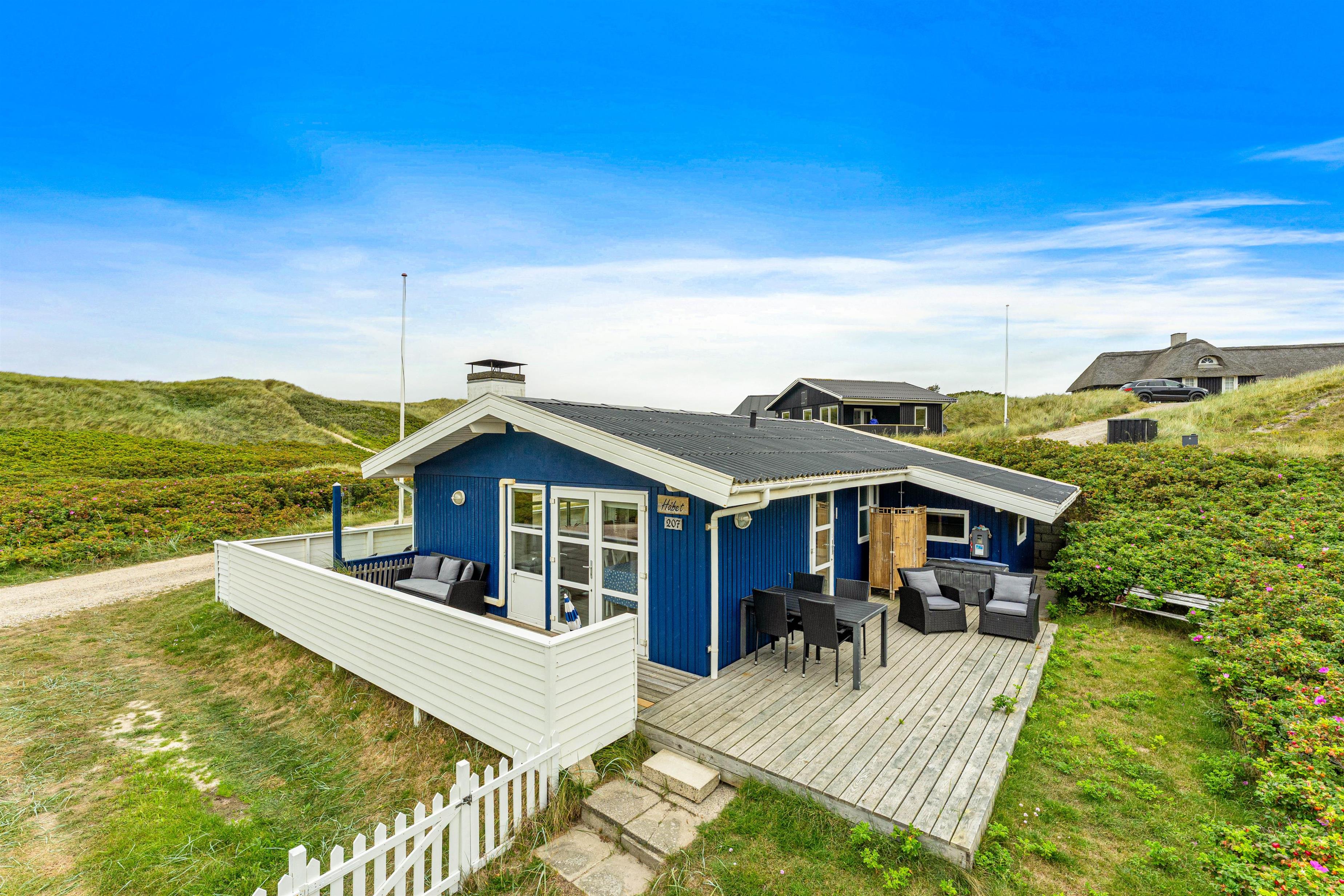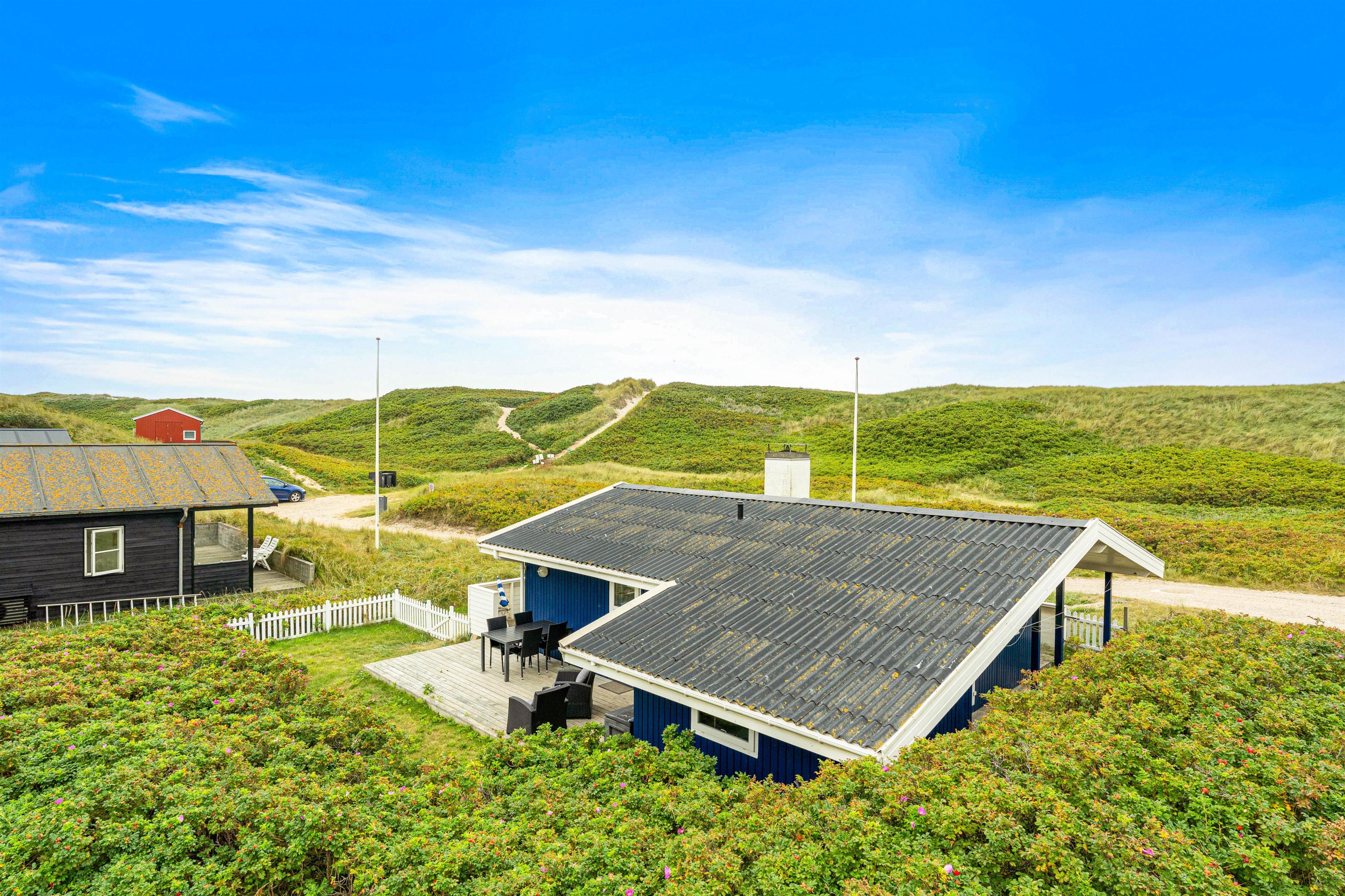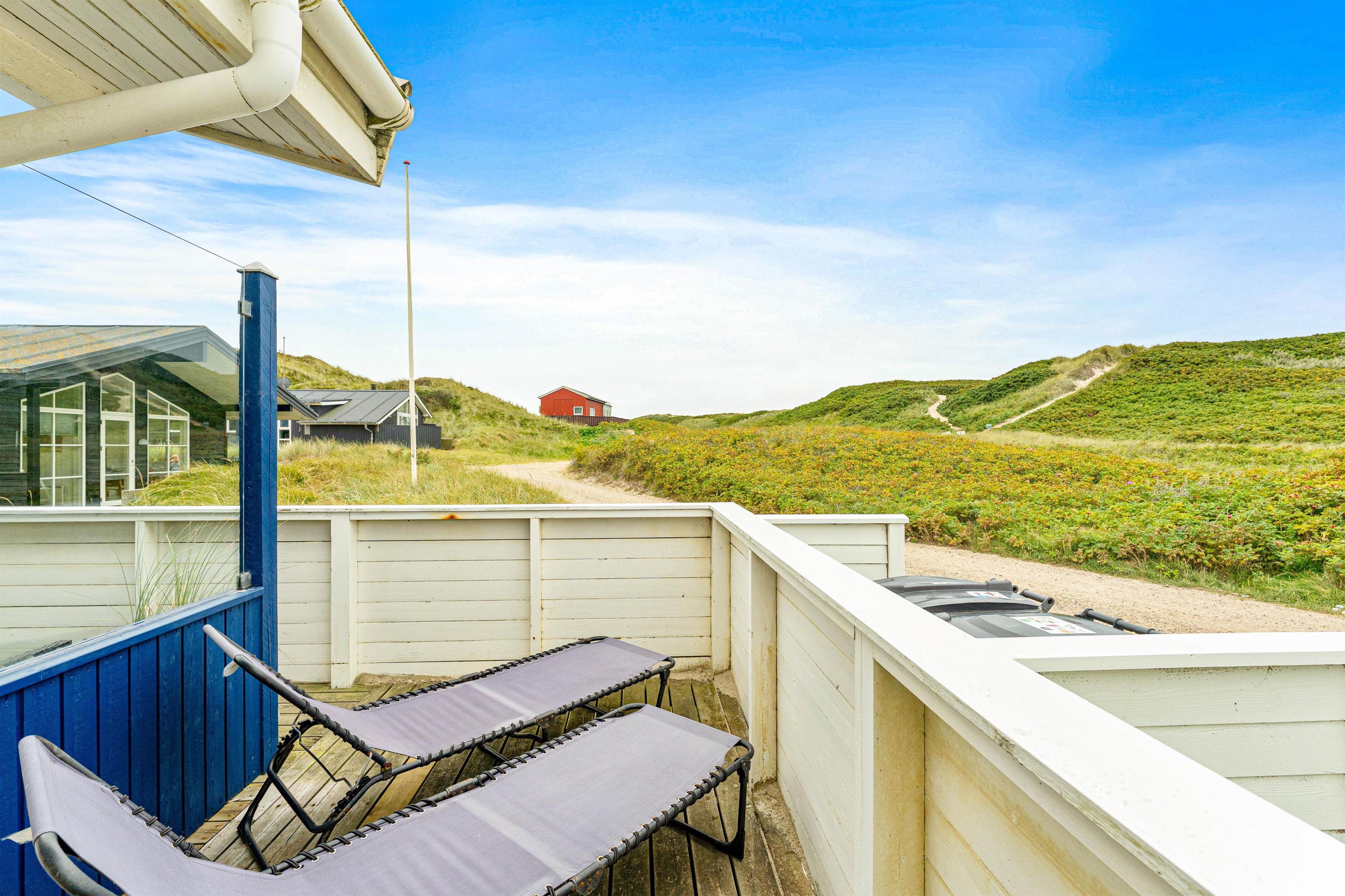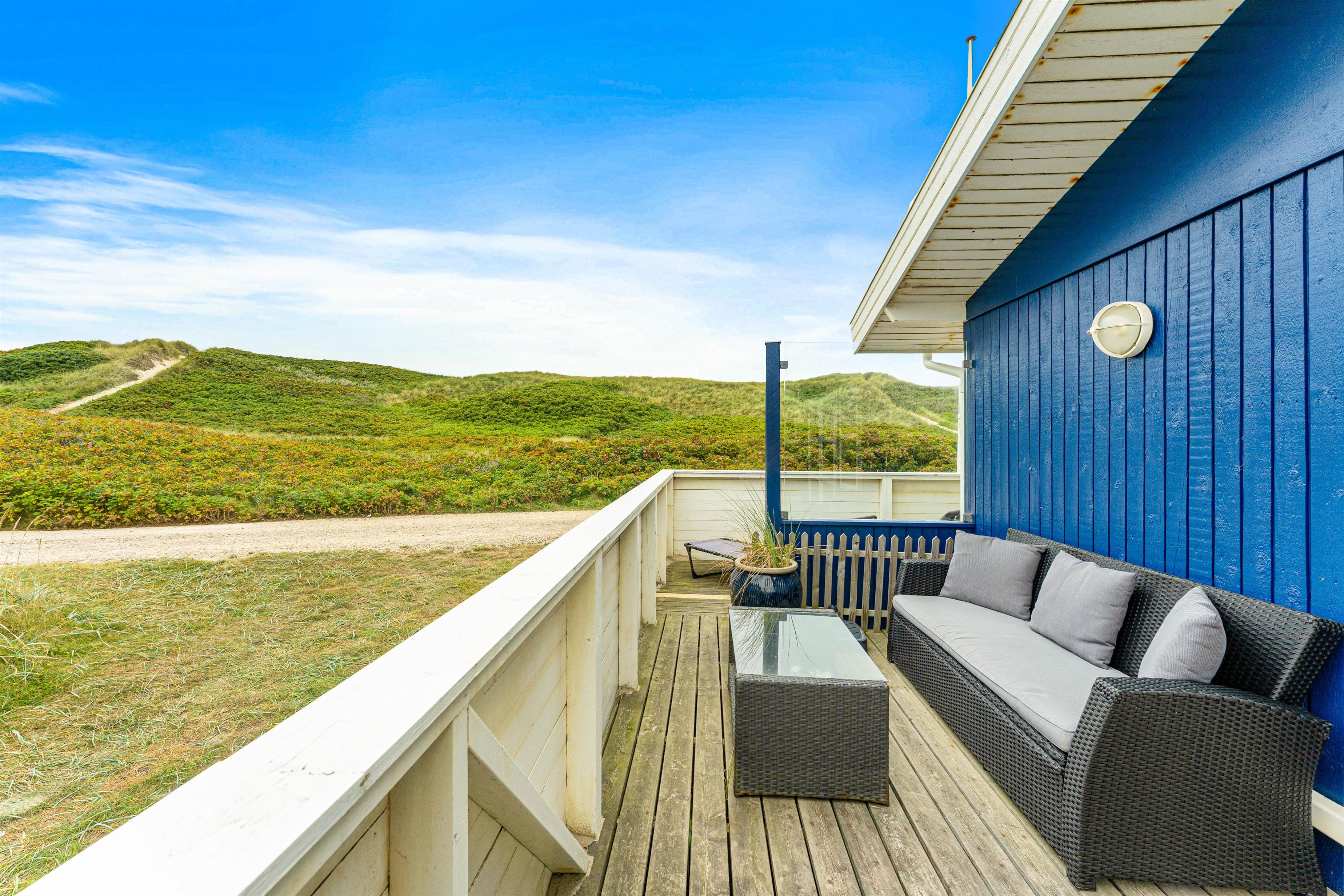 Det fine feriehus ligger i hyggelige naturrige omgivelser. Blot 50 meter i gåafstand fra feriehuset ligger stranden, hvor I kan gå en lang tur eller tage en dukkert i det brusende Vesterhav på en varm sommerdag, for at blive kølet ned i varmen. Efter I har været en tur i vandet for at blive kølet ned, er der mulighed for at få skyllet sandet af igen, ved feriehusets tilhørende udebruser.