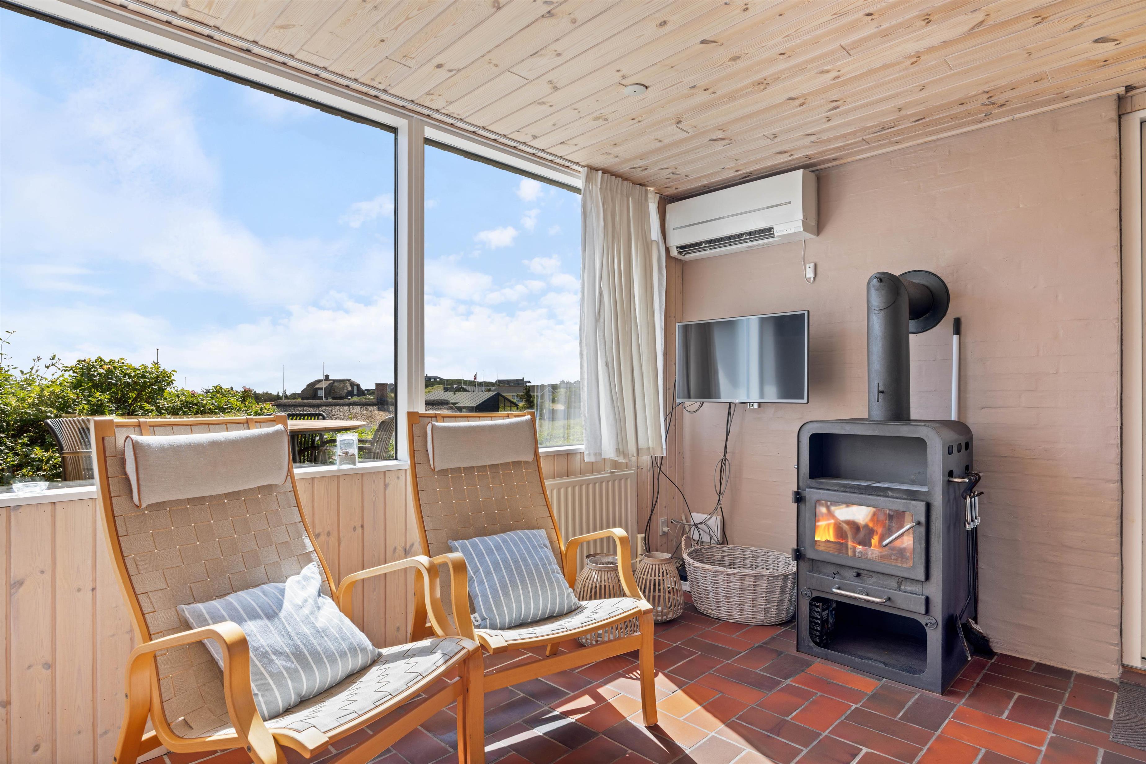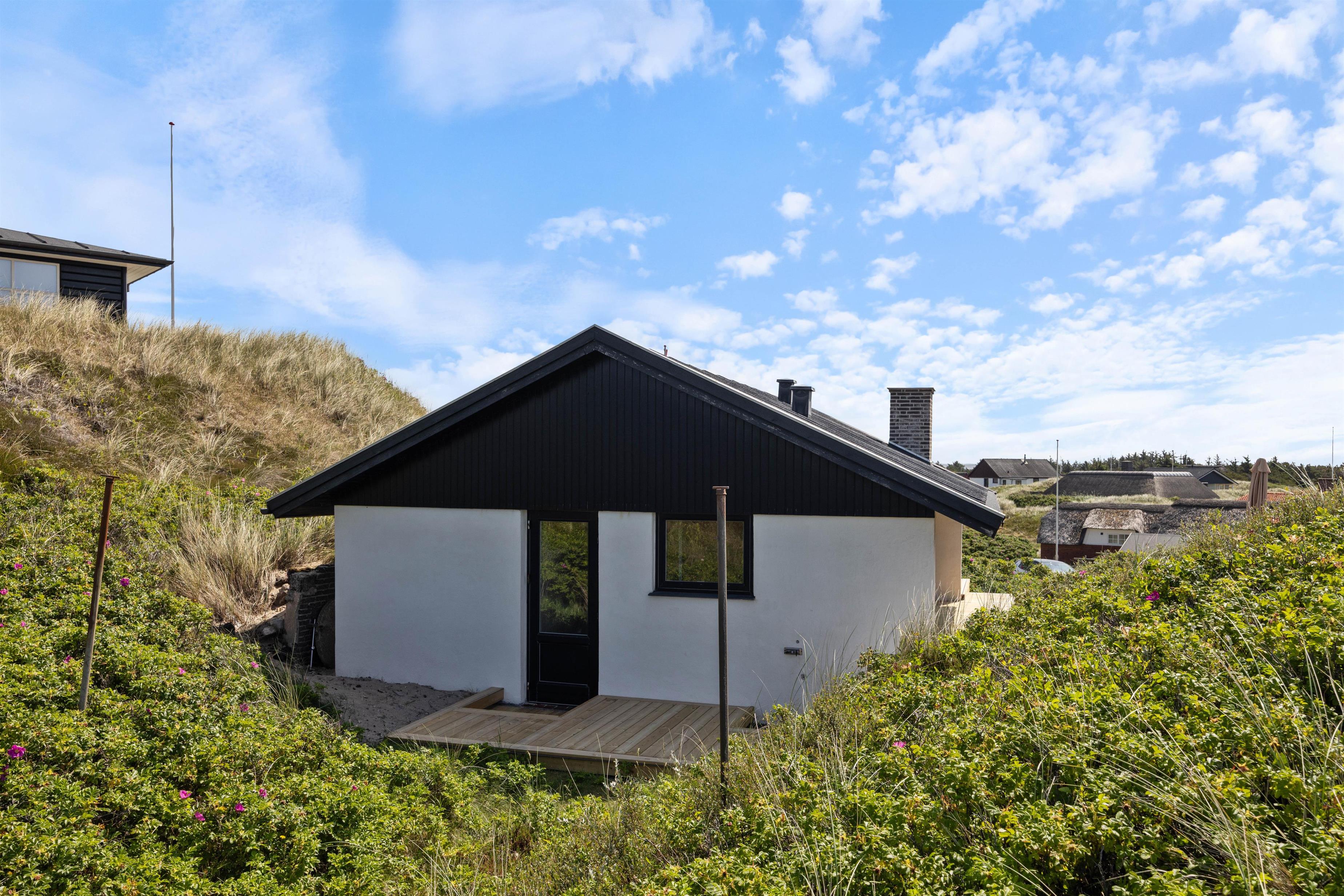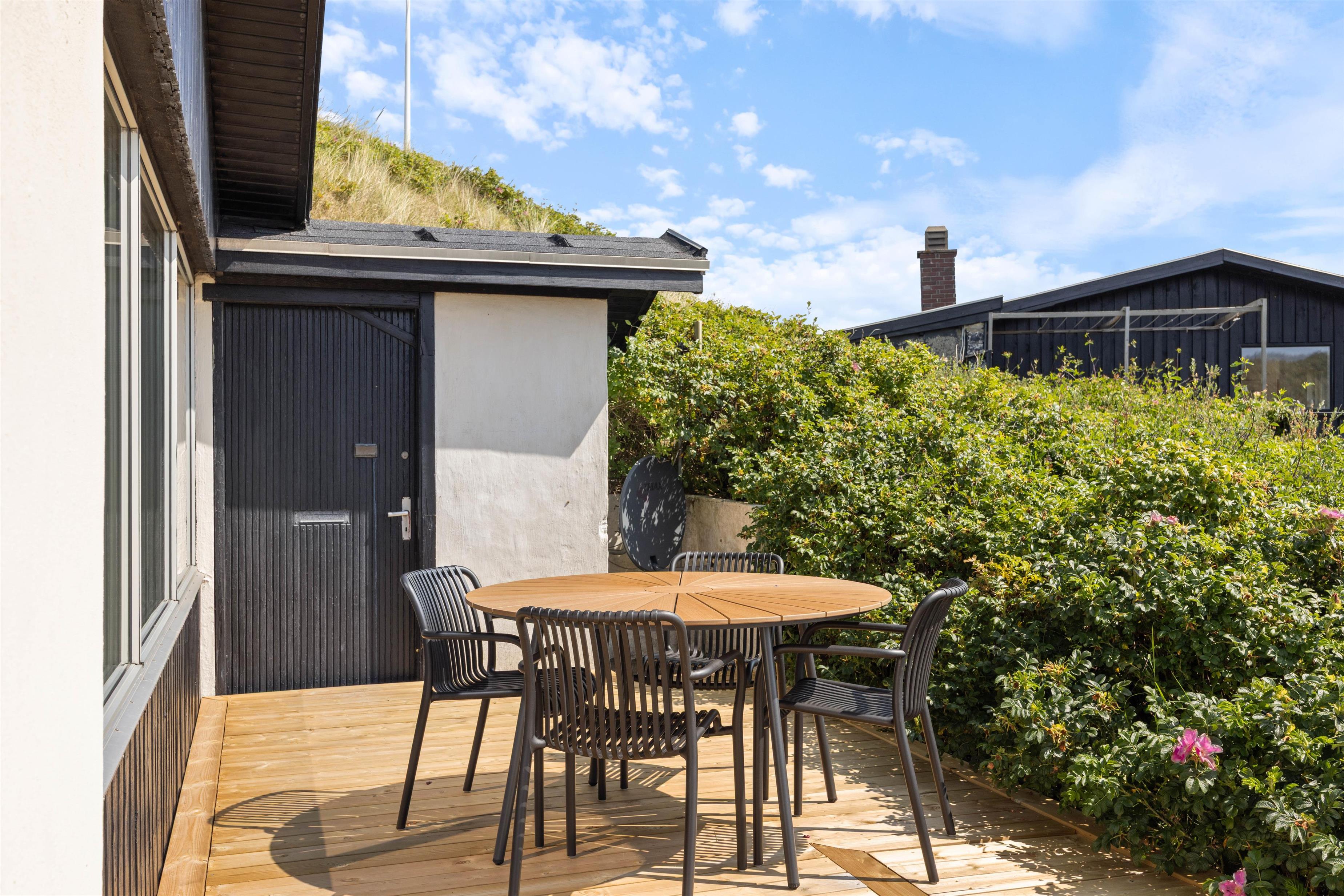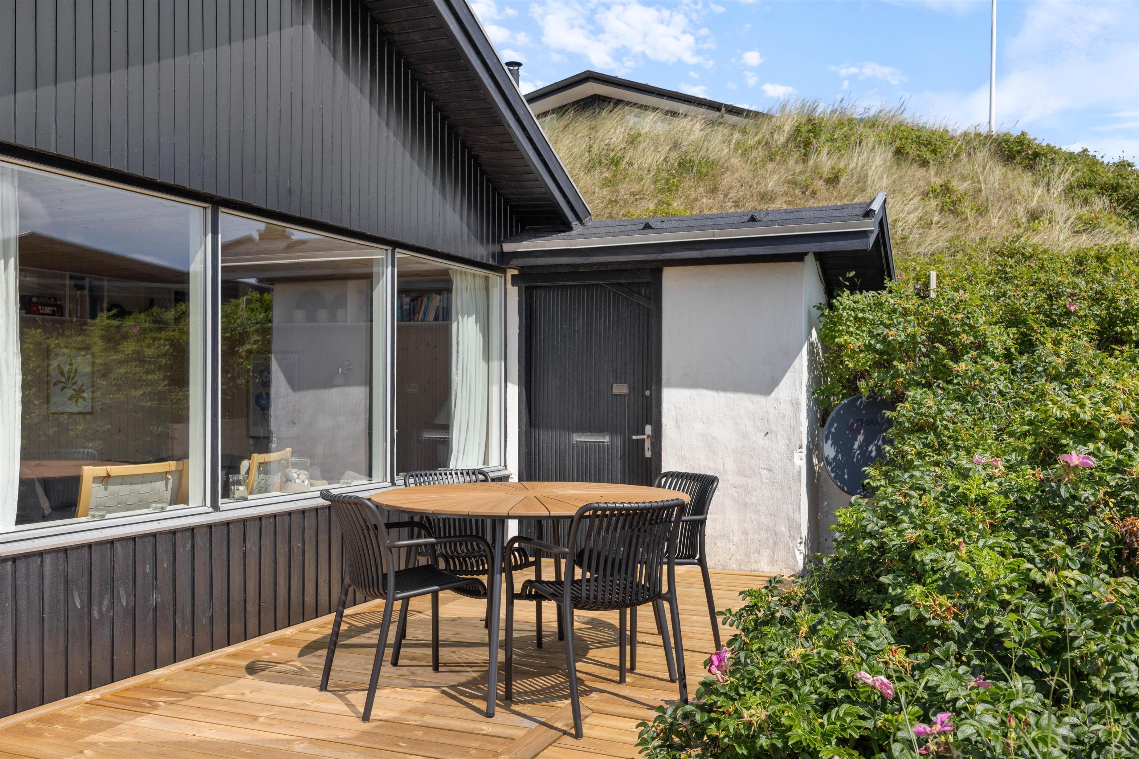Både indendørs og udendørs oser sommerhuset af hygge stemning. Indvendigt inviterer en indbydende brændeovn til hyggelige aftener, hvor I kan nyde den knitrende ild og roen. Udenfor finder I en hyggelig åben terrasse, der med sine havemøbler og grill, indbyder til hyggelige aftener, med et godt måltid tilberedt på grillen. Den omkringliggende klitgrund giver en fantastisk mulighed til leg og afslapning.