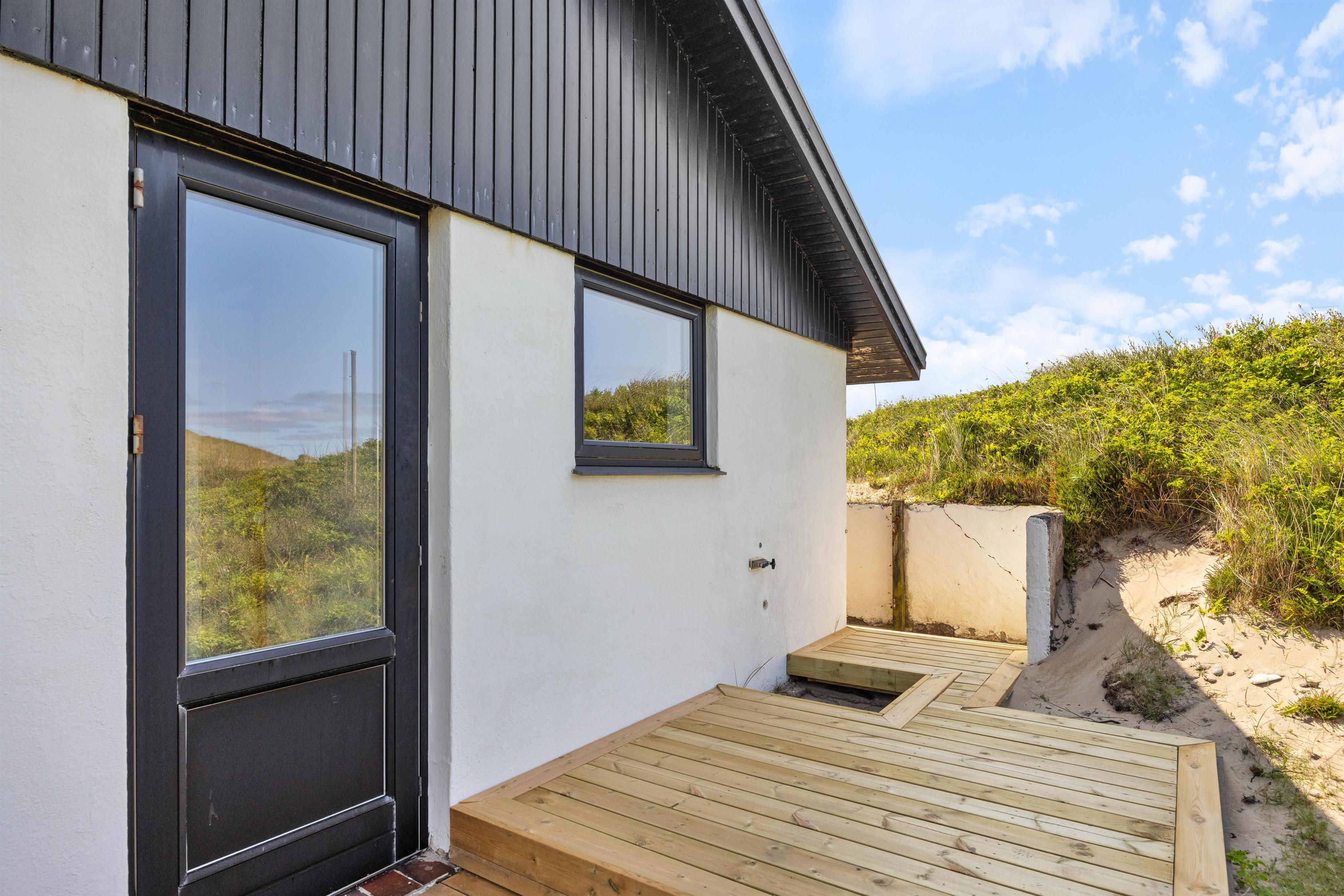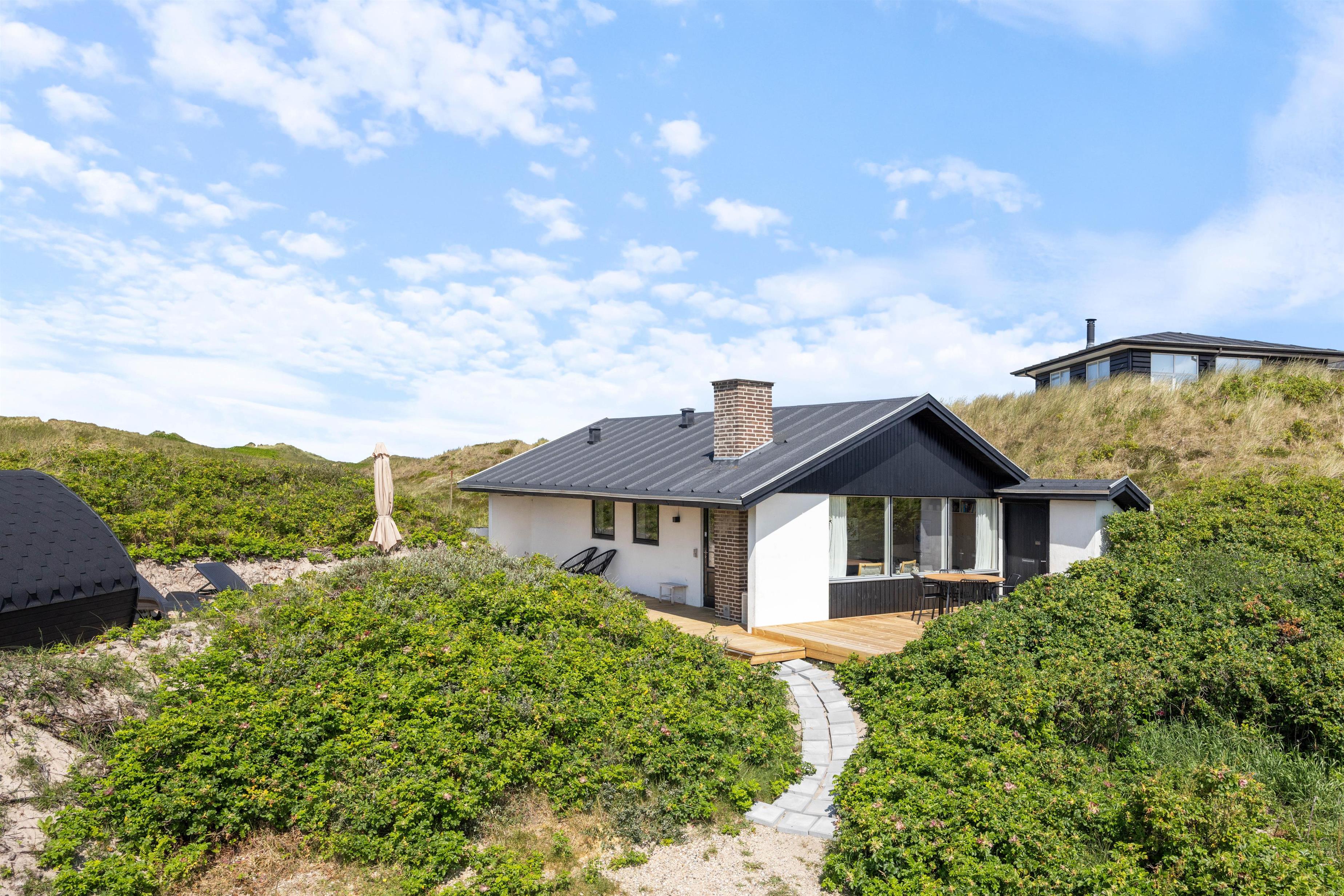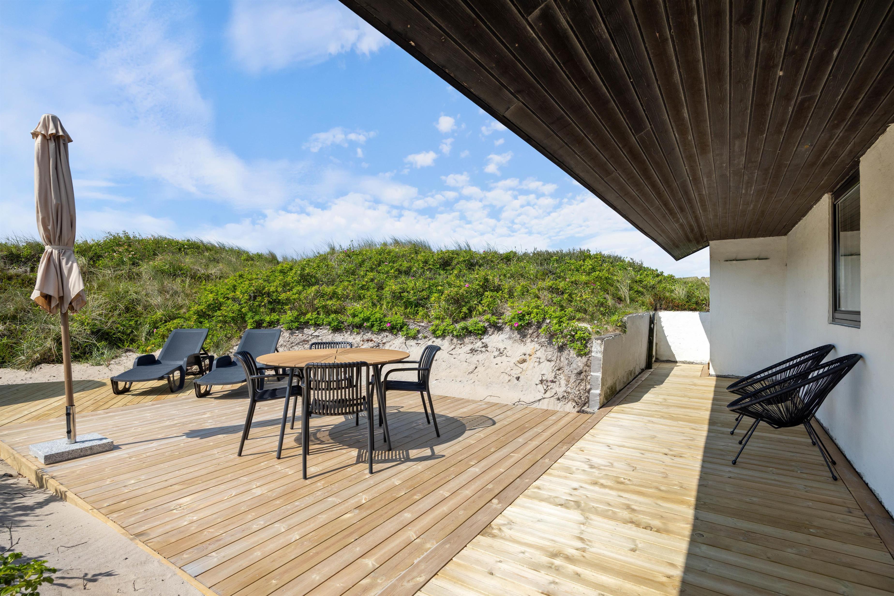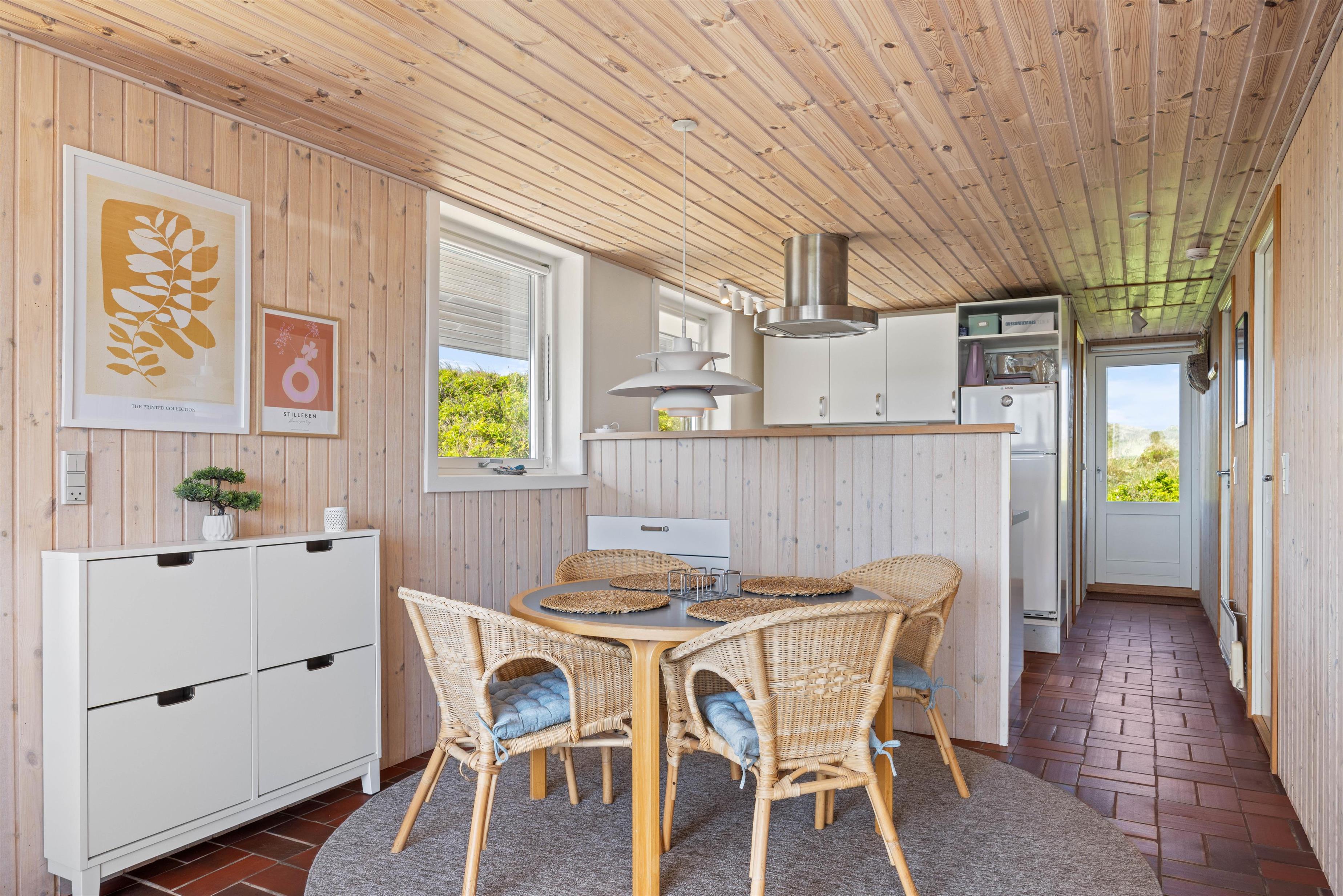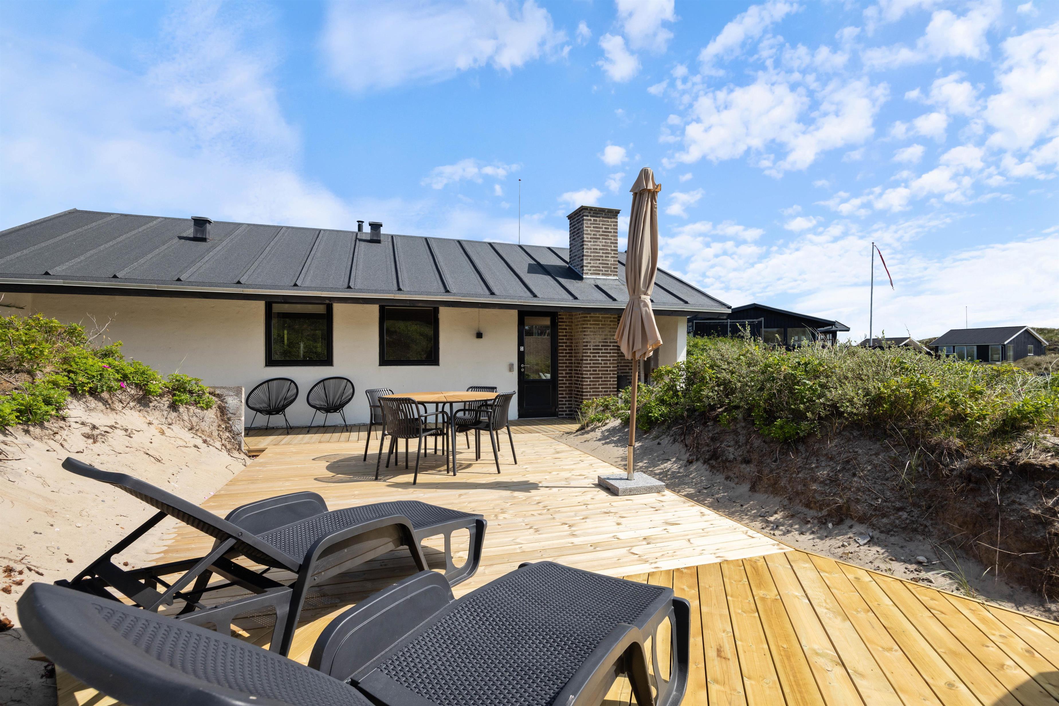 Både indendørs og udendørs oser sommerhuset af hygge stemning. Indvendigt inviterer en indbydende brændeovn til hyggelige aftener, hvor I kan nyde den knitrende ild og roen. Udenfor finder I en hyggelig åben terrasse, der med sine havemøbler og grill, indbyder til hyggelige aftener, med et godt måltid tilberedt på grillen. Den omkringliggende klitgrund giver en fantastisk mulighed til leg og afslapning.