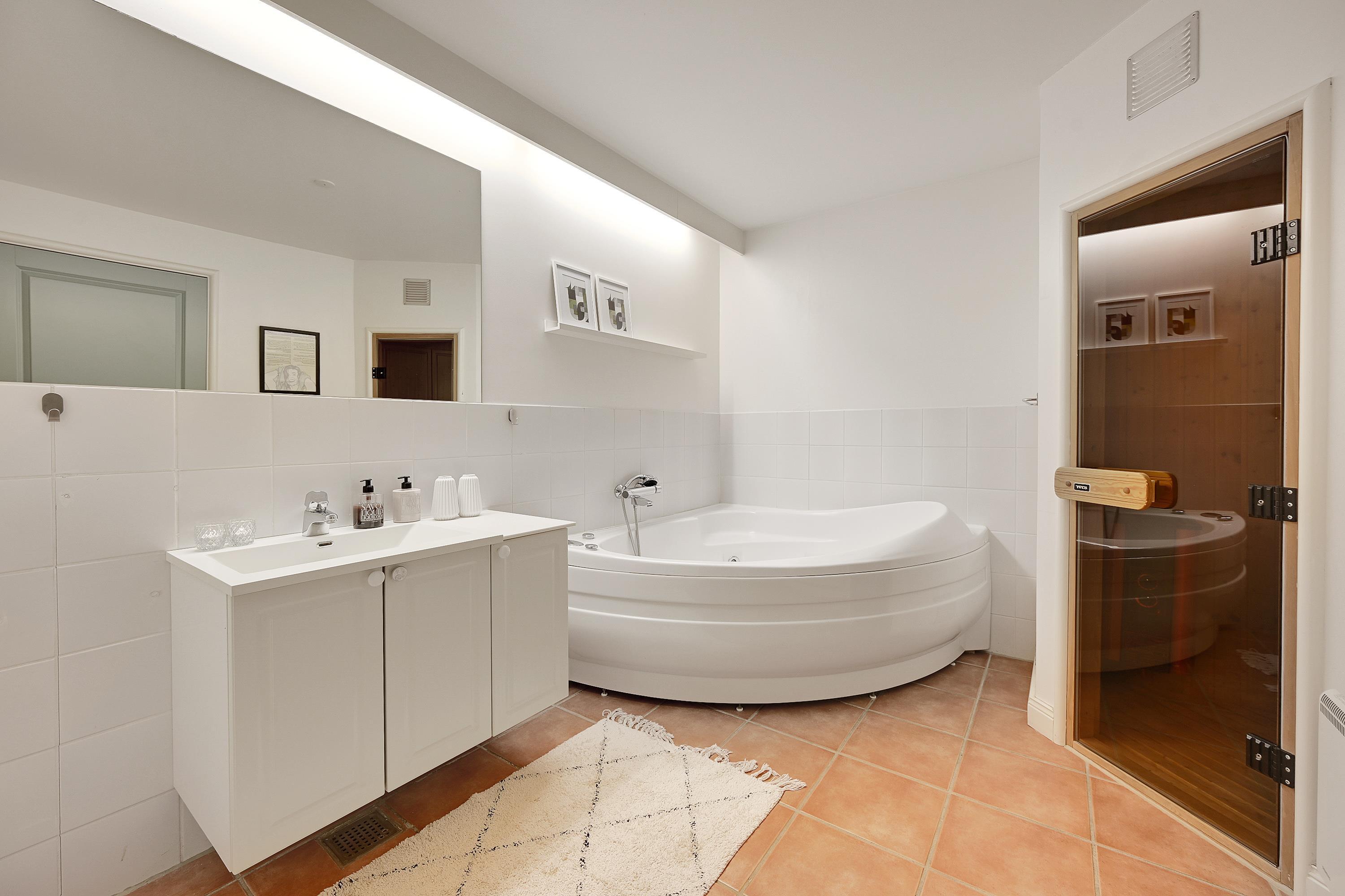 Fredfyldt atmosfære med sauna og spabad