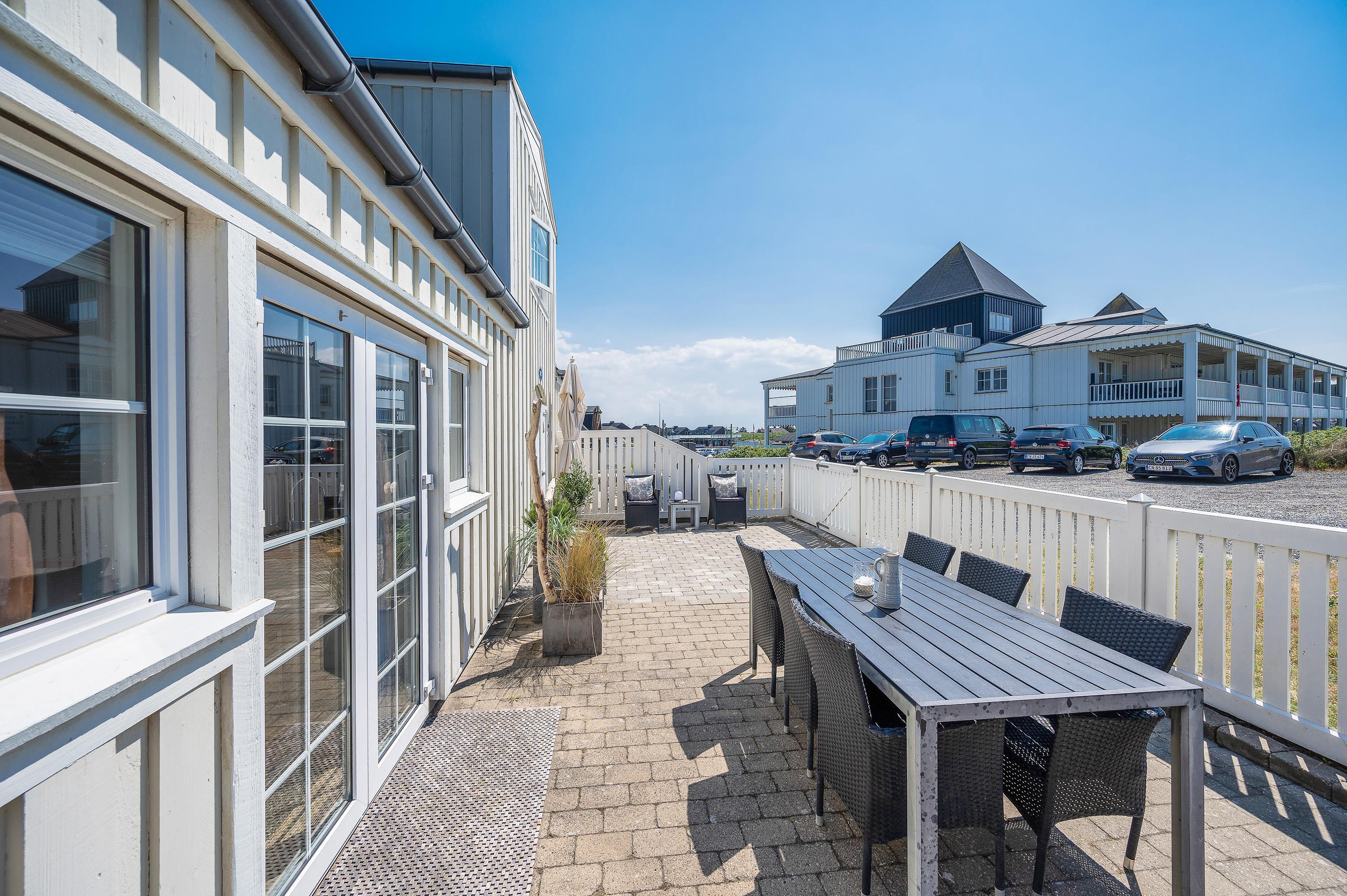 Fra terrassen kan I høre det brusende Vesterhav kalde på jer, og på få minutters gang kommer I til den kilometerlange sandstrand, som i øvrigt er let tilgængelig for alle med den gode strandovergang. Her kan både store og små følge med, og de modige og badeglade feriegæster kan hoppe en tur i bølgerne.