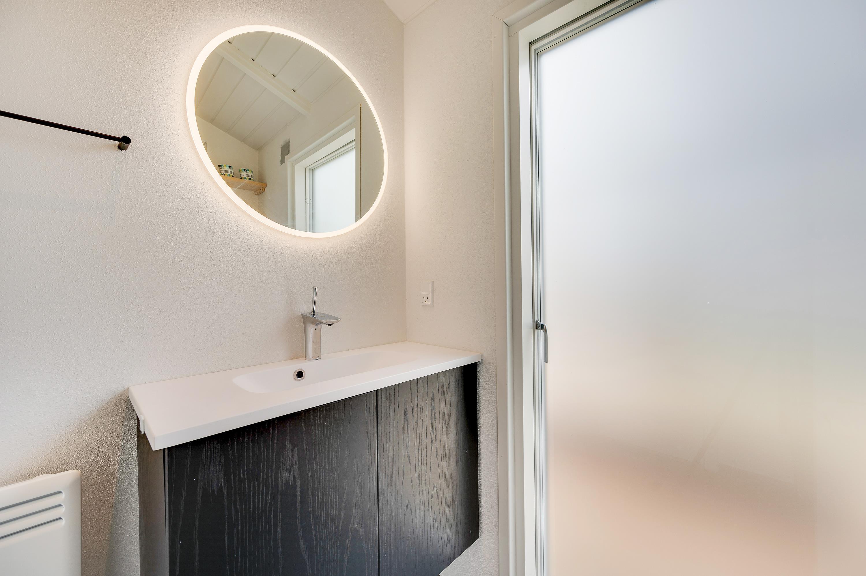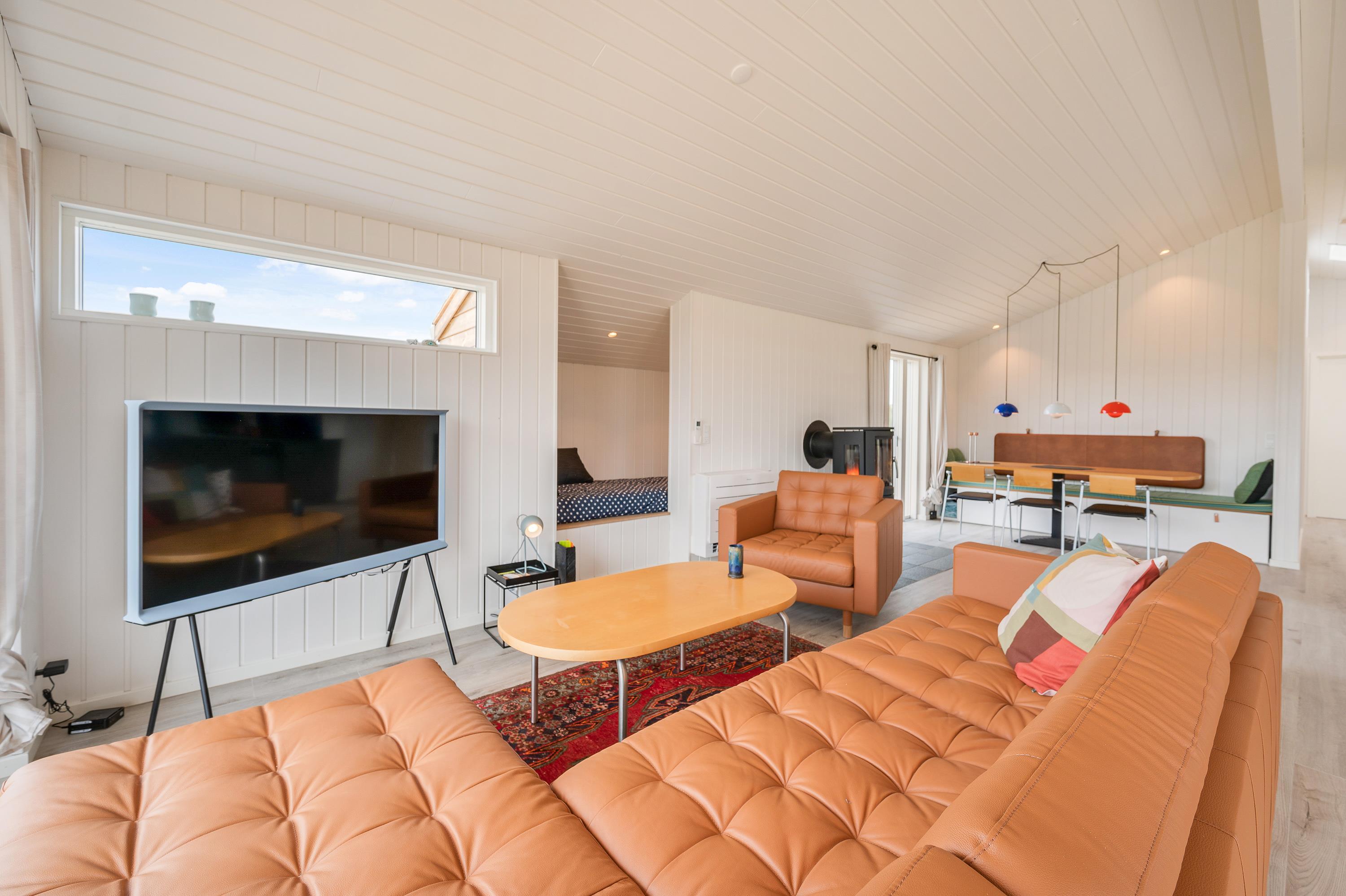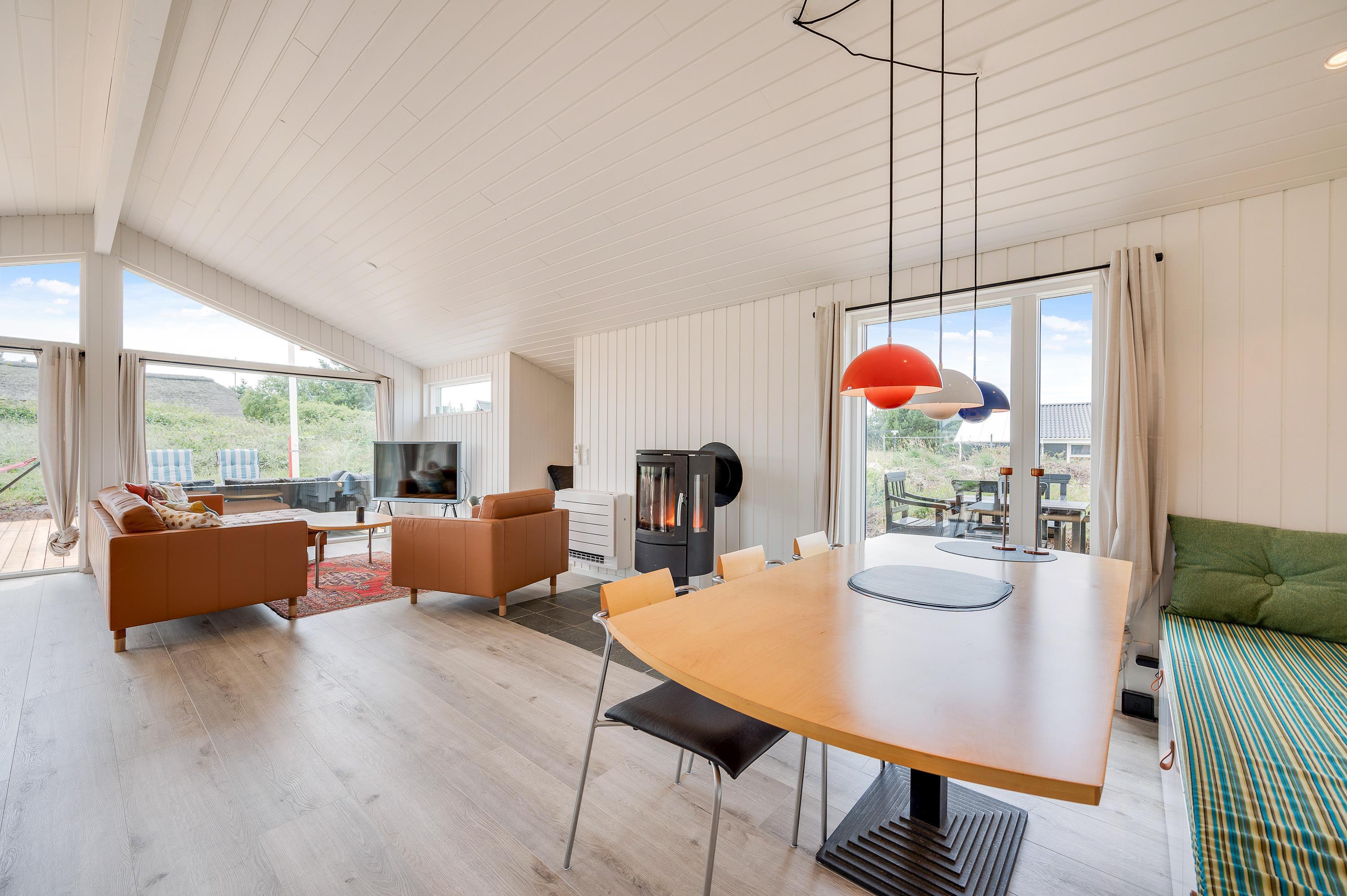 I feriehuset sørger en energivenlig varmepumpe for, at I har et godt indeklima til lave omkostninger. Vil I skrue ekstra op for varmen og den hyggelige feriestemning på de kølige ferieaftener, kan I tænde op i brændeovnen i stuen. På sommerhusets badeværelse er der også gulvvarme, så ingen fryser fødderne.