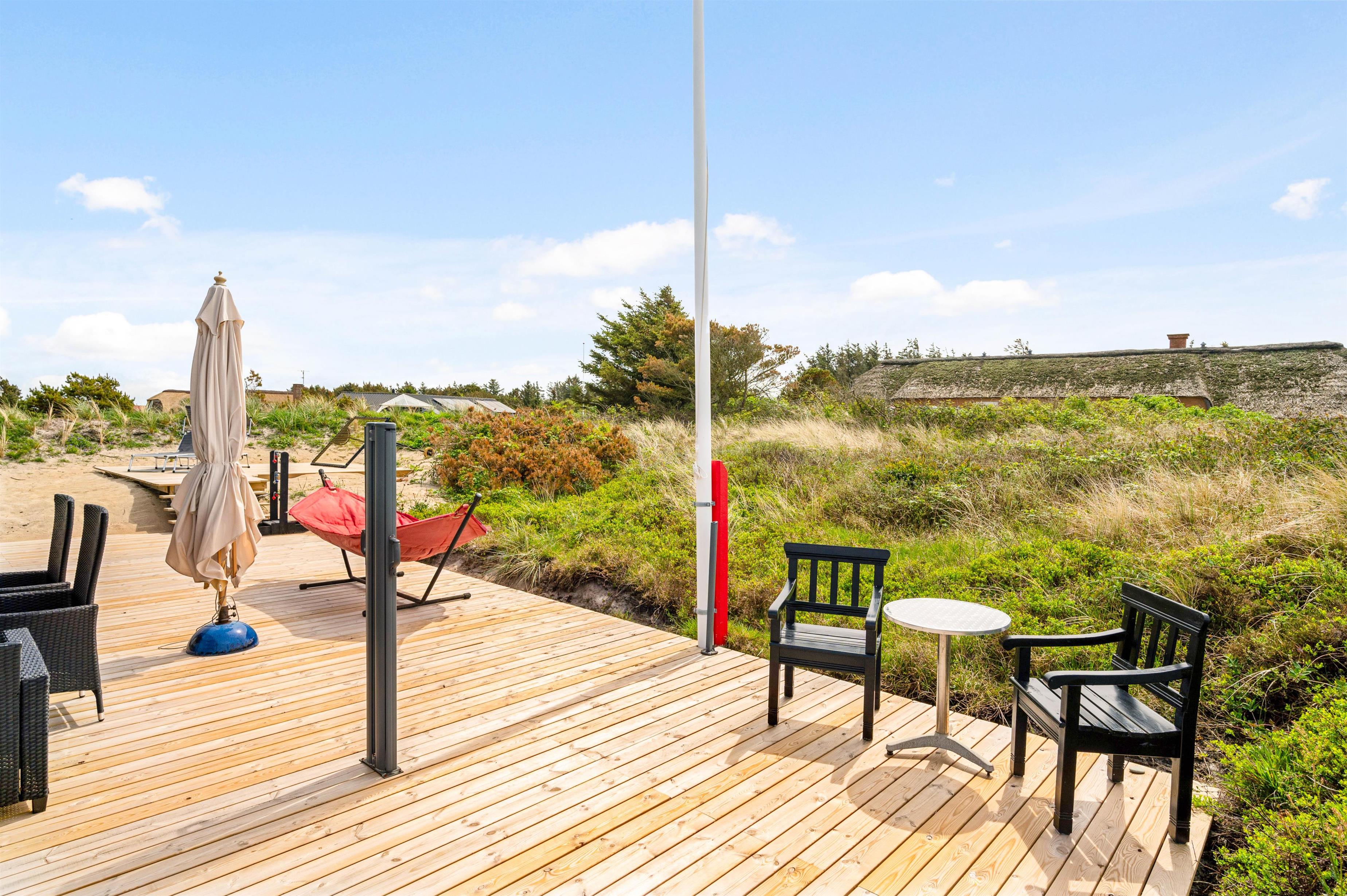 Kun 800 meter fra sommerhuset ligger Vesterhavet, som I hurtigt kan nå til, når I trænger til en frisk gåtur eller en dukkert i vandet. Når I kommer tilbage til sommerhuset, kan I skylle sandet af tæerne under udebruseren. Denne udebruser kan benyttes fra april til november.