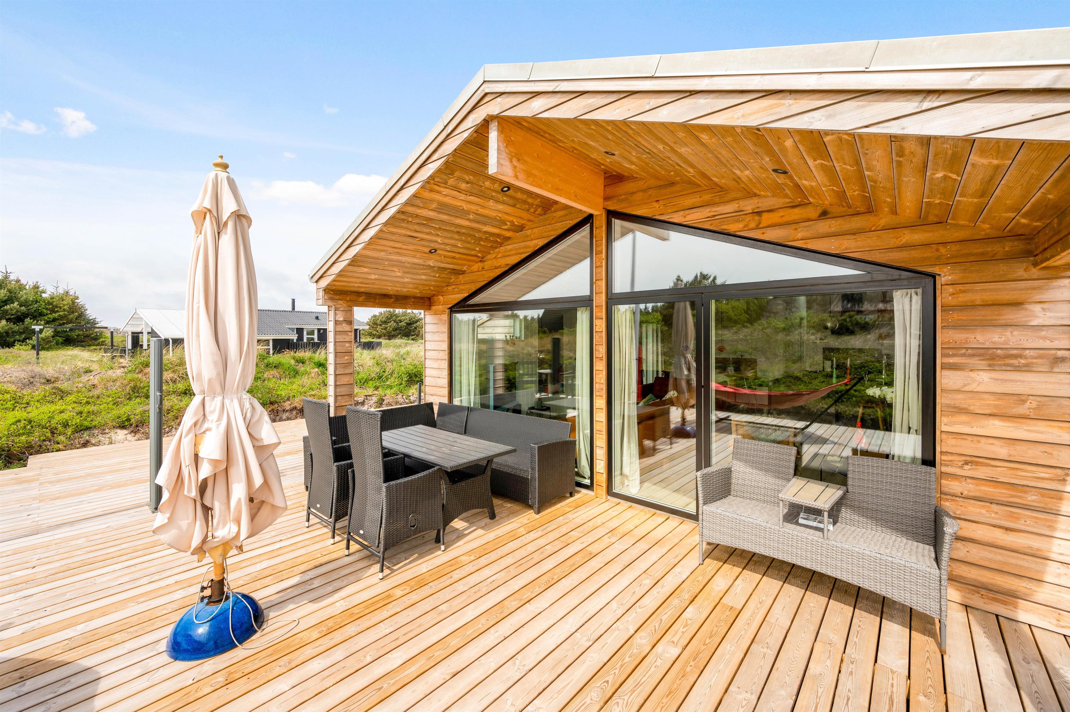Sommerhuset har en skøn terrasse, som går hele vejen rundt om huset, og hvor I kan nyde ferien og den omkringliggende natur fra. På terrassen kan I finde jer til rette i havemøbler og liggestole på en god plads i solen. Terrassen er desuden delvis afskærmet og overdækket, så I har mulighed for at sidde i ly og læ. Uanset vind og vejr, kan I derfor altid finde et vindstille solspot, idet der findes flere hyggelige akroge på terrassen.