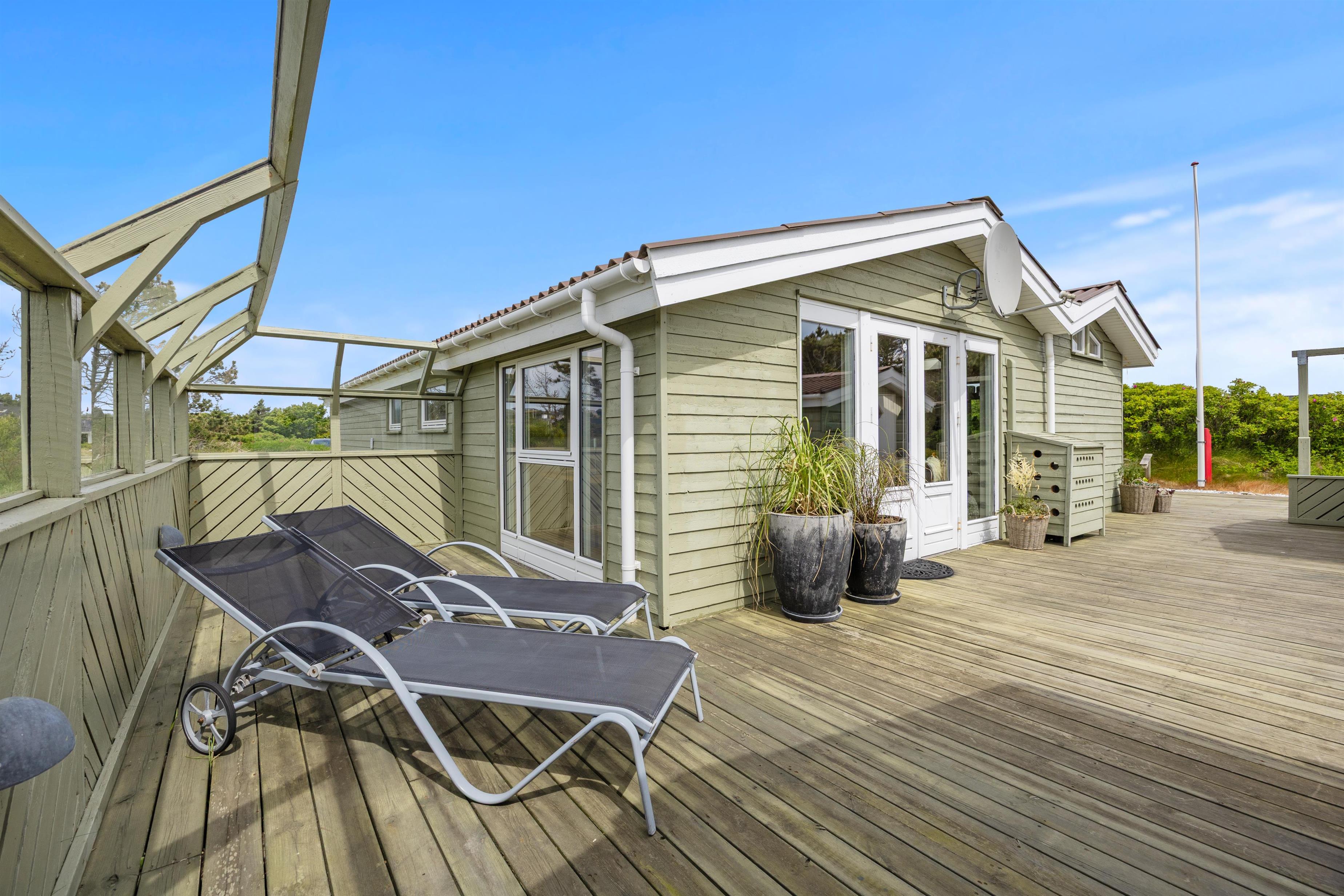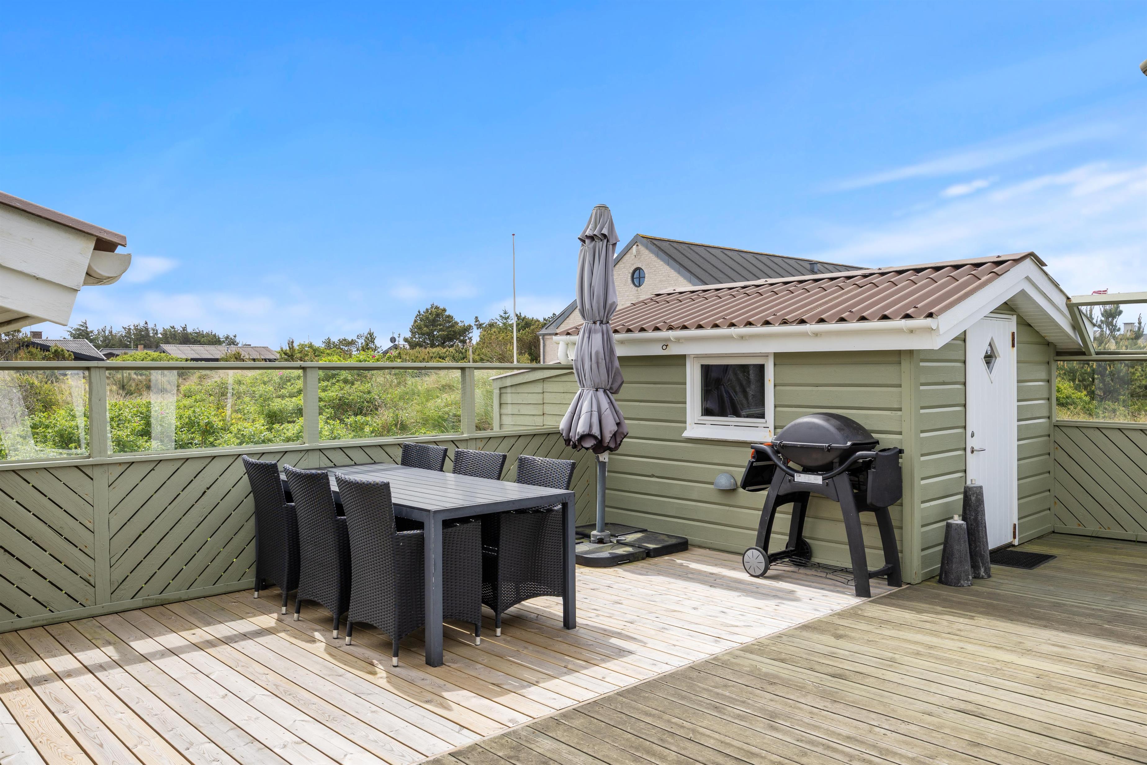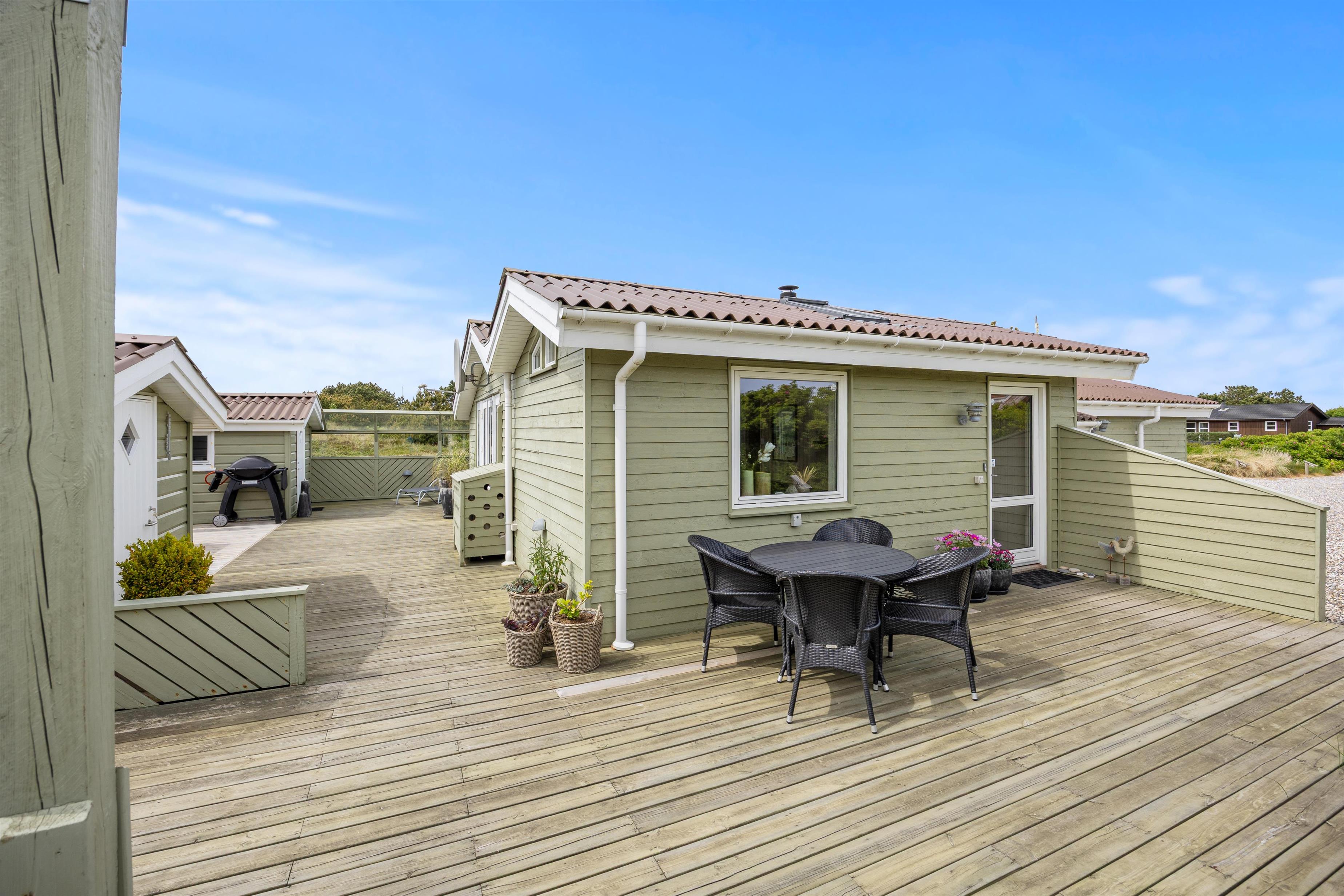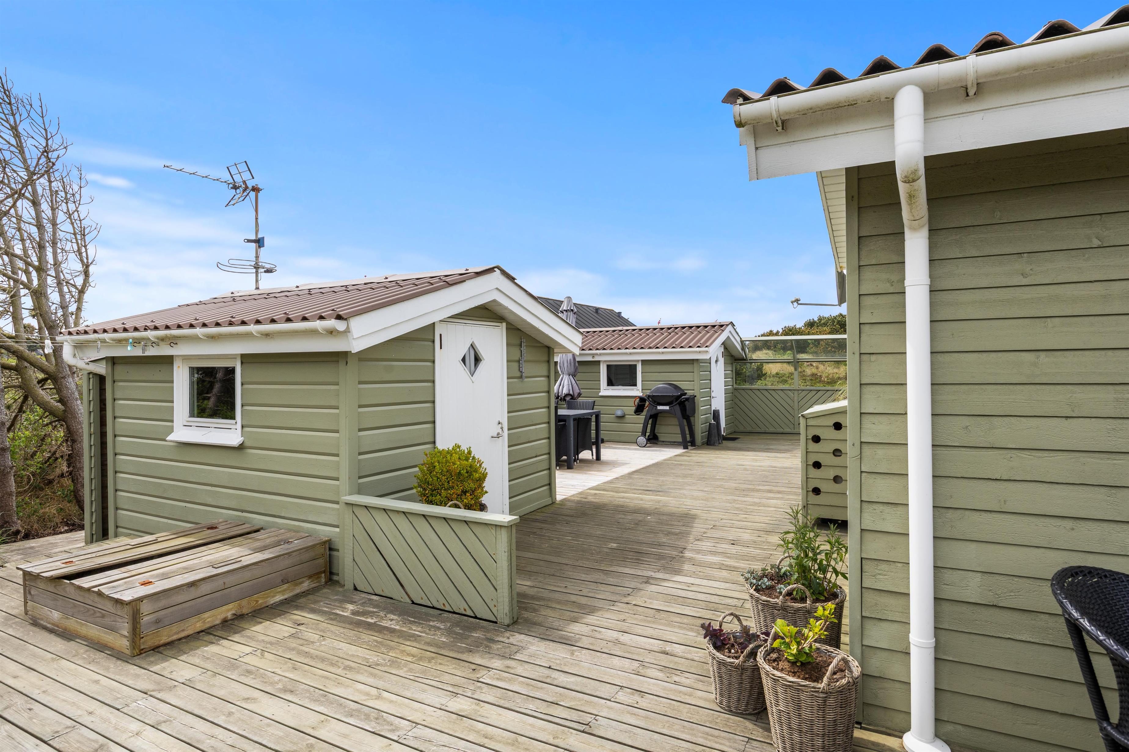 Den store og læfyldte terrasse er man nødt til at fremhæve ved dette sommerhus. Her finder de små gæster flere legeradskaber i form af en gynge og sandkasse. Så kan de underholde sig selv, mens mor slapper af med en god bog i hængekøjen eller liggestolen og far forbereder aftensmaden på gasgrillen. Den er så dejligt læfyldt, og på solrige juli dage kan I ligger her og slikke noget sol.