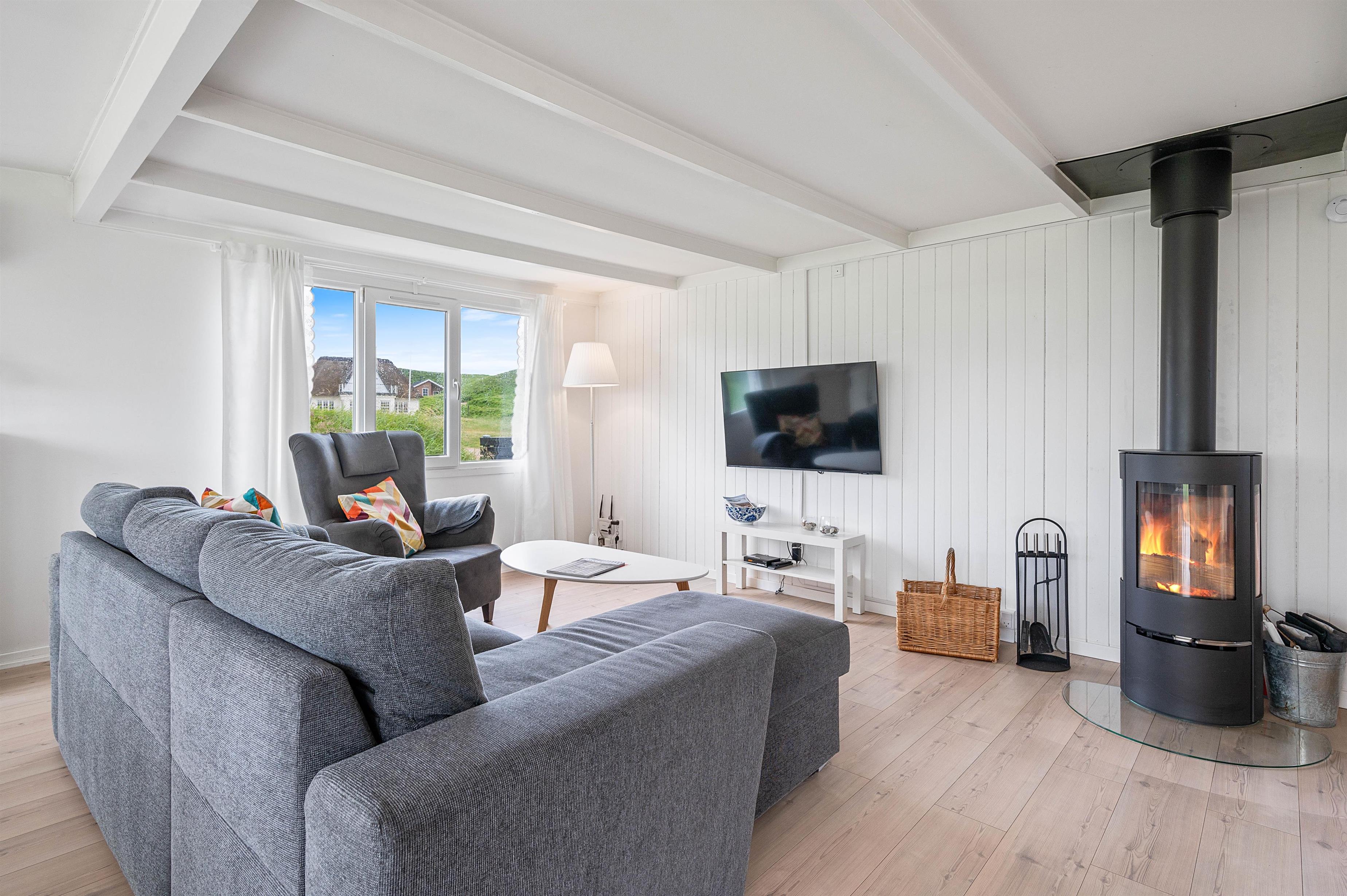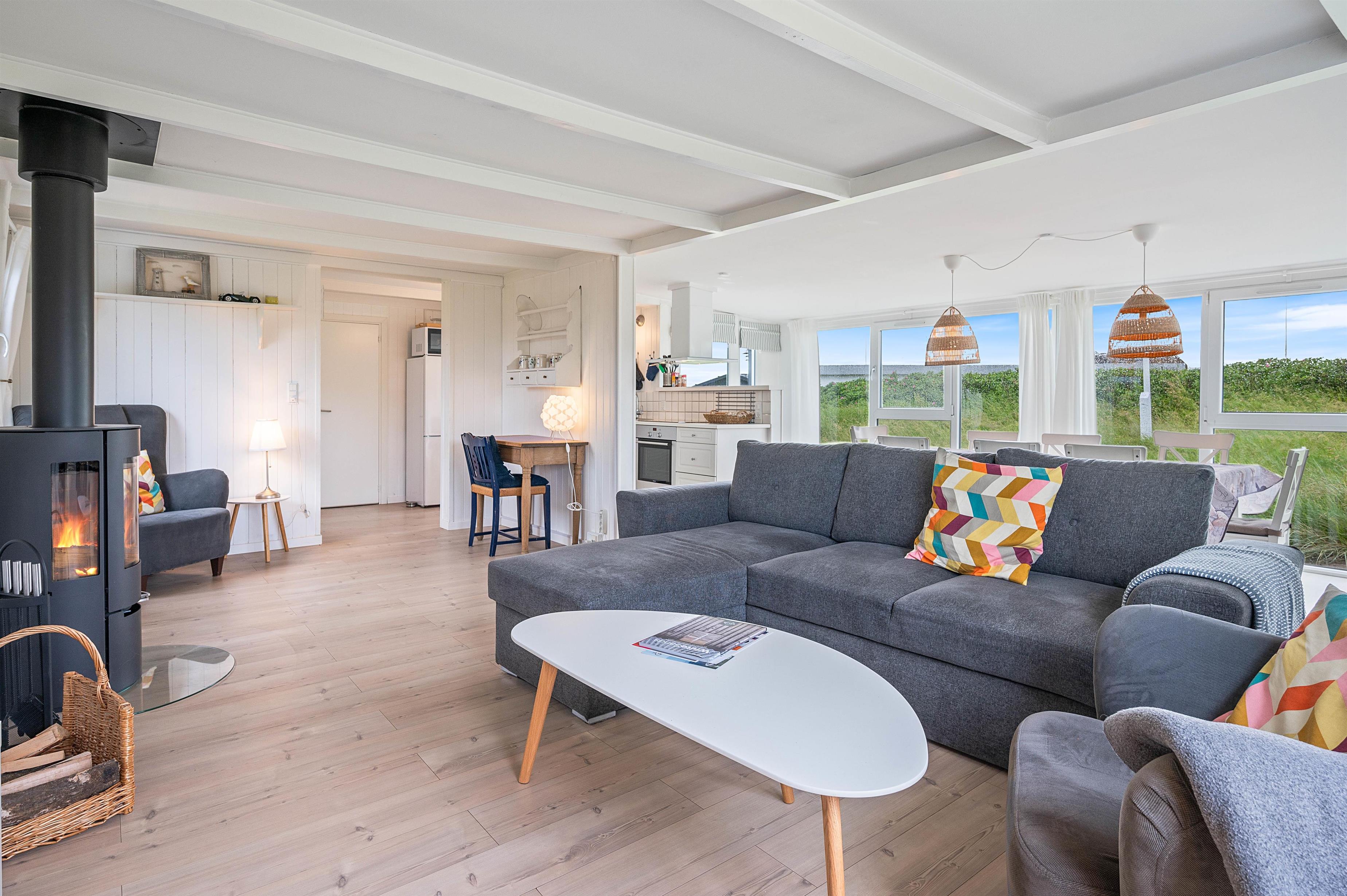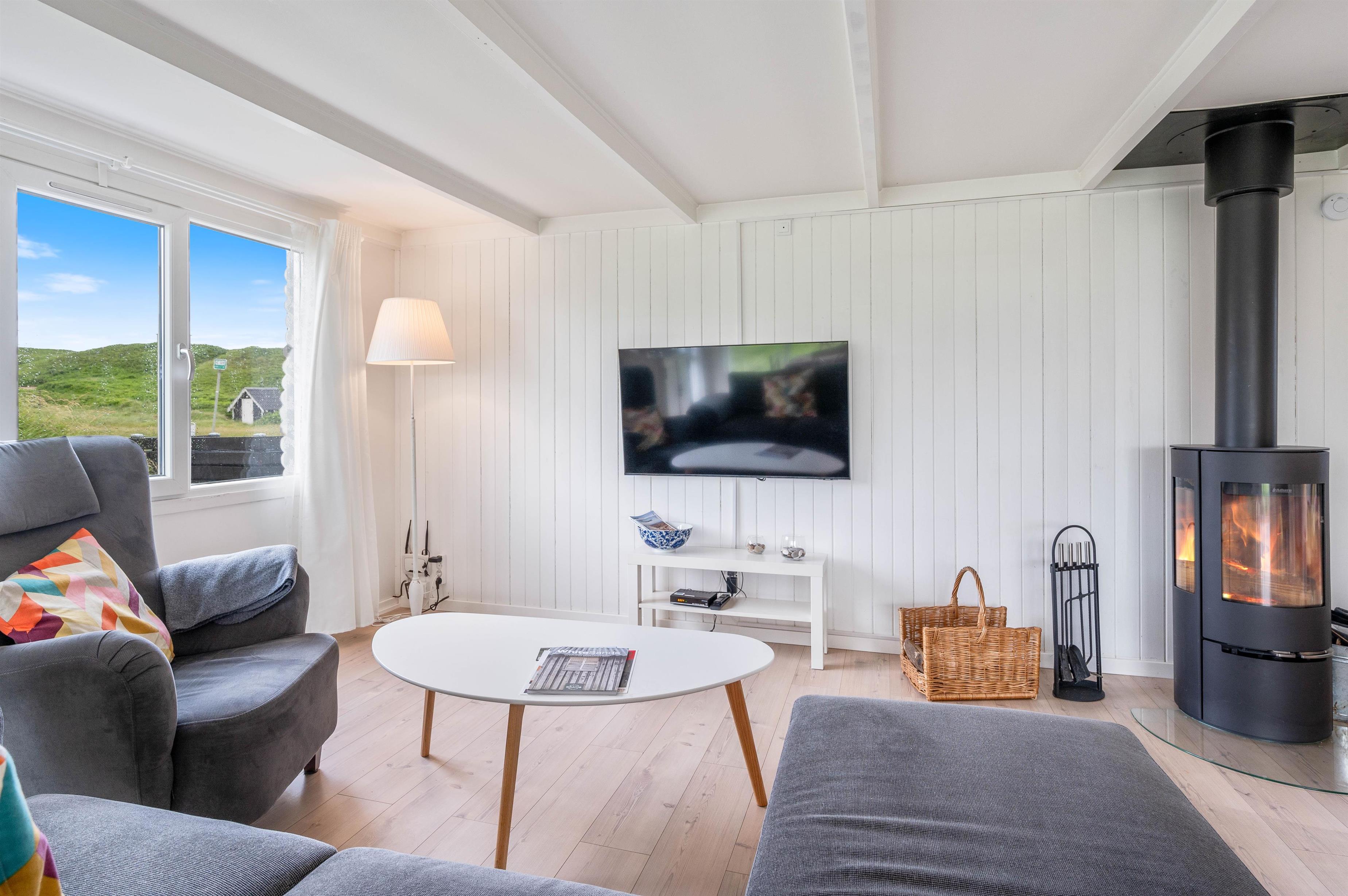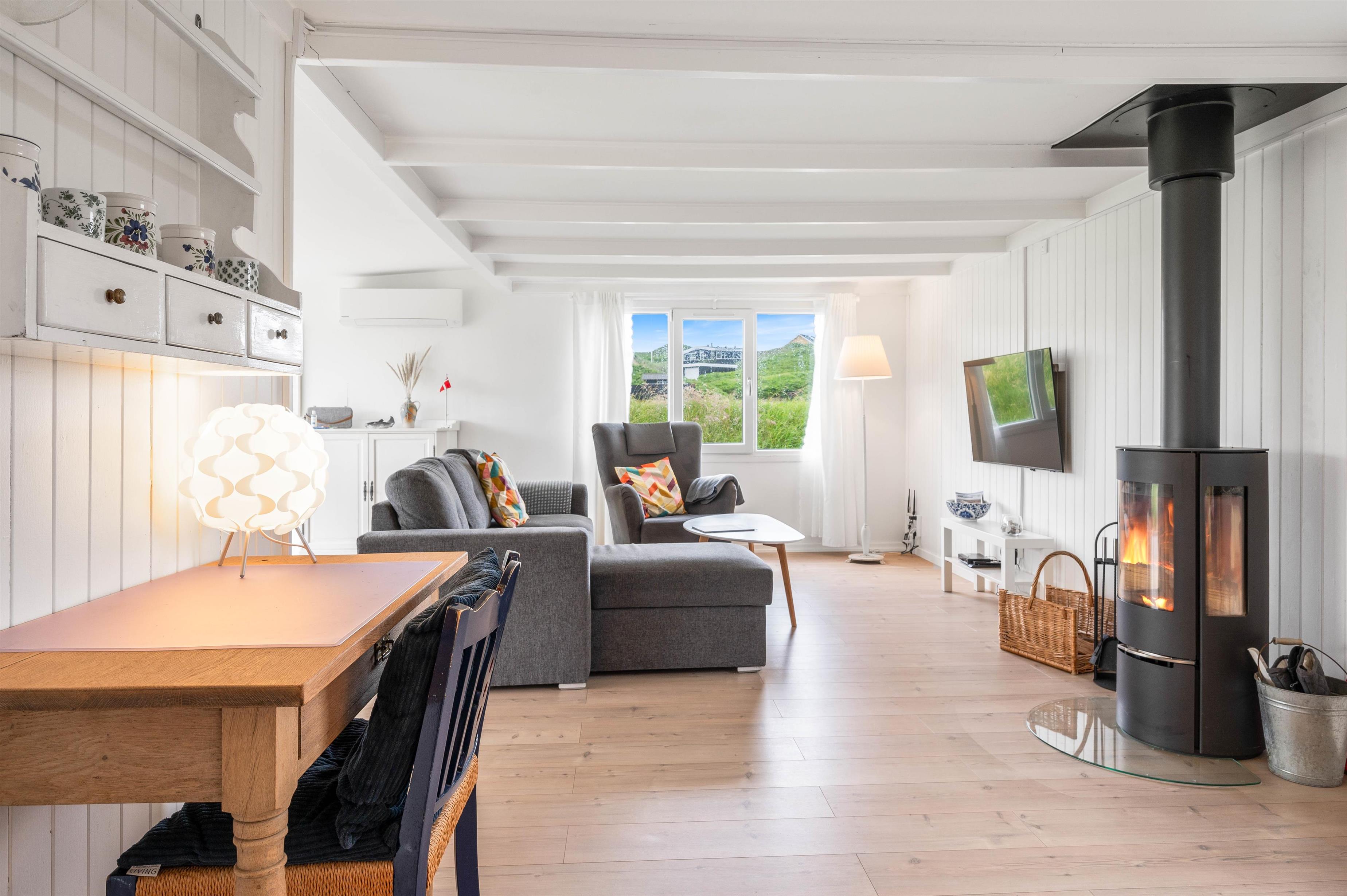 Alle de fine vinduespartier, sørger for et godt lysindfald, der i sammenspil med de hvide trælofter og vægge er med til skabe en hyggelig feriestemning. Hvis I har brug for lidt ekstra feriehygge, så kan I vælge at tænde op I den hyggelige brændeovn og bare nyde al den varme og hygge som den kan sprede.