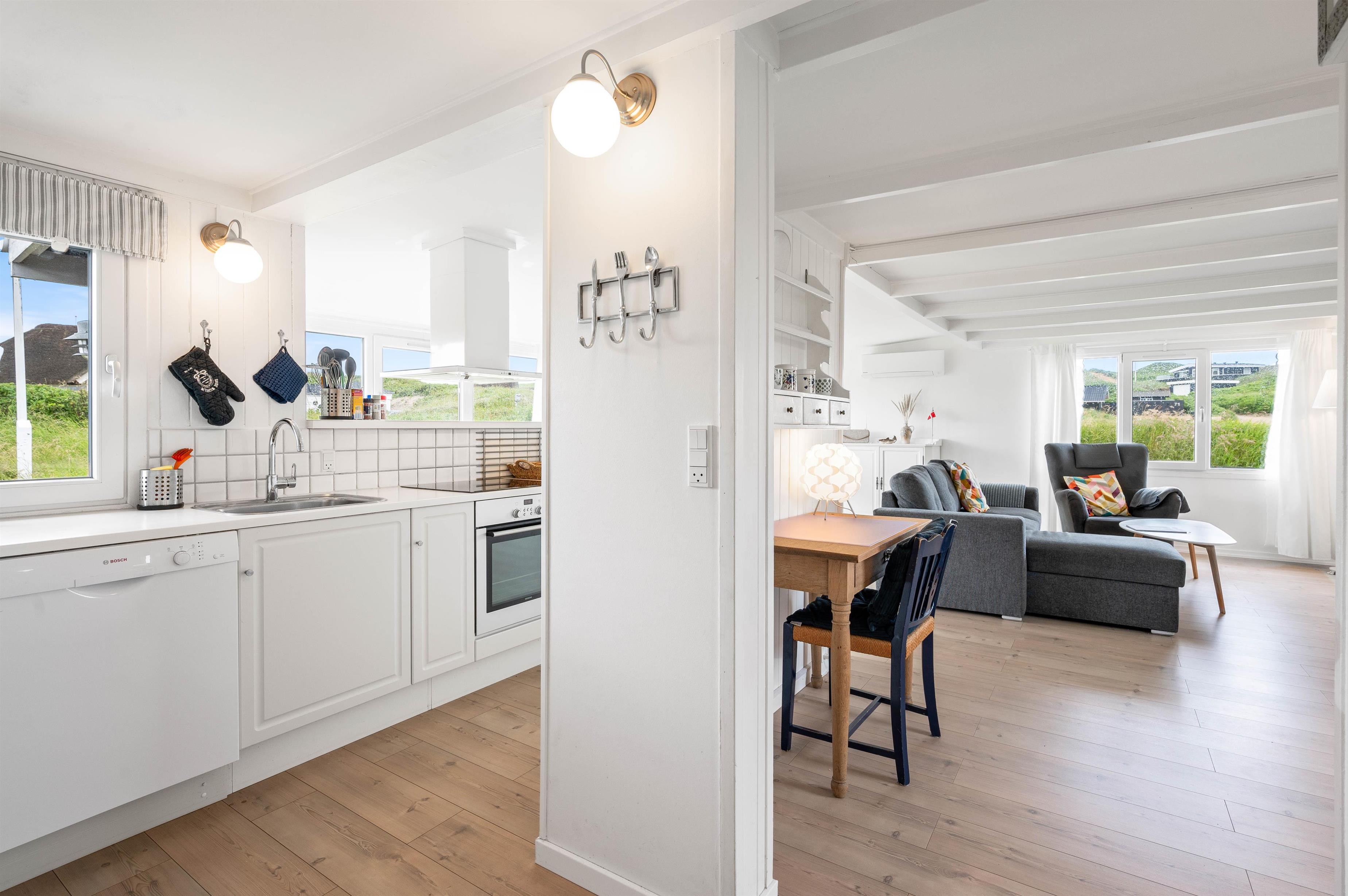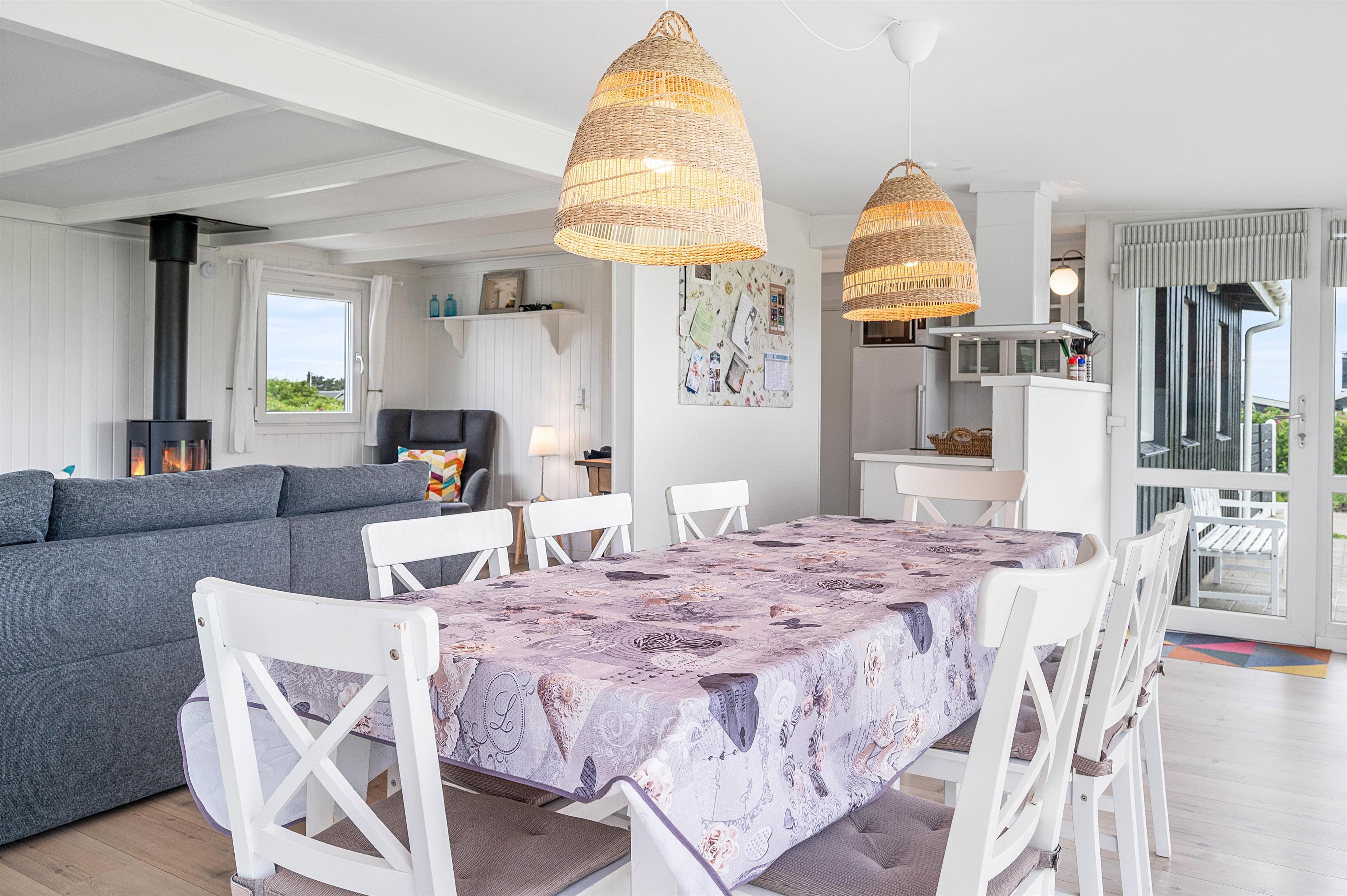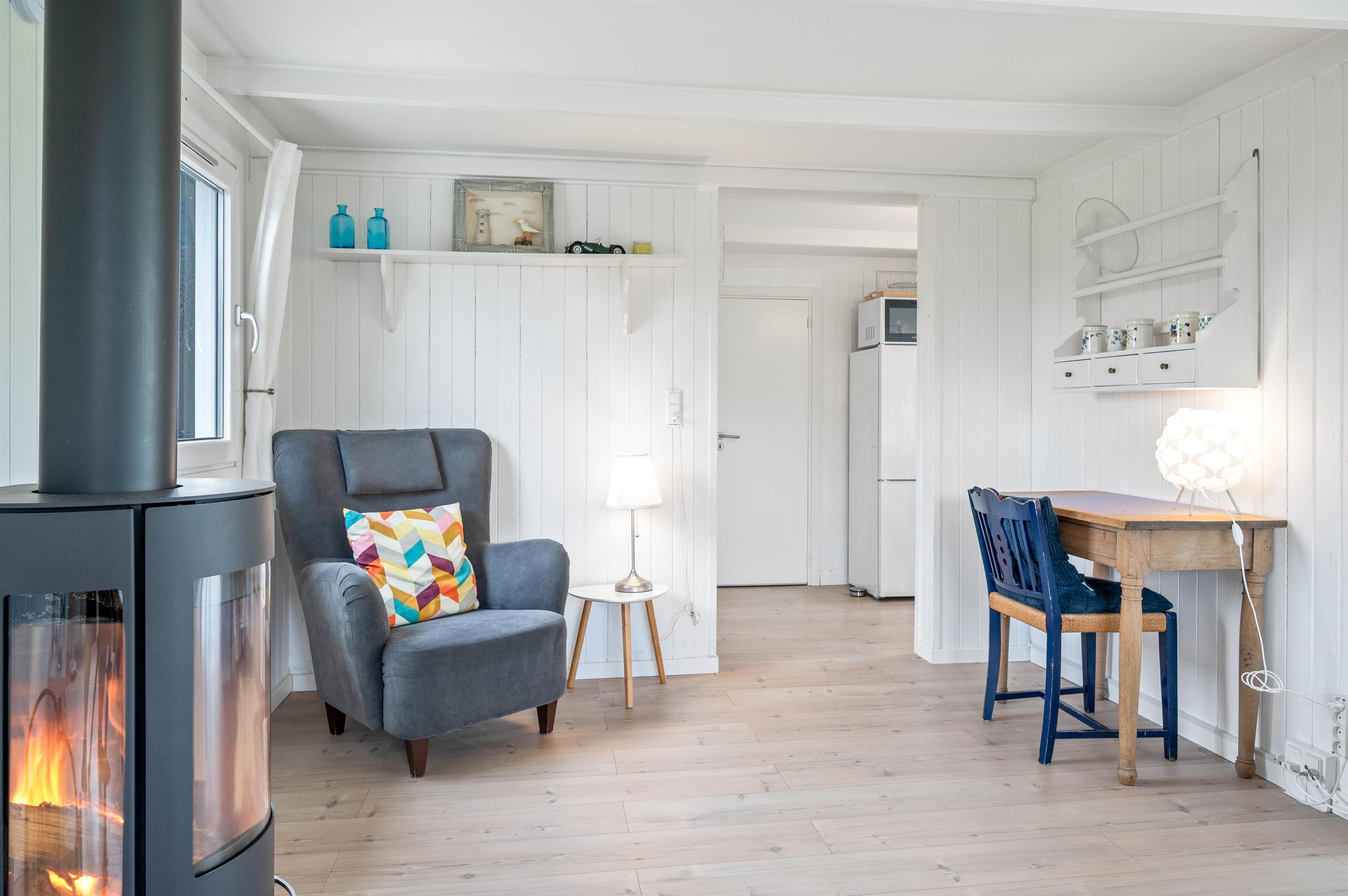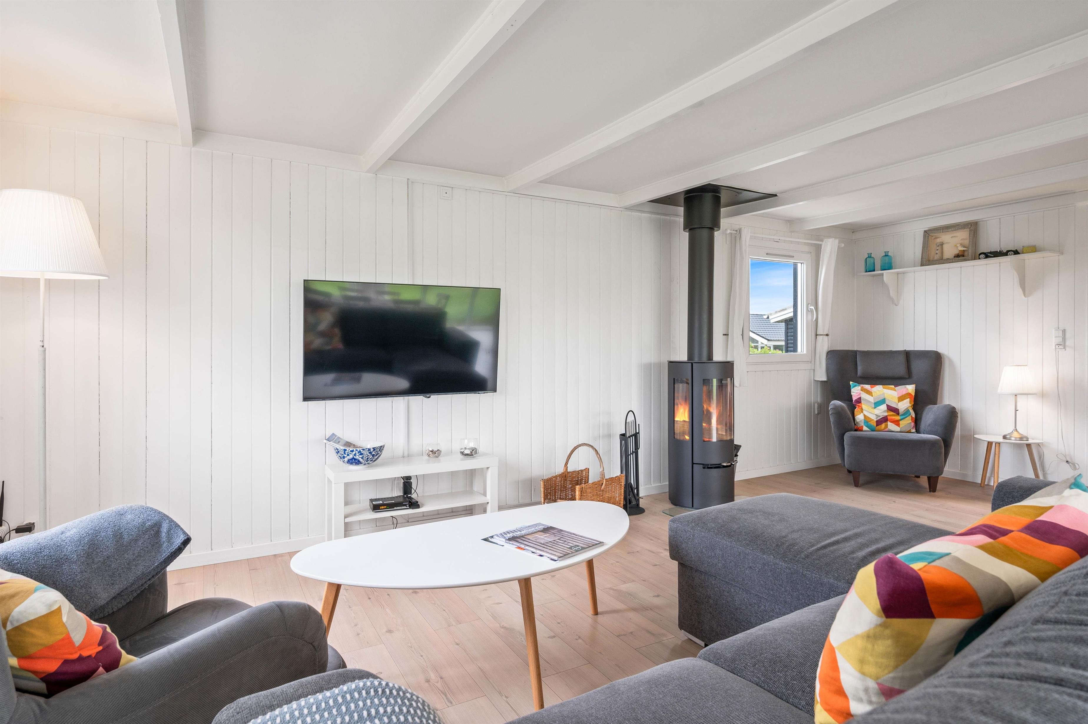 Alle de fine vinduespartier, sørger for et godt lysindfald, der i sammenspil med de hvide trælofter og vægge er med til skabe en hyggelig feriestemning. Hvis I har brug for lidt ekstra feriehygge, så kan I vælge at tænde op I den hyggelige brændeovn og bare nyde al den varme og hygge som den kan sprede.