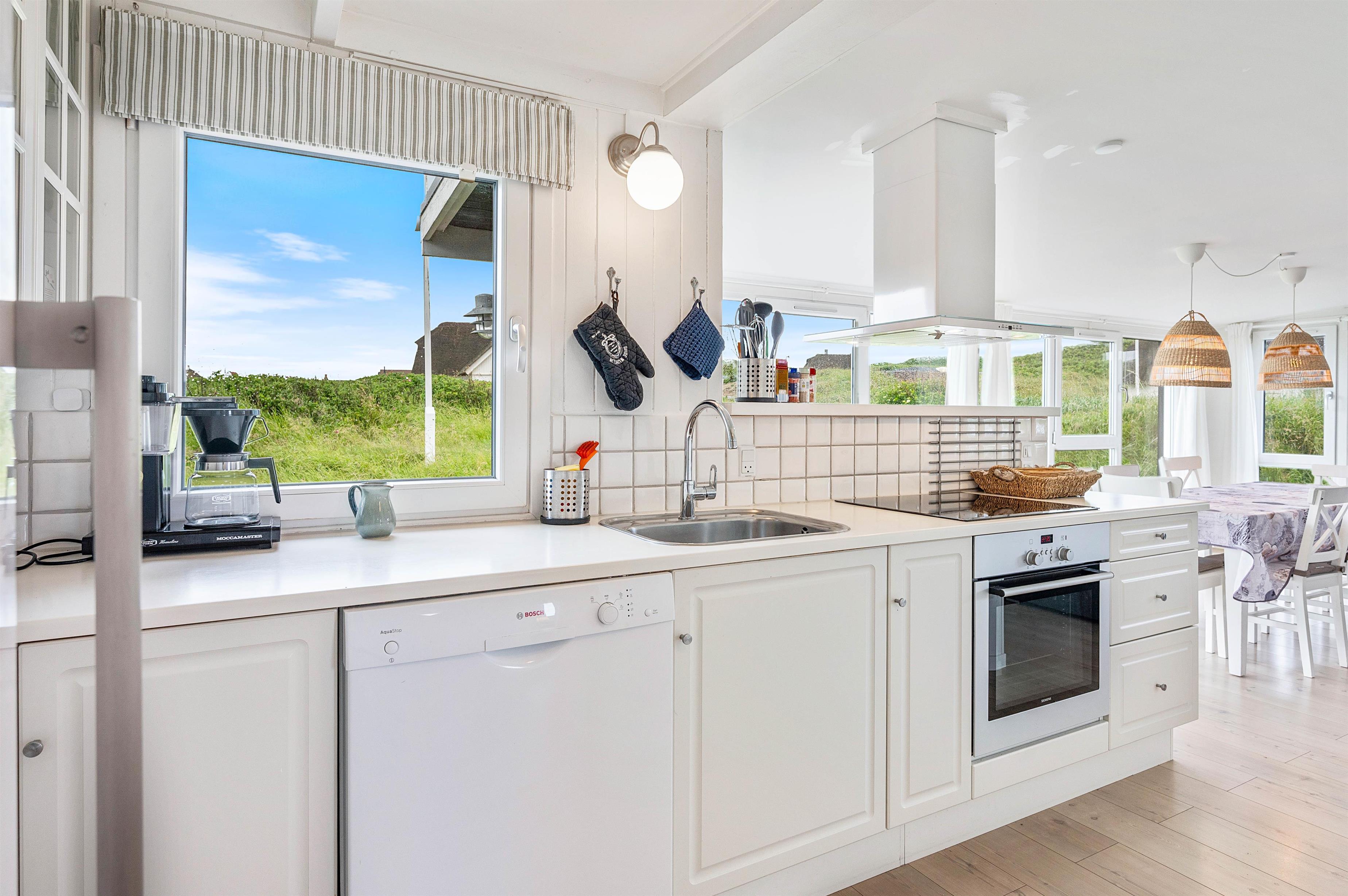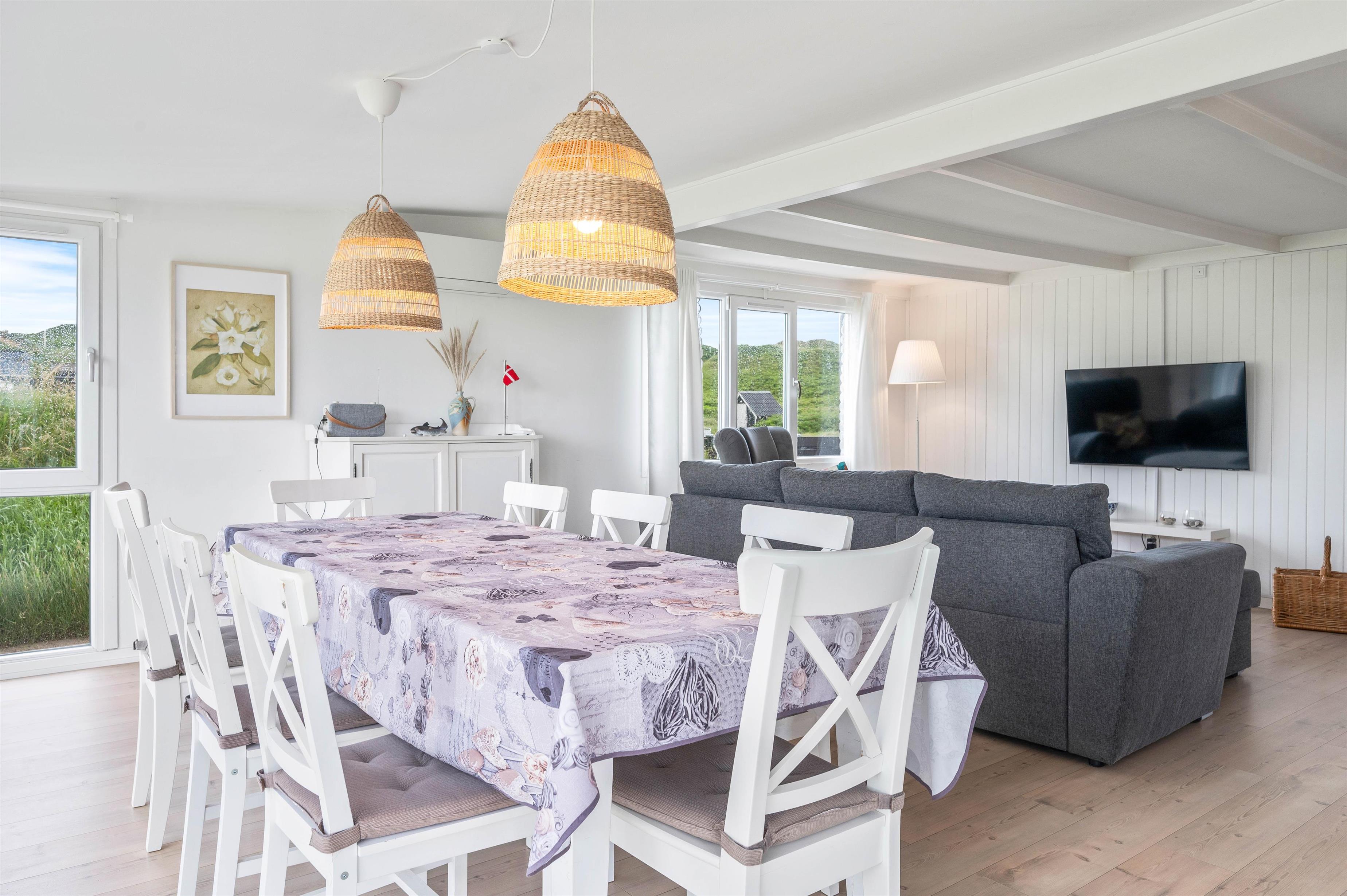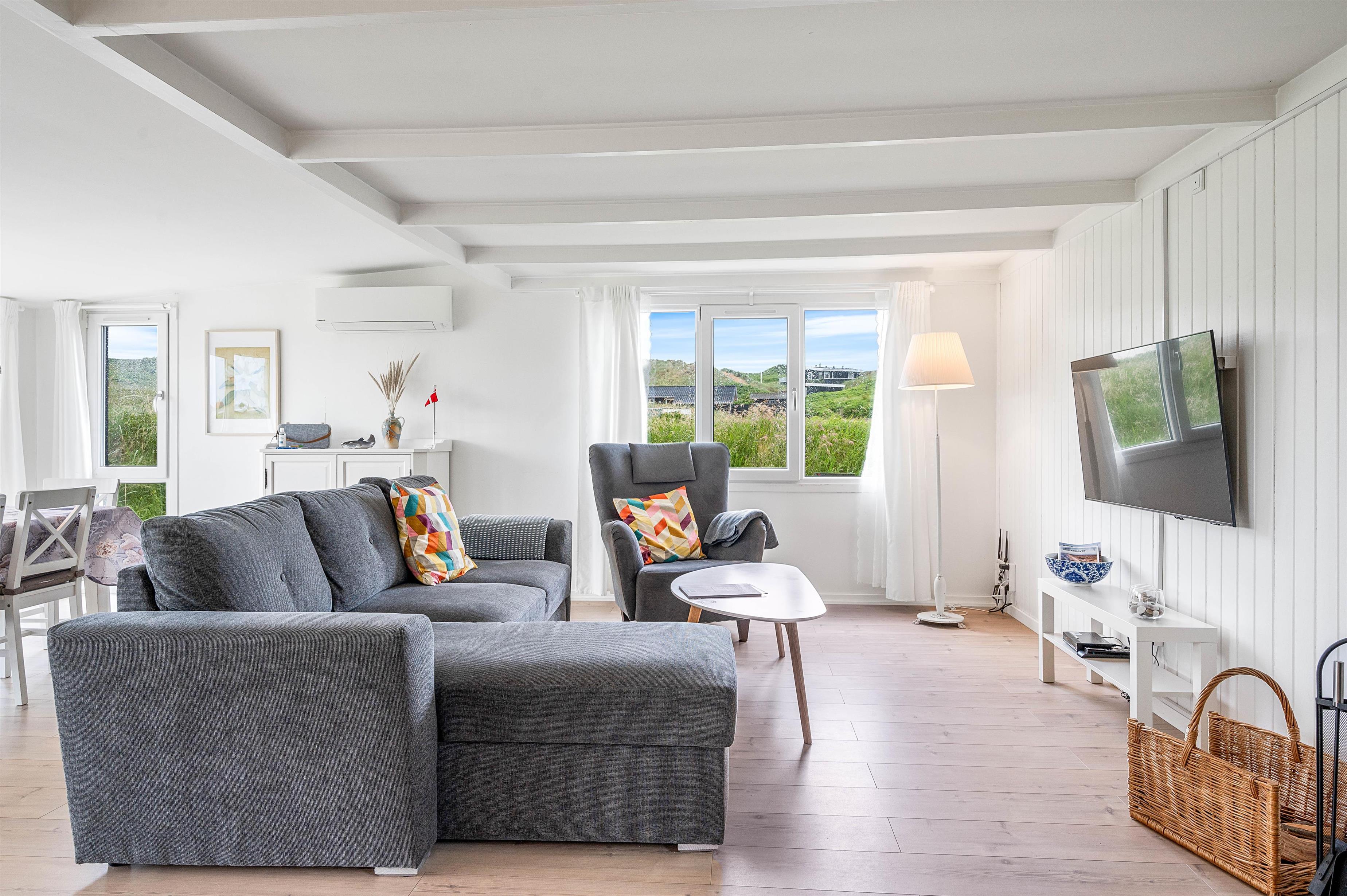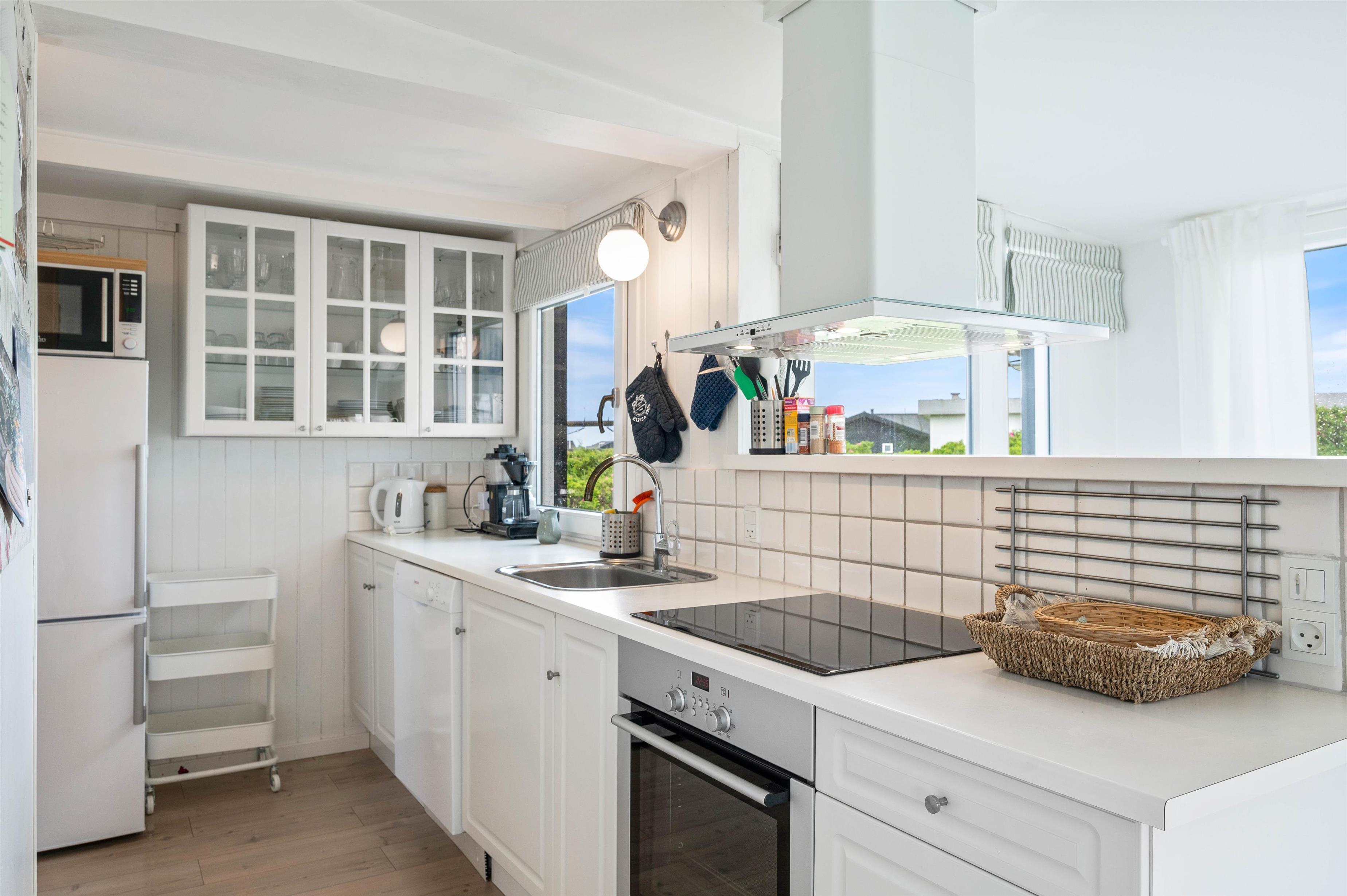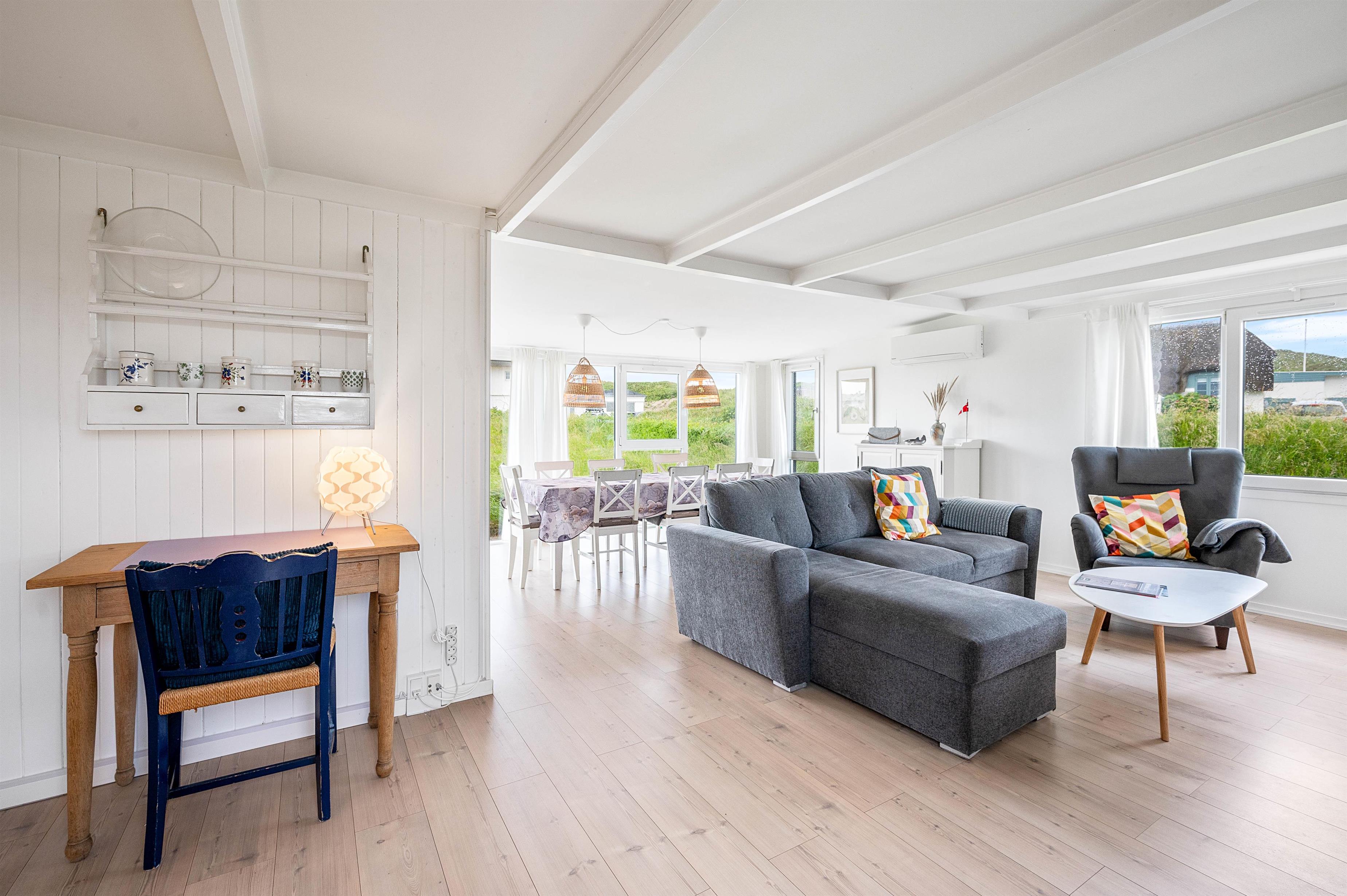 Alle de fine vinduespartier, sørger for et godt lysindfald, der i sammenspil med de hvide trælofter og vægge er med til skabe en hyggelig feriestemning. Hvis I har brug for lidt ekstra feriehygge, så kan I vælge at tænde op I den hyggelige brændeovn og bare nyde al den varme og hygge som den kan sprede.