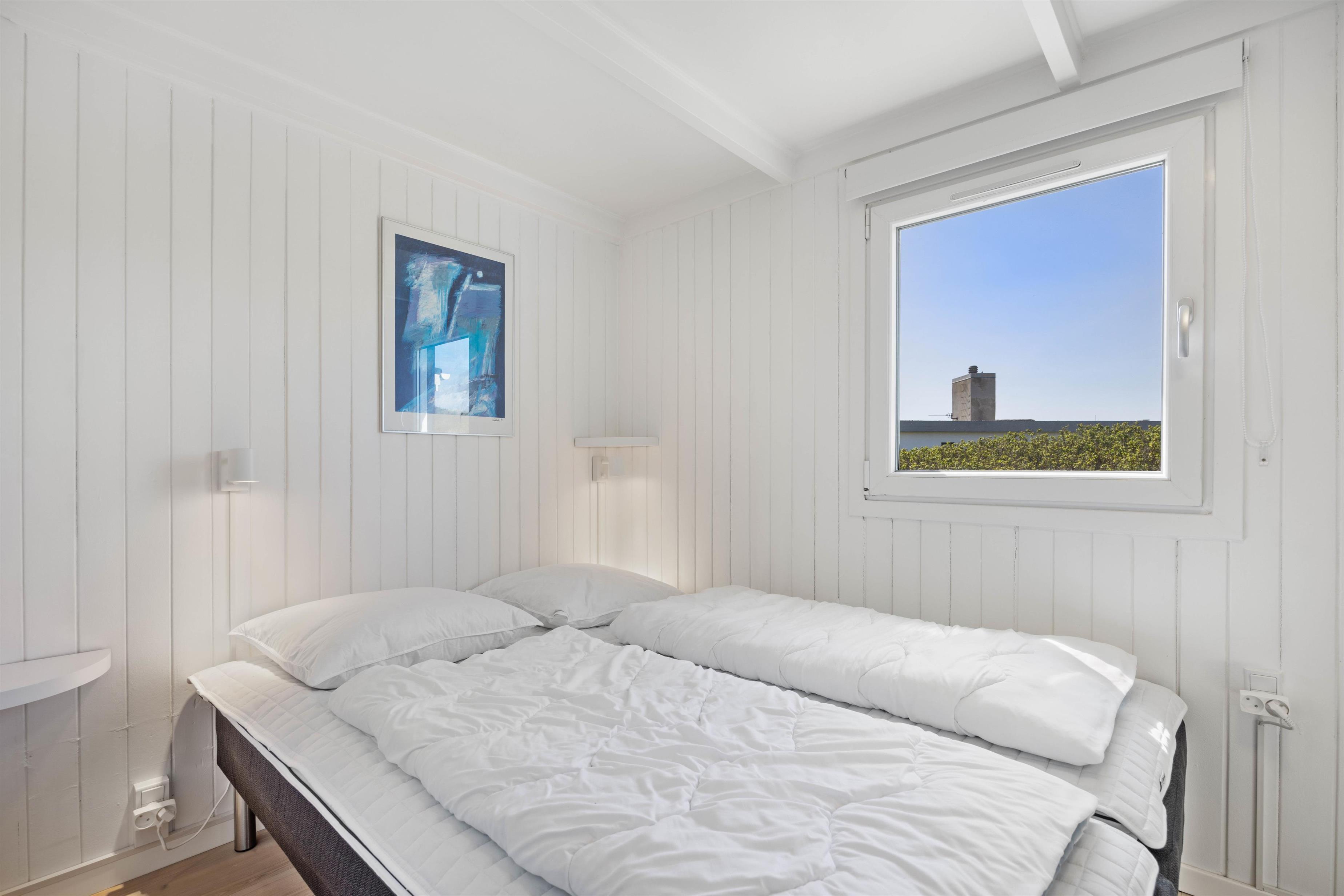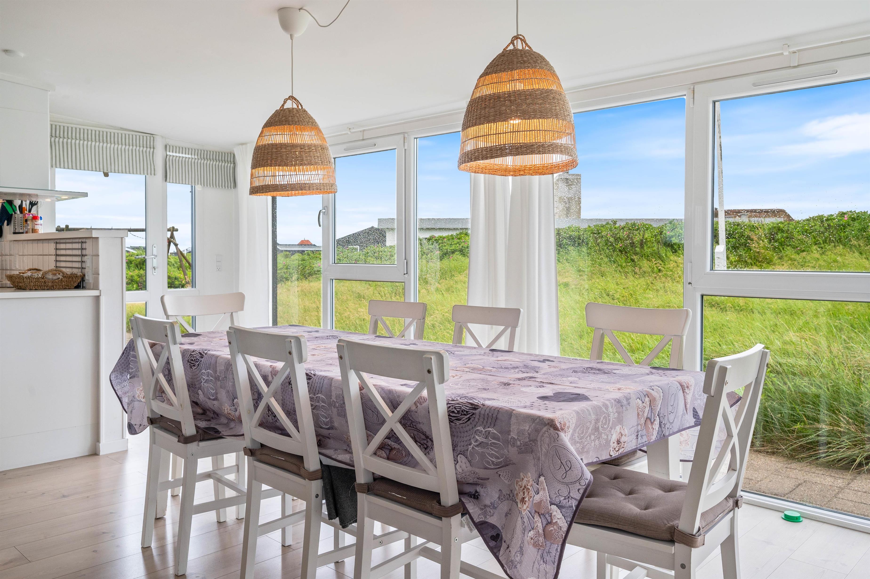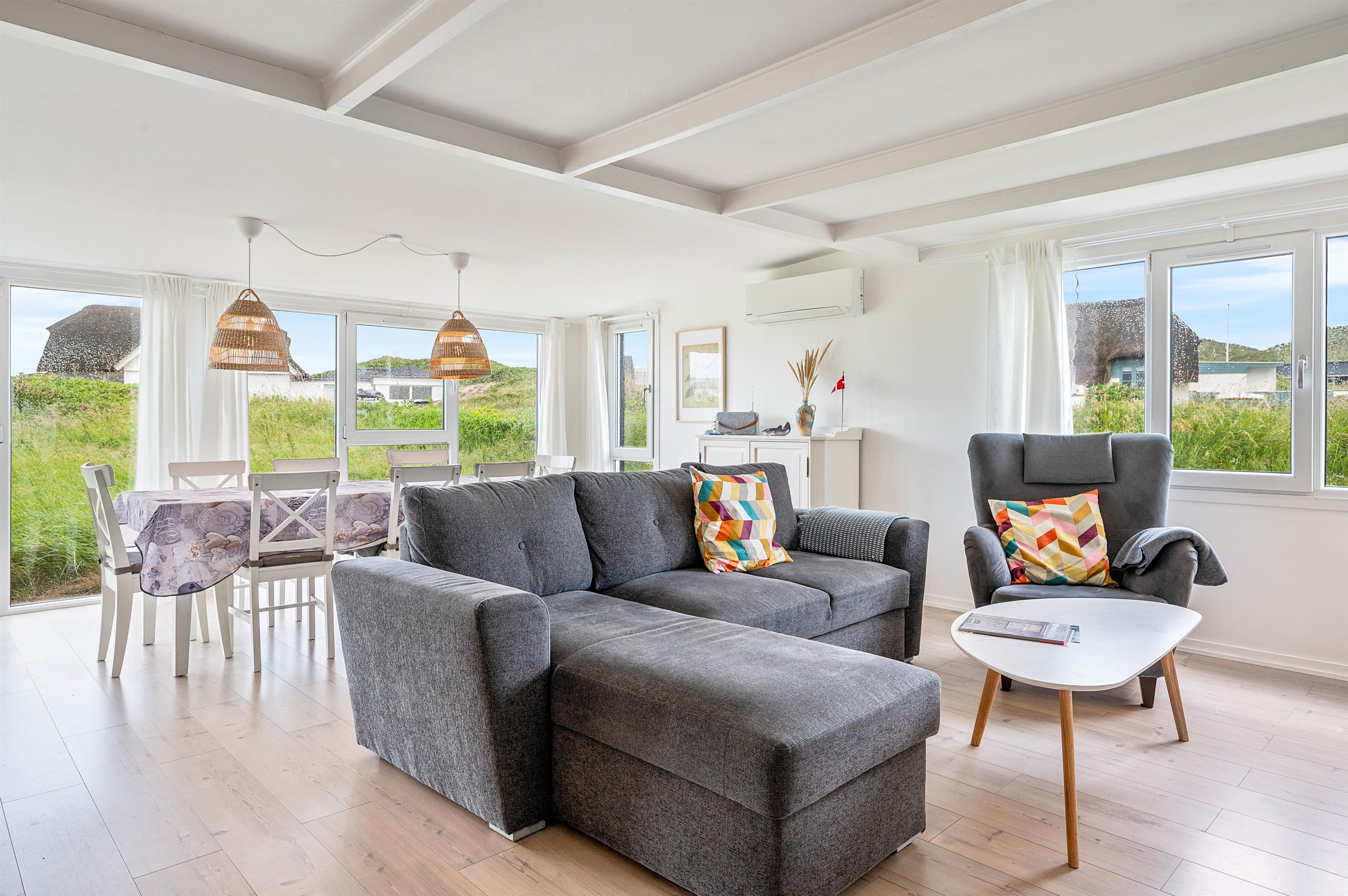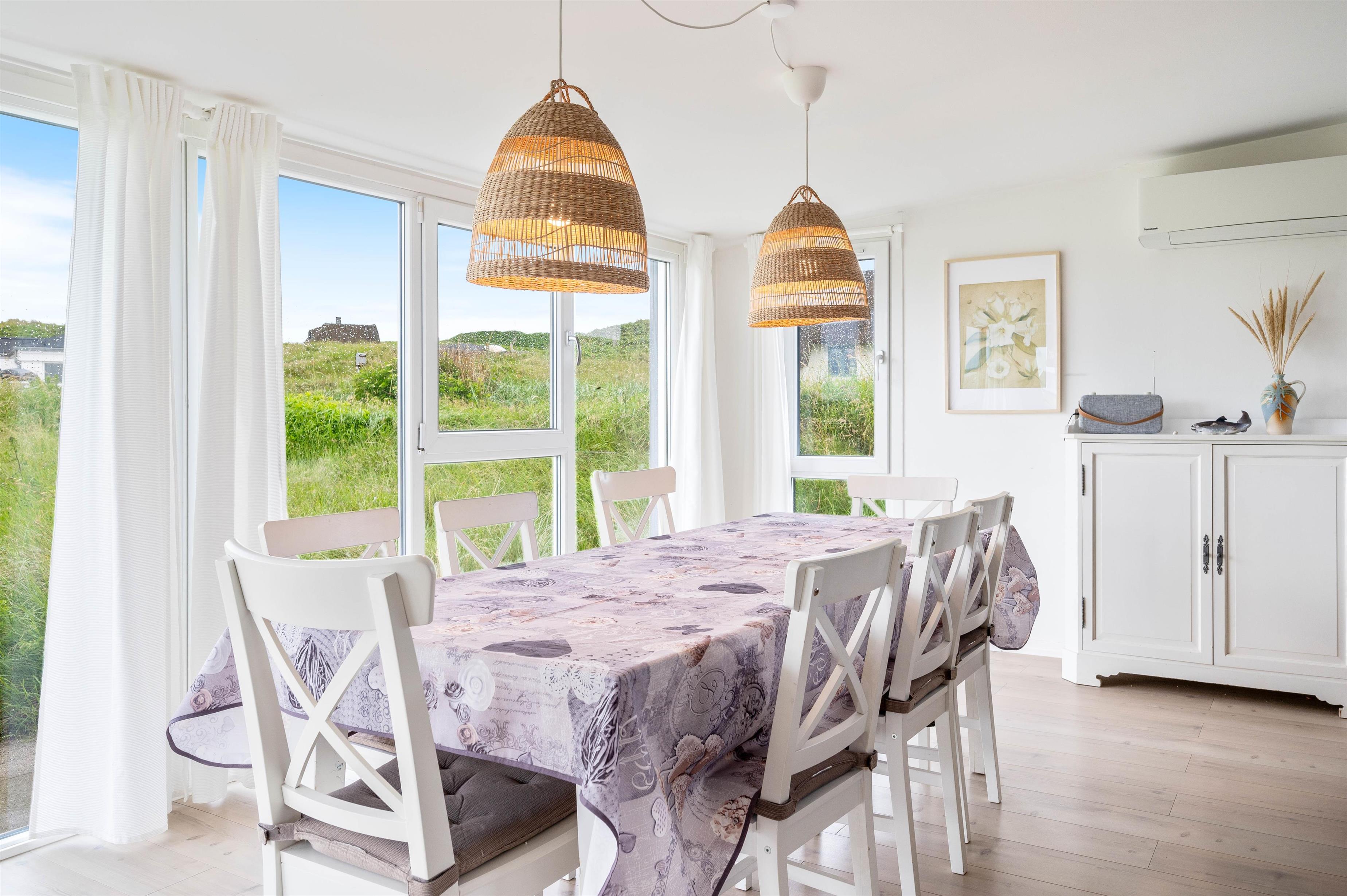 Alle de fine vinduespartier, sørger for et godt lysindfald, der i sammenspil med de hvide trælofter og vægge er med til skabe en hyggelig feriestemning. Hvis I har brug for lidt ekstra feriehygge, så kan I vælge at tænde op I den hyggelige brændeovn og bare nyde al den varme og hygge som den kan sprede.