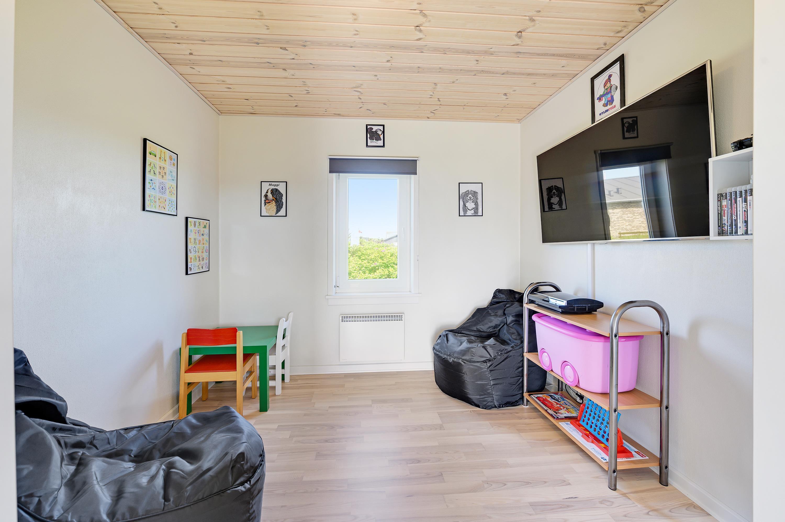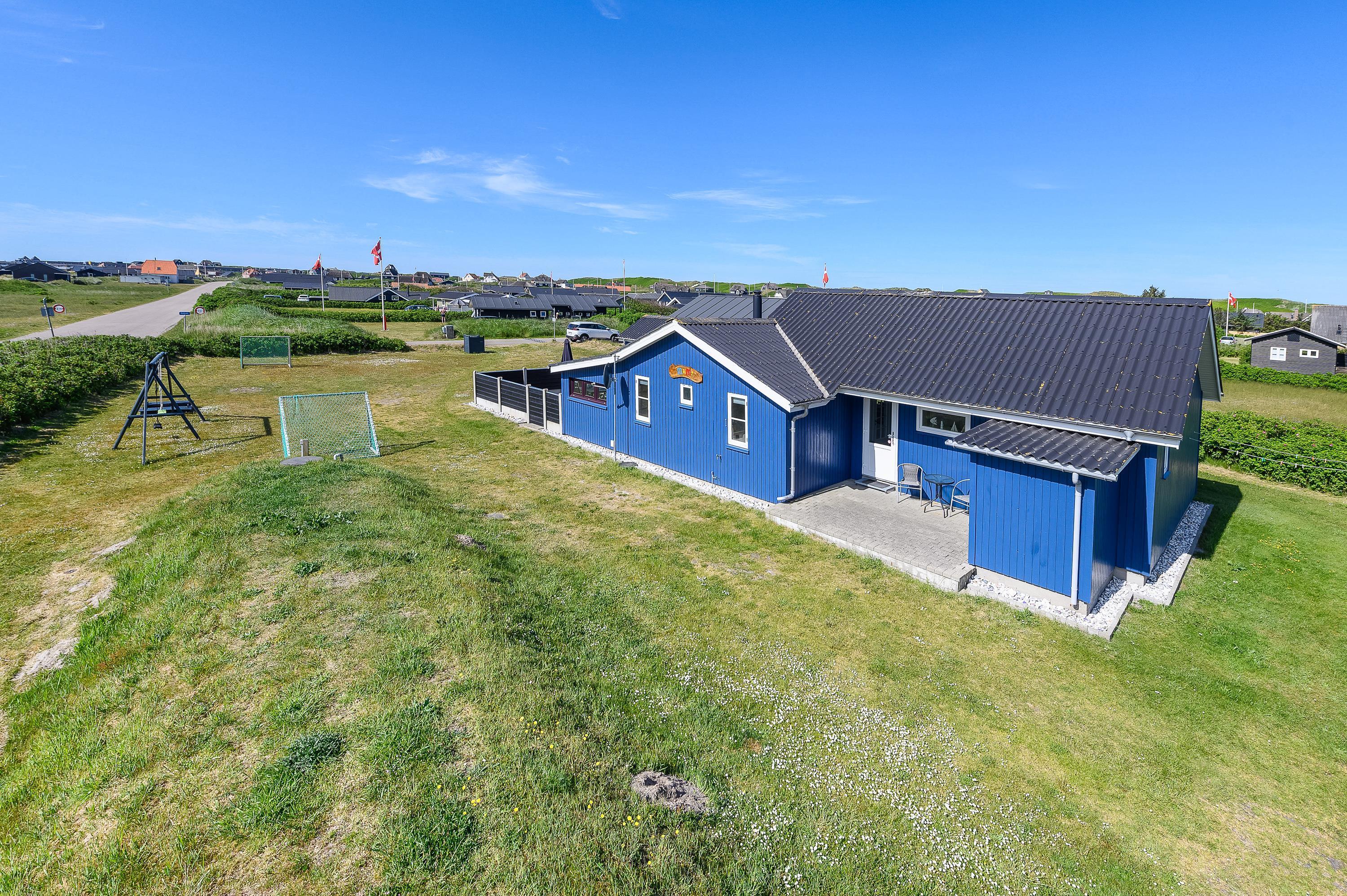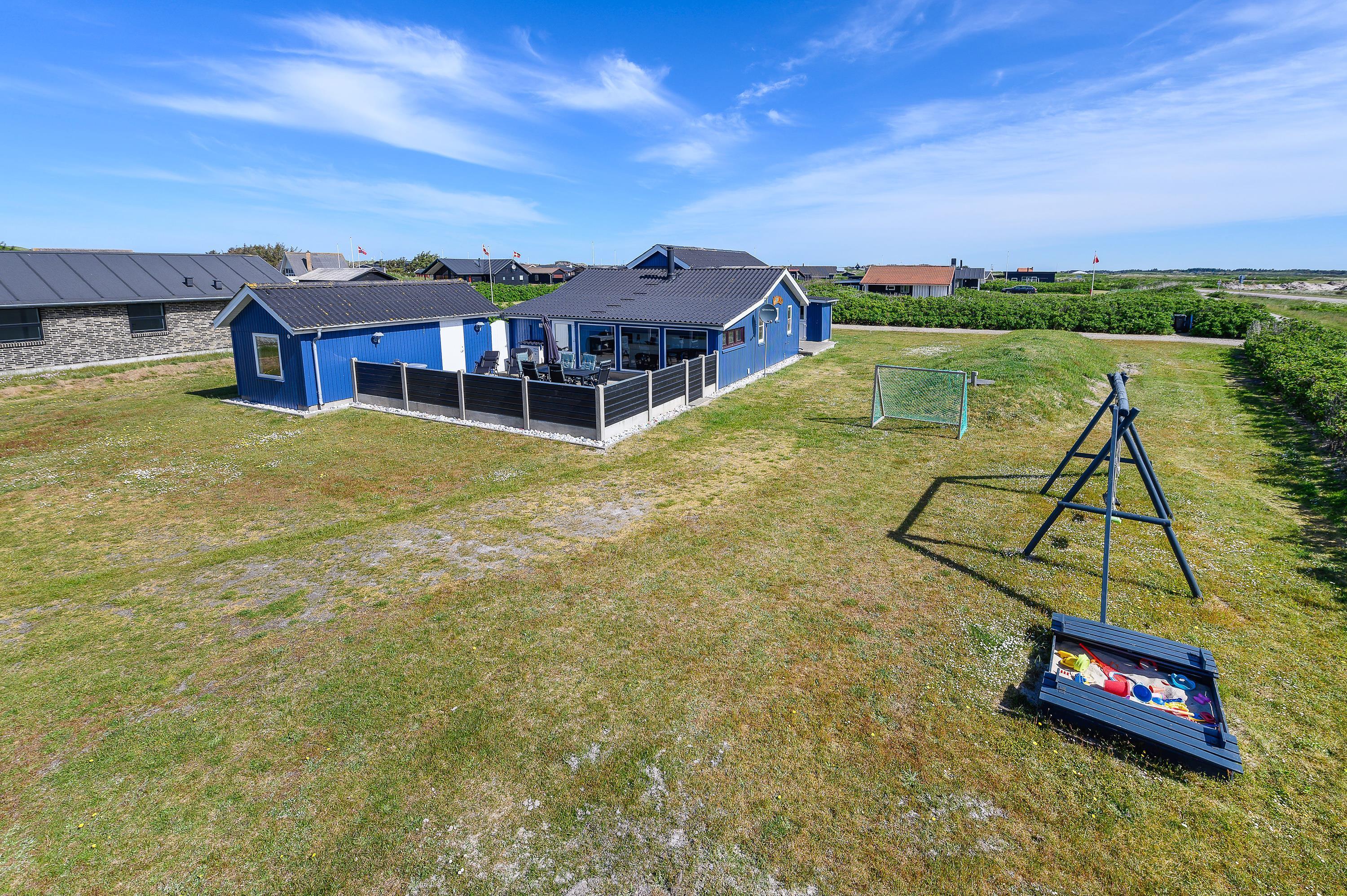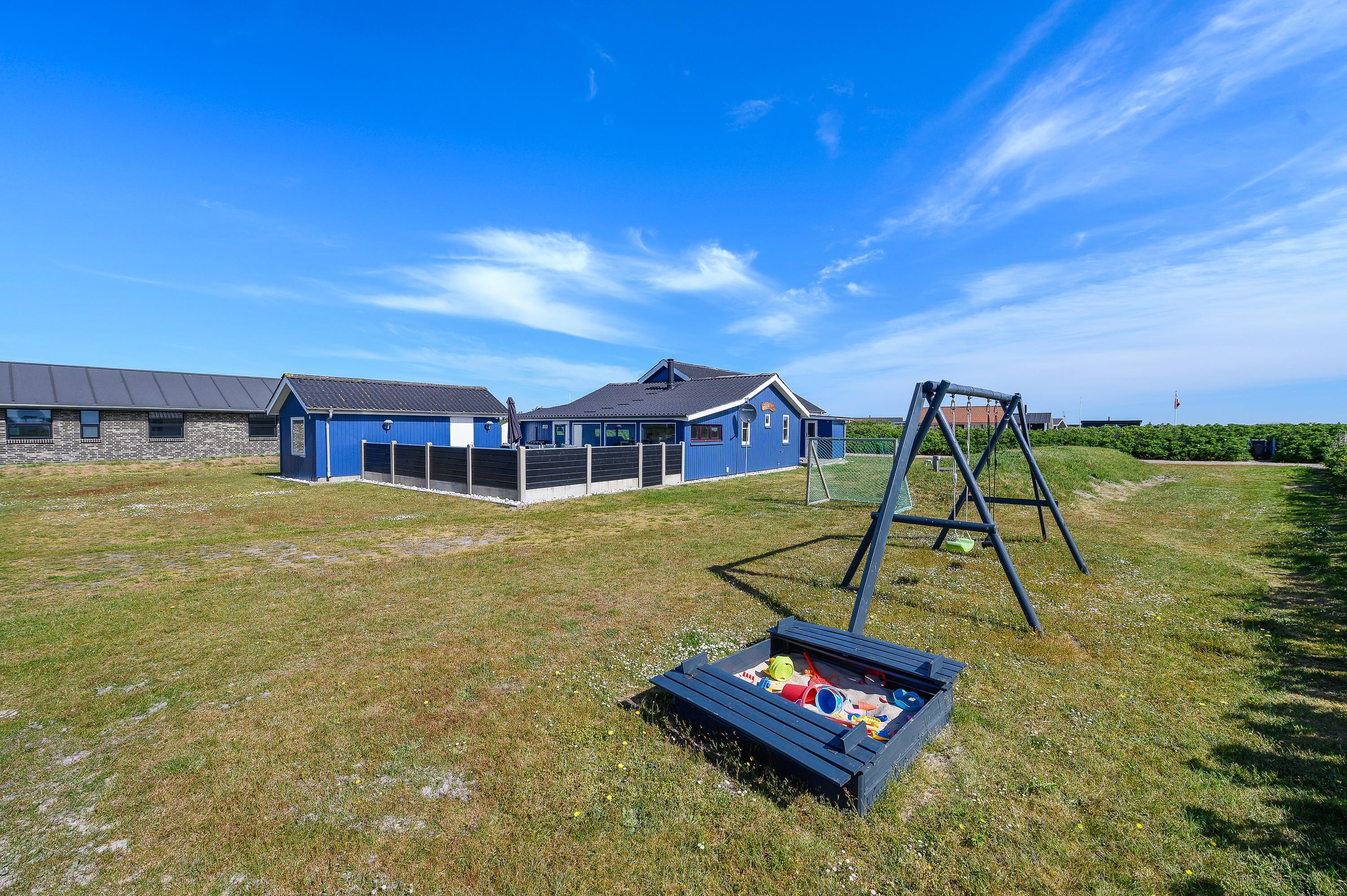Fra stuen går du ned i en skøn havestue, hvorfra der er udgang til en stor lukket solgård. Udestuen inviterer til afslapning og naturoplevelser hele året rundt, mens den lukkede terrasse med havemøbler tilbyder et perfekt samlingspunkt til familiegrill med den medfølgende grill. Hvis børnene har brug for at bruge deres energi, er der både gynge, sandkasse og en fin plænegrund med fodboldmål klar til de små udenfor. Derudover befinder Vesterhavet sig kun 400 meter fra sommerhuset.