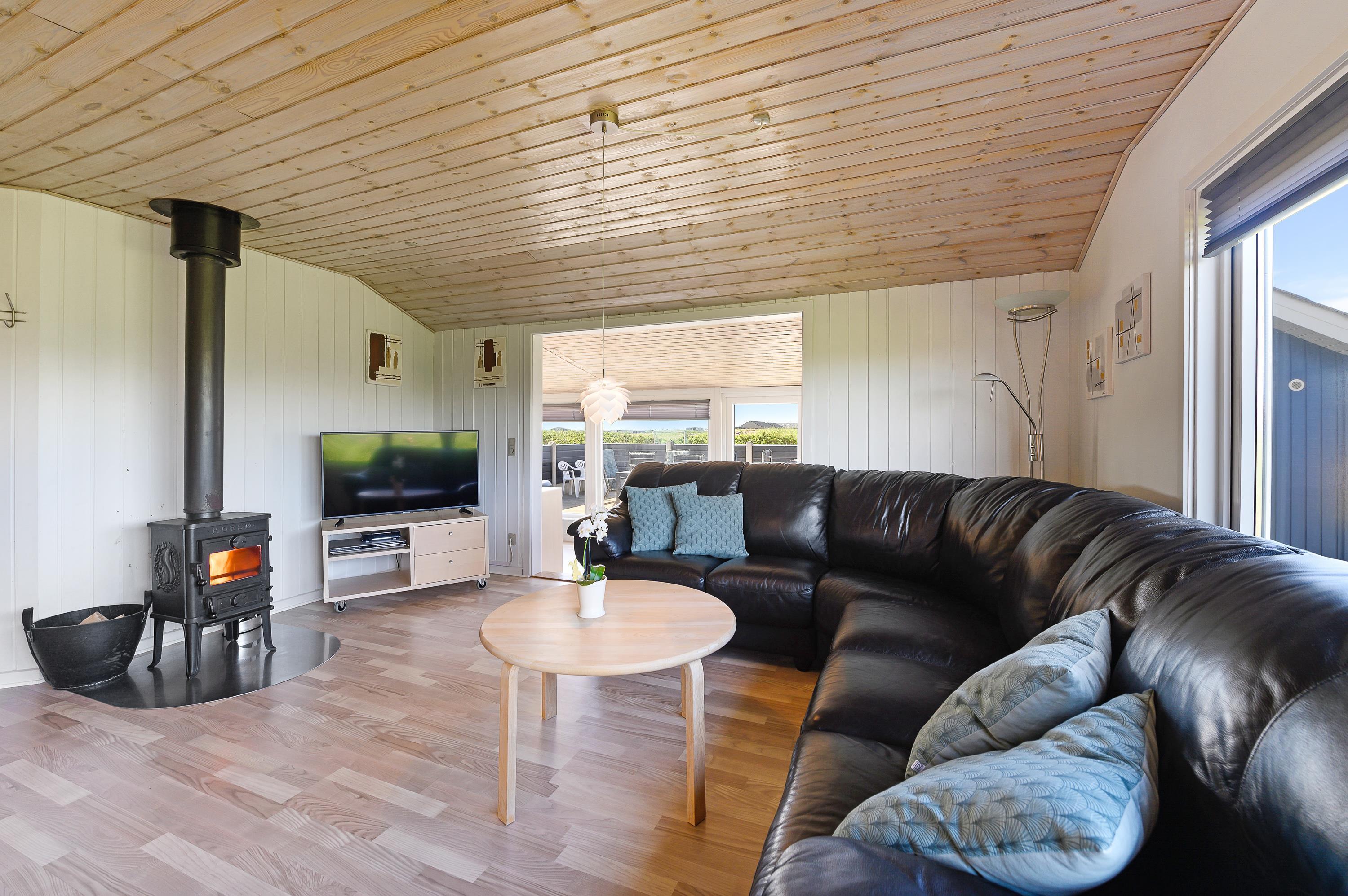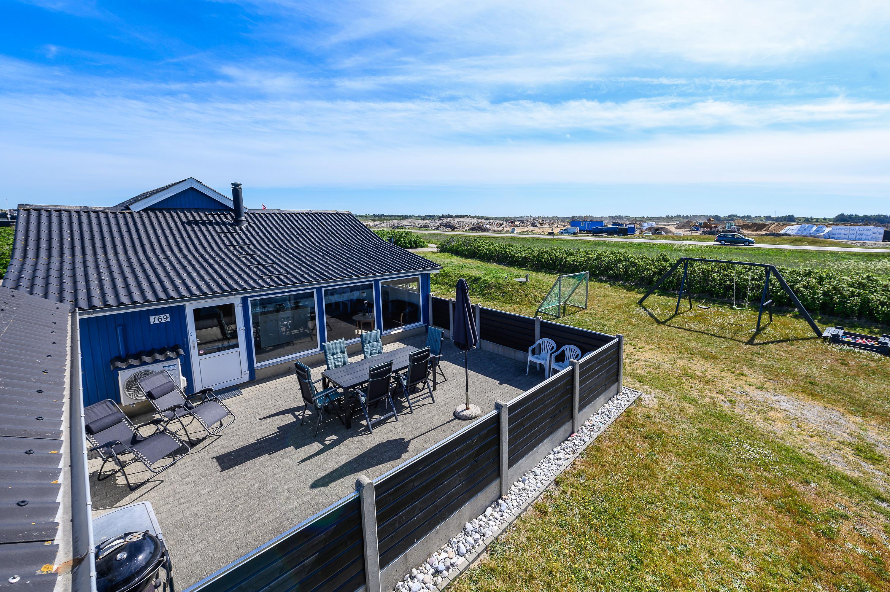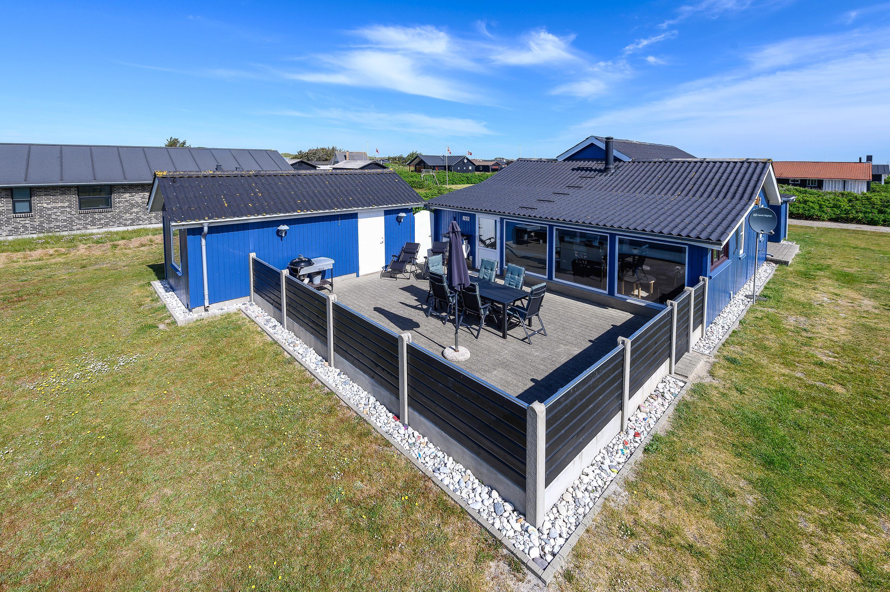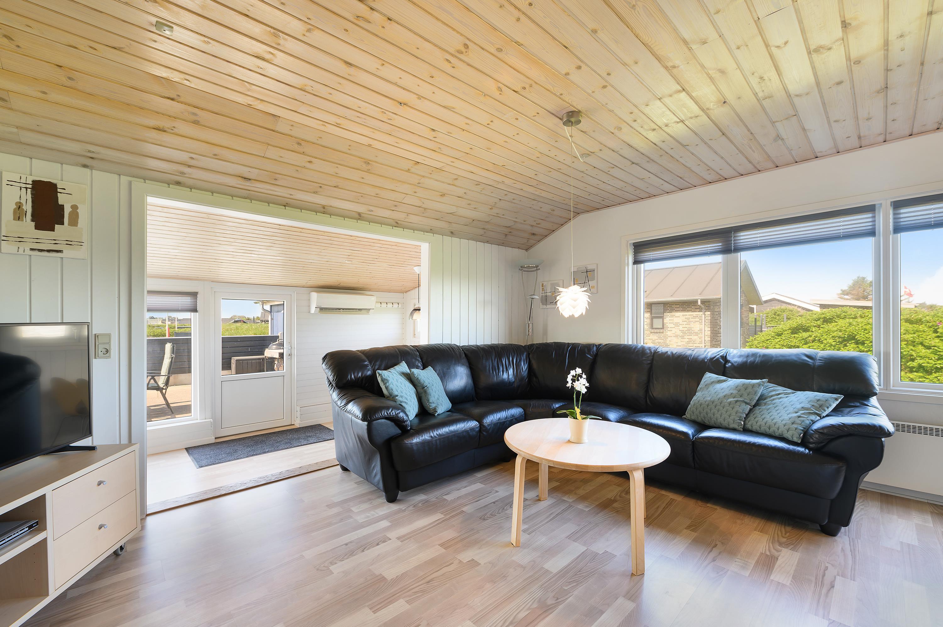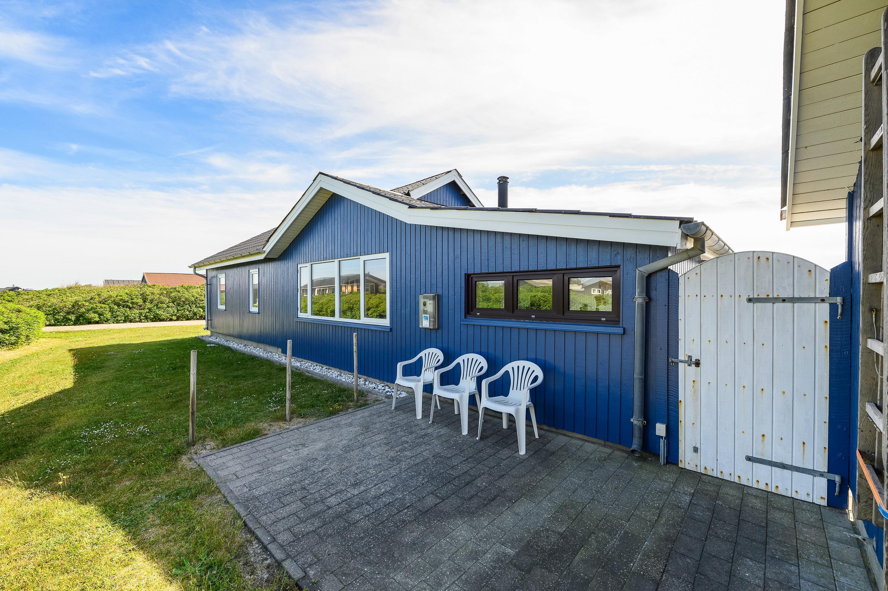 Fra stuen går du ned i en skøn havestue, hvorfra der er udgang til en stor lukket solgård. Udestuen inviterer til afslapning og naturoplevelser hele året rundt, mens den lukkede terrasse med havemøbler tilbyder et perfekt samlingspunkt til familiegrill med den medfølgende grill. Hvis børnene har brug for at bruge deres energi, er der både gynge, sandkasse og en fin plænegrund med fodboldmål klar til de små udenfor. Derudover befinder Vesterhavet sig kun 400 meter fra sommerhuset.