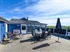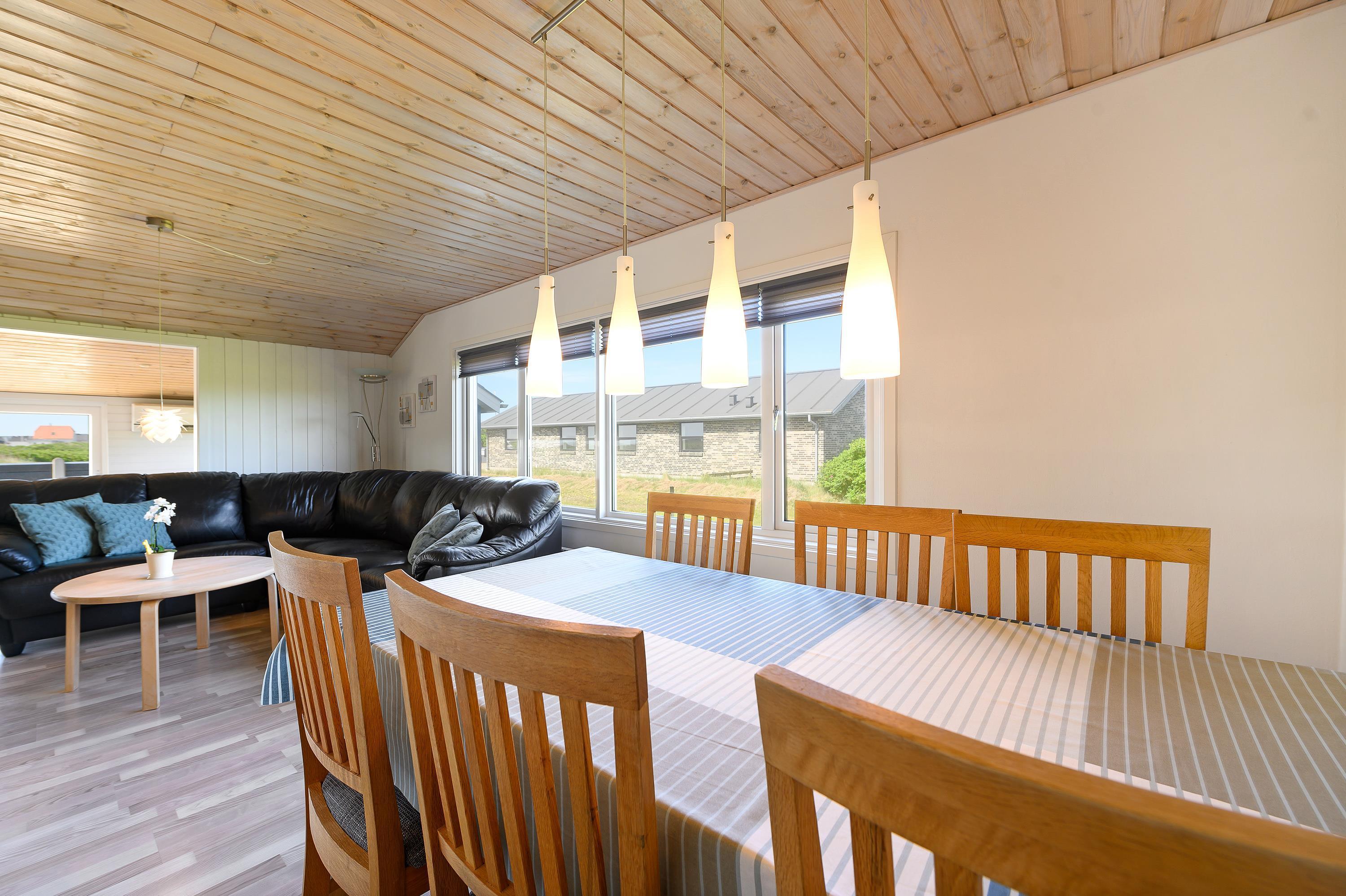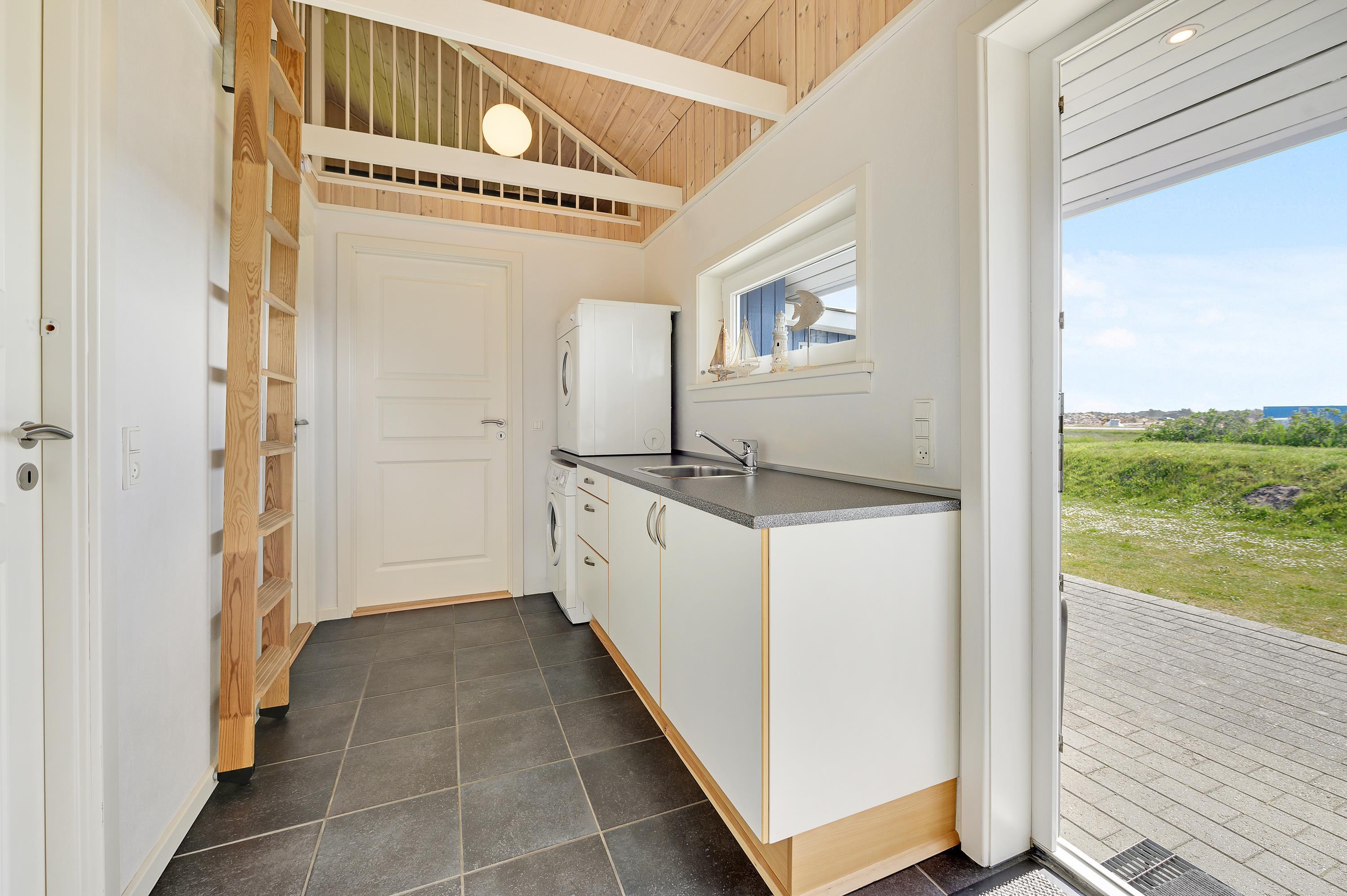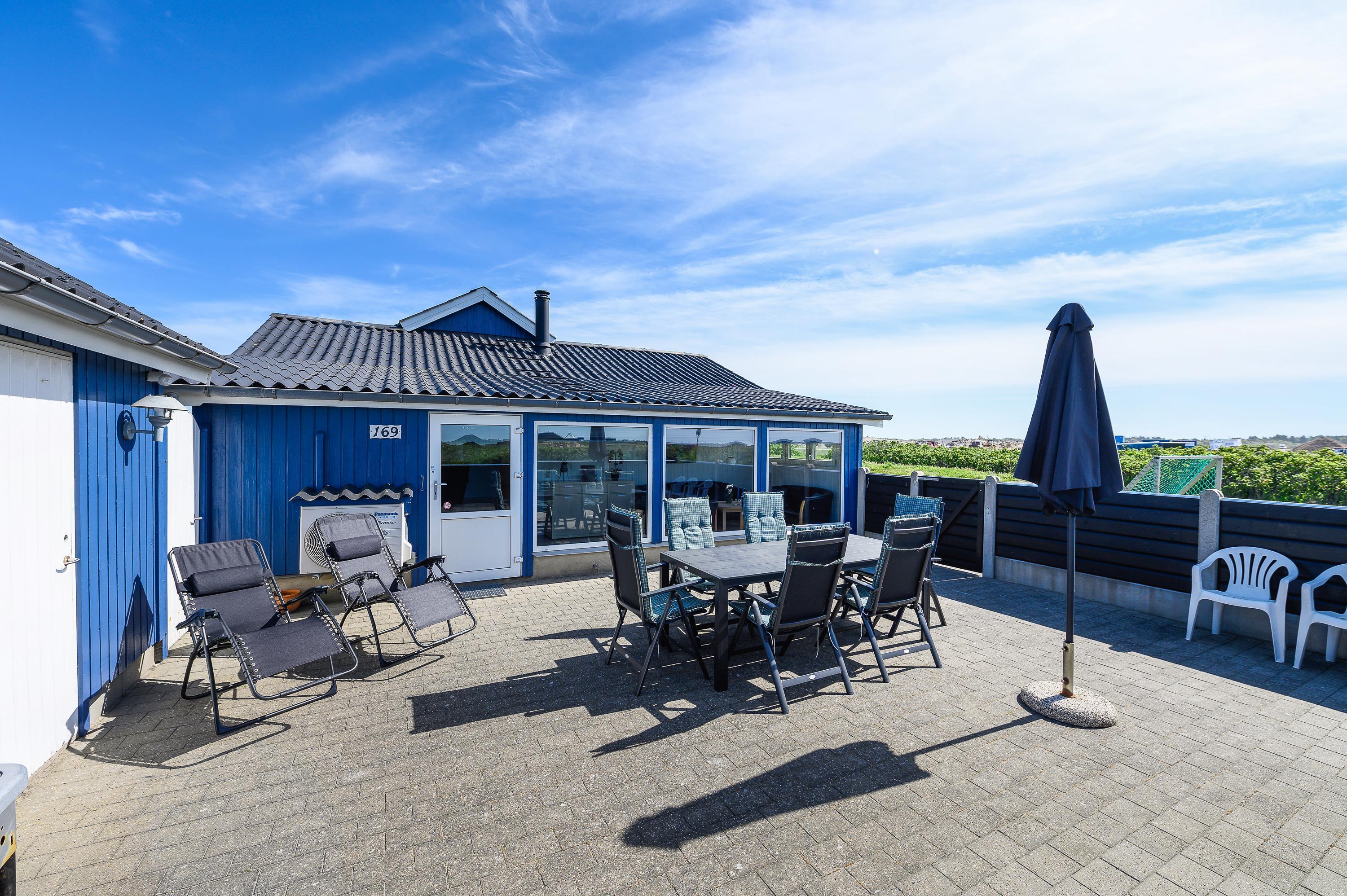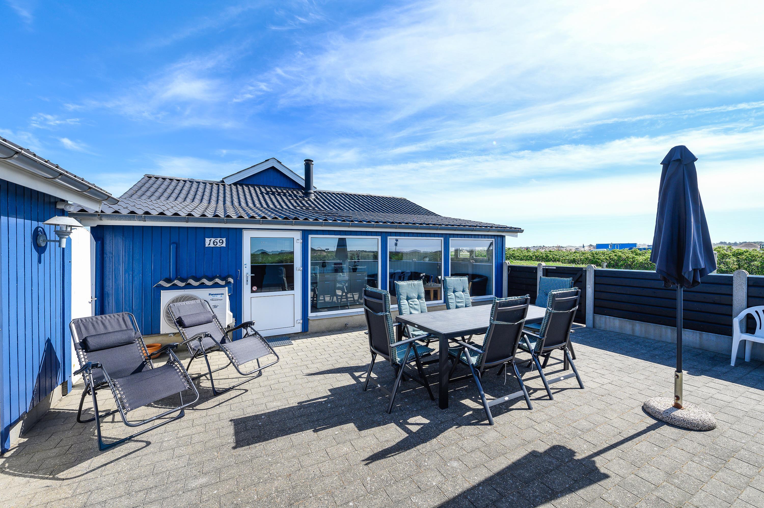 Fra stuen går du ned i en skøn havestue, hvorfra der er udgang til en stor lukket solgård. Udestuen inviterer til afslapning og naturoplevelser hele året rundt, mens den lukkede terrasse med havemøbler tilbyder et perfekt samlingspunkt til familiegrill med den medfølgende grill. Hvis børnene har brug for at bruge deres energi, er der både gynge, sandkasse og en fin plænegrund med fodboldmål klar til de små udenfor. Derudover befinder Vesterhavet sig kun 400 meter fra sommerhuset.