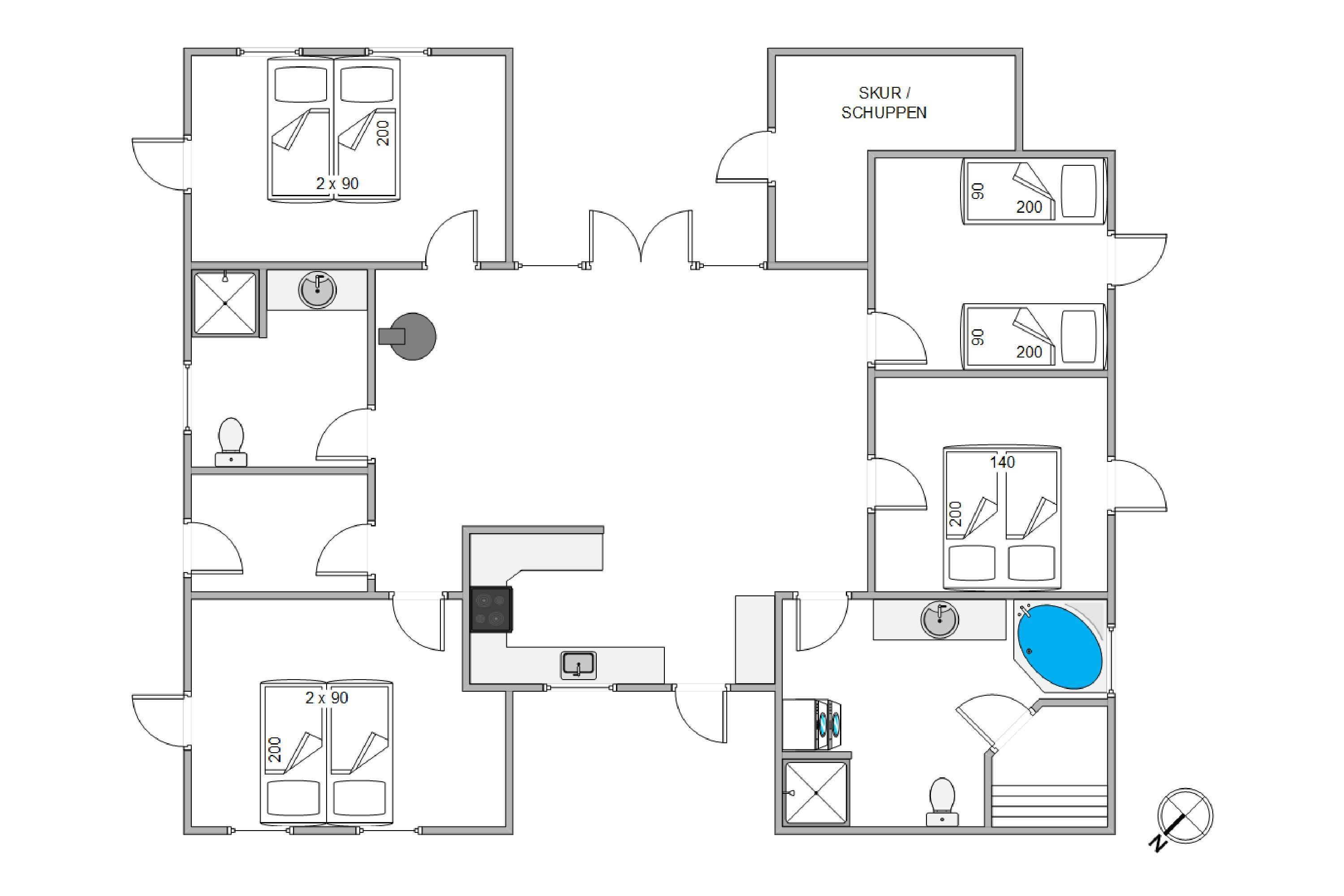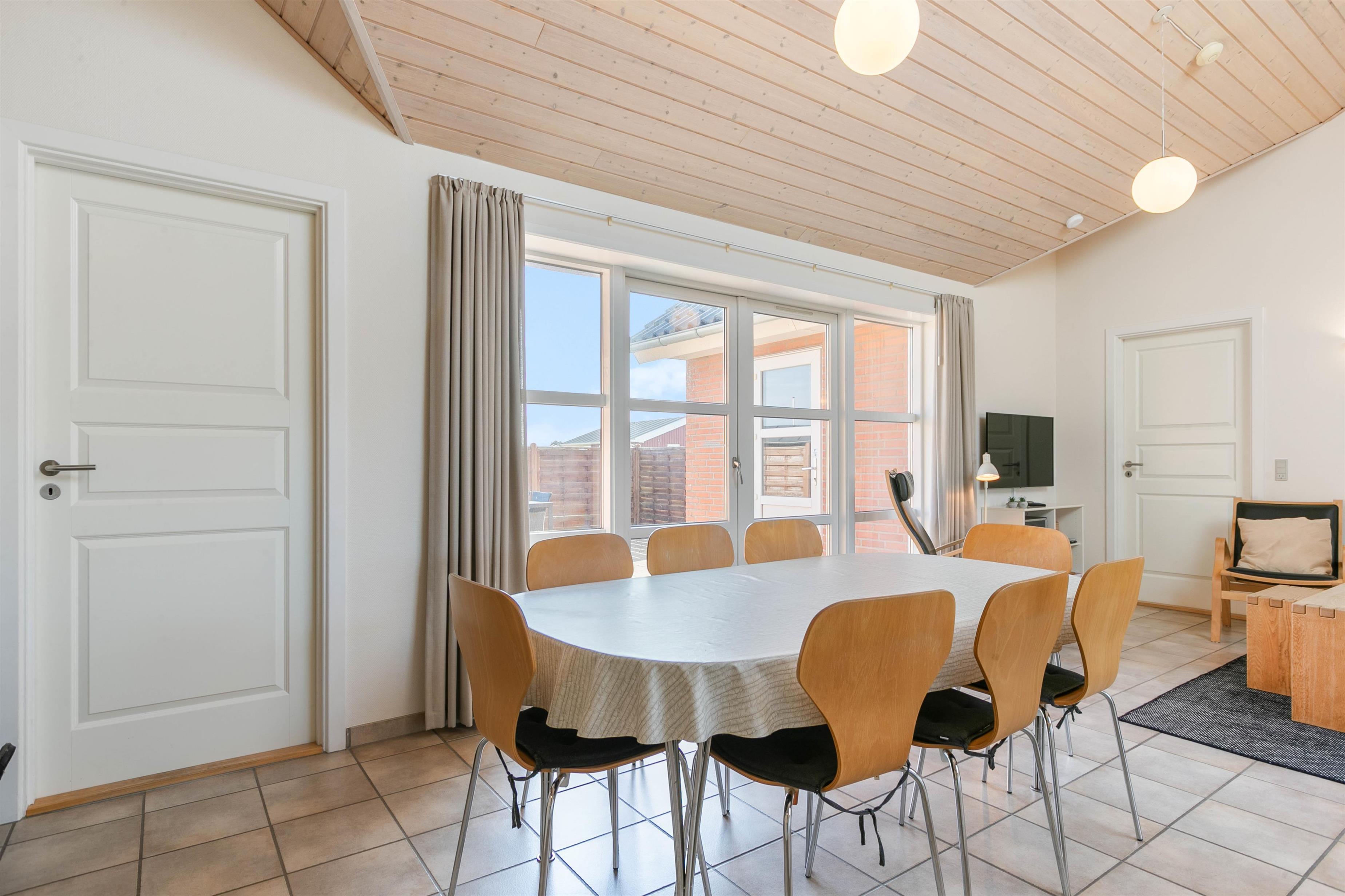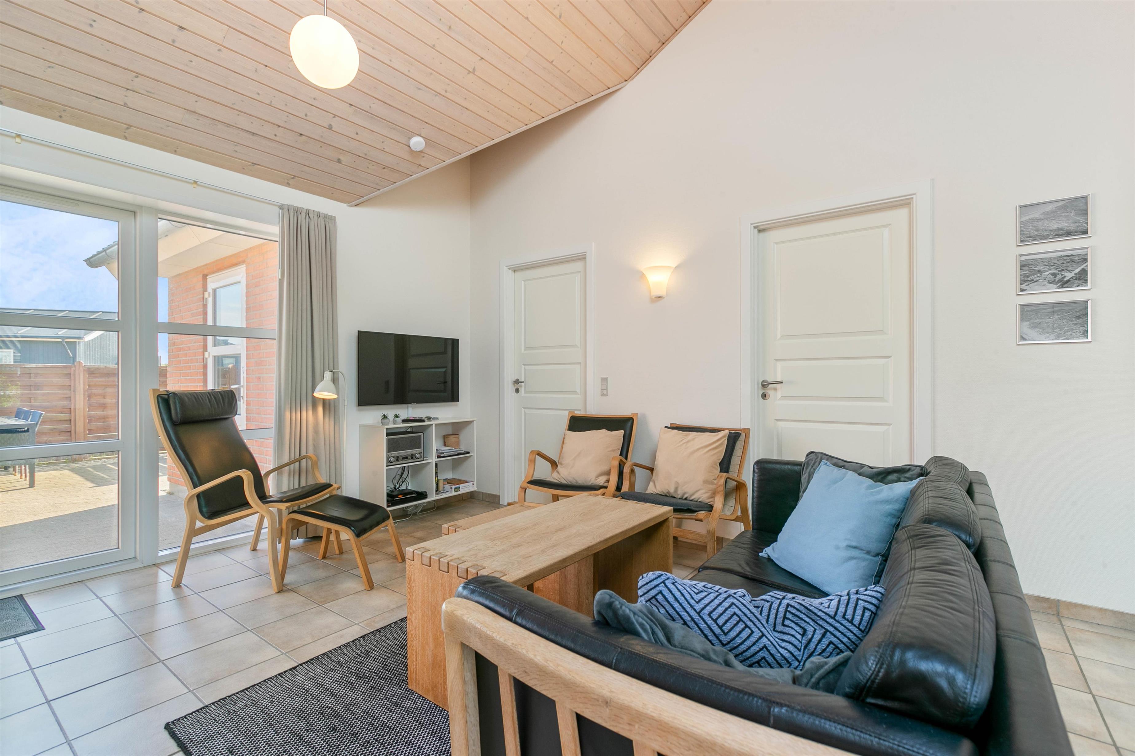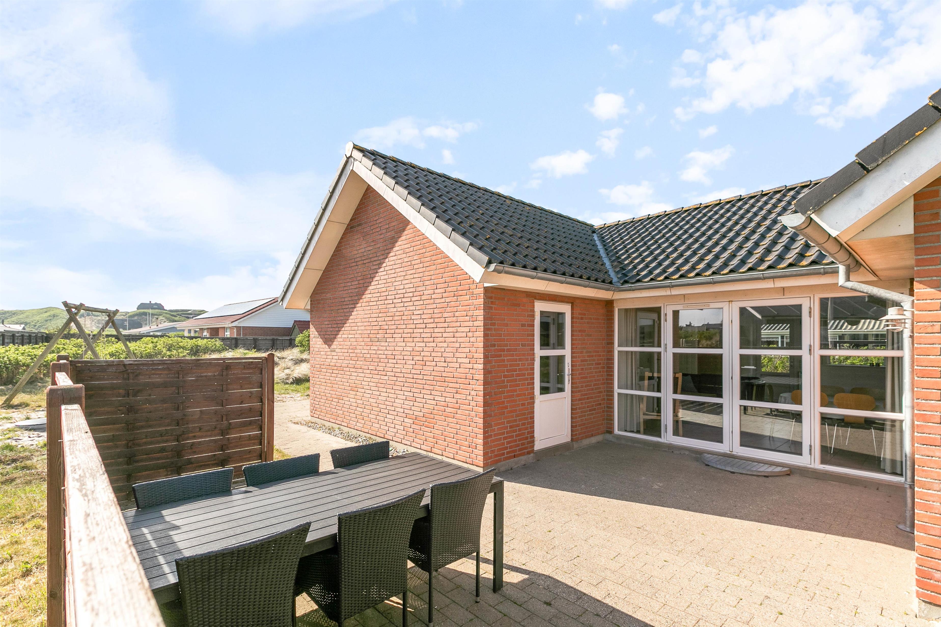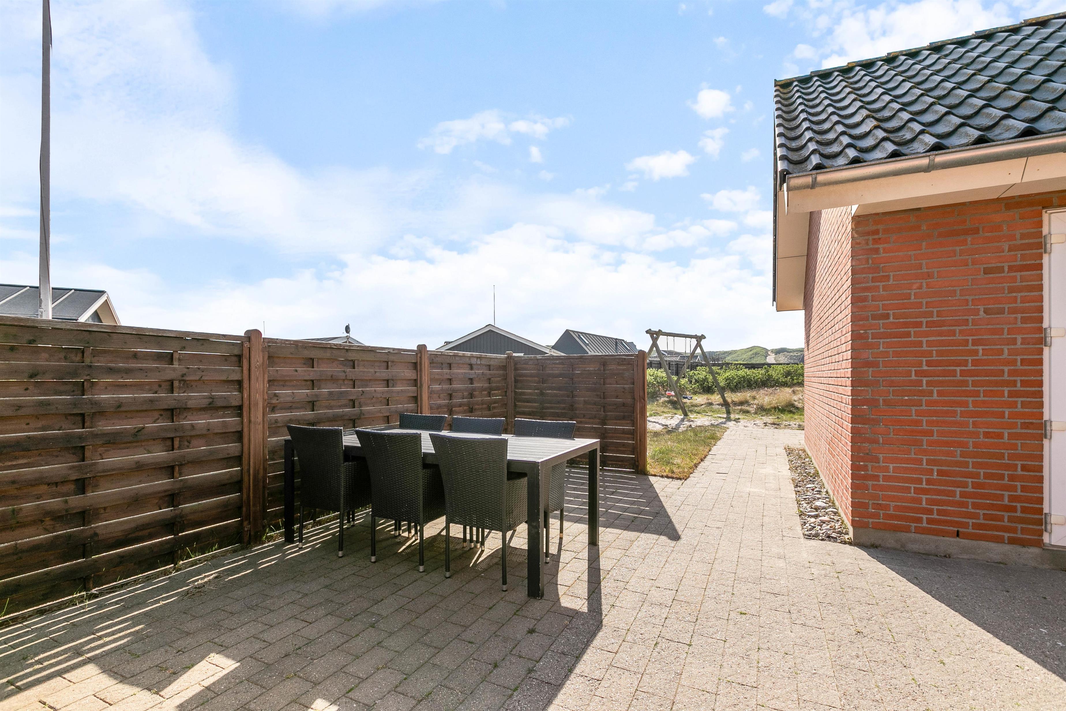 Hele vejen rundt om feriehuset er der lagt fliser, samt der også er flere forskellige kroge, hvor I kan nyde det danske vejr. De flere forskellige kroge sikrerm at I uanset vindretning kan nyde lidt frisk luft mens i sidder i læ. Hvis I ønsker at samle alle på terrassen, kan I også dette. Her er det sær belejligt, at feriehuset har en stor og afskærmet terrasse. Her kan I nyde noget læ og privatliv, og hvis vejret er til det, er der intet mere lækkert end at nyde en lækker bøf fra grillen her på terrassen, alt i mens I kan høre Vesterhavets brusen i baggrunden