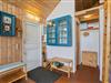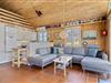 Når I træder ind i sommerhuset, vil I blive mødt af masser af feriestemning. Væggene er beklædt med træ, og loftet er åbnet til kip – det giver sammen med brændeovnens flammer den hyggeligste atmosfære og de perfekte rammer for samvær med familien. Der er 2 gode soveværelser, hvoraf det ene er indrettet med en dobbeltseng og det andet er indrettet med to enkeltsenge. Den femte soveplads finder i på hemsen.