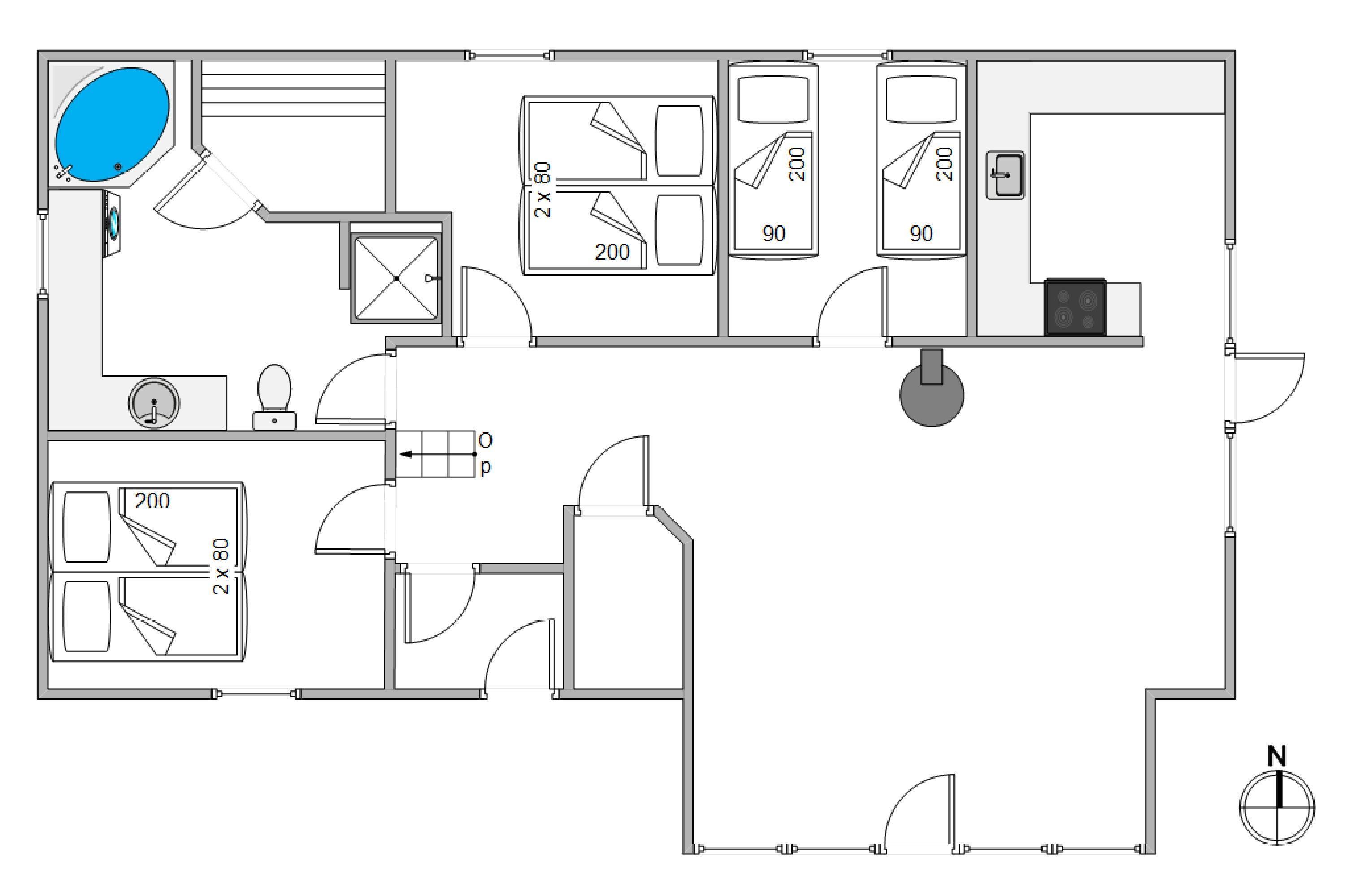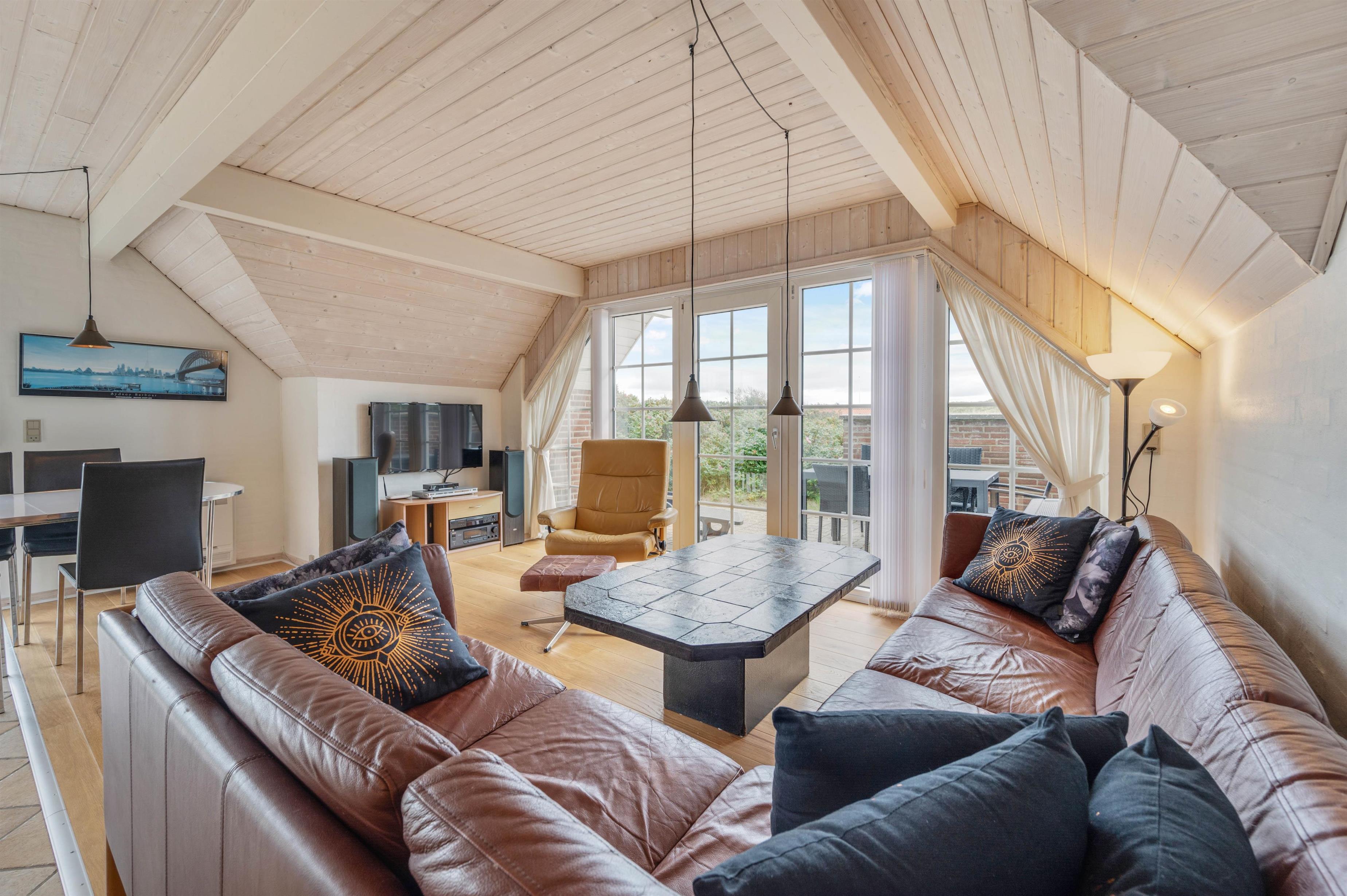Det 97 m2 store hus er indrettet med plads til 6 personer. Huset har 3 soverum og en hems til de større børn, med TV og madrasser hvor der kan tilsluttes en dvd eller spillekonsol, så børnene kan hygge sig hvis vejret ikke lige er til en tur på stranden. Til huset hører desuden 2 dejlige terrasse - én mod øst hvor I kan nyde morgensolen, og én mod syd som er perfekt til hyggelige grillaftener. Til terrasserne hører naturligvis gode havemøbler, liggestole og grill.