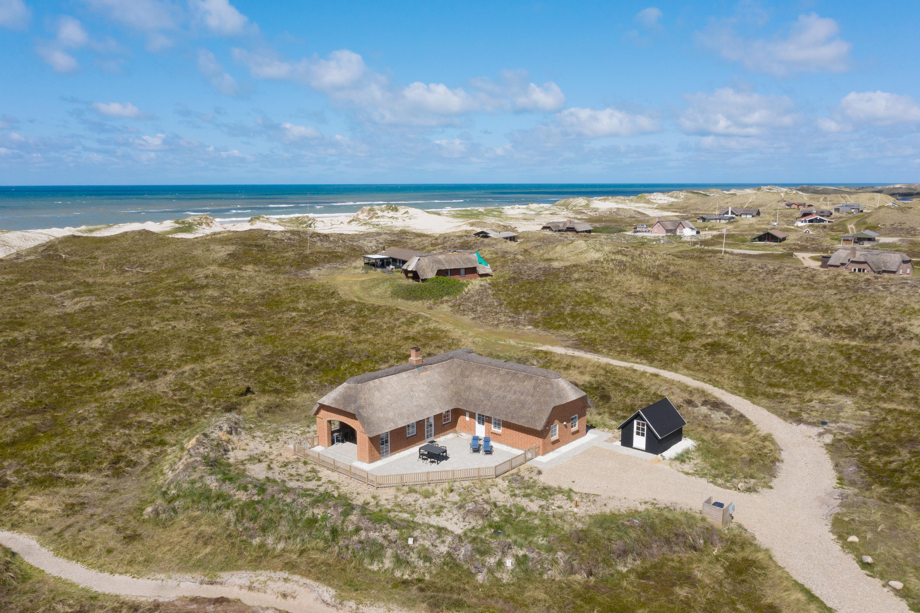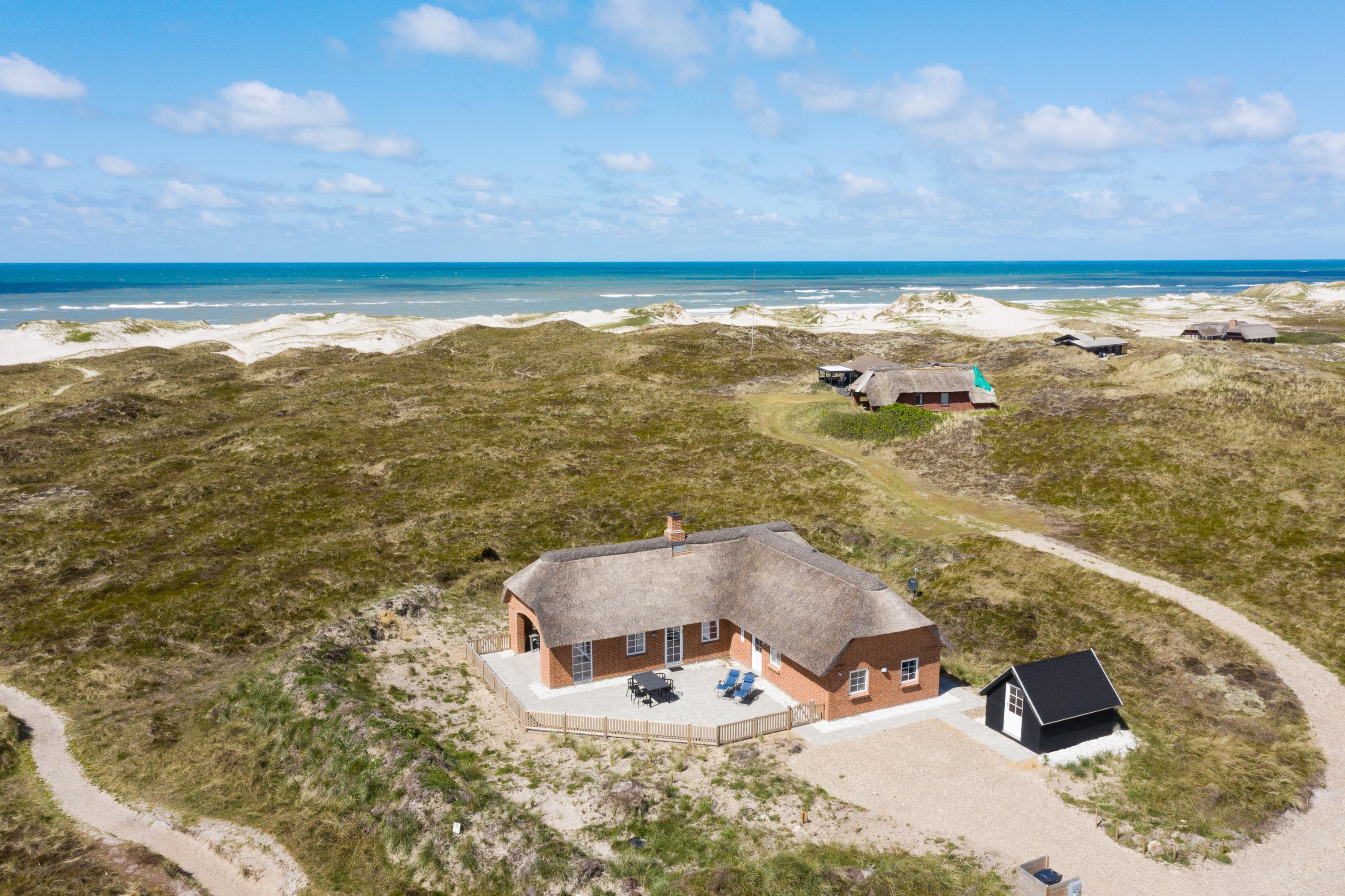 Den første kop morgenkaffe nydes på terrassen med ryggen op af husmuren, der er godt i gang med at optage solens varme. Udsigten er fantastisk – lyngens rødbrune toner blander sig med det lysegrønne spil fra marehalmen, om sommeren synger lærken over sin rede i klitterne og altid har I lyden af bølgerne, som kalder til en morgentur på stranden. Her er det smukt hele året rundt. Indenfor indbyder den stilfulde indretning til mange hyggelige timer med fællesskab og hygge i stuen med brændeovnen eller med fælles madlavning i det åbne moderne køkken med opvaskemaskine.