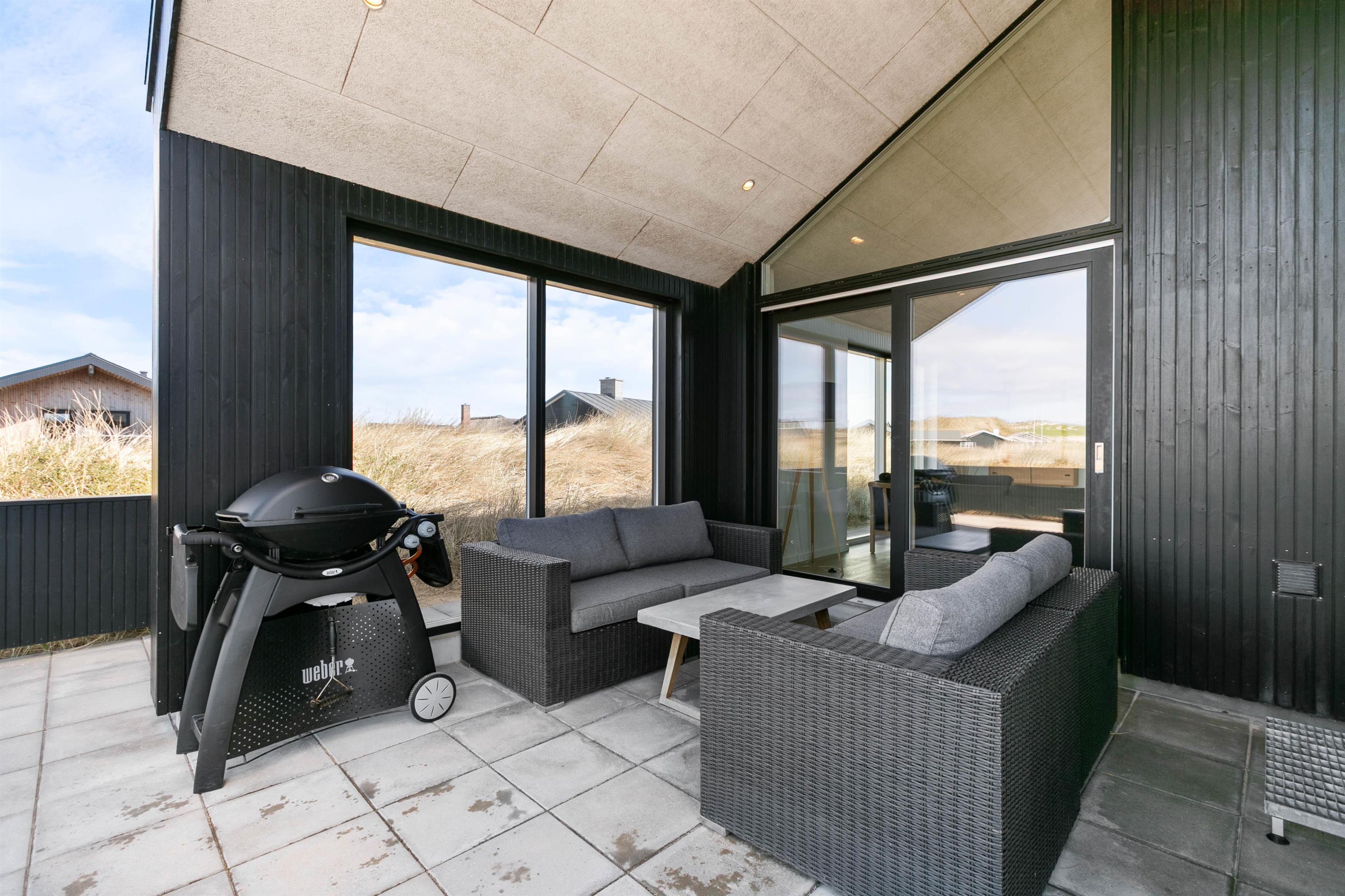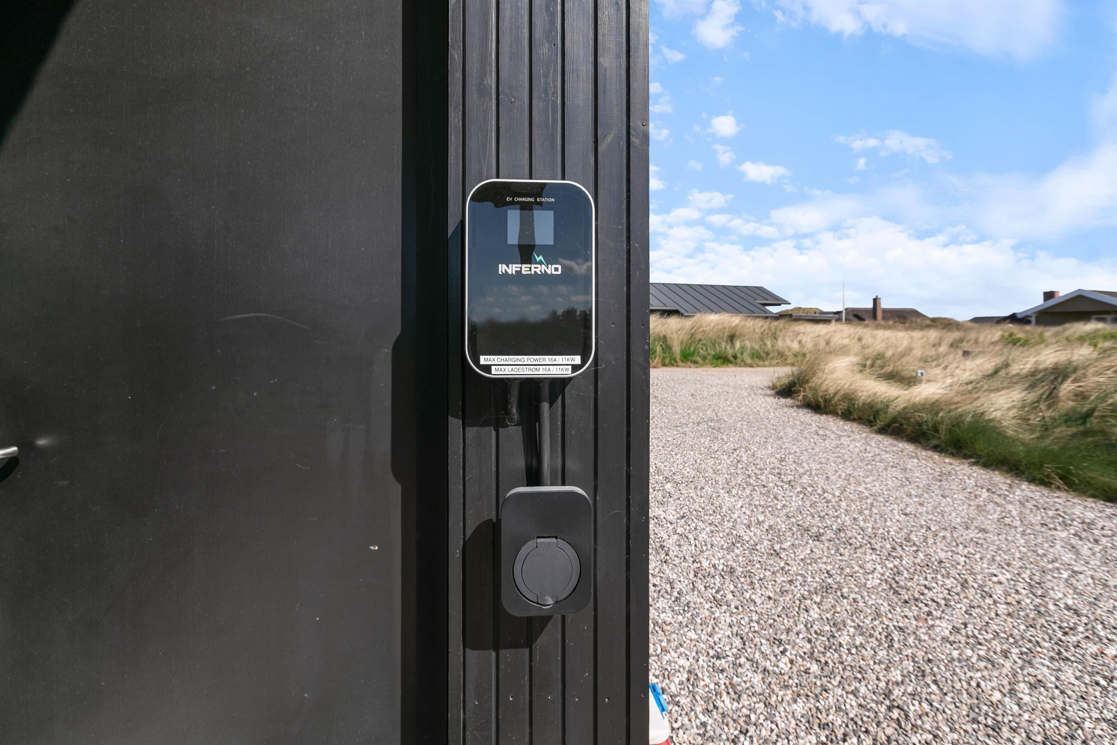 Med til feriehuset hører en stor, lukket fliseterrasse, der både har en afskærmet og en overdækket del. Her er alsidige muligheder for at nyde de naturskønne omgivelser og den friske luft. Terrassen er selvfølgelig udstyret med gode havemøbler, liggestole og en praktisk gasgrill, så I på kort tid kan kreere de lækreste feriemåltider. På grunden er der også et ladestik til elbiler.