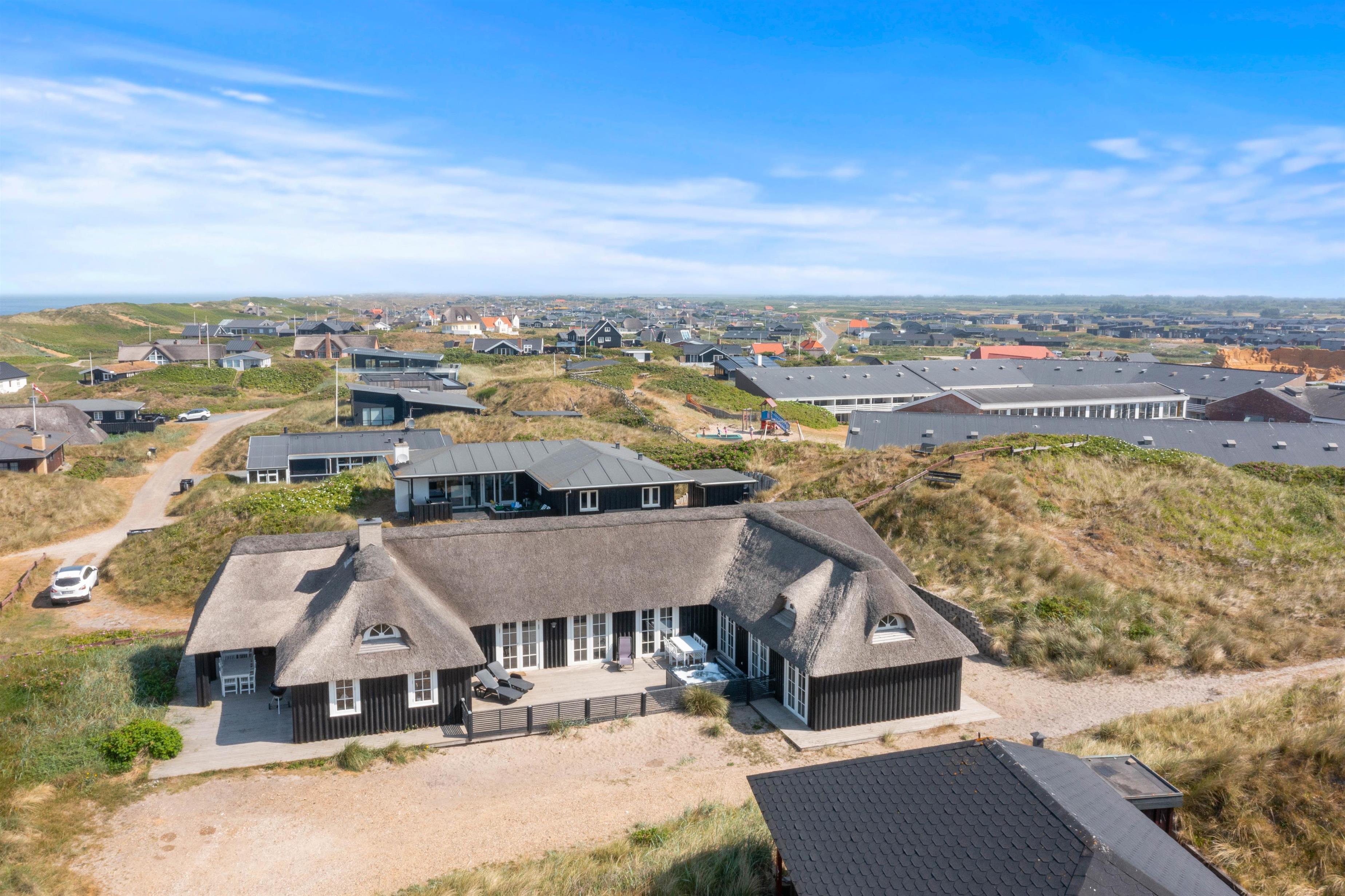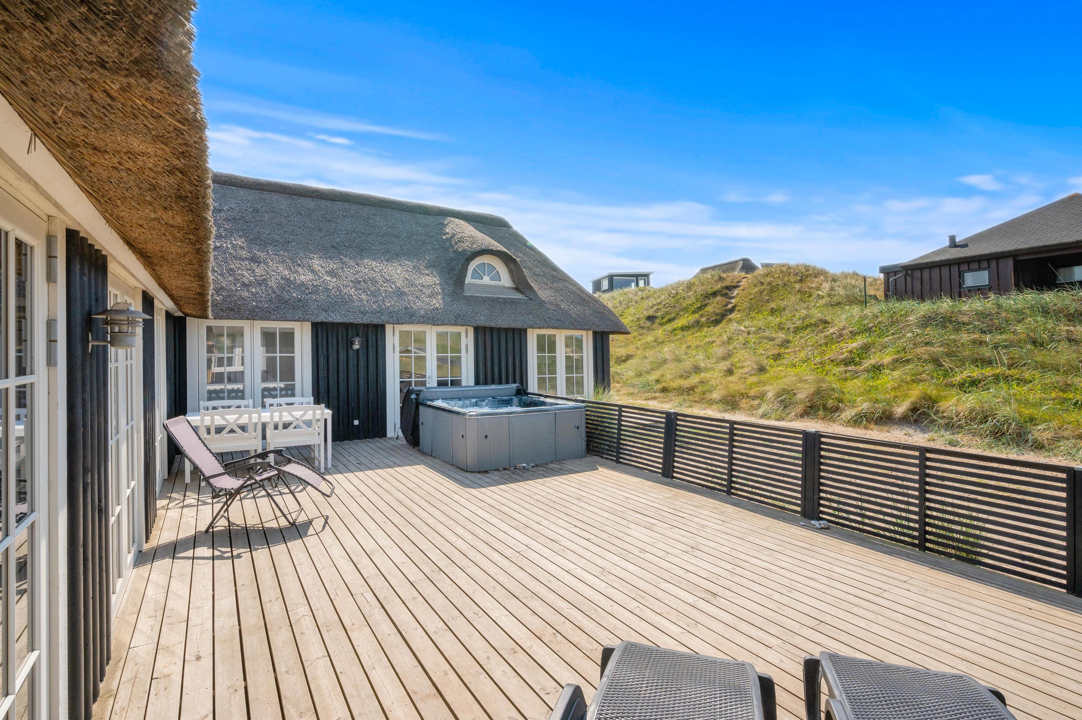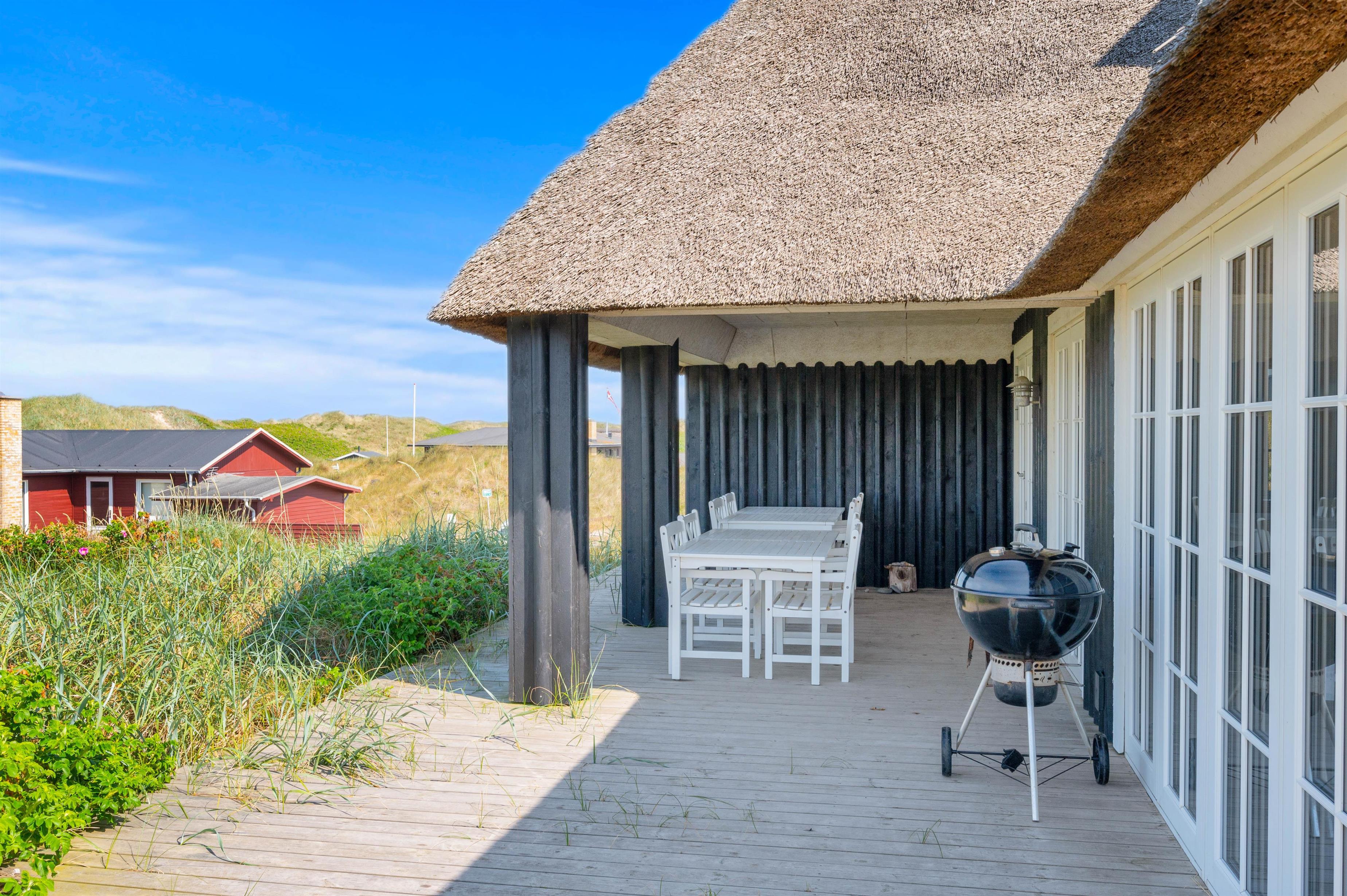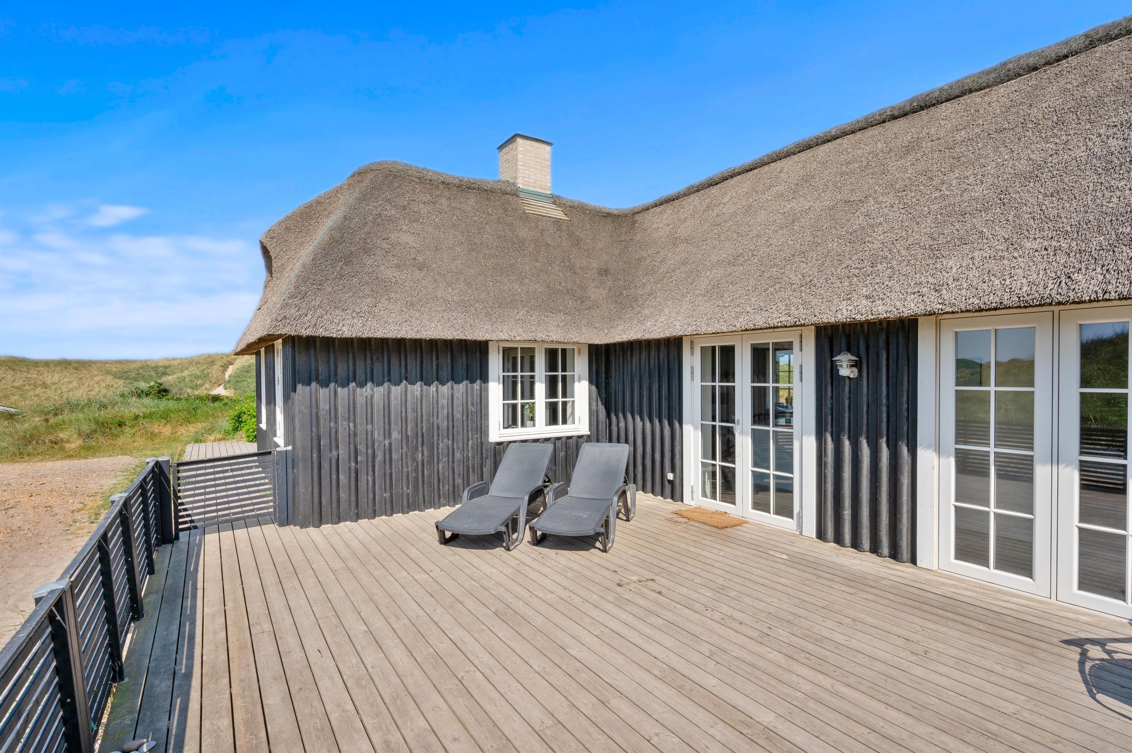 Fra den dejlige klit bagerst på sommerhusgrunden kan I nyde de dejlige solnedgange - så bliver det ikke meget bedre! Der er altså masser af udflugtsmuligheder lige i nærheden, men der er selvfølgelig også mulighed for at tage en slap af-dag derhjemme. På den store terrasse finder alle 12 feriegæster nemt en plads i solen, og der er både liggestole og havemøbler til jer.