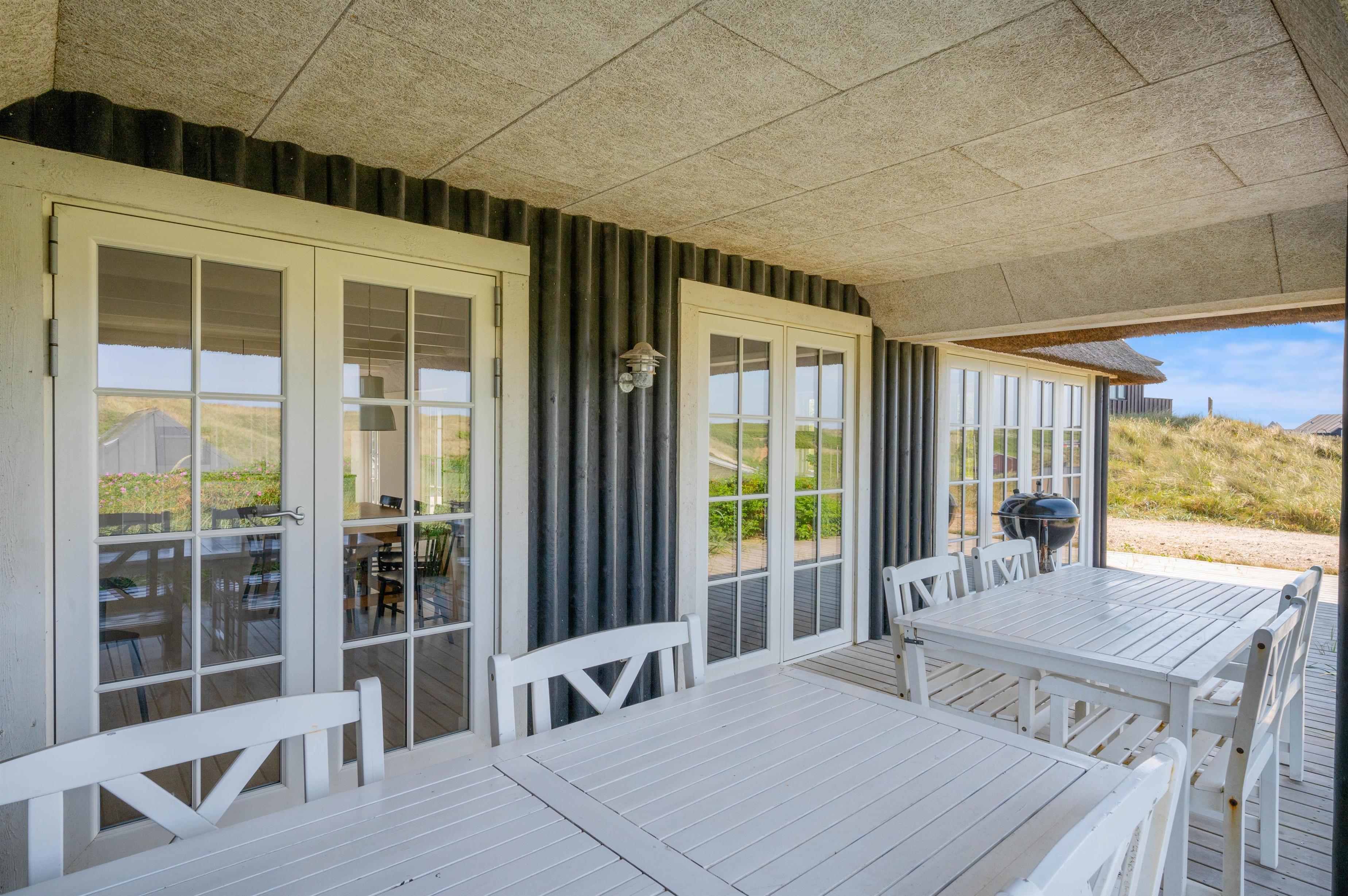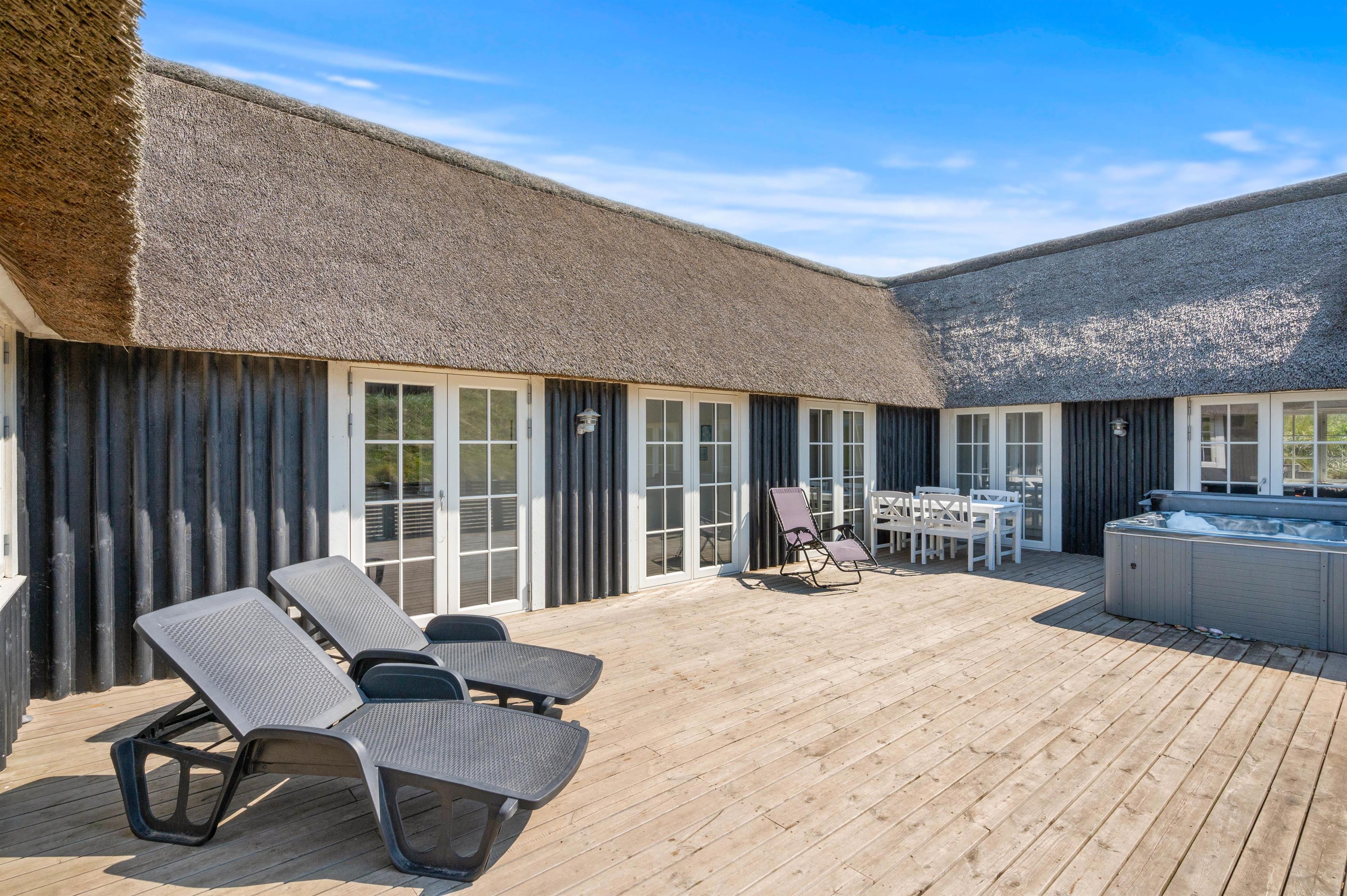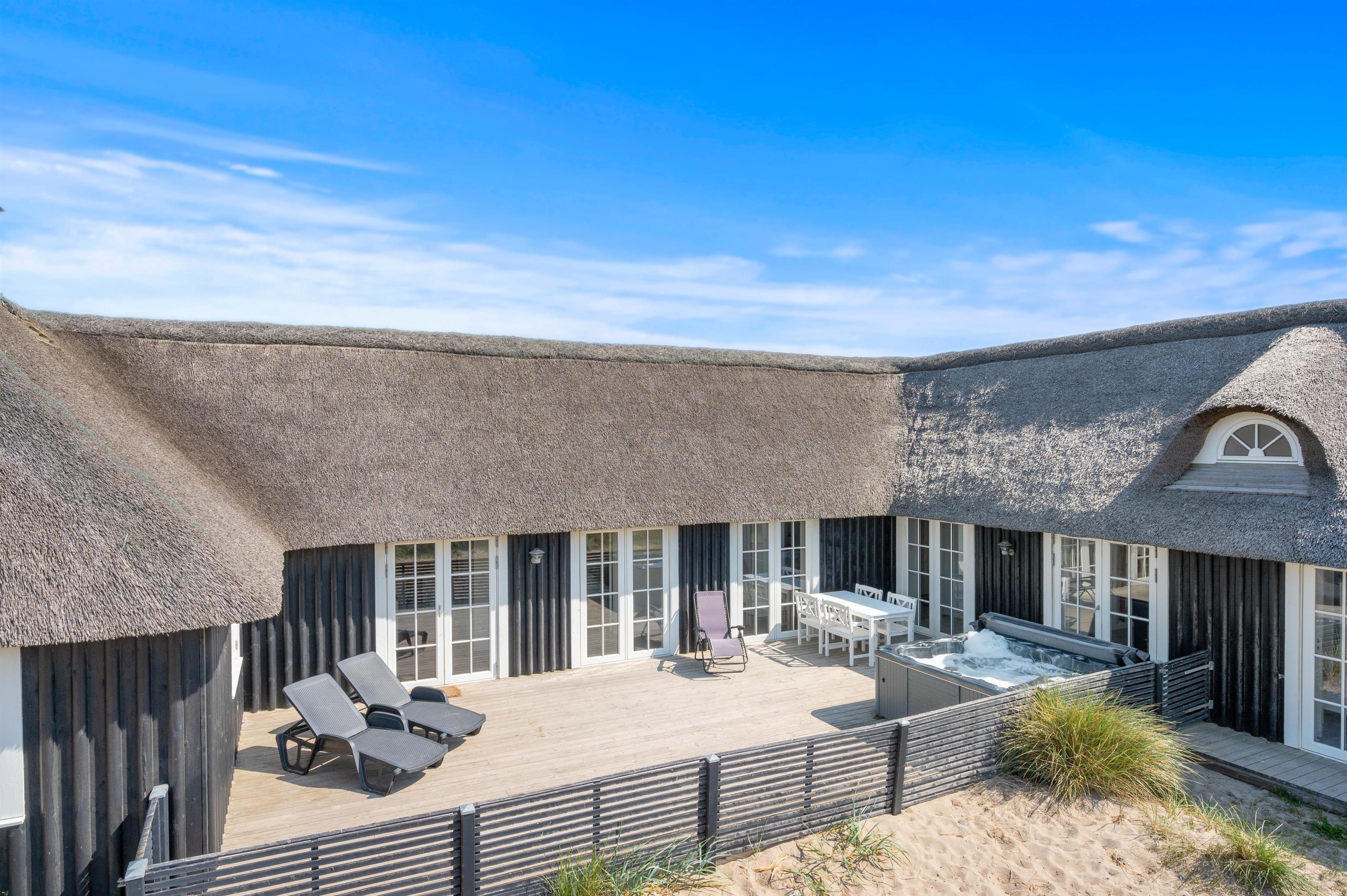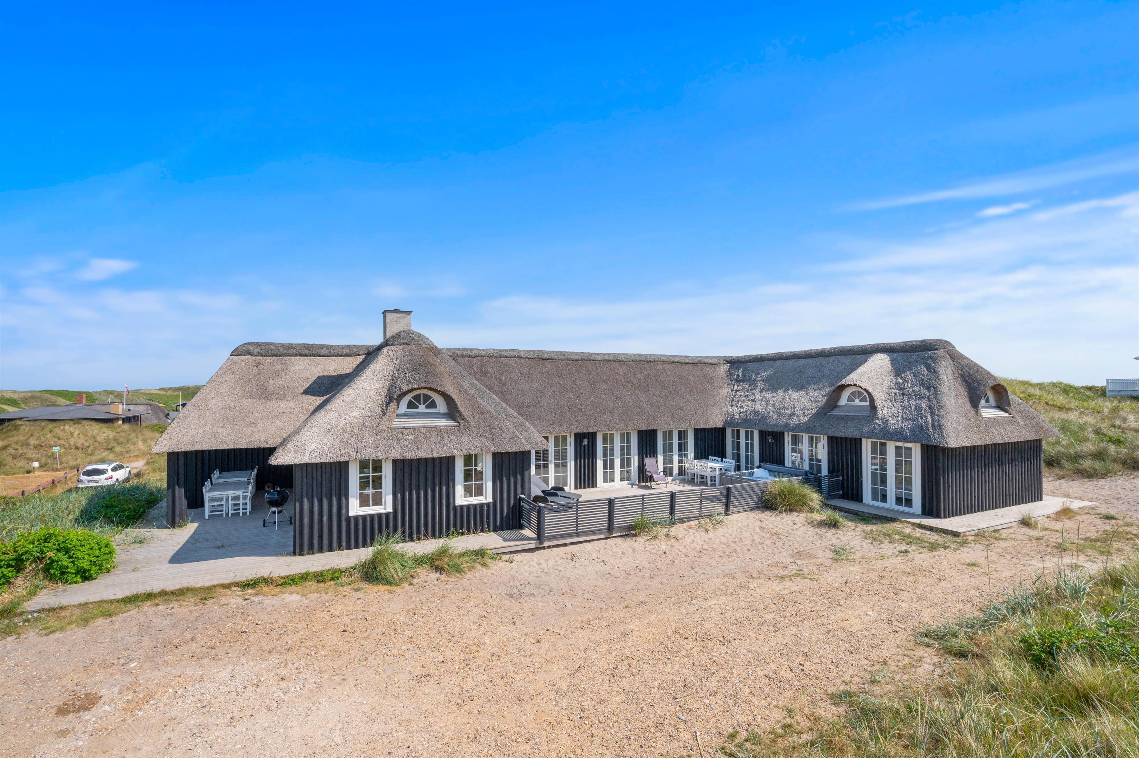 Fra den dejlige klit bagerst på sommerhusgrunden kan I nyde de dejlige solnedgange - så bliver det ikke meget bedre! Der er altså masser af udflugtsmuligheder lige i nærheden, men der er selvfølgelig også mulighed for at tage en slap af-dag derhjemme. På den store terrasse finder alle 12 feriegæster nemt en plads i solen, og der er både liggestole og havemøbler til jer.
