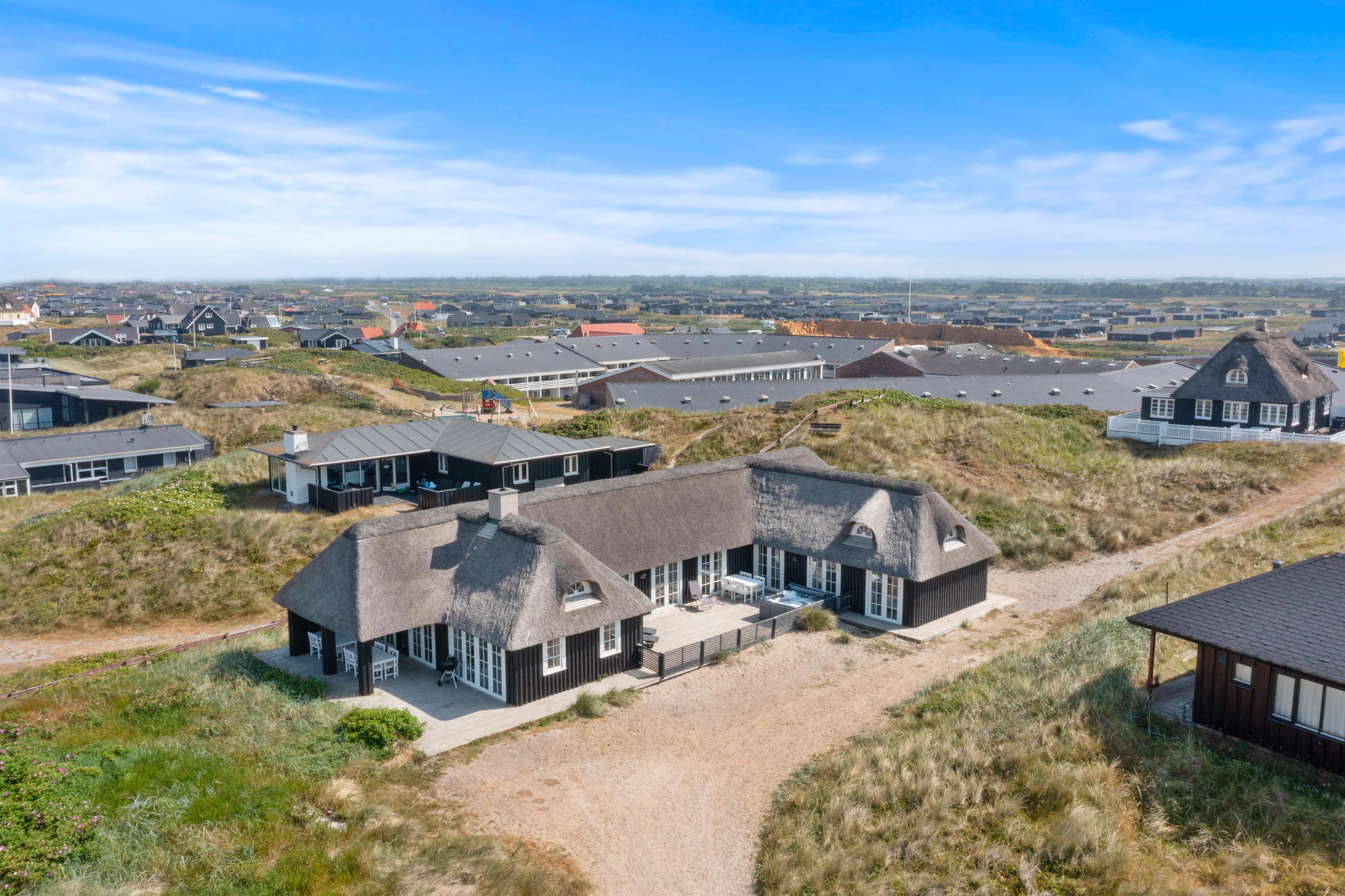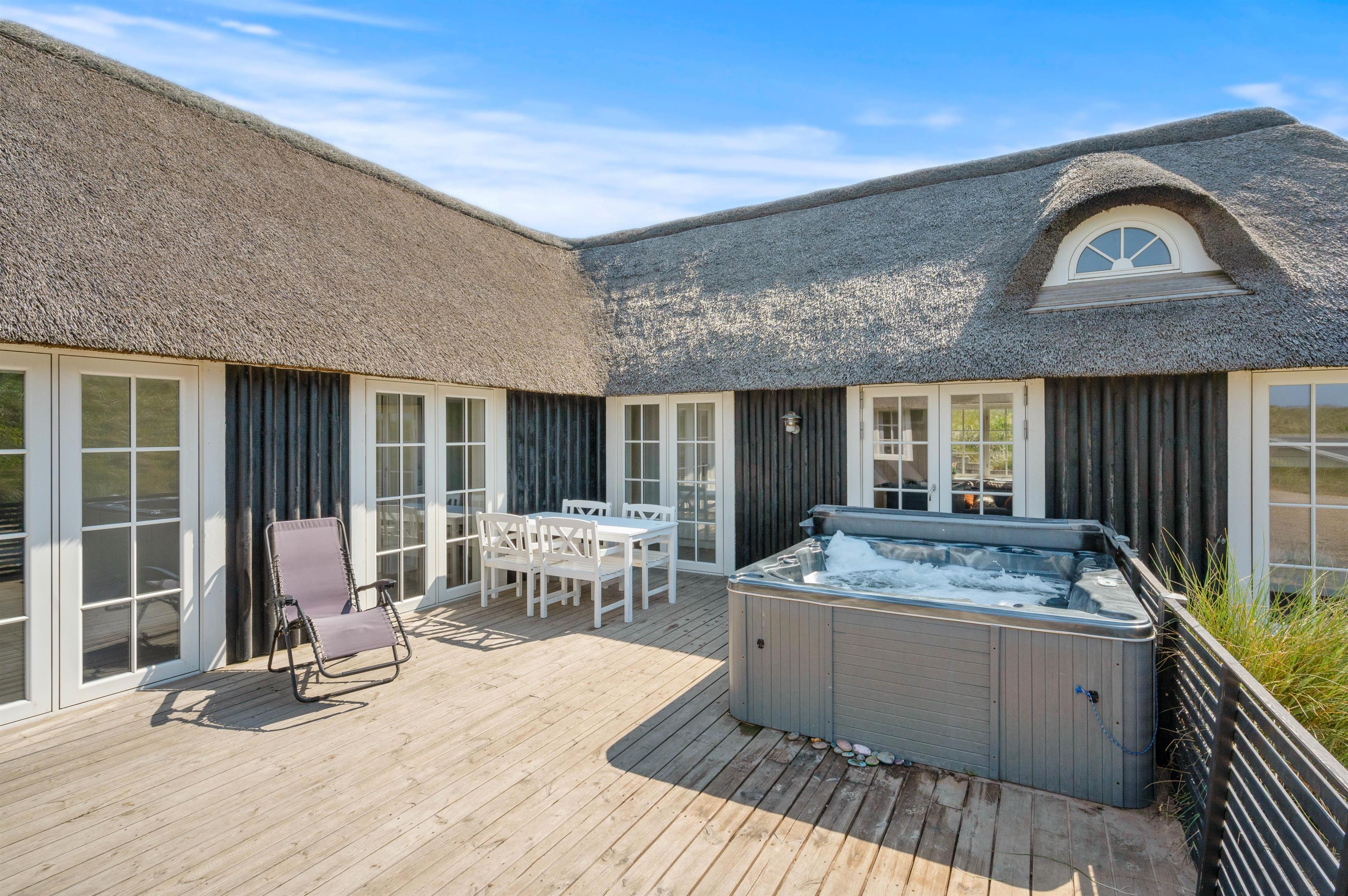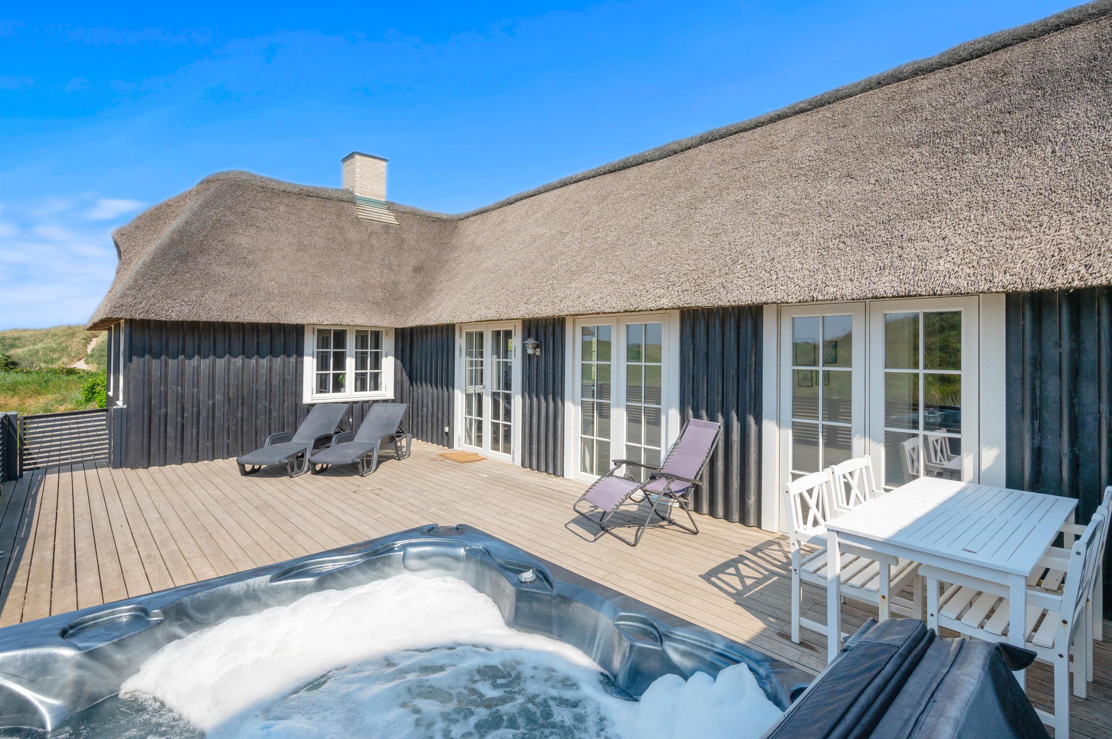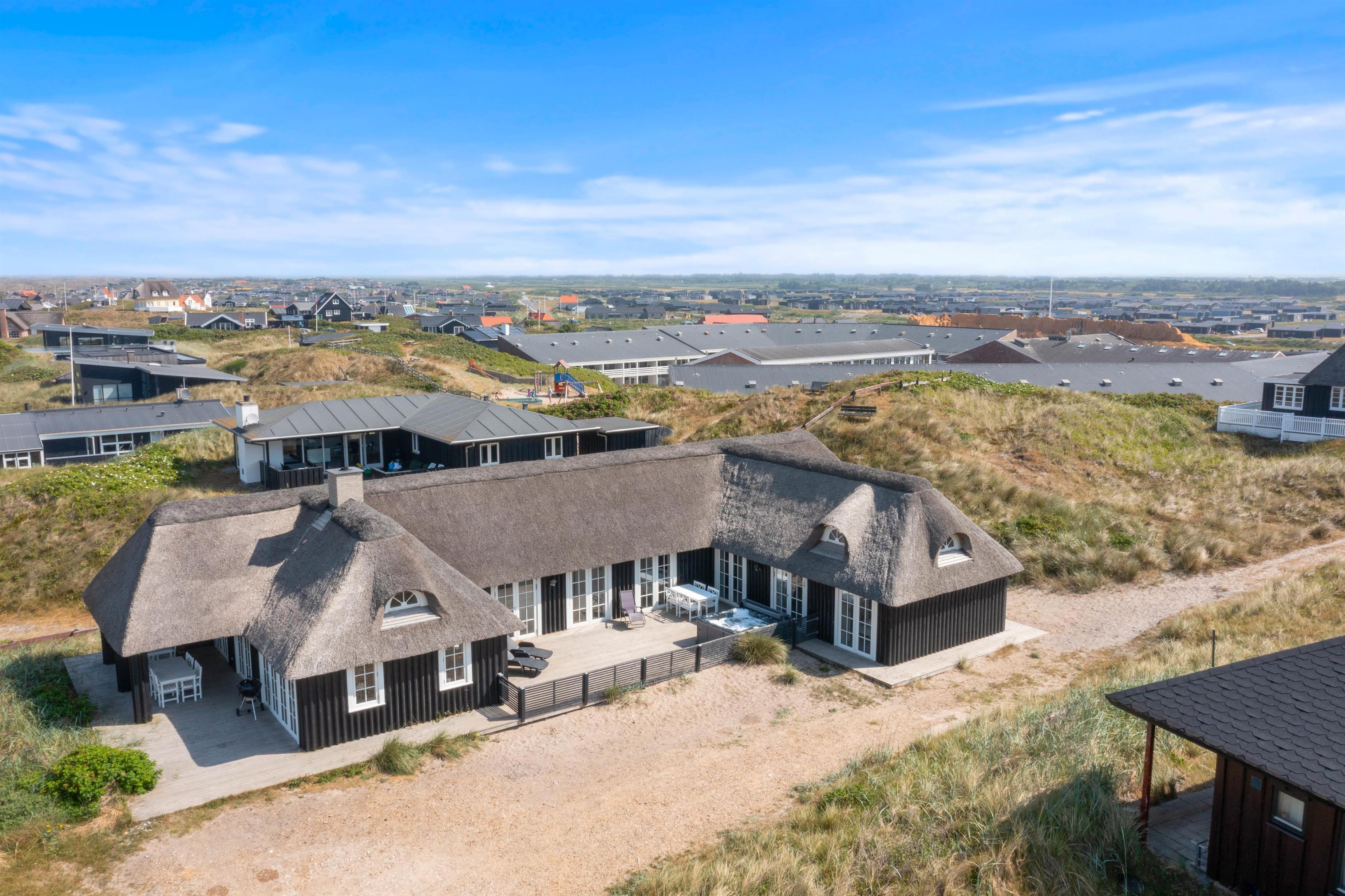 Fra den dejlige klit bagerst på sommerhusgrunden kan I nyde de dejlige solnedgange - så bliver det ikke meget bedre! Der er altså masser af udflugtsmuligheder lige i nærheden, men der er selvfølgelig også mulighed for at tage en slap af-dag derhjemme. På den store terrasse finder alle 12 feriegæster nemt en plads i solen, og der er både liggestole og havemøbler til jer.