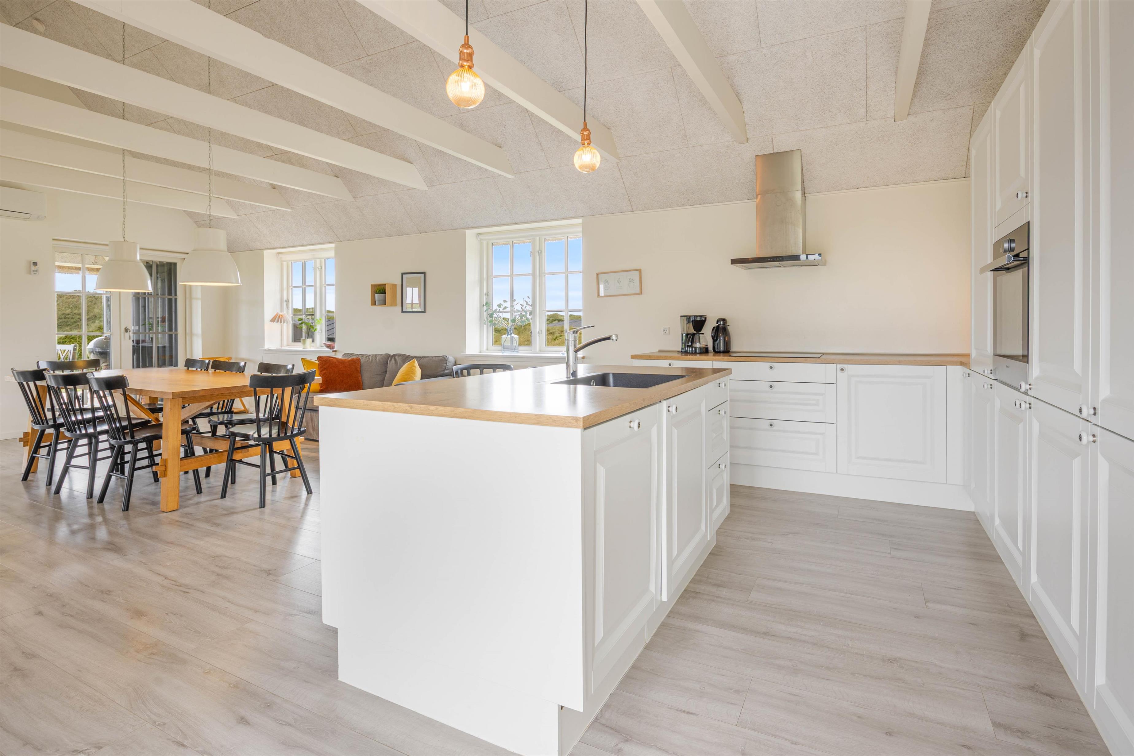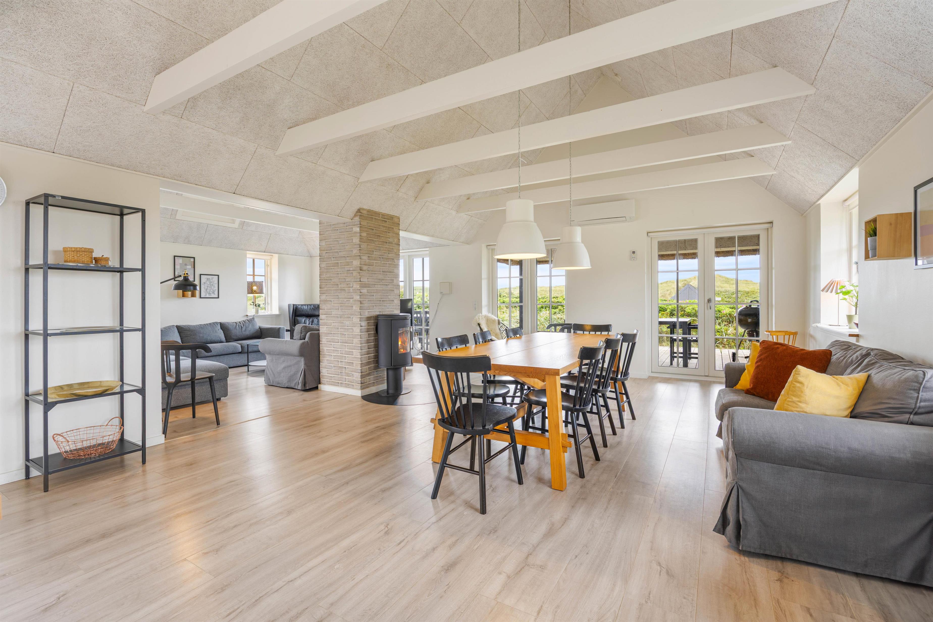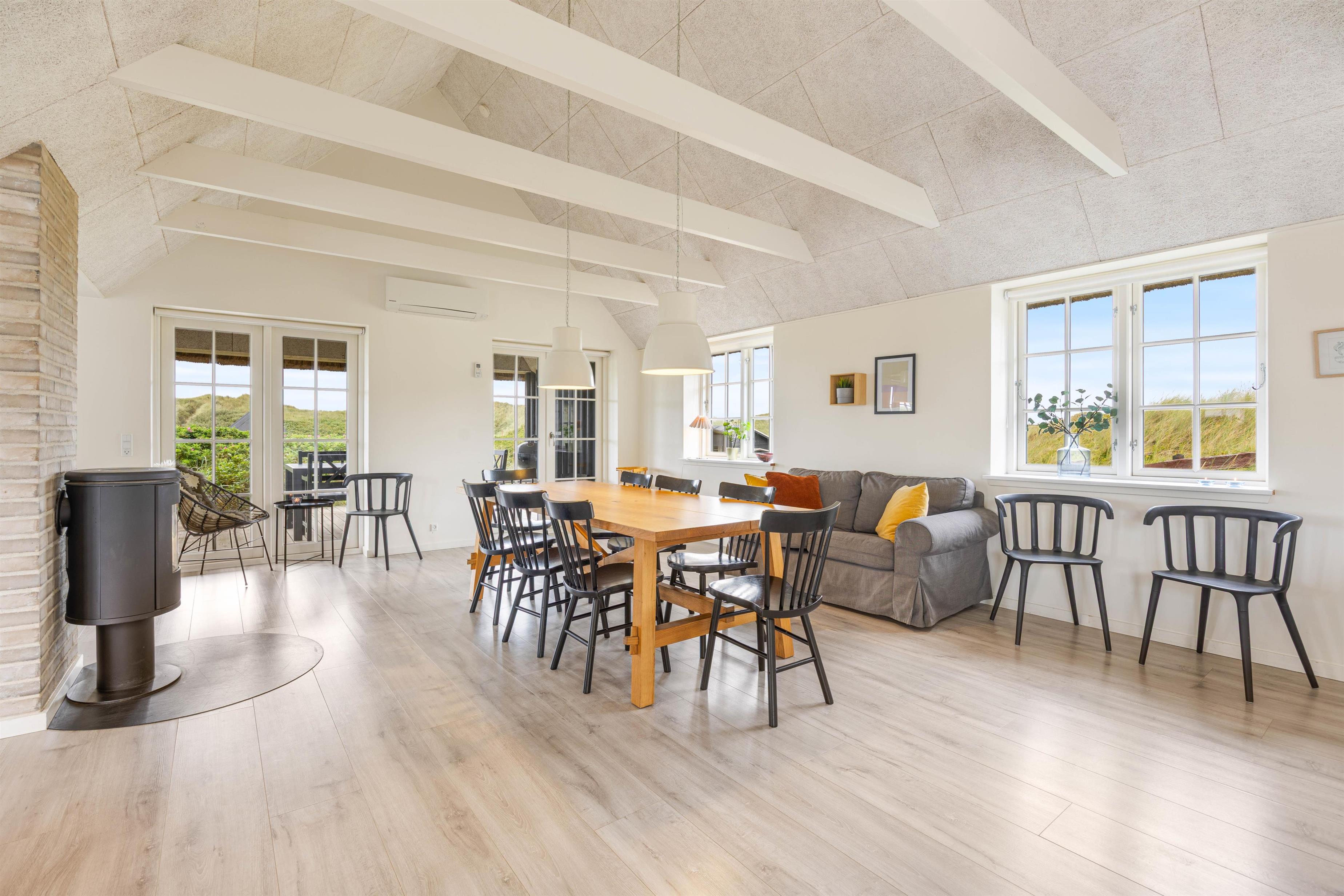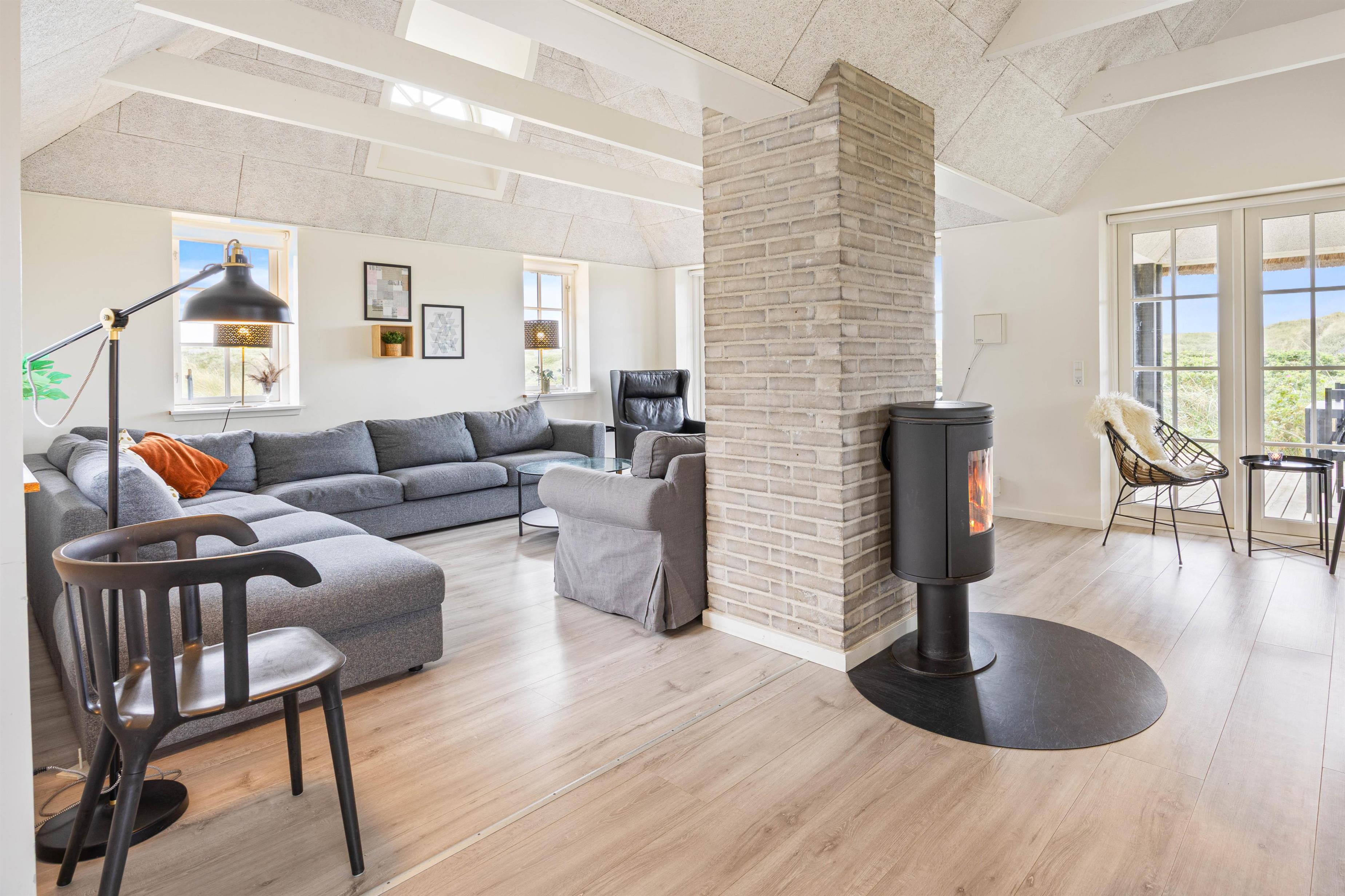 Det skønne feriehus i Søndervig er bygget i 2019 og opfylder selv den mest kræsne feriegæsts drømme. Kvalitet er et nøgleord i den moderne og stilfulde indretning, og de lyse farver på vægge og lofter samt de store vinduespartier skaber en behagelig atmosfære. Indretning er simpel, men utrolig gennemført og stilfuld. De synlige loftsbjælker bidrager virkelig også til den hyggelige atmosfære.