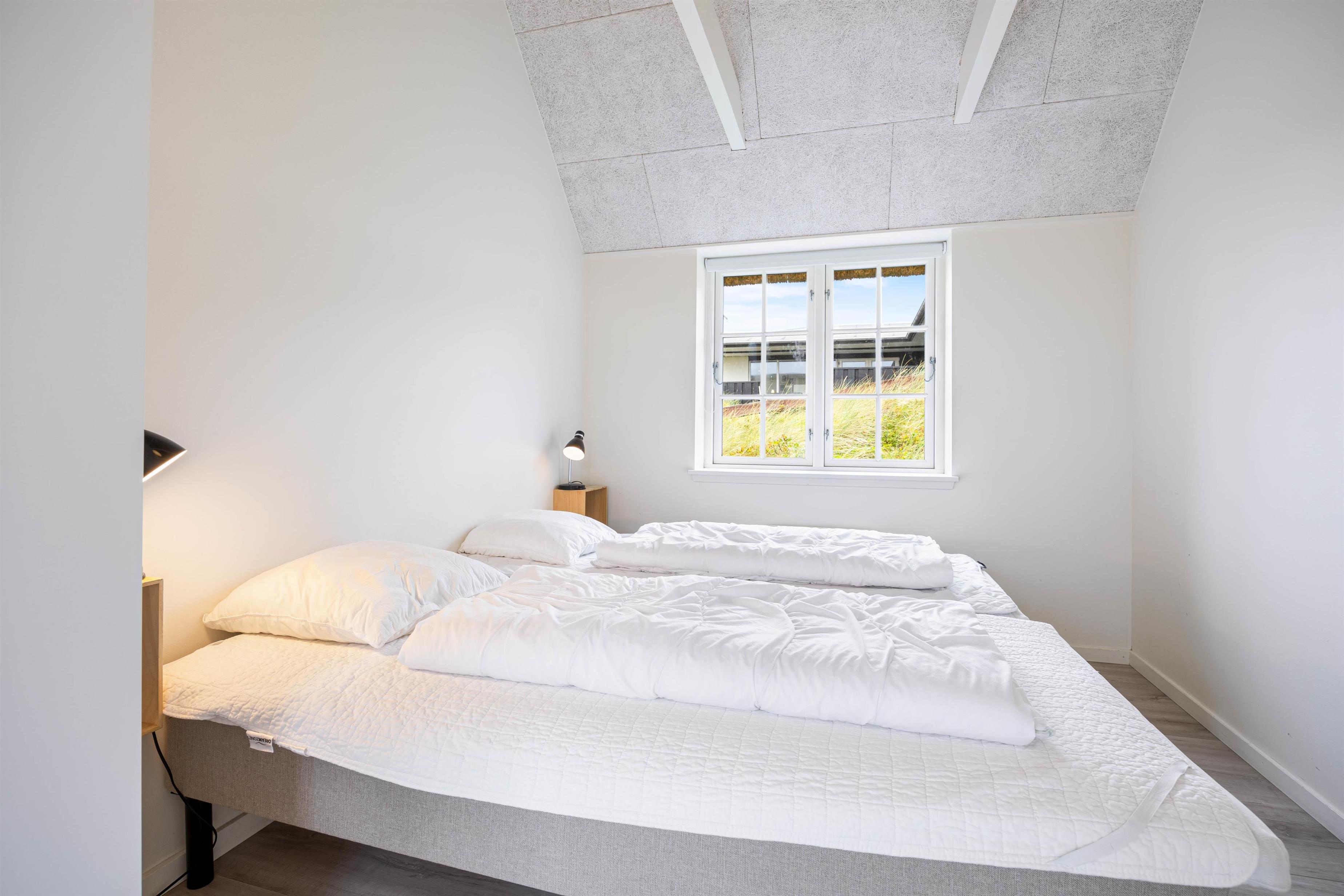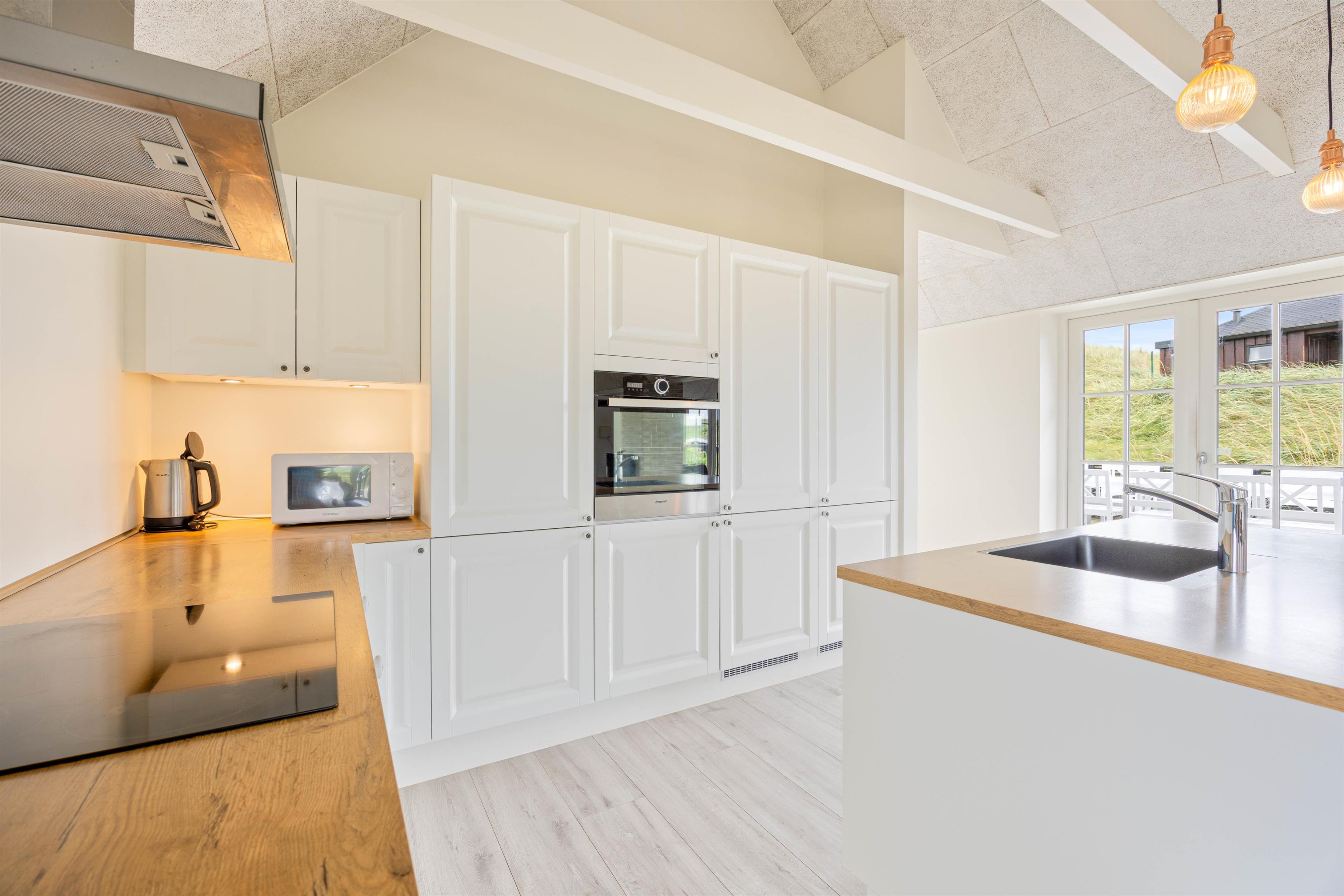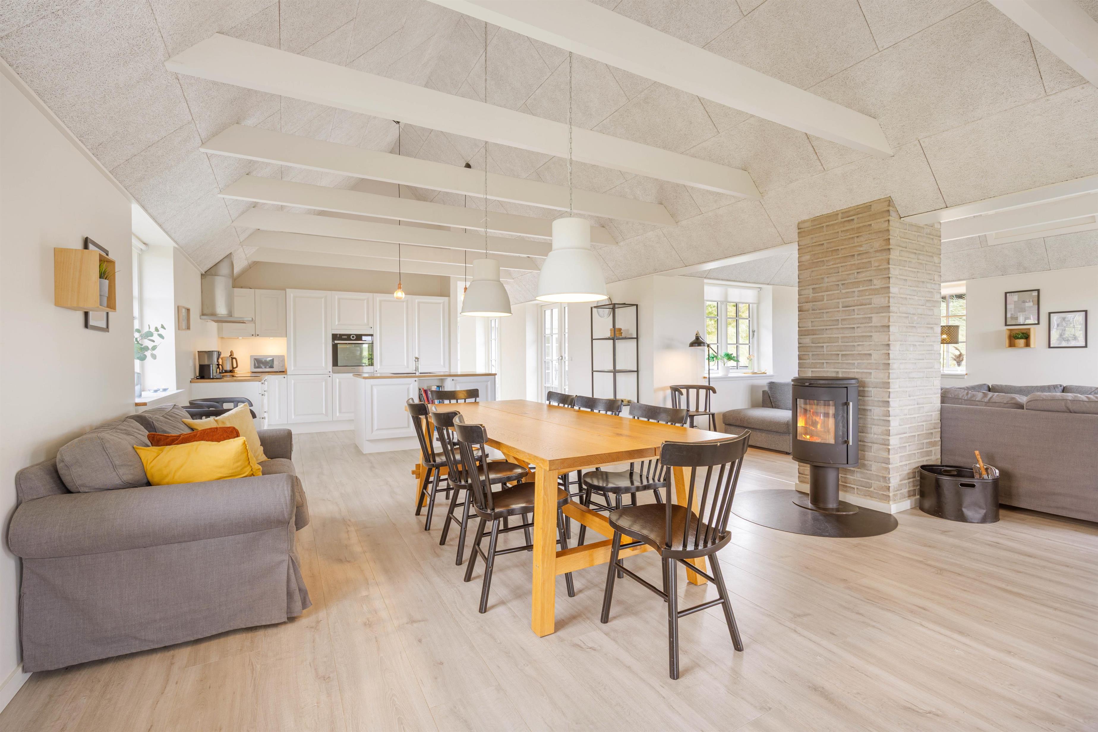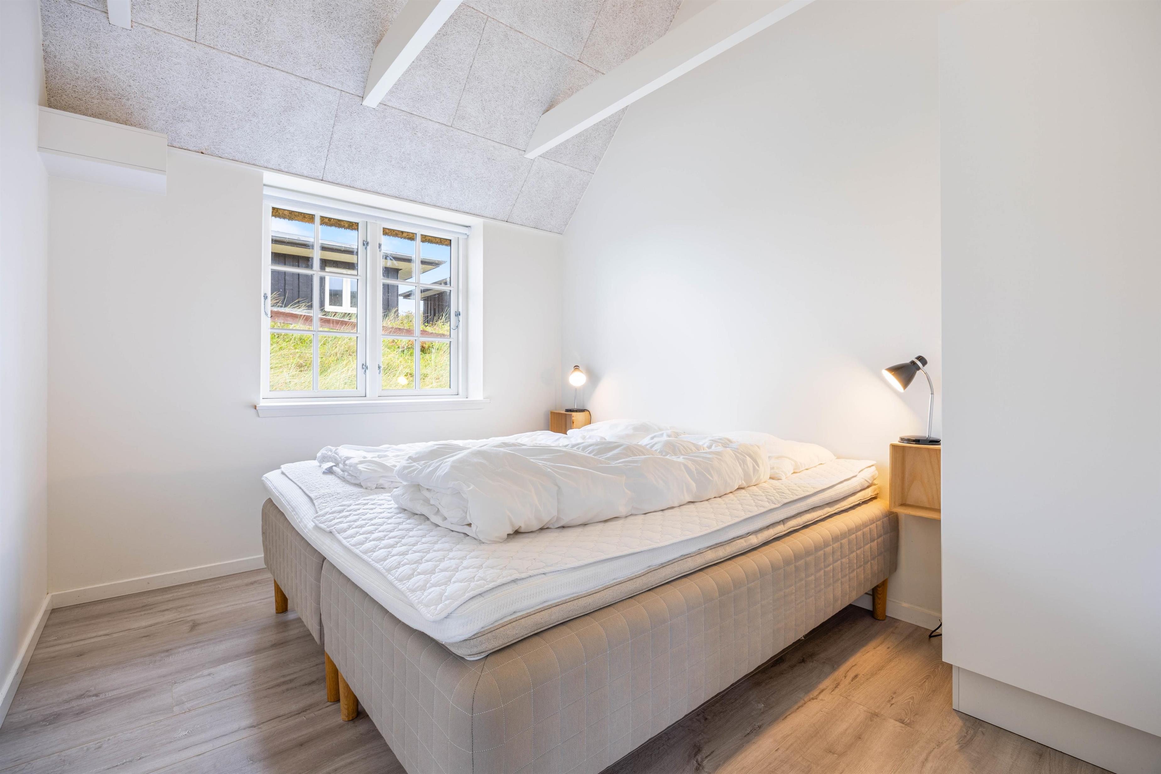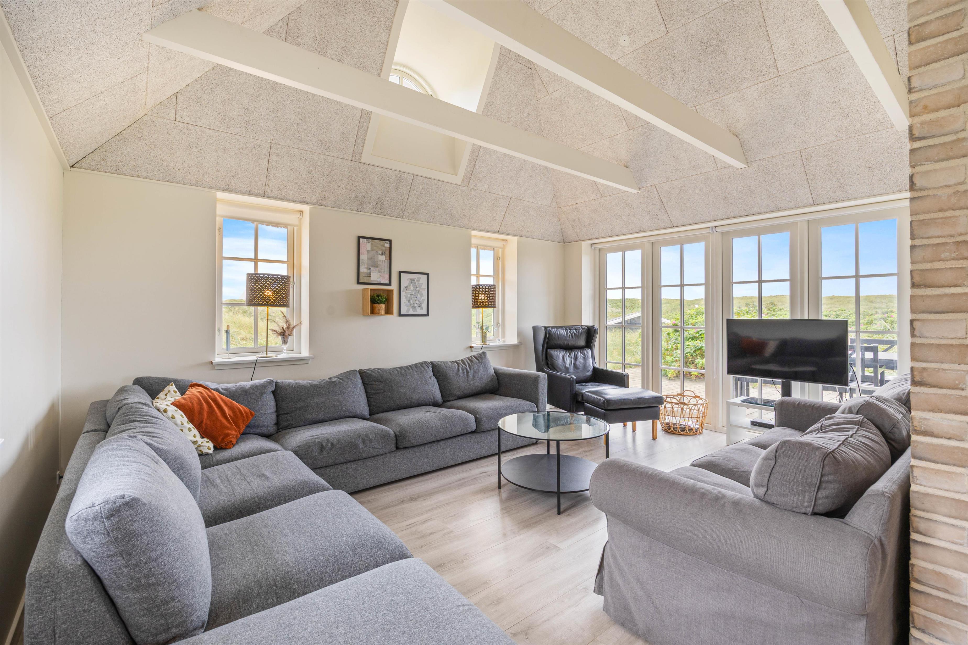 Det skønne feriehus i Søndervig er bygget i 2019 og opfylder selv den mest kræsne feriegæsts drømme. Kvalitet er et nøgleord i den moderne og stilfulde indretning, og de lyse farver på vægge og lofter samt de store vinduespartier skaber en behagelig atmosfære. Indretning er simpel, men utrolig gennemført og stilfuld. De synlige loftsbjælker bidrager virkelig også til den hyggelige atmosfære.