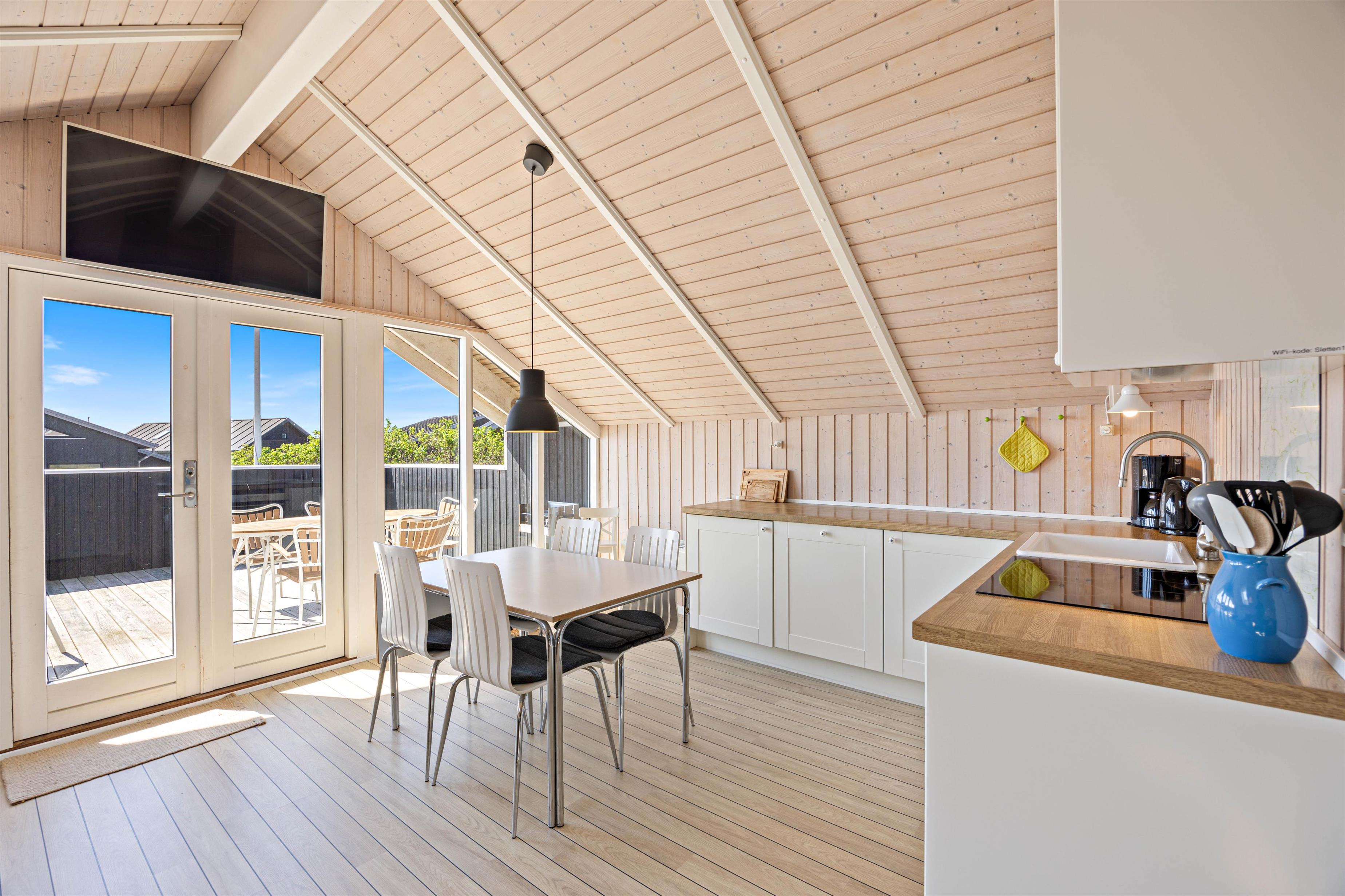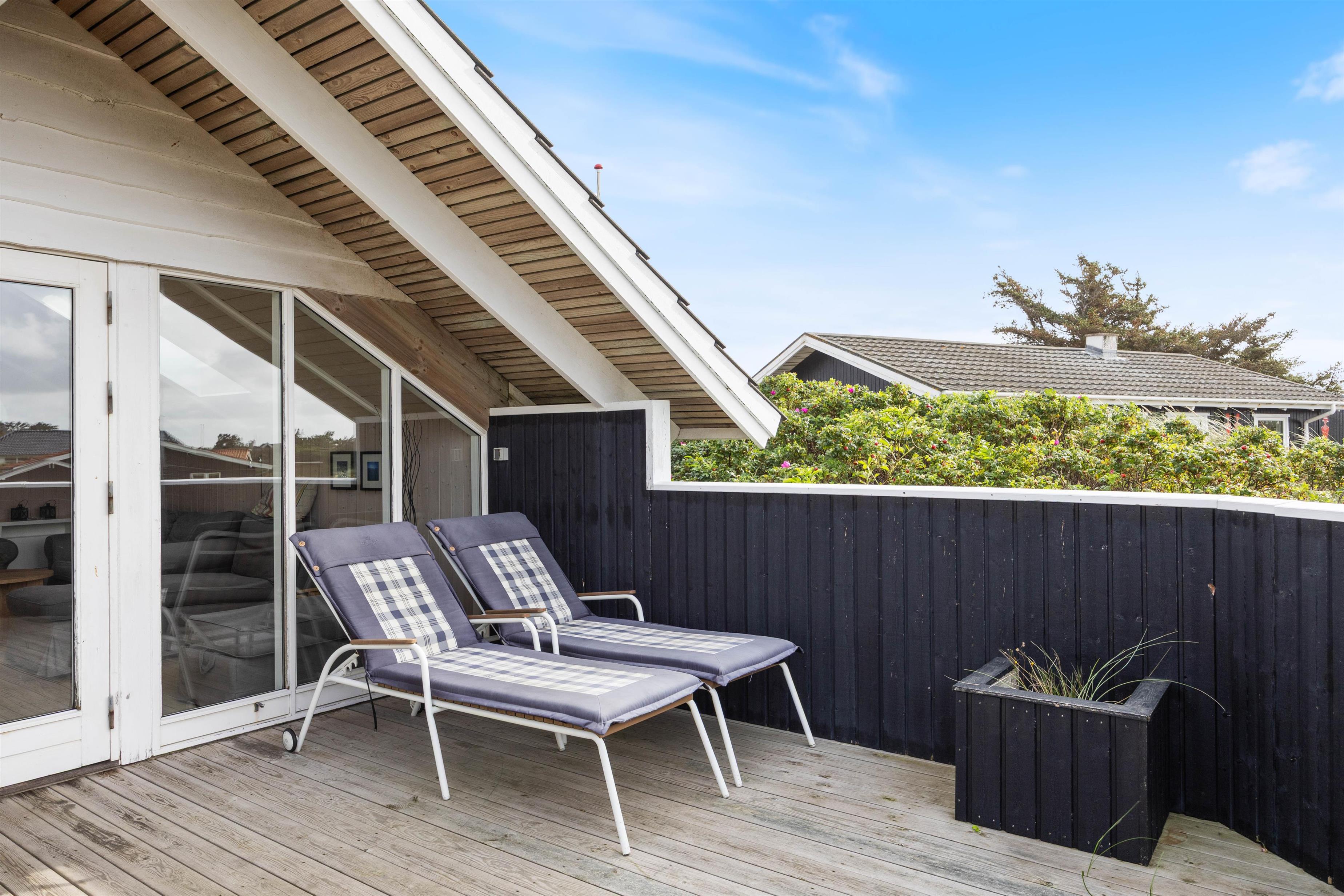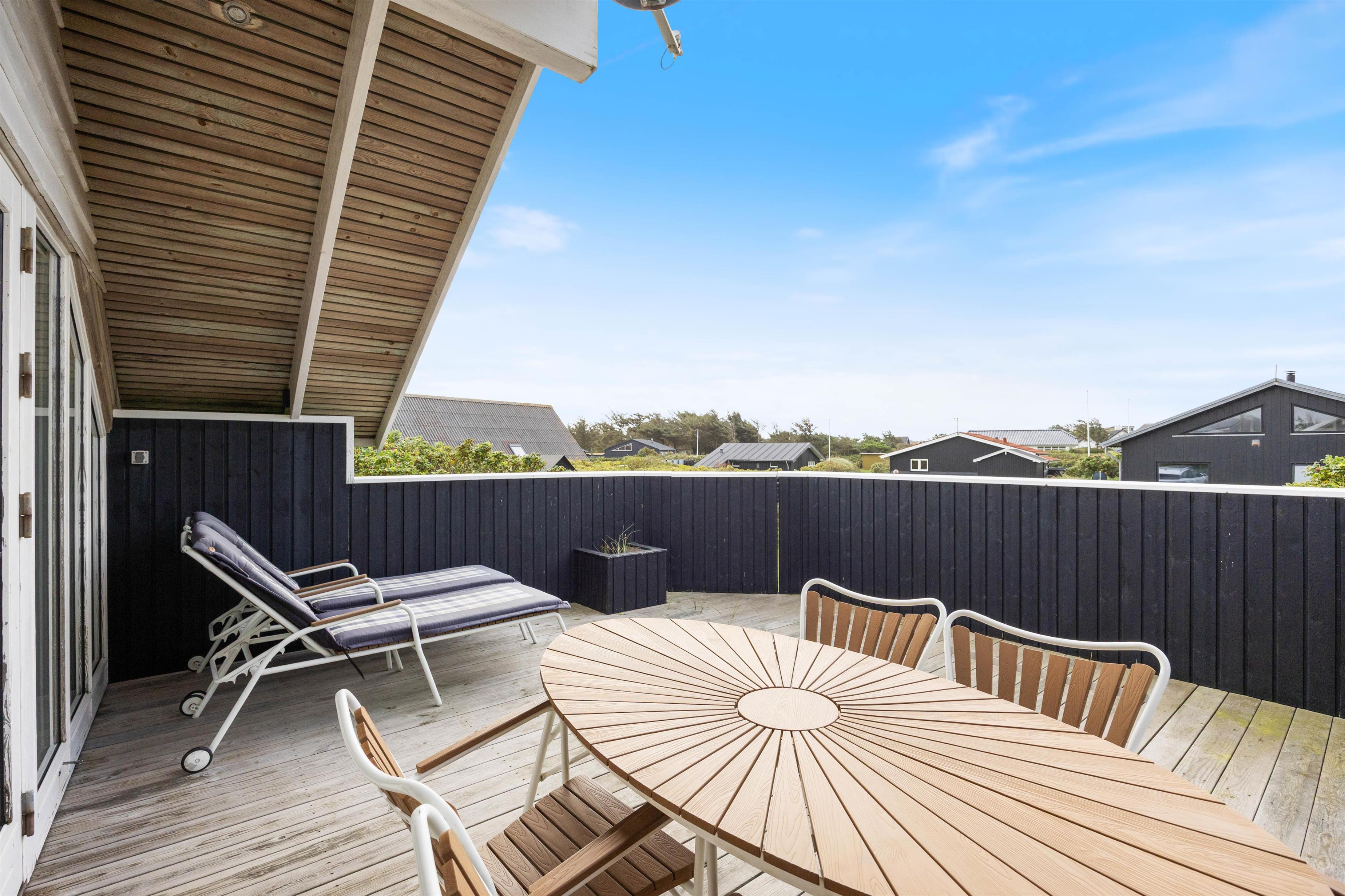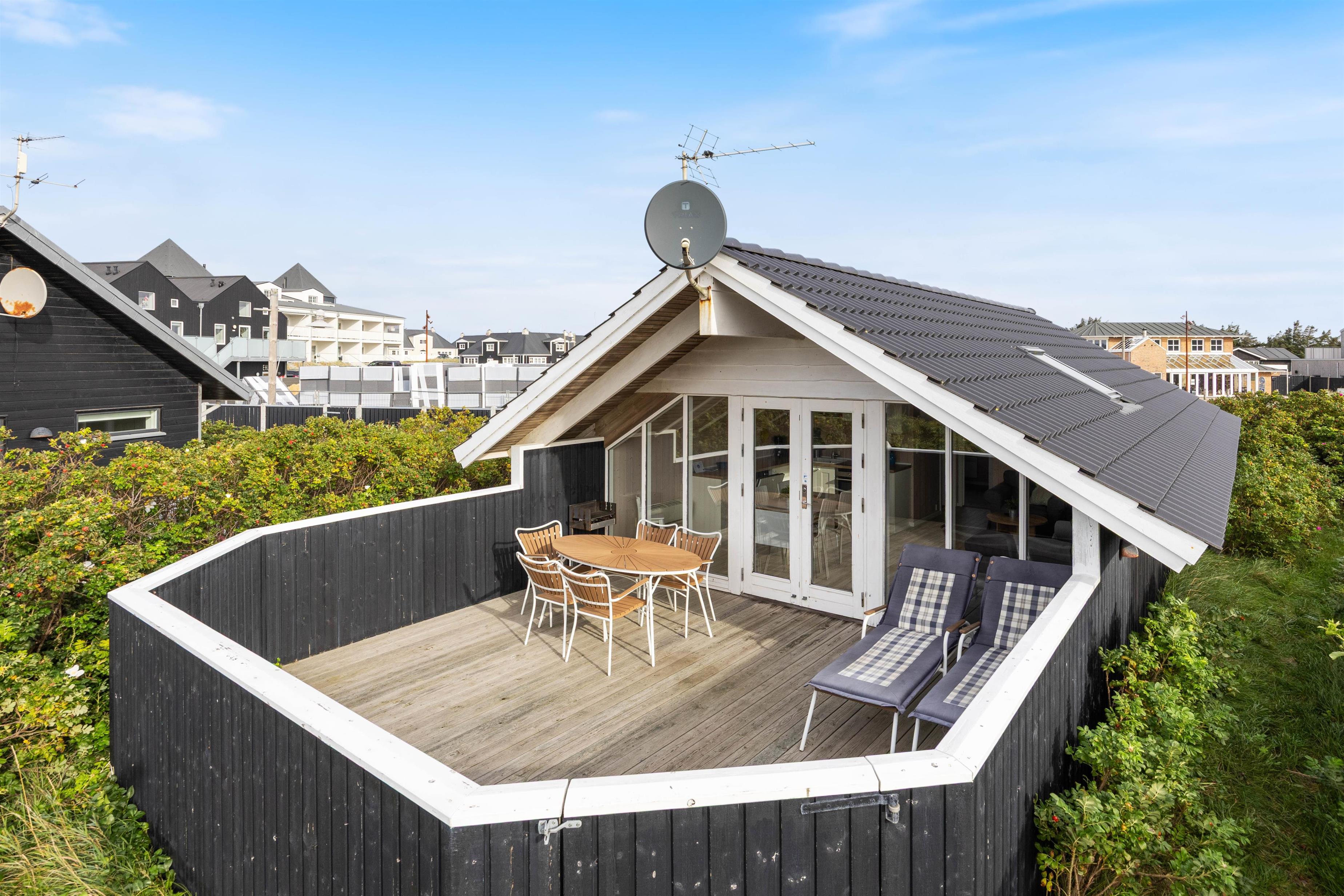 Den sydvendte terrasse er helt lukket og sørger for både læ og privatliv. Her kan man også nyde skønne grillaftener, idet terrassen også er delvist overdækket. Fra terrassen kan man tydeligt både høre og dufte Vesterhavet, hvilket er helt fantastisk. Ønsker man sig en is eller at indtage en frokost på en af de nærliggende restauranter, er man kun ca. 2 minutters gang væk. Søndervig har masser at byde på, men hvis I ønsker at se mere end bare søndervig, kan det helt klart anbefales at besøge de 2 nabobyer, Hvide Sande og Ringkøbing. Her finder I også et væld af butikker, hvor jeres shoppetrang kan blive stillet, samt begge byer råder over et hav af forskellige restauranter og aktivitetsmuligheder.