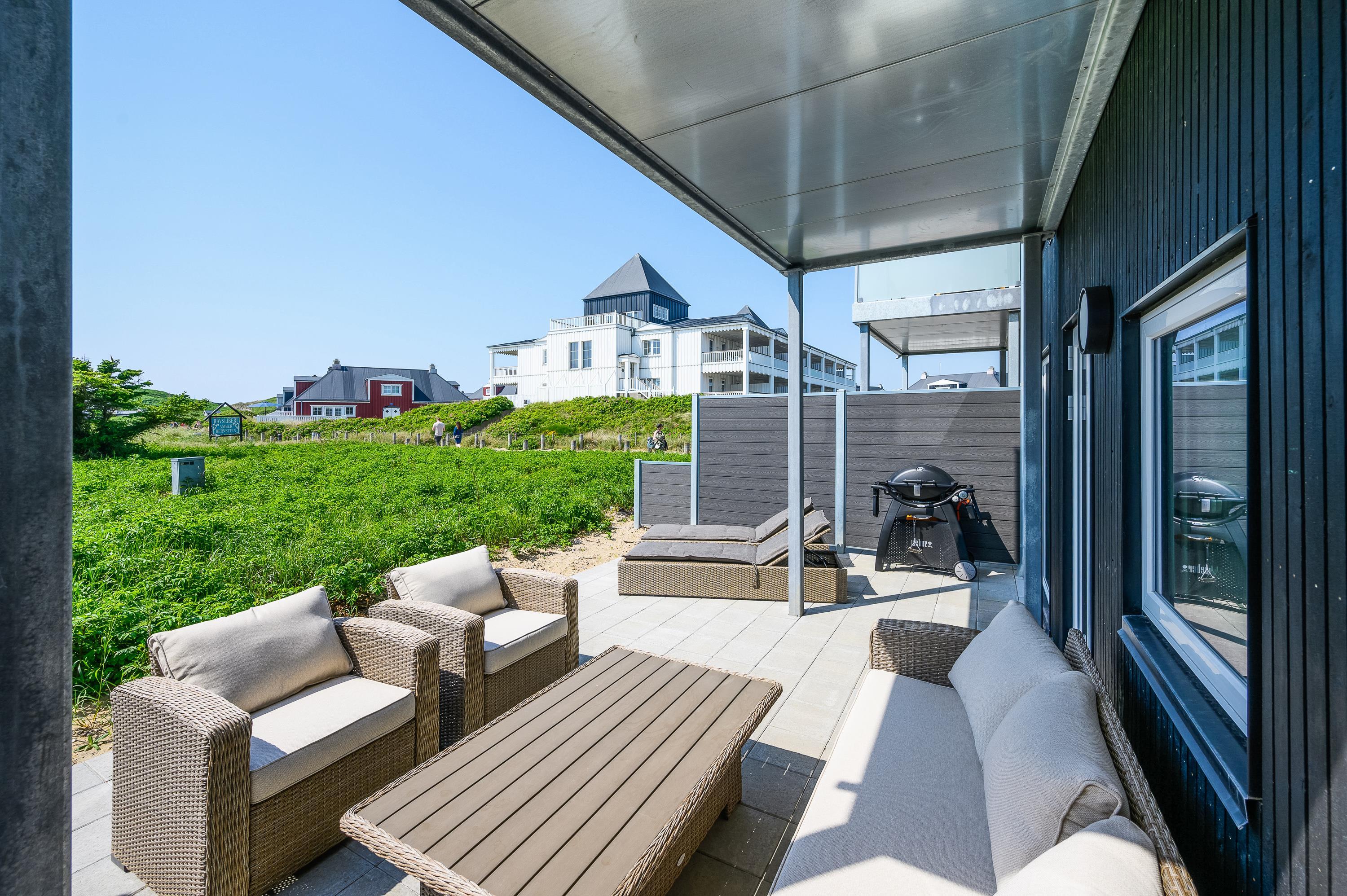 Fra stuen er der udgang til terrassen, der både har en afskærmet og overdækket del. Der er selvfølgelig sørget for havemøbler, liggestole og en praktisk gasgrill, så I kan få det bedste ud af de solrige dage. Afskærmningen sørger også for mere privatliv, så her på terrassen ville I også kunne dase og slikke noget sol.