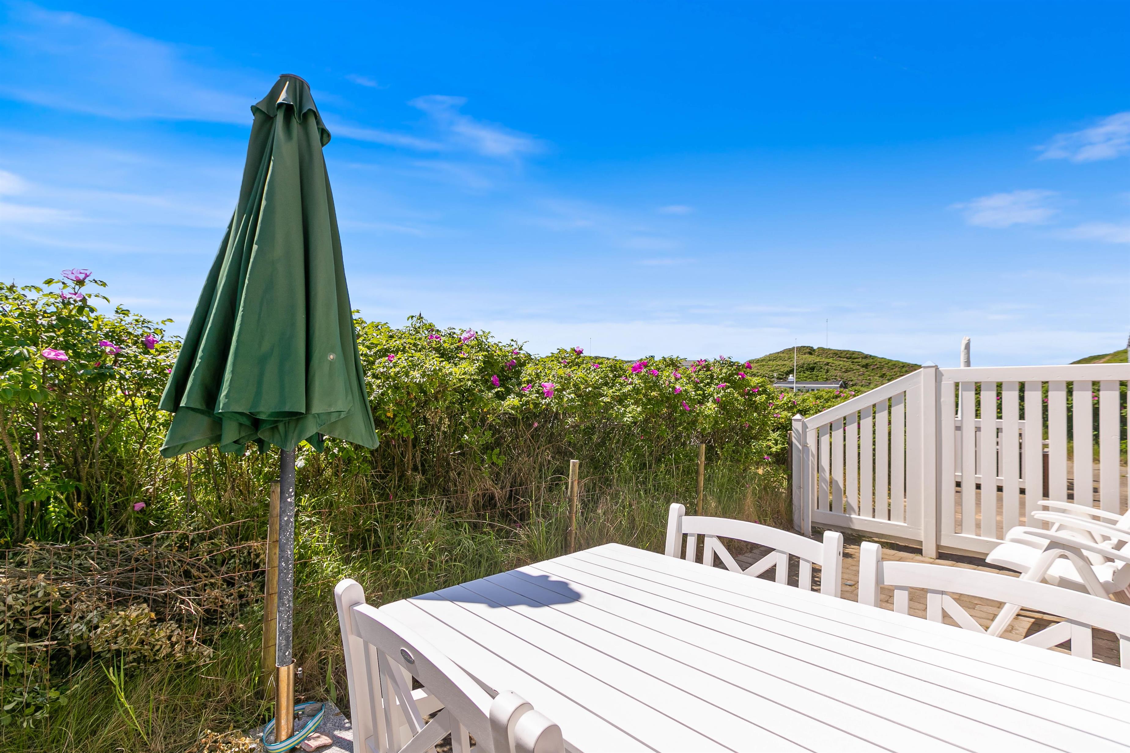 Fra opholdsstuen er der udgang til en lille lukket terrasse med havemøbler. Her kan I sidde og nyde solen og det jyske klitlandskab, mens I nyder en dejlig kop kaffe eller en kølig drink. Her står også en grill til rådighed, så I kan tilberede en skøn middag på terrassen.