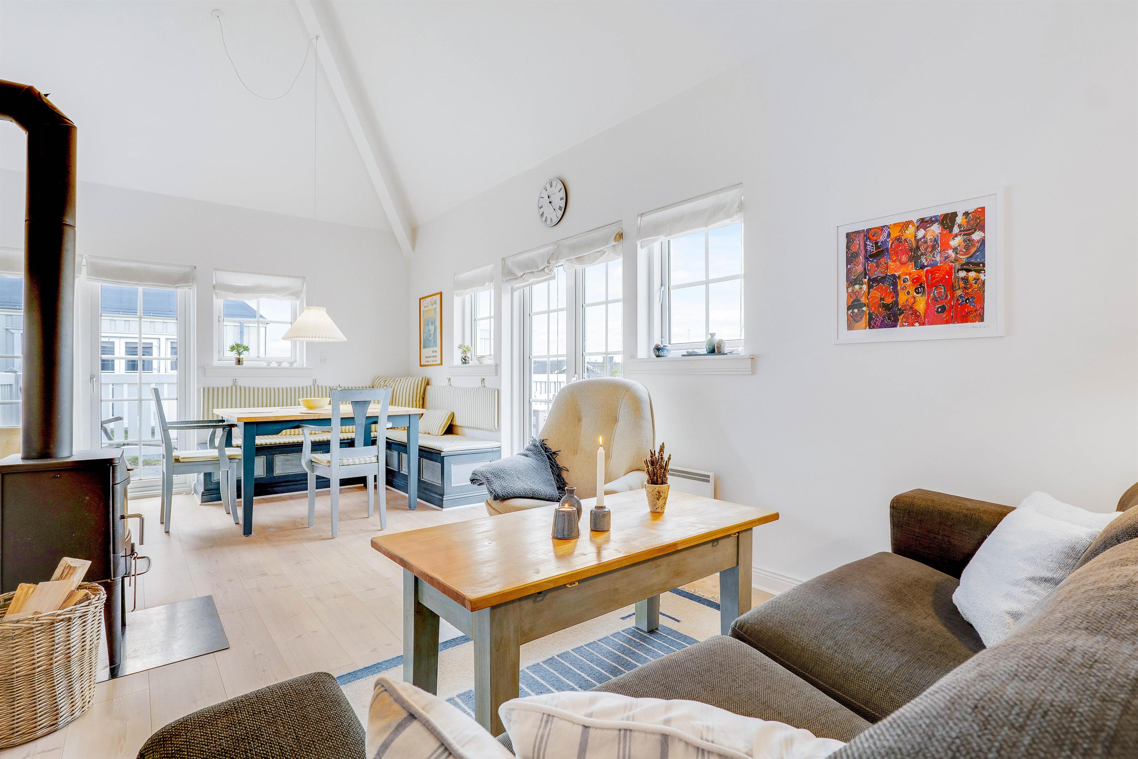 Der er en skøn og smagfuld indretning på Badevej 20 P1, som I mærker, så snart I træder ind ad døren. I kan tilmed høre bruset fra bølgerne. Ferielejligheden er på 90 m2 og byder på en superhyggelig indretning med en integreret stue og spisestue med brændeovn samt badeværelse med gulvvarme, sauna og spa.