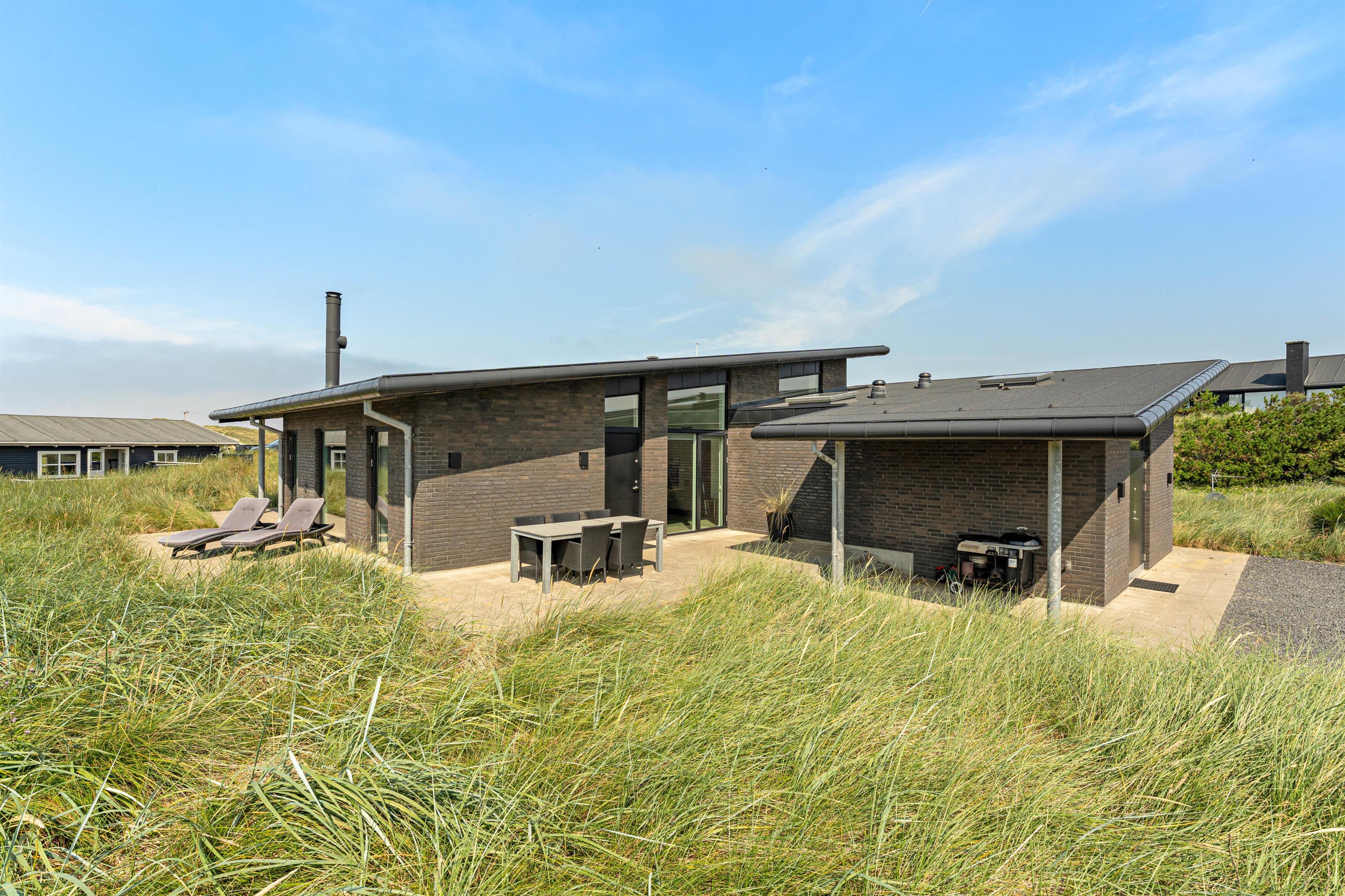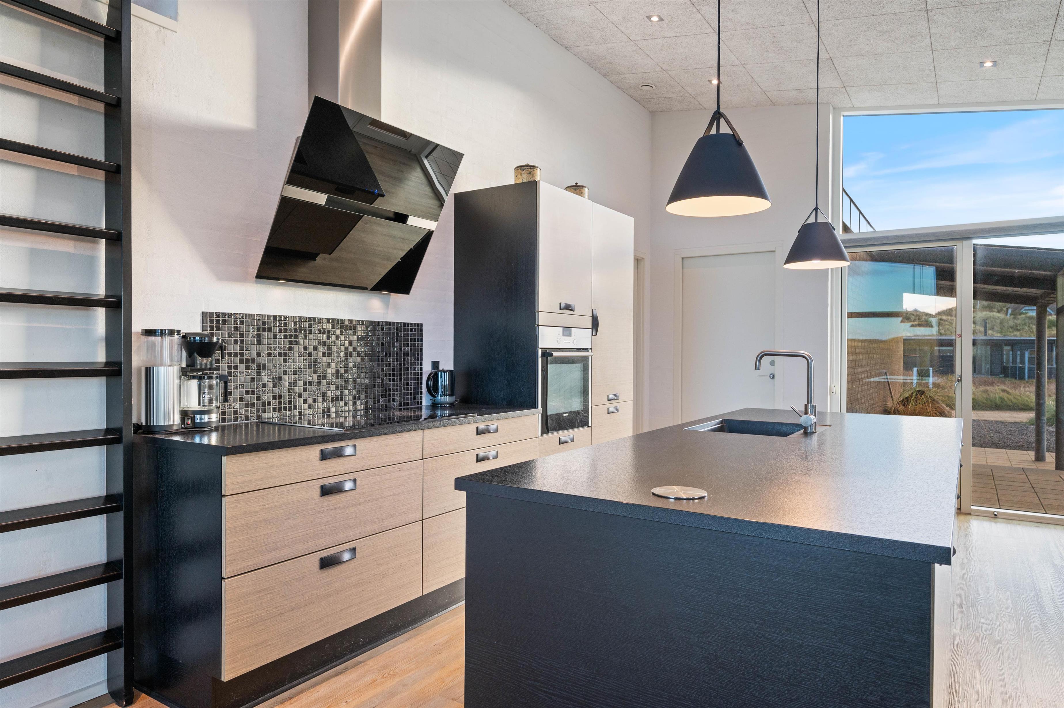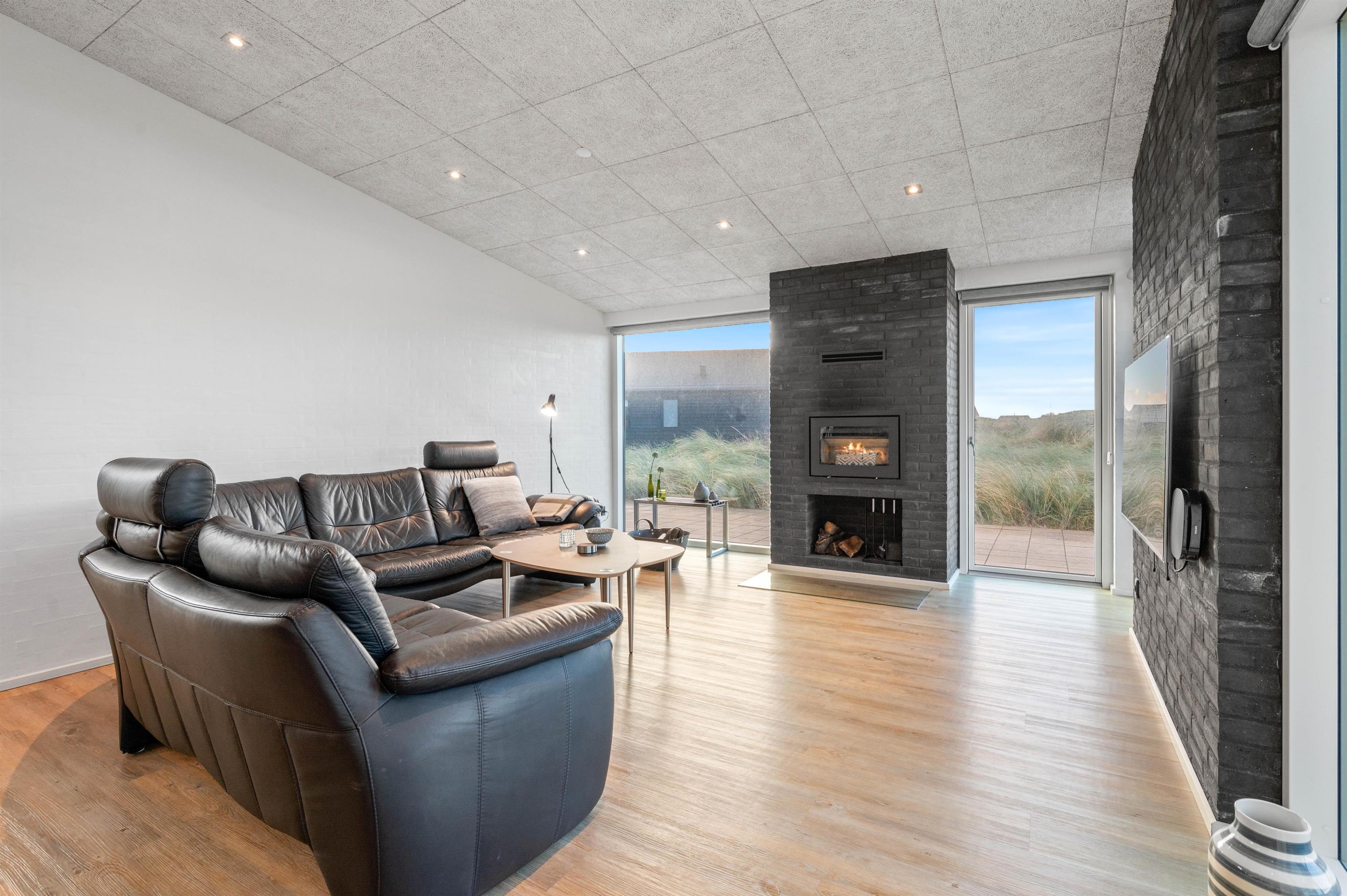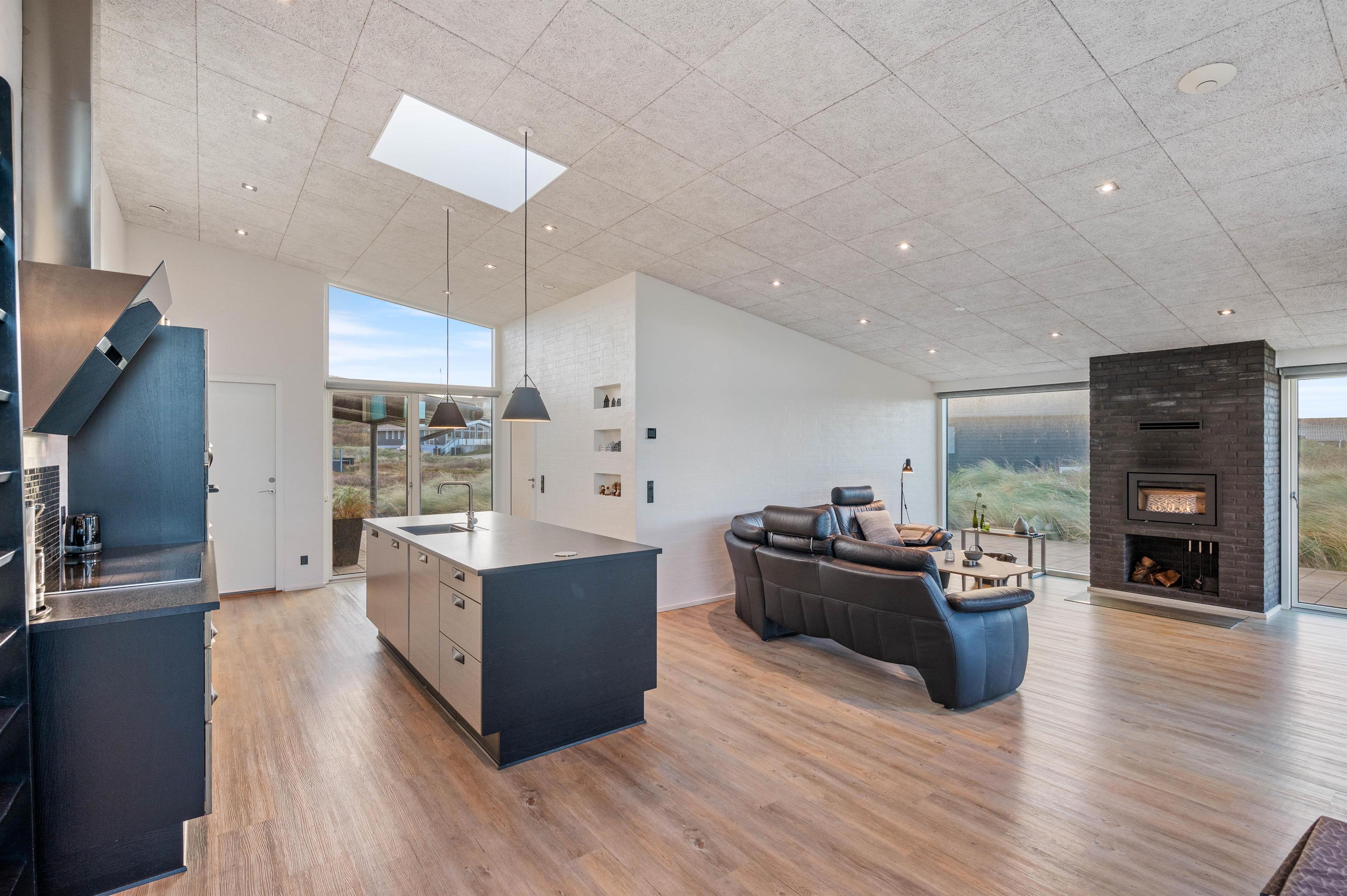 I det åbne spisestue- og køkkenområde er der lagt op til masser af samvær og hyggelige feriestunder, og gennem de store vinduesfronter kan I nyde den fantastiske udsigt ud over klitlandskabet fra sofaen eller spisebordet, mens brændeovnen knitrer i baggrunden.