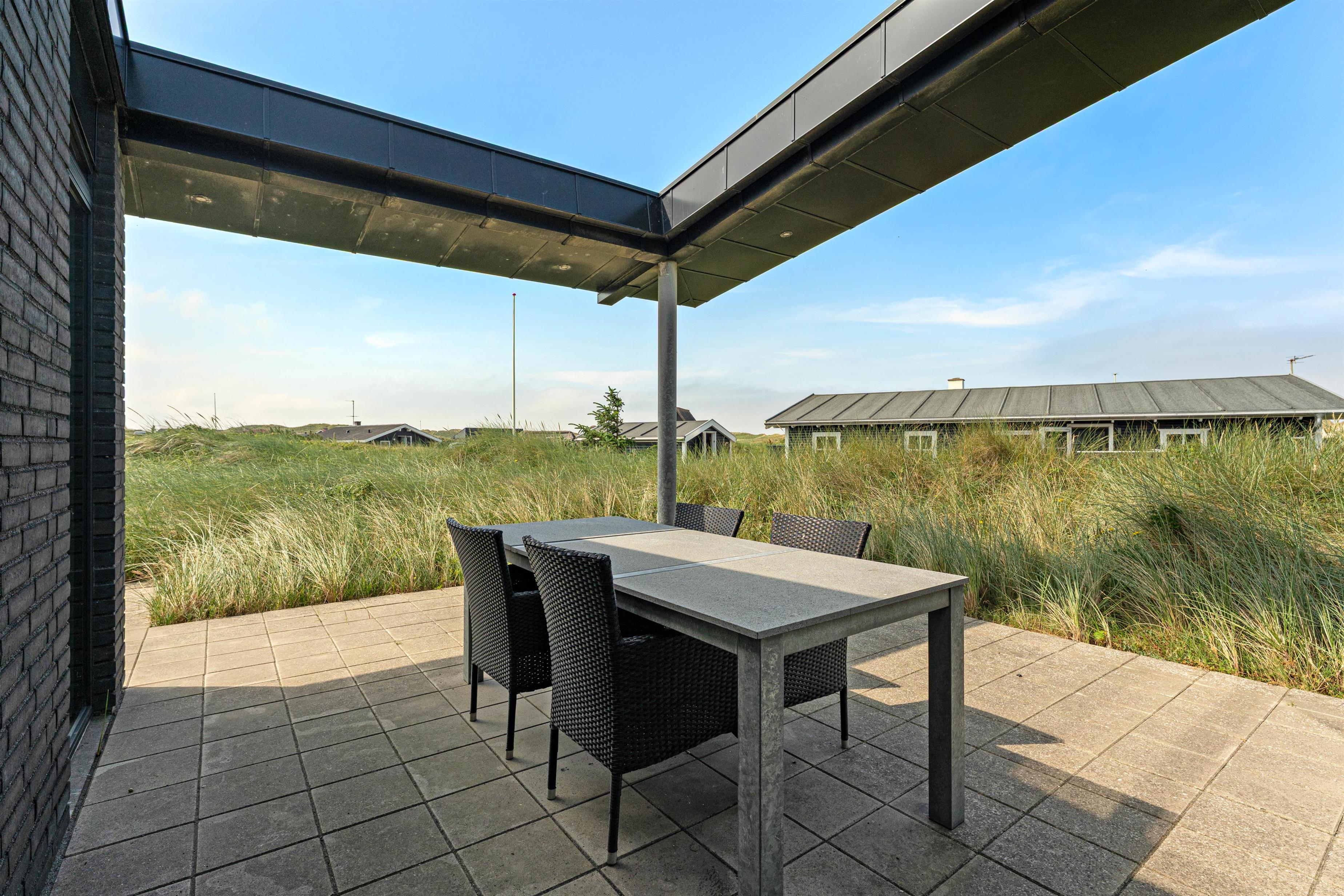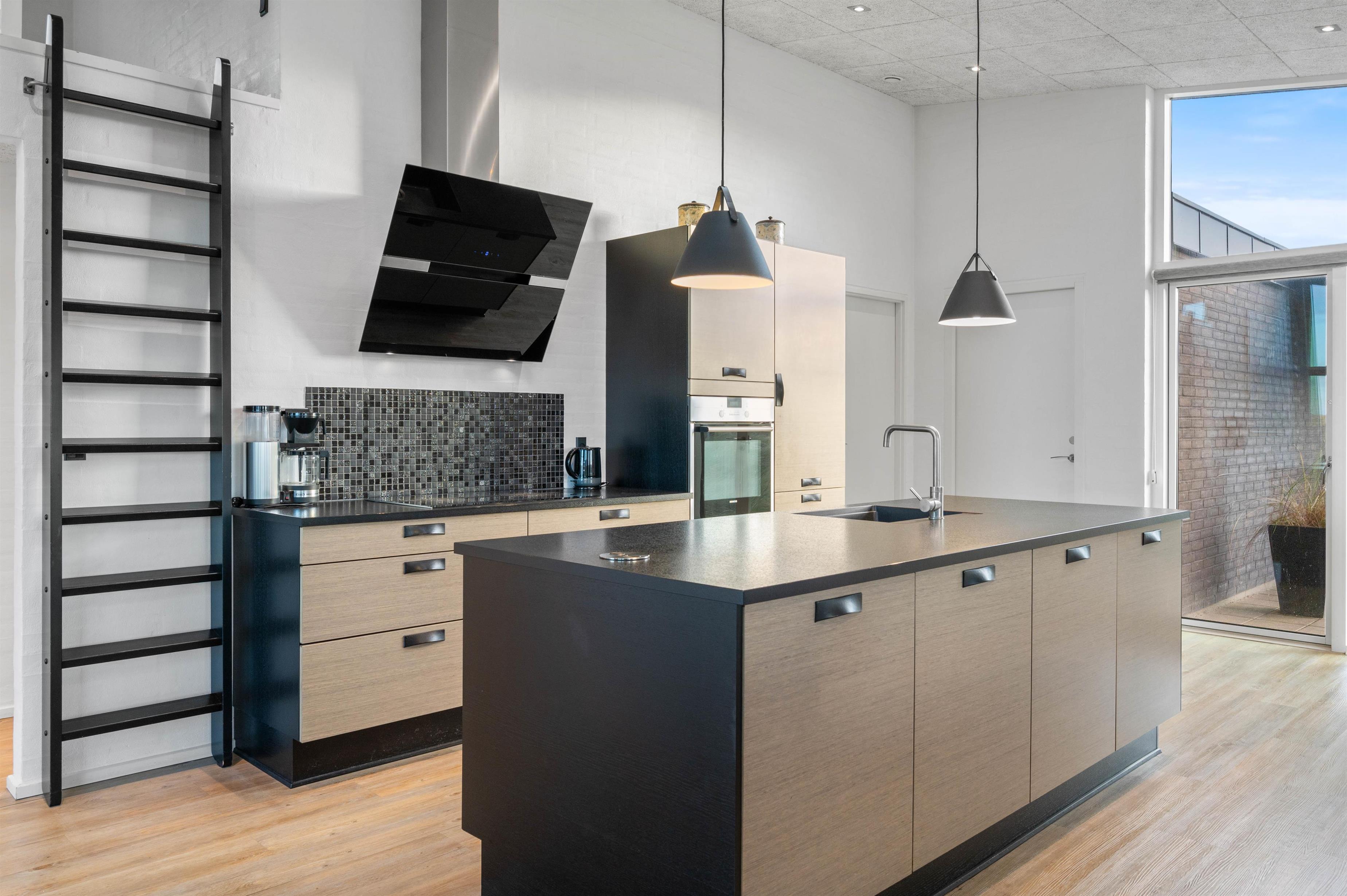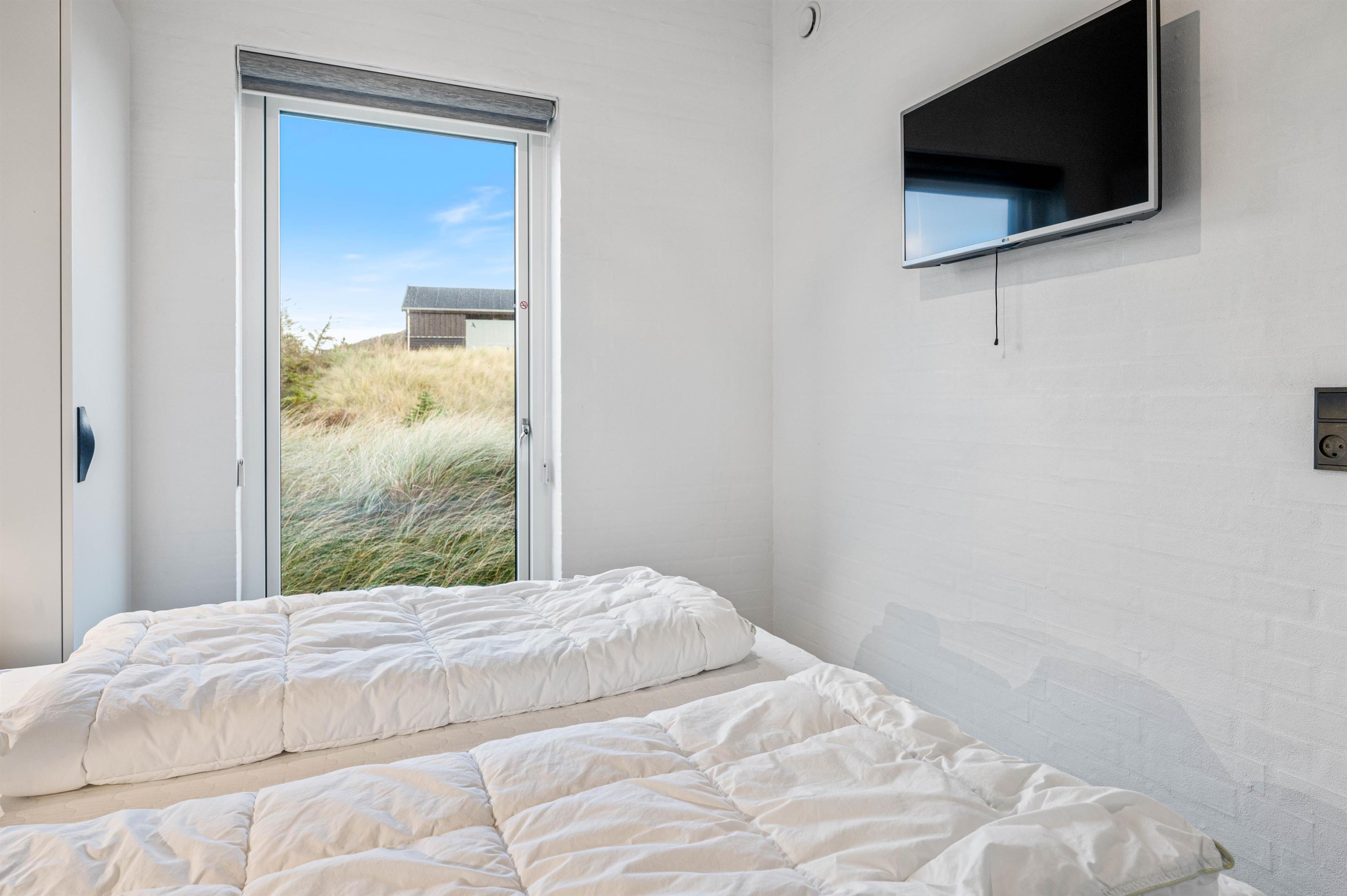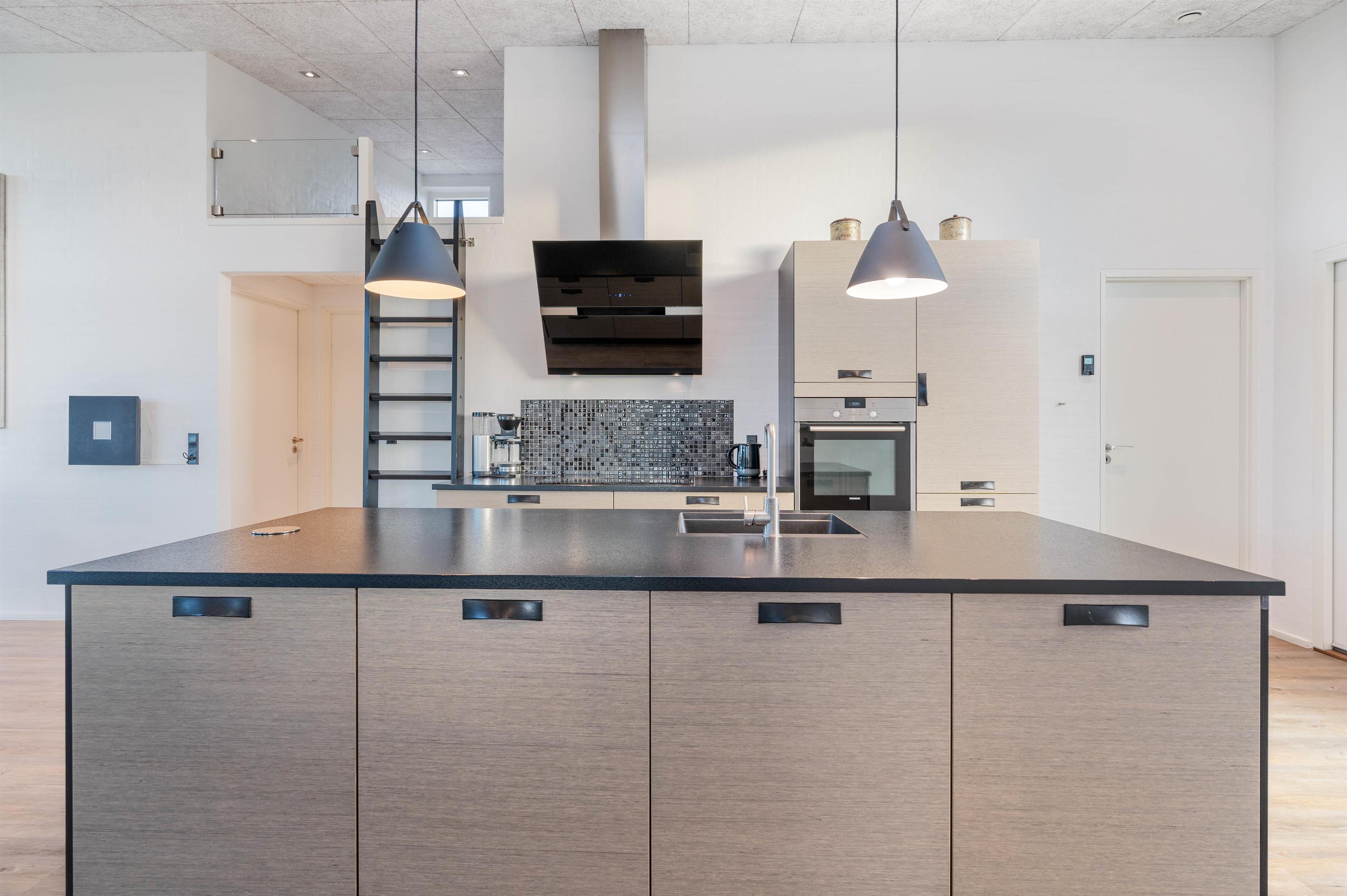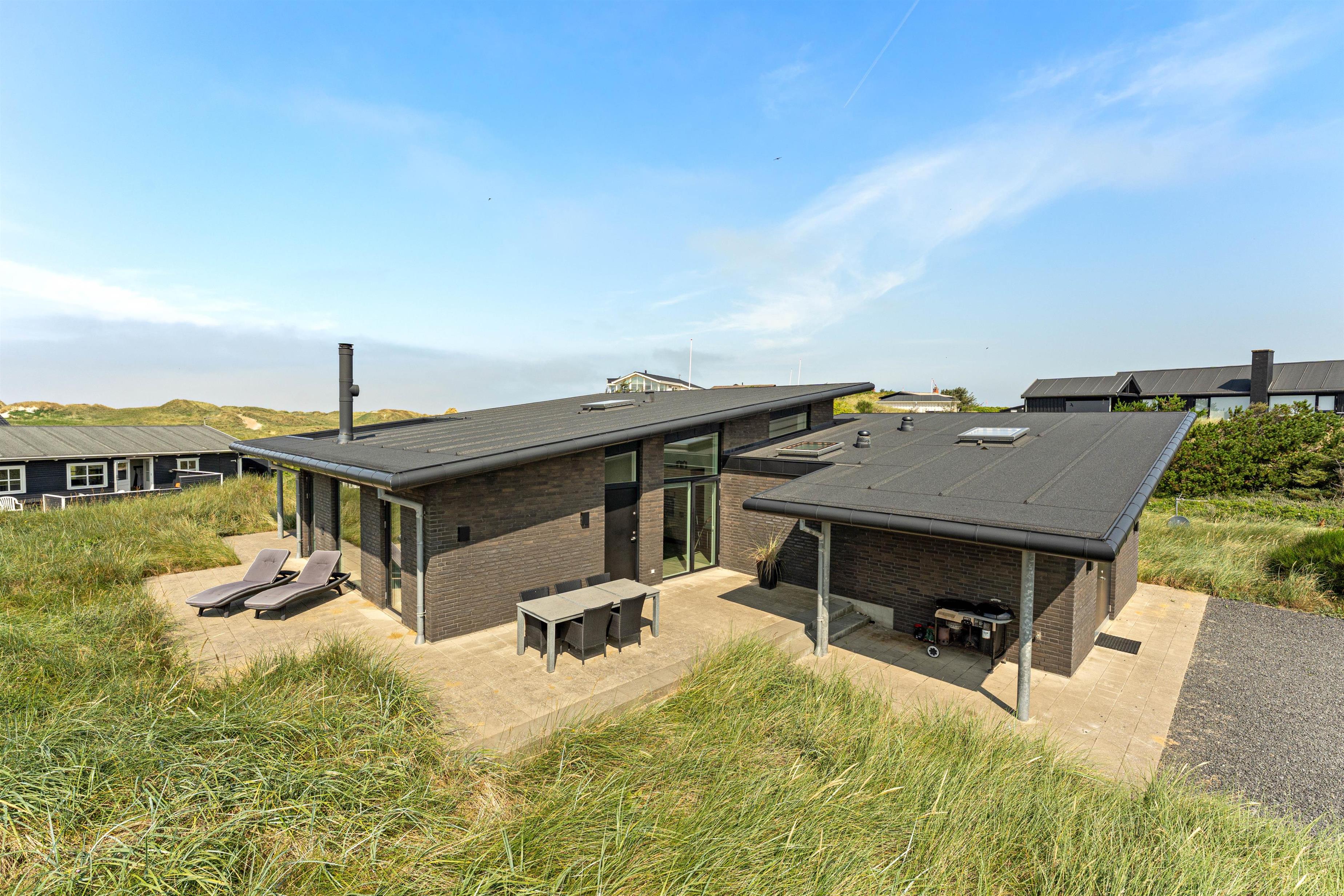 I det åbne spisestue- og køkkenområde er der lagt op til masser af samvær og hyggelige feriestunder, og gennem de store vinduesfronter kan I nyde den fantastiske udsigt ud over klitlandskabet fra sofaen eller spisebordet, mens brændeovnen knitrer i baggrunden.