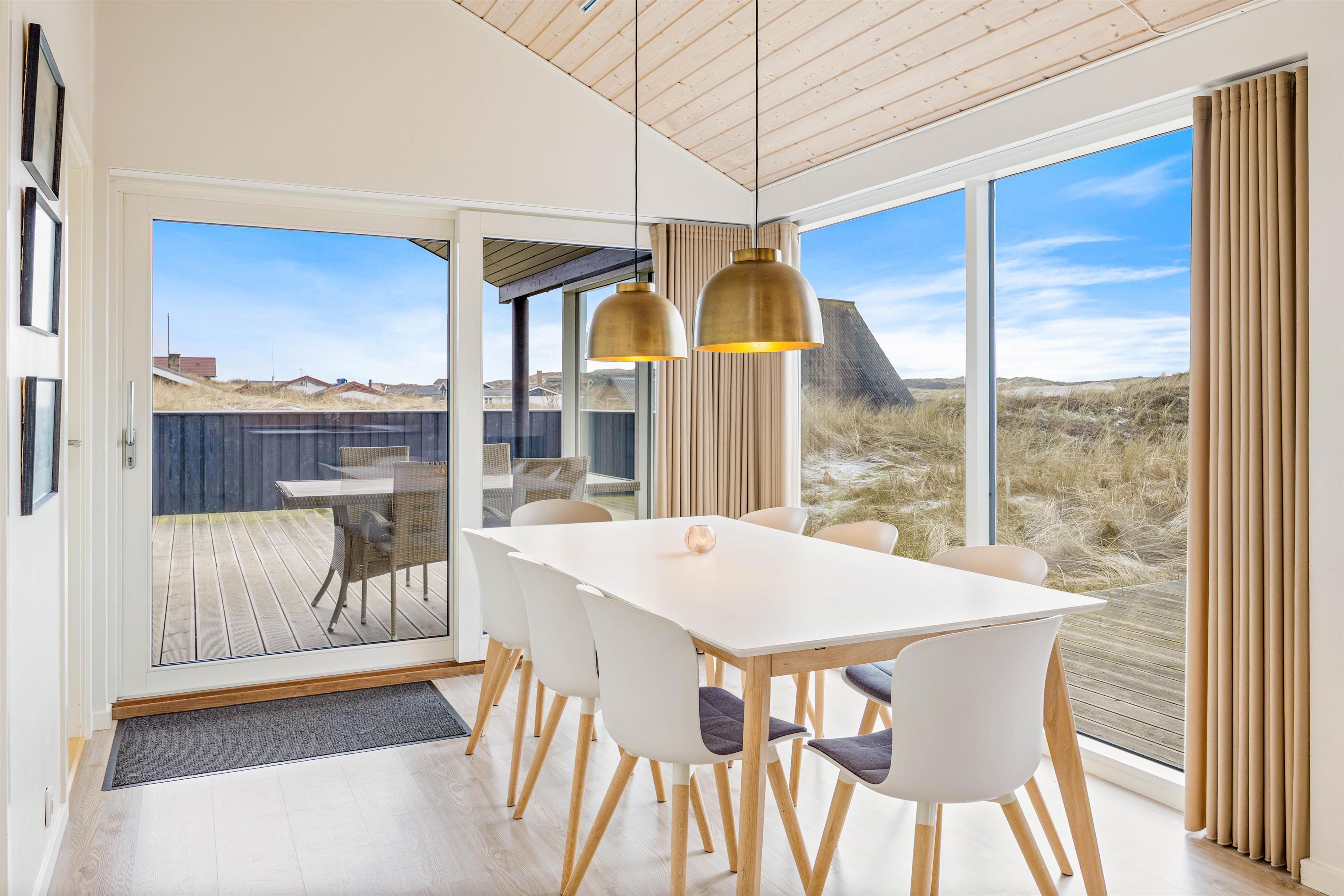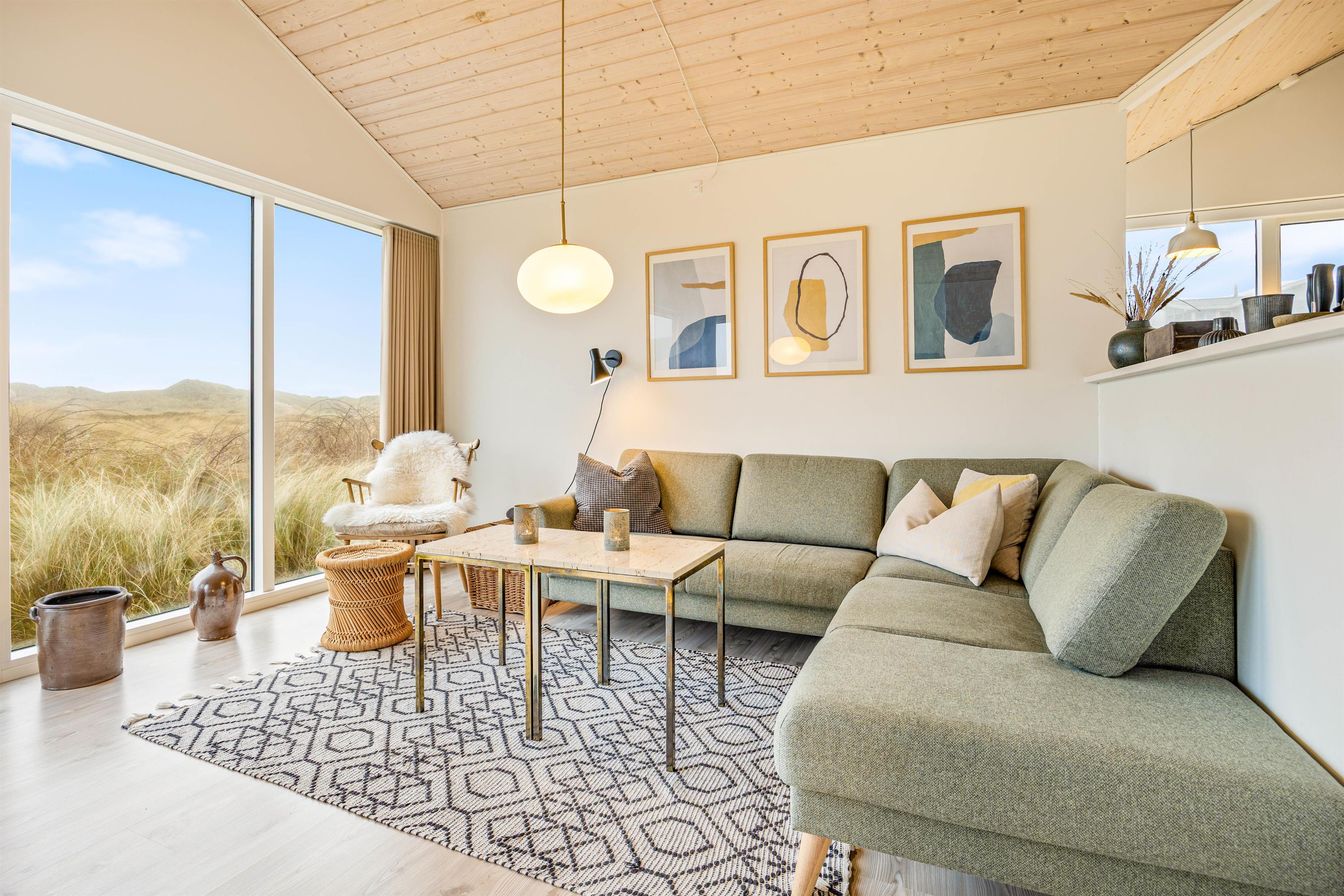 Fra den fantastiske stue, som også er møbleret med både komfortable og flotte møbler, har I en helt enestående udsigt ud over det omkringliggende klitområde. Det er også i stuen hvor brændeovnen befinder sig. Hvem har ikke lyst til at nyde en stund her, med en tændt brændeovn og en god bog og en enestående udsigt?