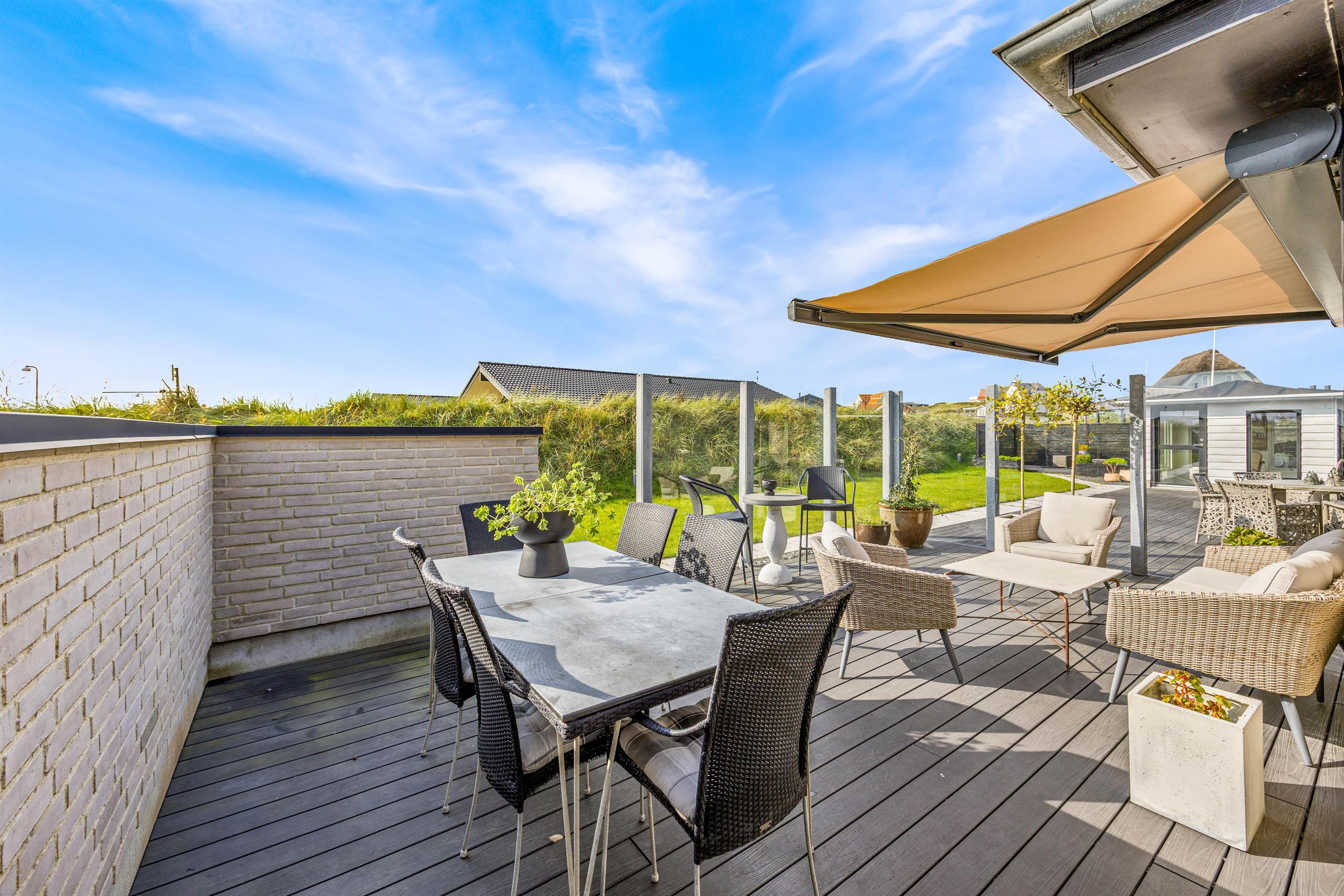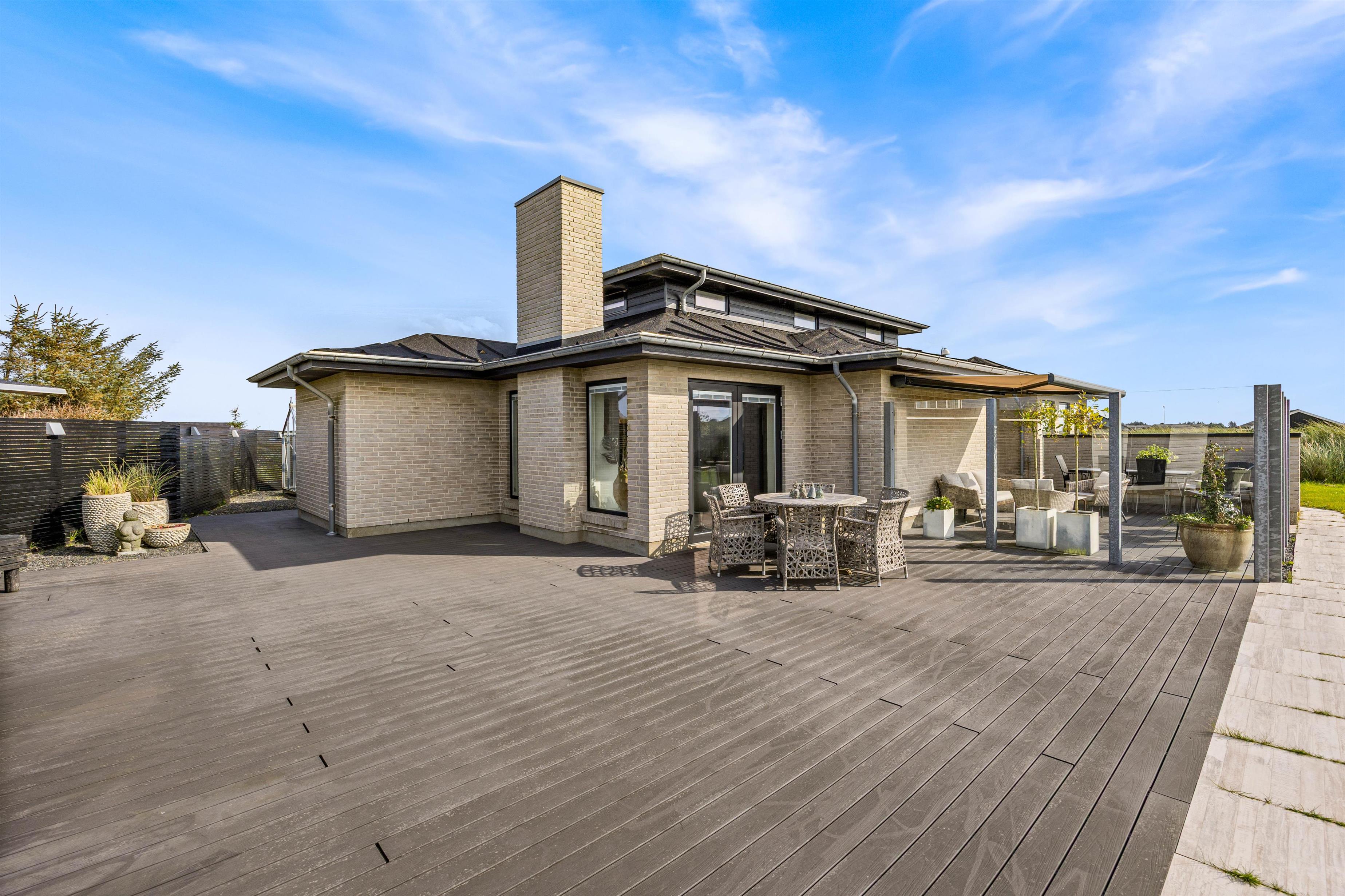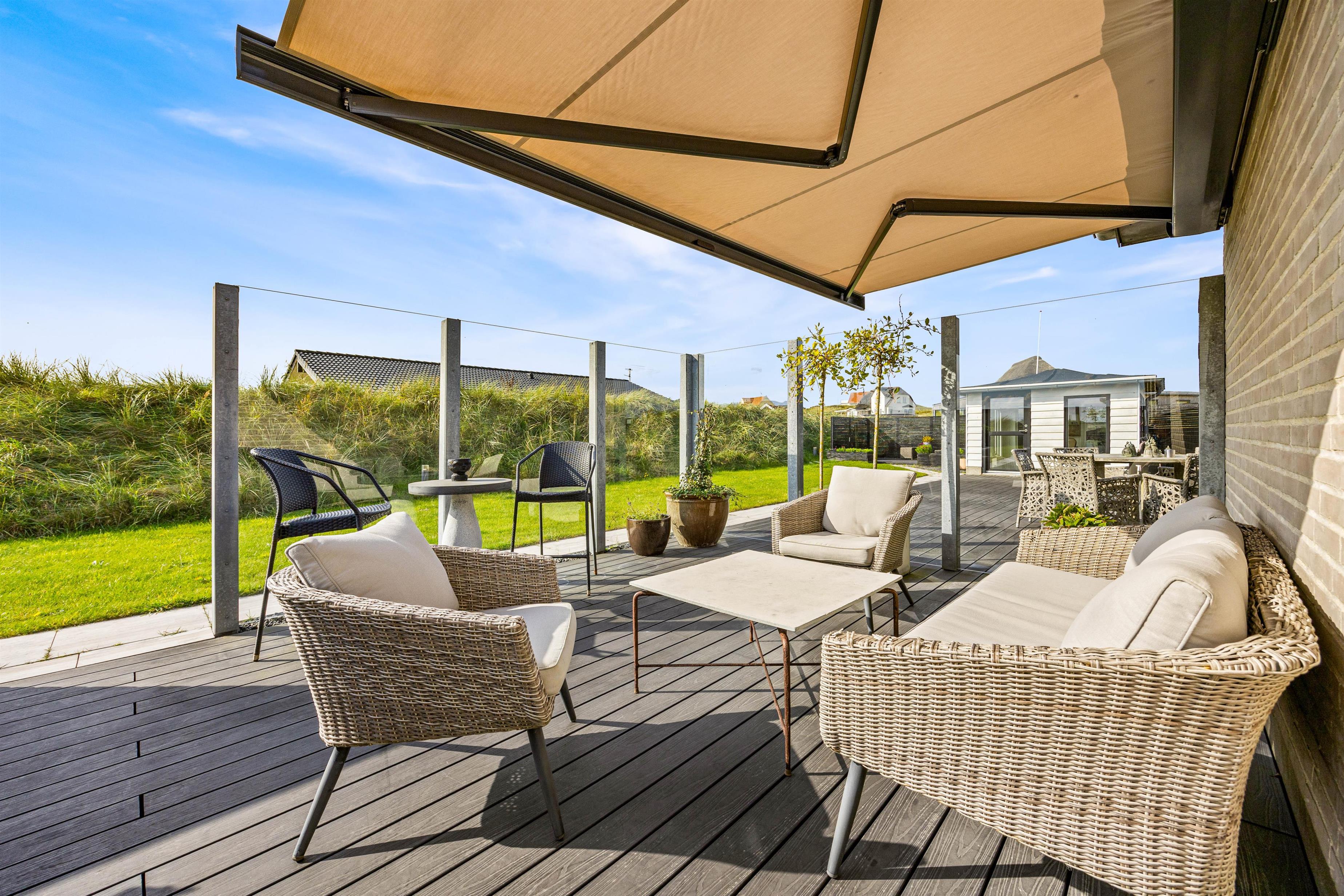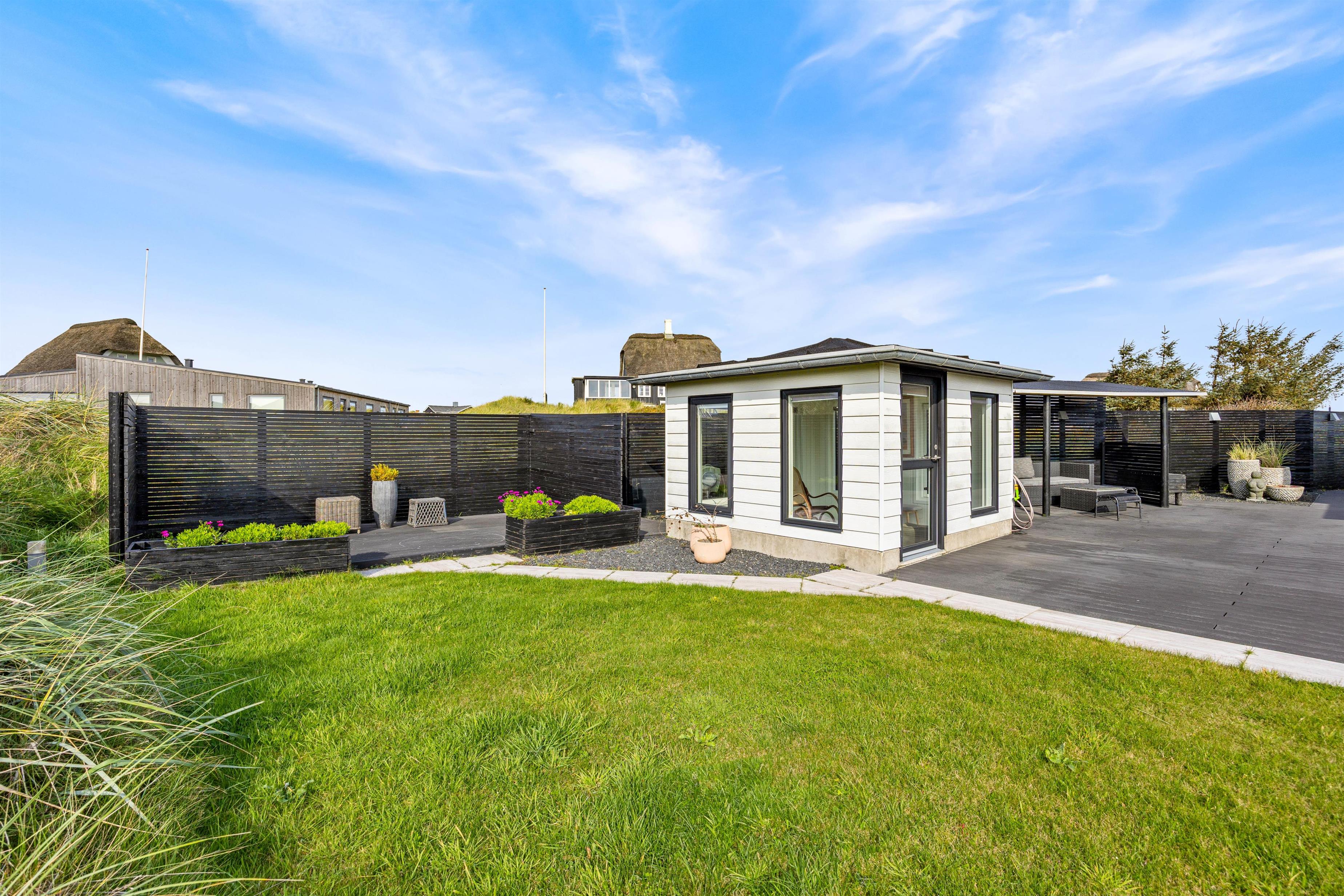 Udendørs kan I nyde den afskærmede og overdækkede terrasse, som er perfekt på de lune sommerdage. Med en plænegrund på 1373m2 er der rigeligt med plads til både afslapning og aktivitet. Havemøbler og grill står klar til jeres rådighed, så I kan tilberede og nyde jeres måltider i det fri og nyde den friske luft.