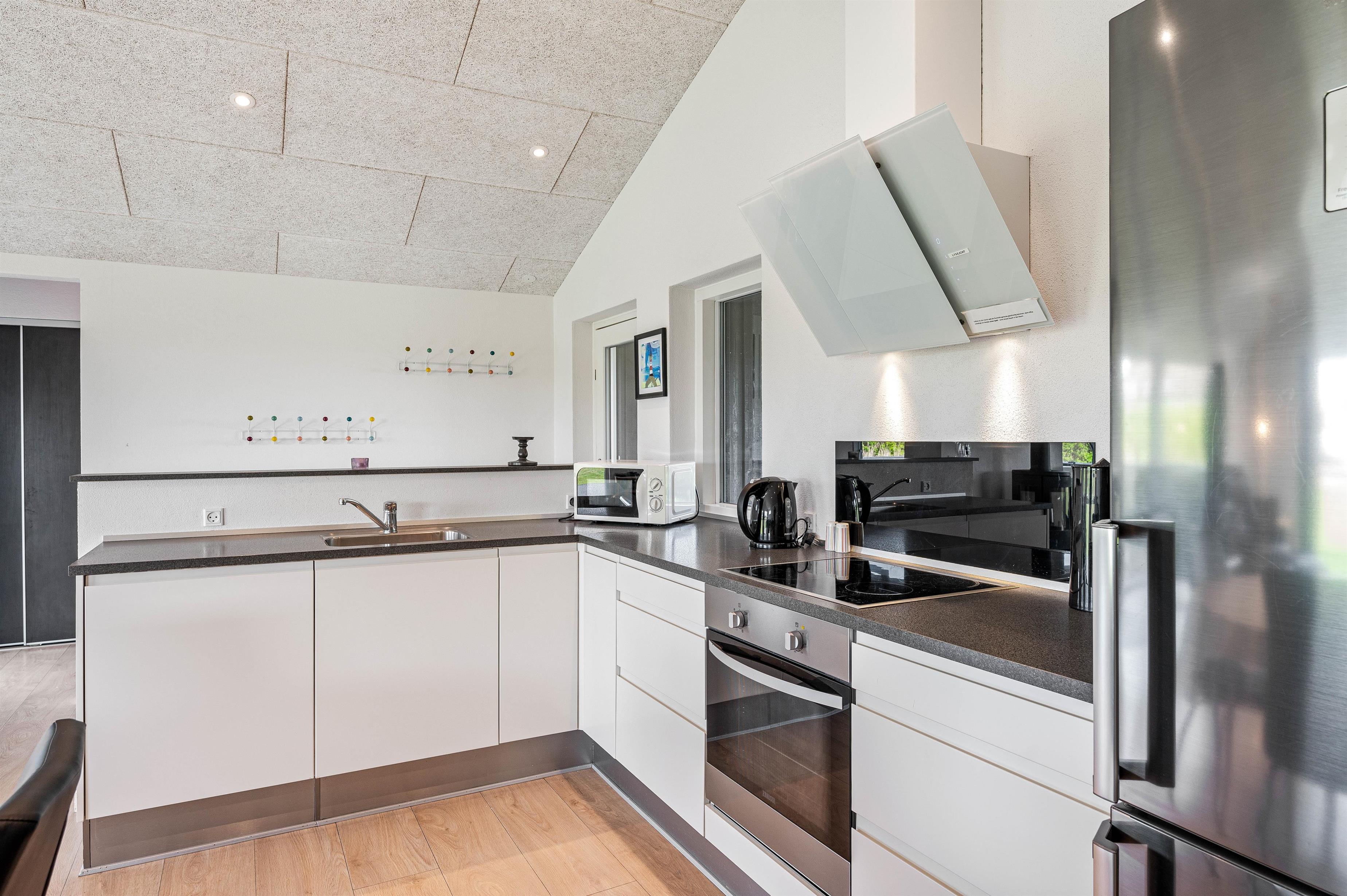 Sommerhusets moderne faciliteter sikrer, at jeres ophold vil være komfortabelt og bekvemt. Køkkenet er udstyret med en opvaskemaskine og en 90 L separat fryser, hvilket især er ideelt ved længere ophold og sikrer at I kan bruge tid på at nyde jeres ferie. Der er desuden en vaskemaskine og en tørretumbler til rådighed, således I kun behøver at pakke jeres yndlingstøj. Brændeovnen skaber en fantastisk hyggelig og varm atmosfære, som også komplementeres af husets økonomiske luft-til-luft varmepumpe.