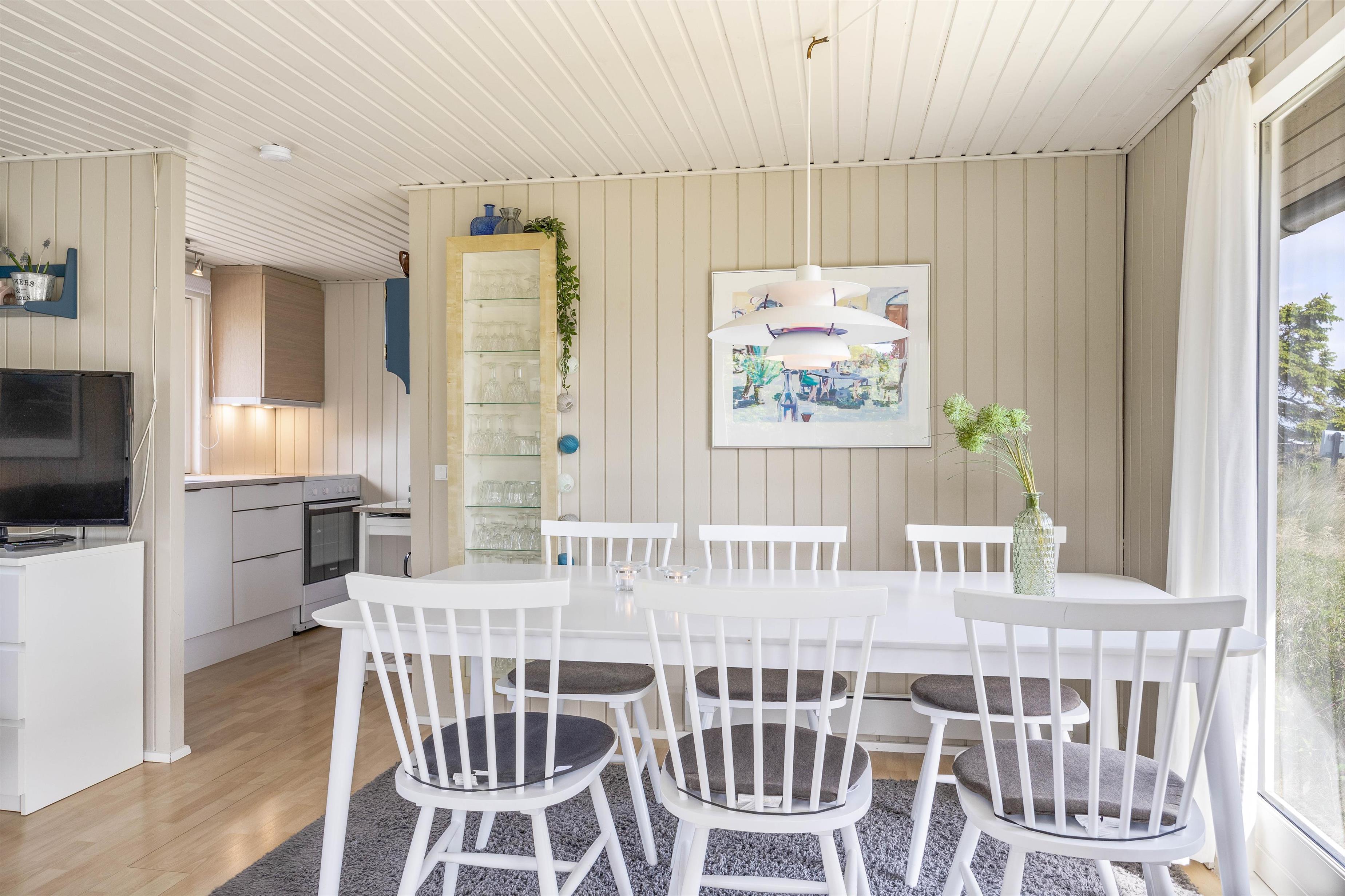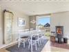 I stuen er der et hyggeligt opholdsområde. Både køkken og spiseområdet er fint integreret i rummet. De høje vinduer garanterer godt med dagslys og en smuk udsigt over den vestjyske natur.