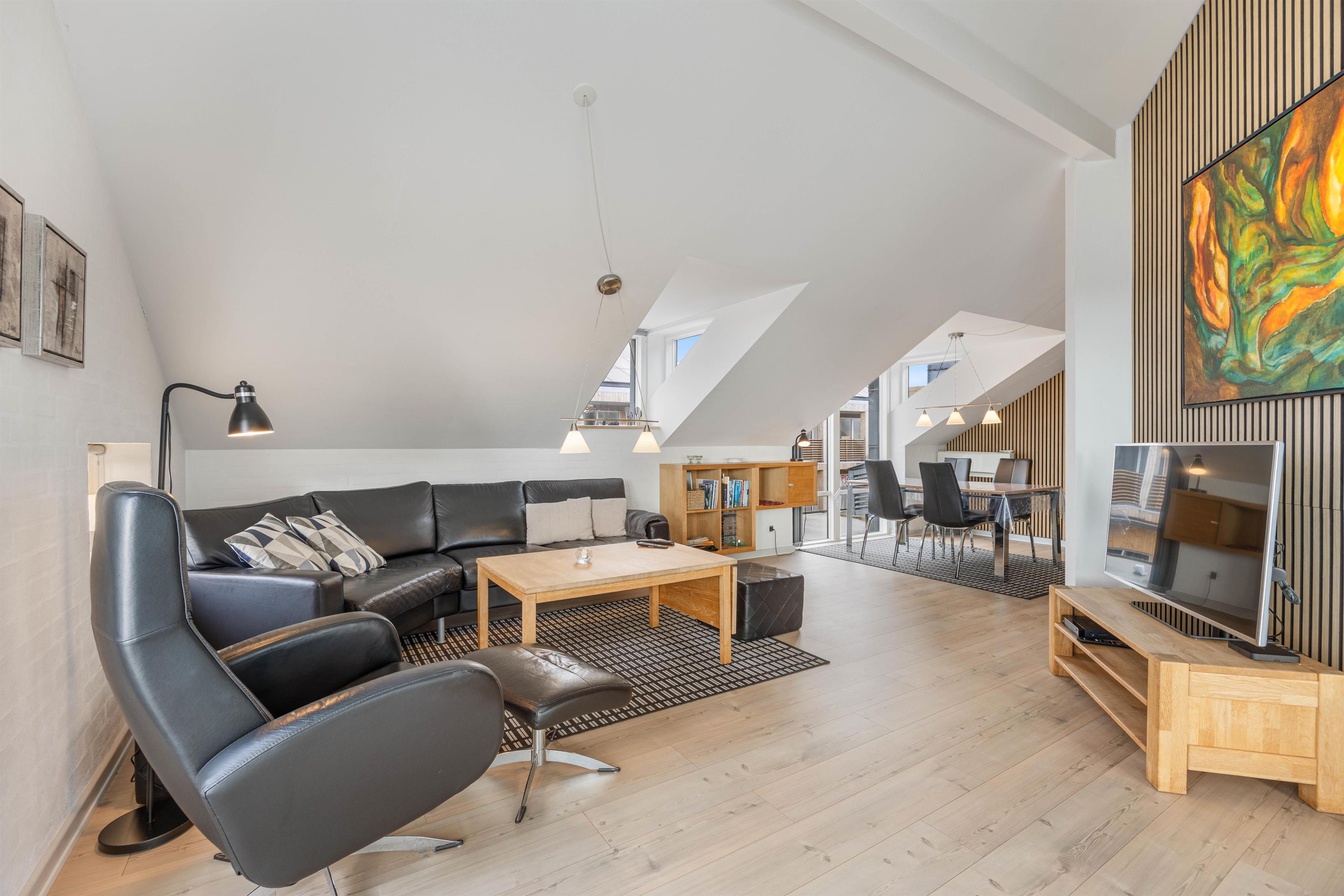 Fra stuen er der udgang til en dejlig udestue, hvor alle dørene ud til tagterrassen kan slås op. Tagterrassen er uden tvivl det perfekte sted at tilbringe de solrige dage på ferien. Her har I havemøbler til rådighed, så I kan finde jer godt til rette og slappe af i solen.