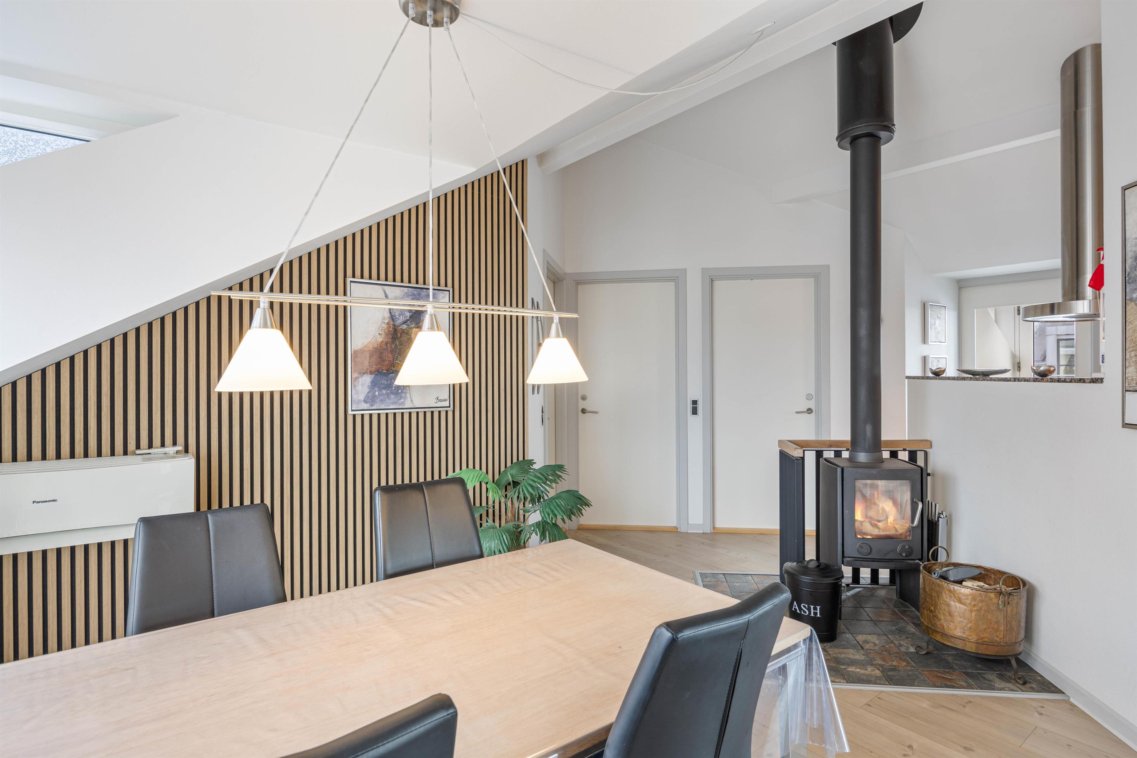 Køkkenet er lækkert og veludstyret med blandt andet opvaskemaskine og mikroovn. Køkkenet ligger i åben forbindelse med den lyse og rummelige spise- og opholdsstue. I stuen er der lagt op til mange hyggelige stunder med gode film i tv’et eller sjove spil omkring bordet. Den gode brændeovn skruer op for hyggen og varmen med sin knitren i baggrunden. Ellers sørger den energivenlige varmepumpe for, at I altid har et godt indeklima.