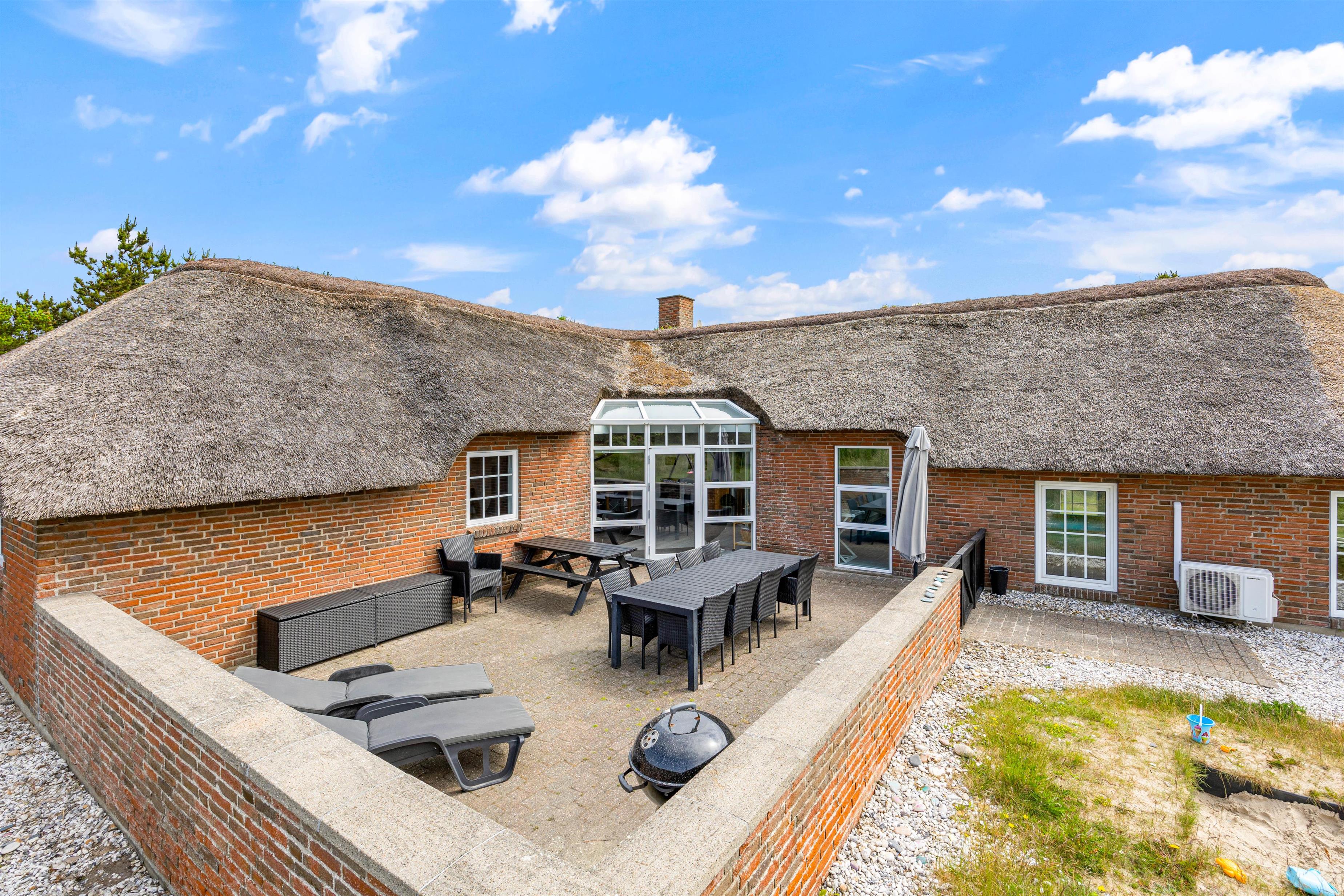 Energivenligt og rummeligt stråtækt poolhus i Søndervig på 240m2 med stor saltvands-swimmingpool og 5 personers spabad – helt perfekt til én stor eller flere familier. Poolen opvarmes vha. varmepumpen, hvilket giver et lavere strømforbrug, og også i stueafdelingen kan I indstille temperaturen på en energirigtig varmepumpe. Derudover er der en dejlig solgård, hvor I alle kan samles og grille.