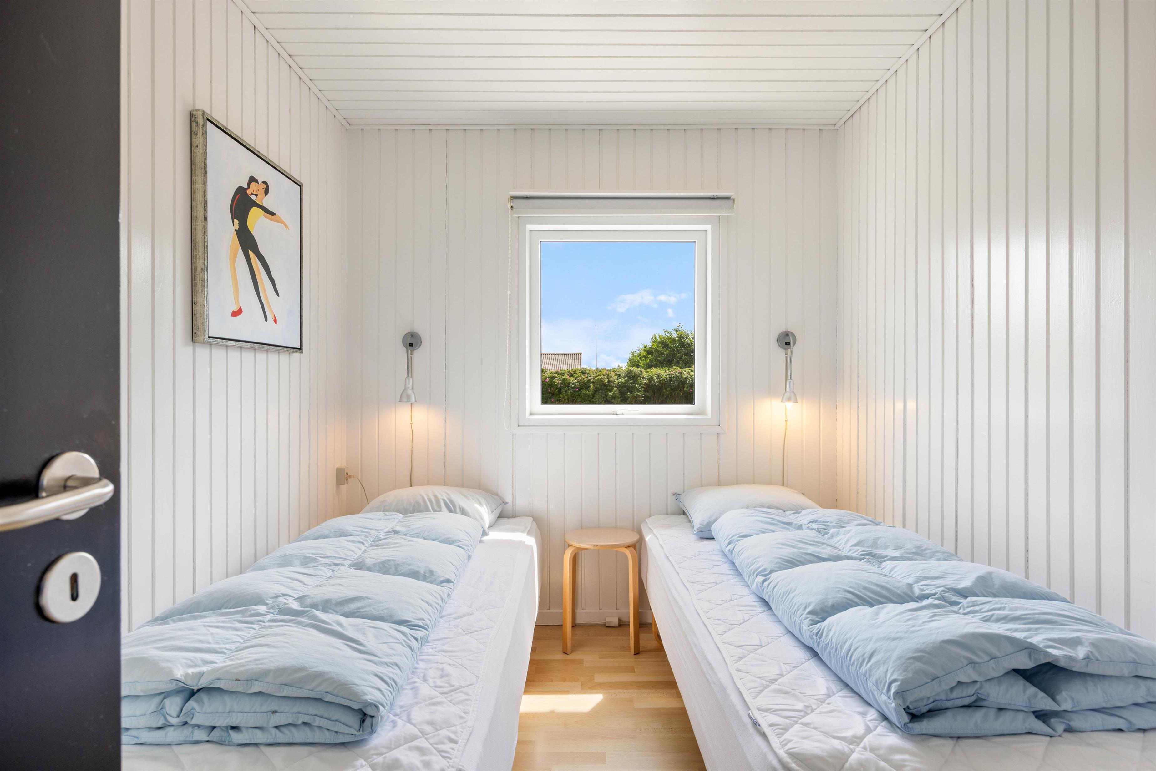 Om aftenen når skyggerne bliver lange, kan i fordele jer i de 2 gode soveværelser. Det ene af soveværelserne er indrettet med en dobbeltseng, og det andet soveværelse er indrettet med 2 enkeltsenge. De klassiske møbler i hele feriehuset skaber en afslappende atmosfære, hvor I kan slappe af efter en dag på stranden.