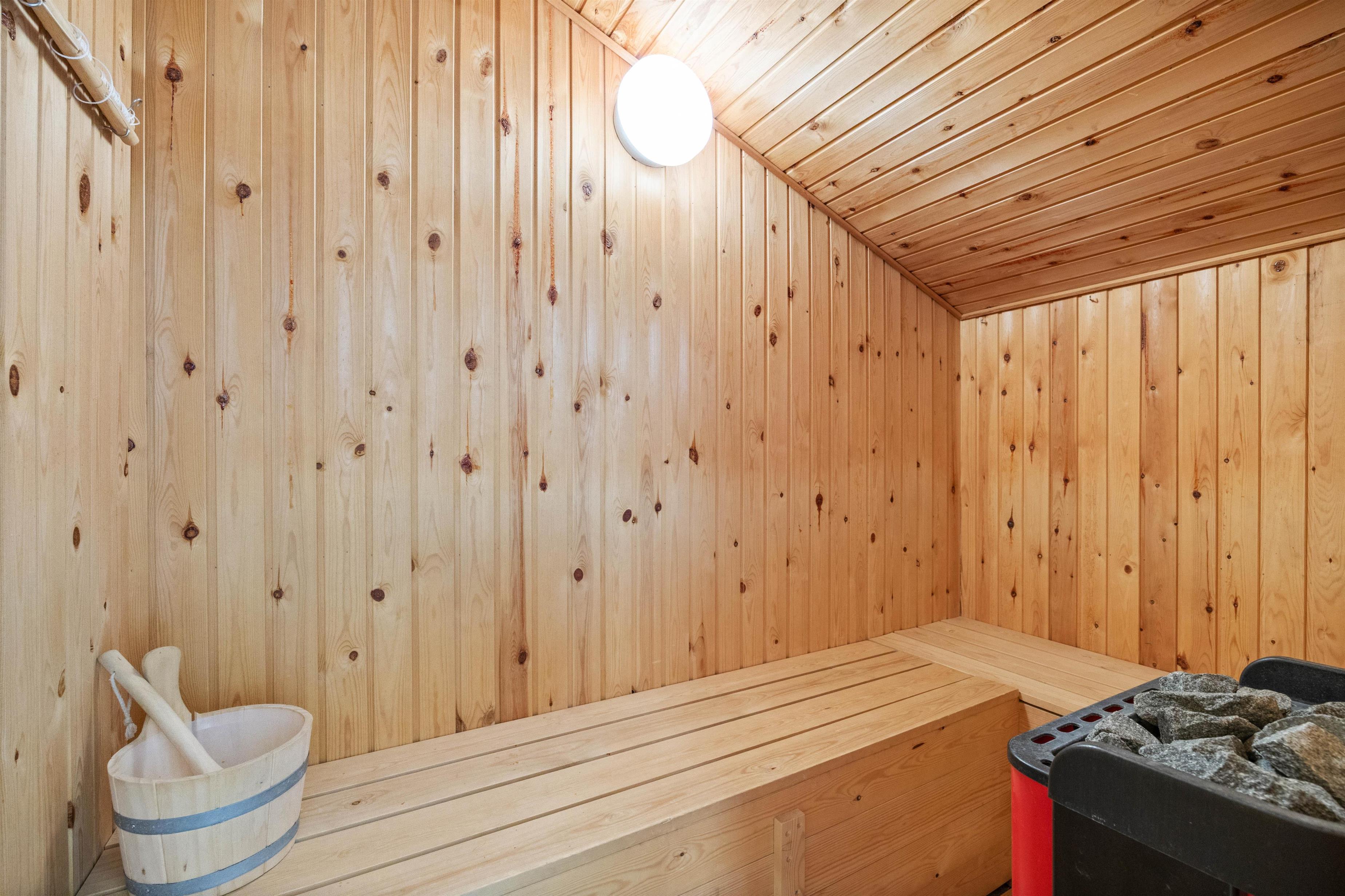 Husets moderne badeværelse er indrettet i samme stil som resten af huset. Her er der gulvvarme, vaskemaskine, tørretumbler og en lækker sauna.
