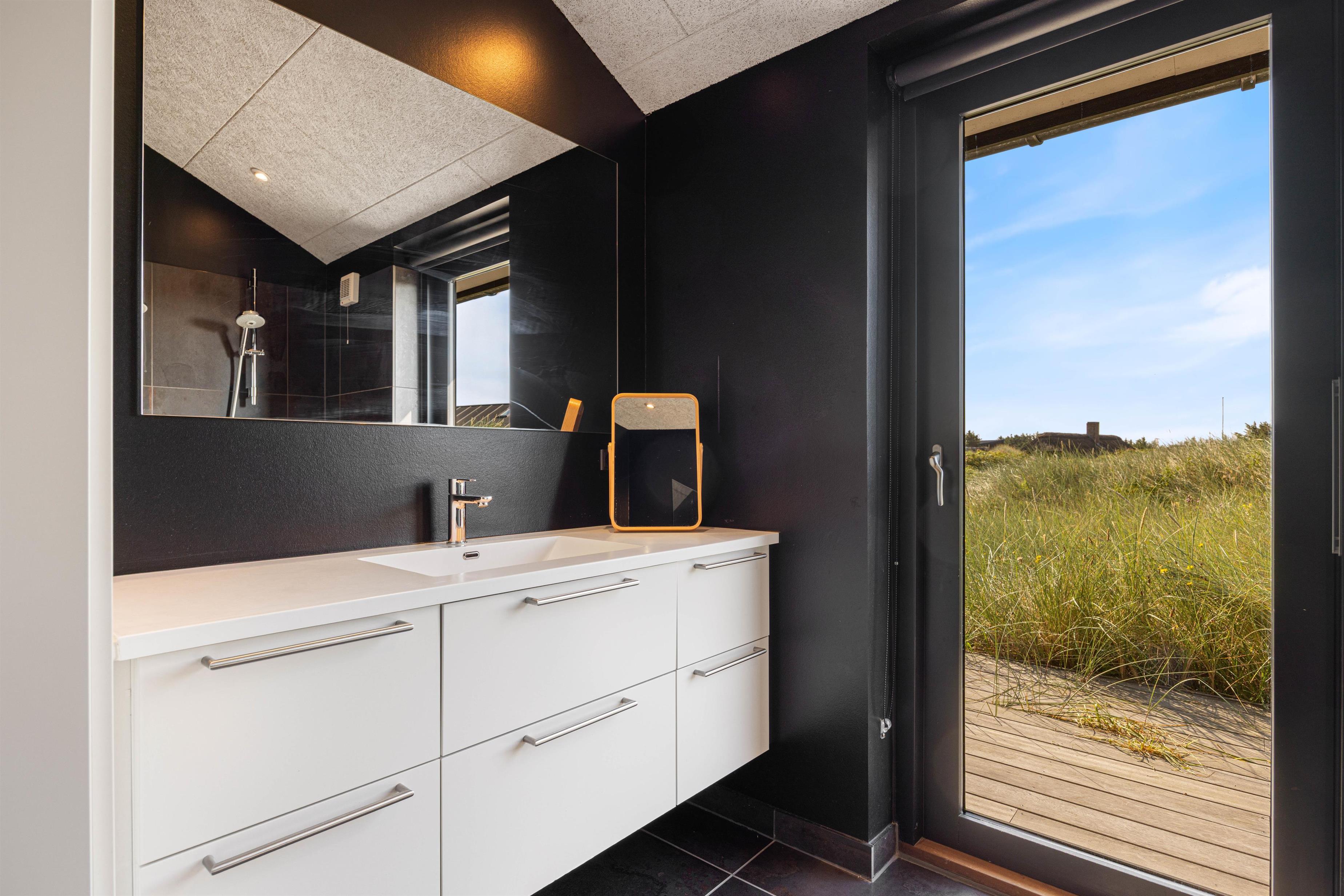 De klare linjer og den moderne indretning sammen med de smukke afstemte farver spejler smukt den smukke rå vestjyske natur, der omgiver huset, og sammen skabes der en helt speciel atmosfære. Feriehuset rummer tre dobbeltværelser og to badeværelser, det ene med to brusere og håndvaske.