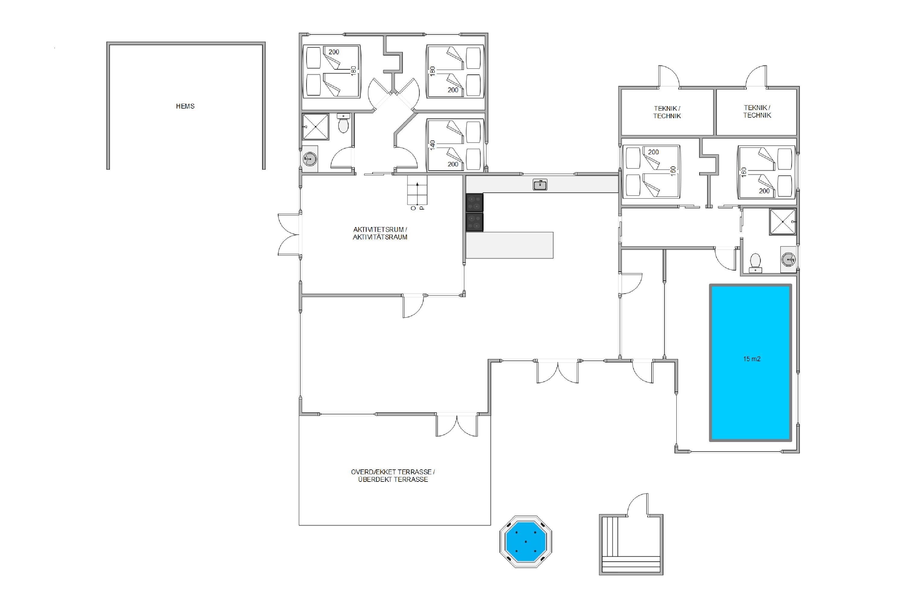 Det fantastiske udvalg af aktiviteter gør dette poolhus til et sandt paradis for underholdning. Den 15 m² store pool inviterer til afslapning og vandleg for både store og små. Som et aktivitetshus tilbyder det også en bred vifte af indendørs aktiviteter som poolbillard og bordtennis, hvilket sikrer sjov og leg for hele familien. Haven byder på en trampolin, der vil begejstre de yngre gæster, samt en indbydende naturgrund med gynger og sandkasse.