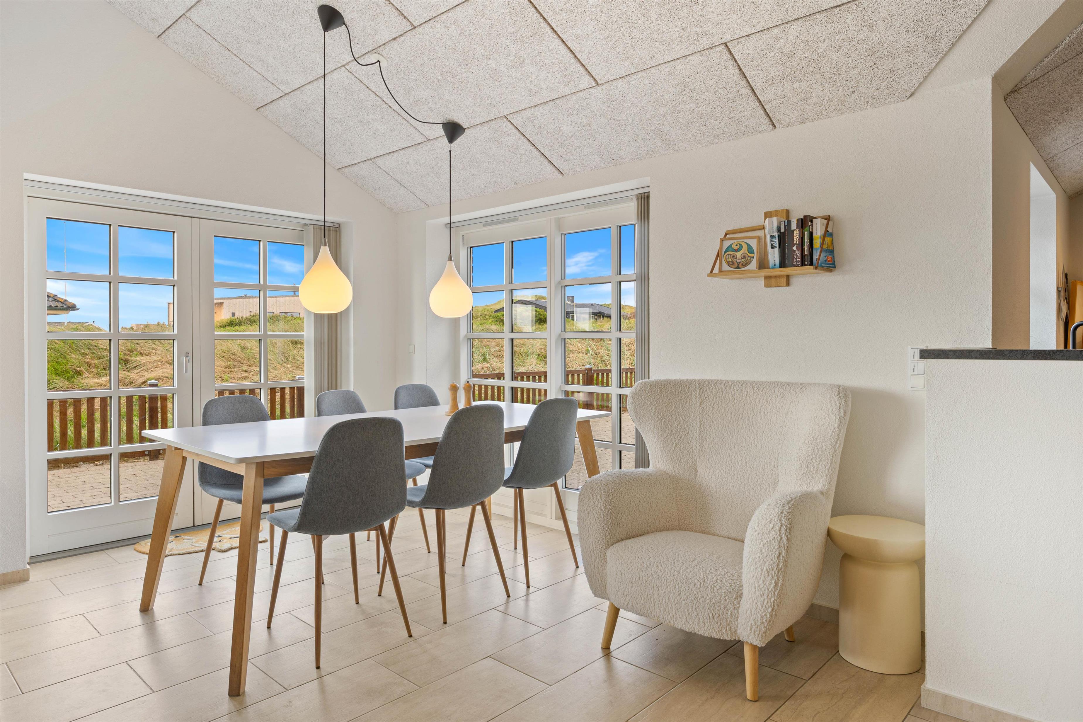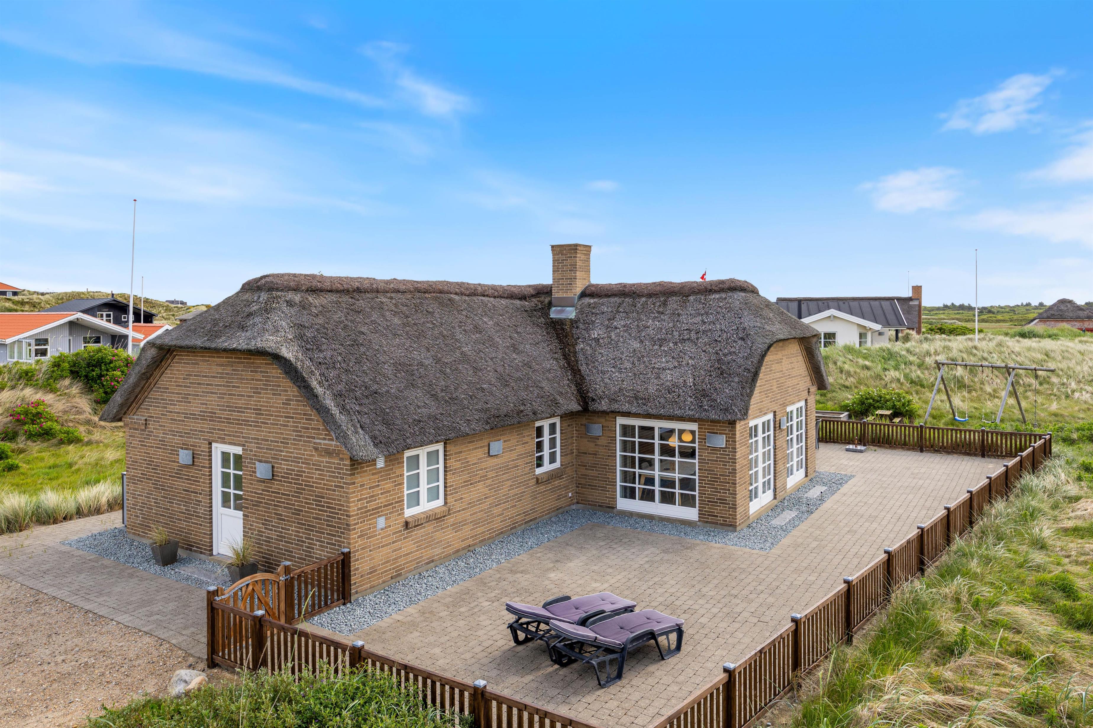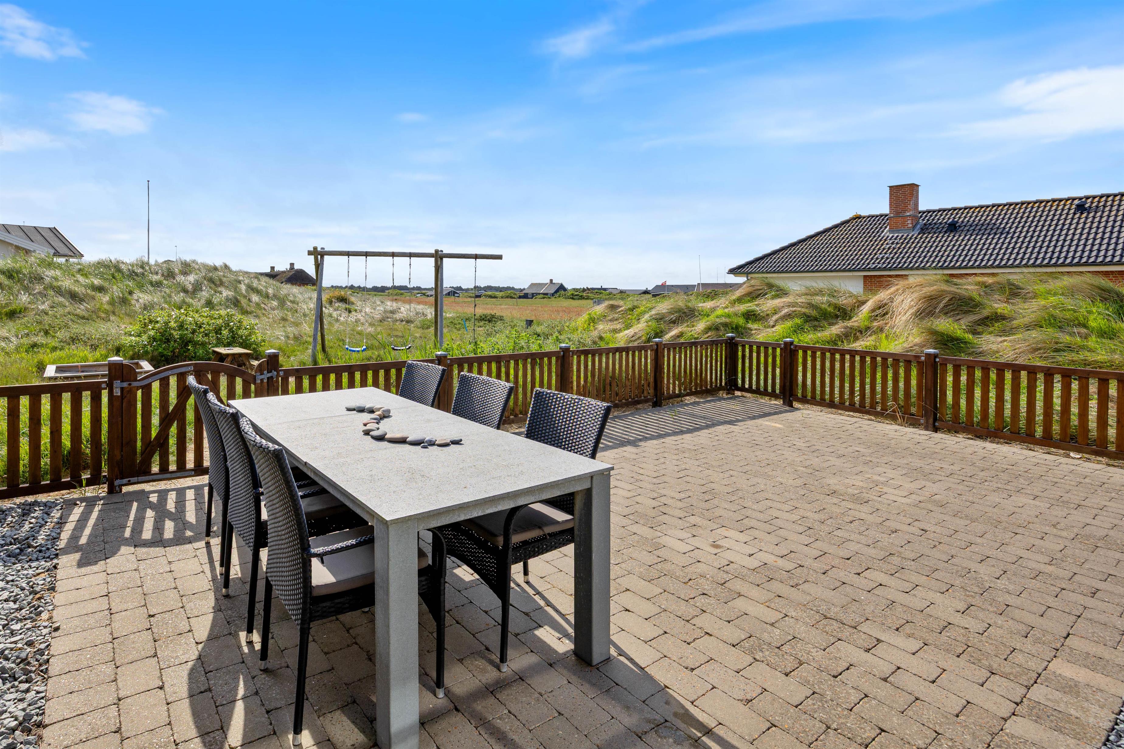 Feriehuset er omkranset af en rigtig dejlig og helt lukket terrasse, hvor I kan slappe af og nyde solen eller hygge jer med en hyggelig grillaften. For de mindste feriegæsters fornøjelse, er her et gyngestativ og sandkasse. Og med den gode beliggenhed er det endda muligt at nyde lyden af Vesterhavet bølger på terrassen. Så her kan I roligt læne jer tilbage i havestolen og nyde den friske luft.