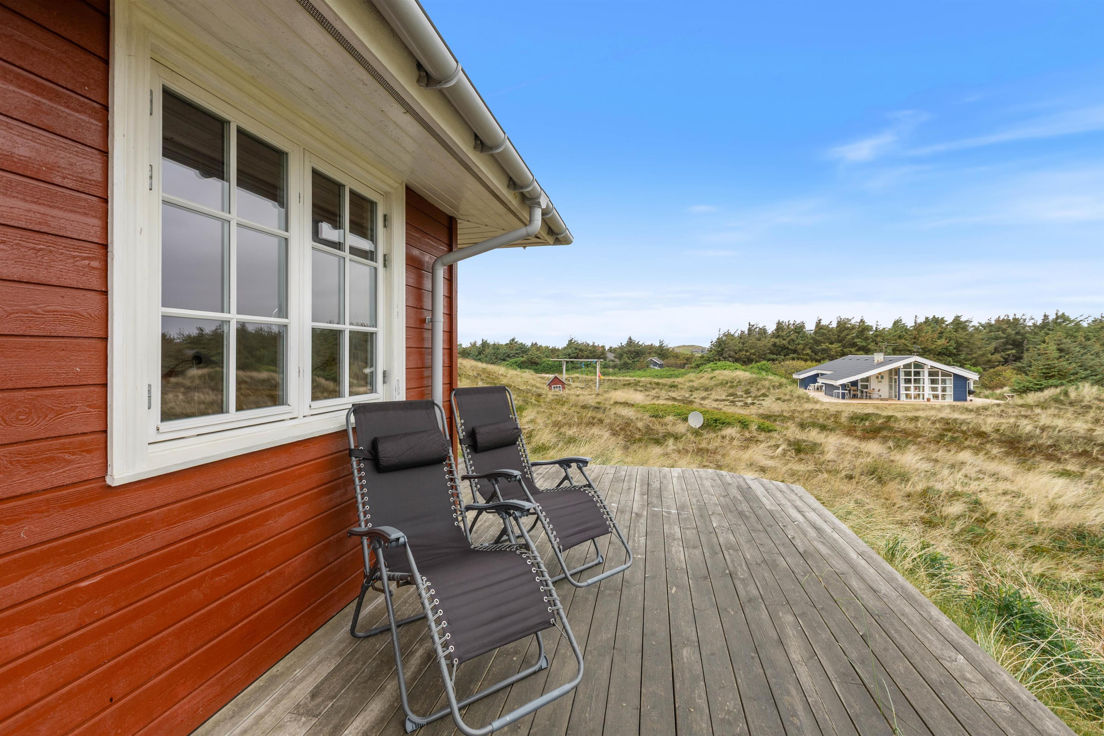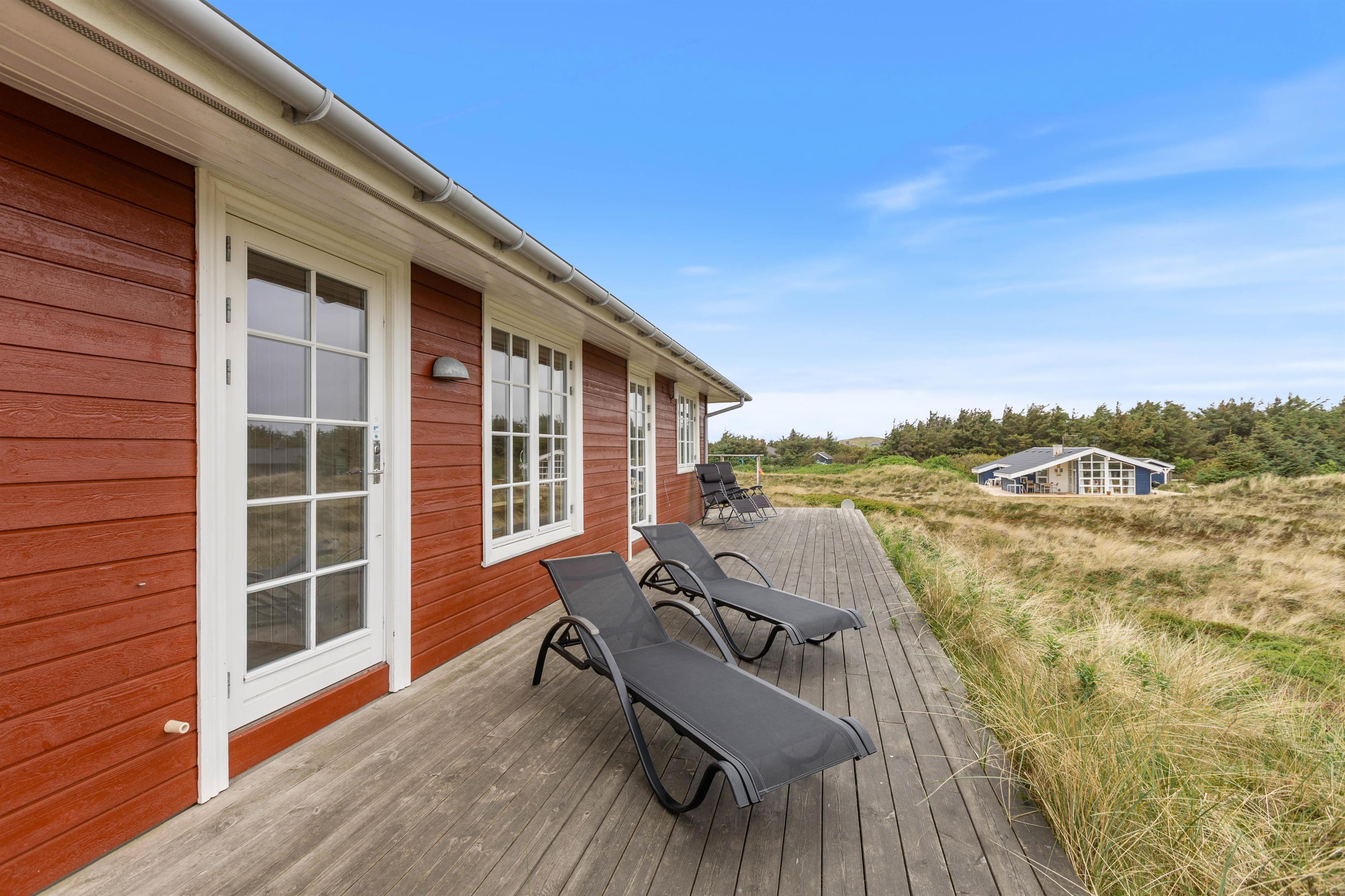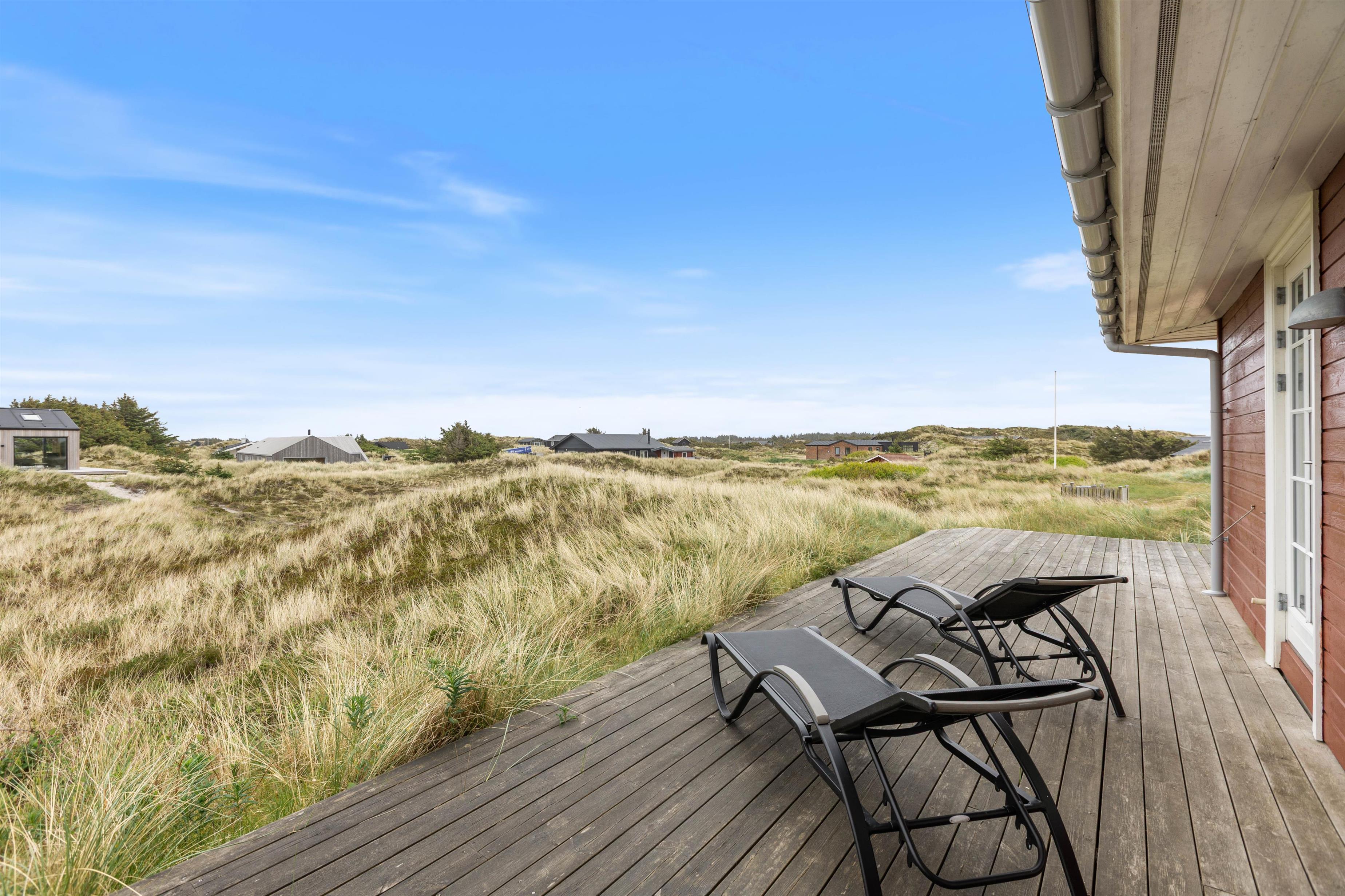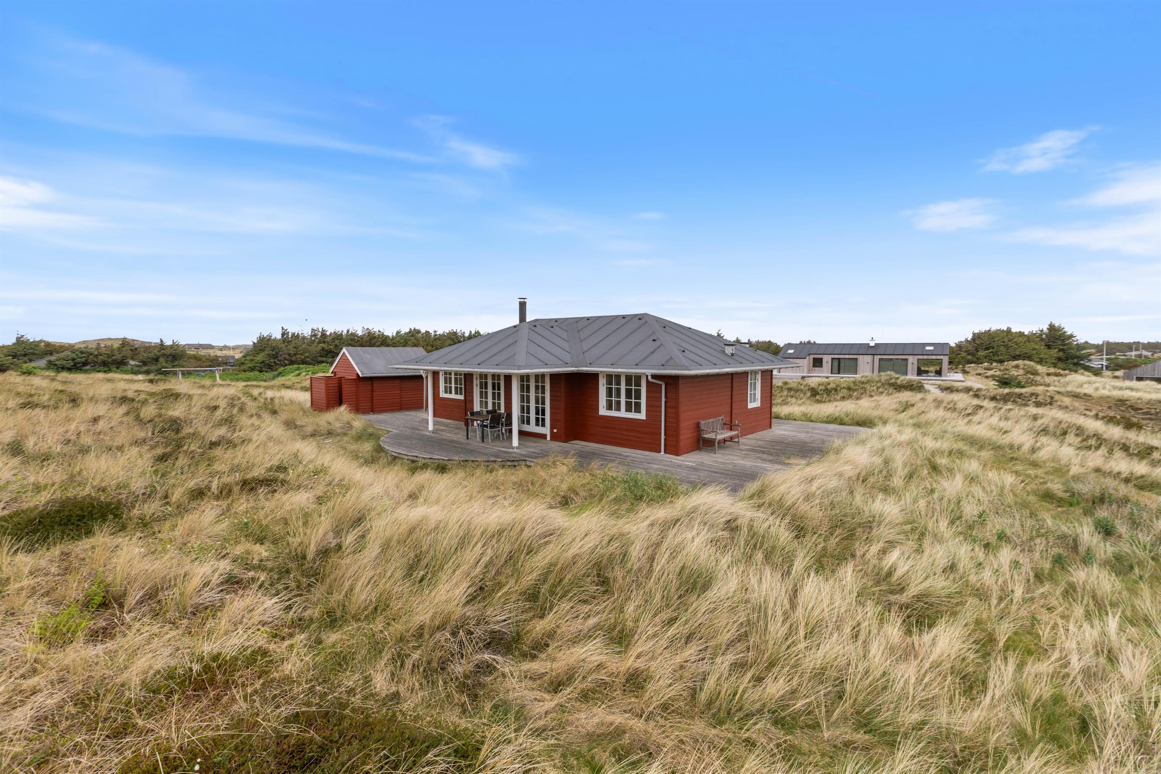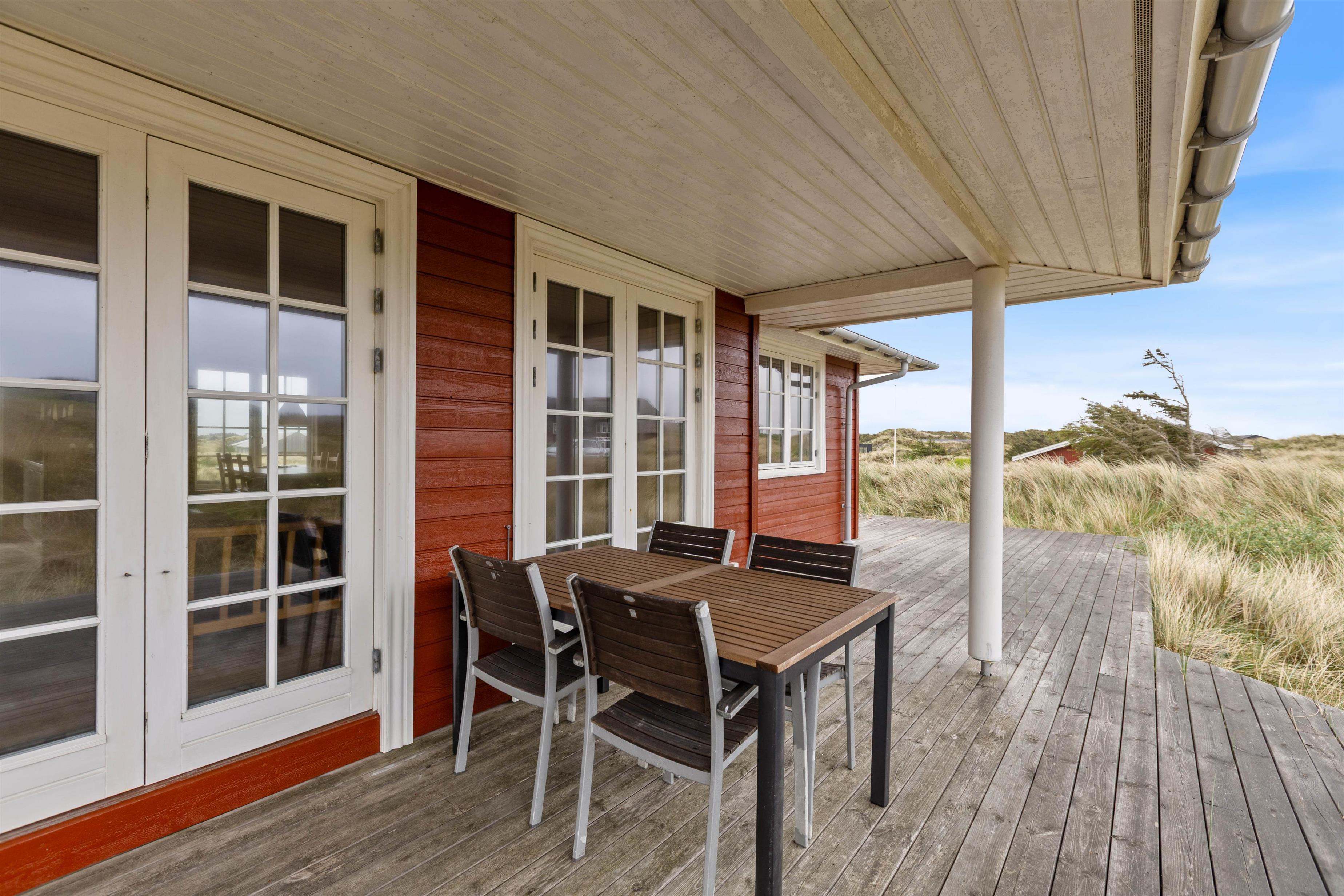 Huset ligger tæt på Vesterhavet på en herlig naturgrund og med et helt enestående udsigt ud over området. En stor dejlig terrasse omkranser dette flotte røde hus. Fra stuen kan man åbne de to terrasse døre og stuen fortsætter ud til en skøn, overdækket terrasse. Uanset hvor vinden kommer fra kan man altid finde læ, da terrassen fortsætter hele vejen rundt om huset.