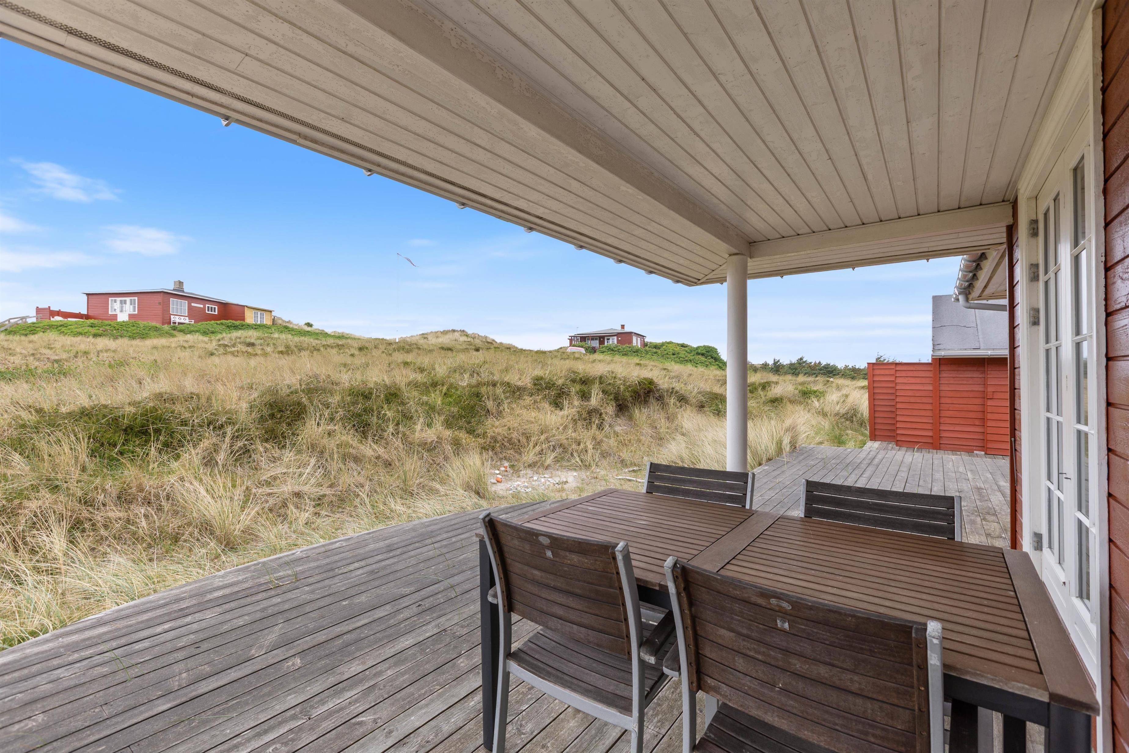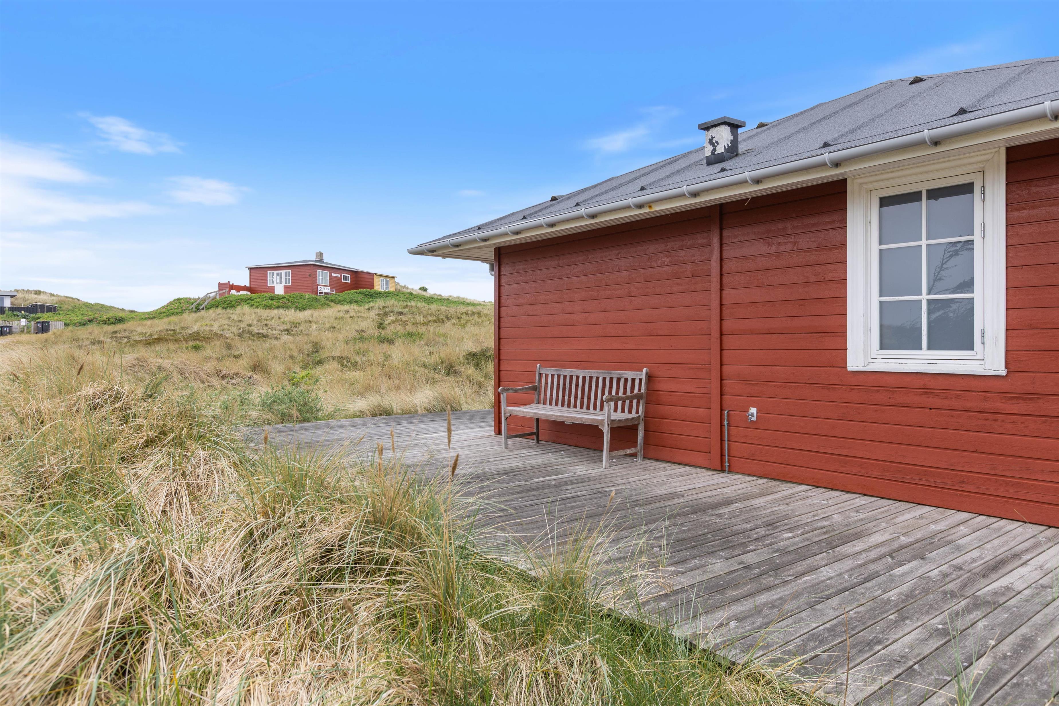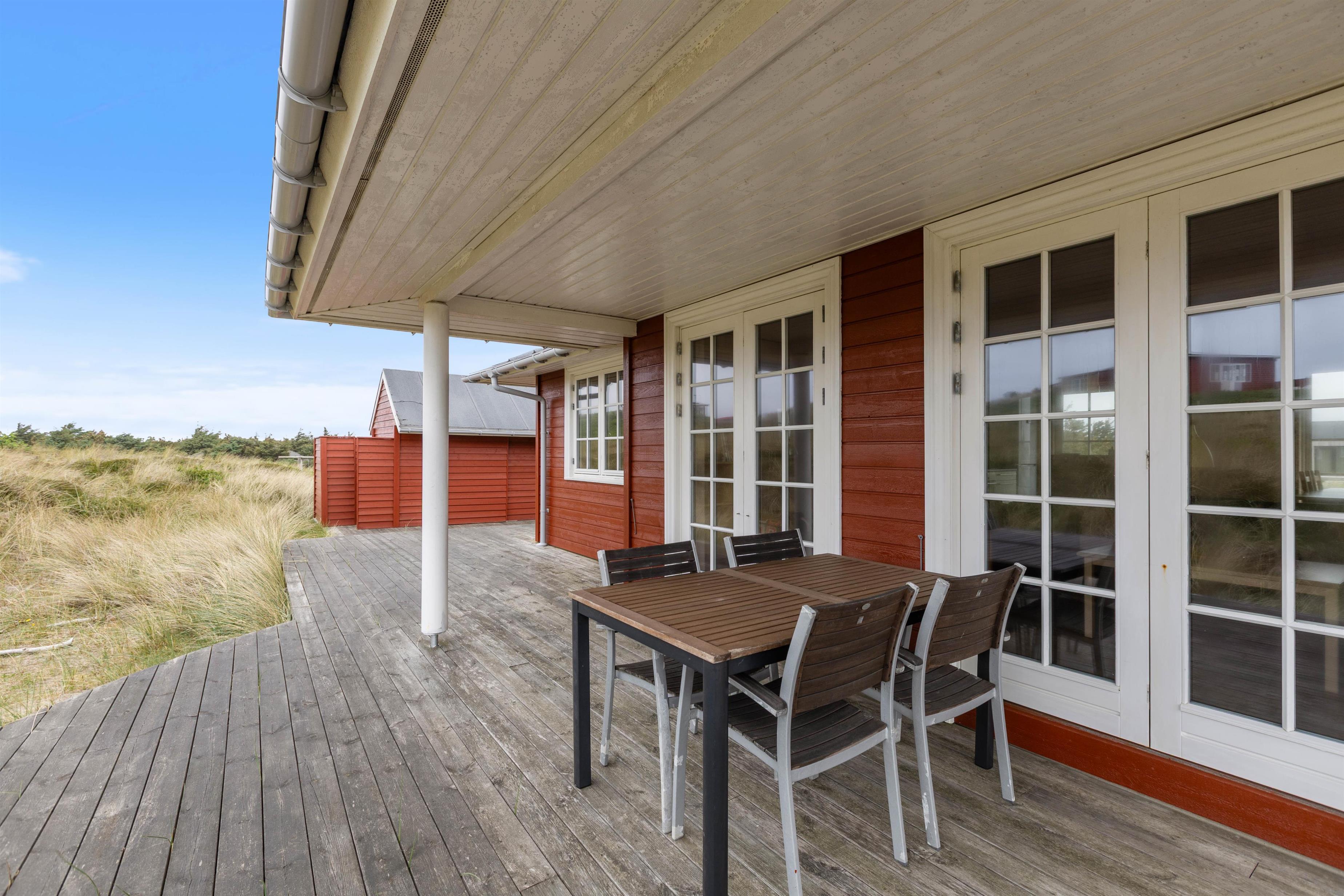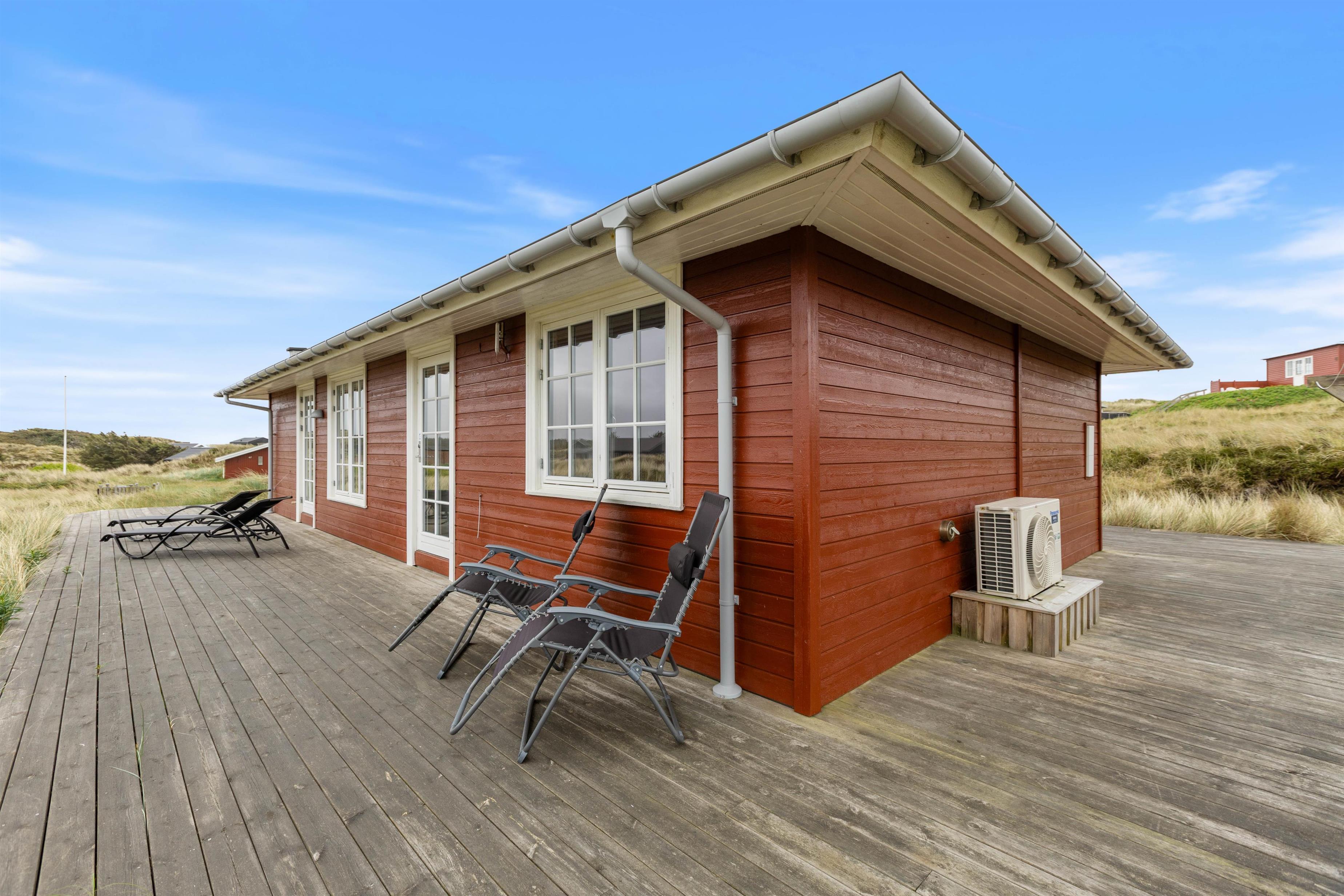 Huset ligger tæt på Vesterhavet på en herlig naturgrund og med et helt enestående udsigt ud over området. En stor dejlig terrasse omkranser dette flotte røde hus. Fra stuen kan man åbne de to terrasse døre og stuen fortsætter ud til en skøn, overdækket terrasse. Uanset hvor vinden kommer fra kan man altid finde læ, da terrassen fortsætter hele vejen rundt om huset.