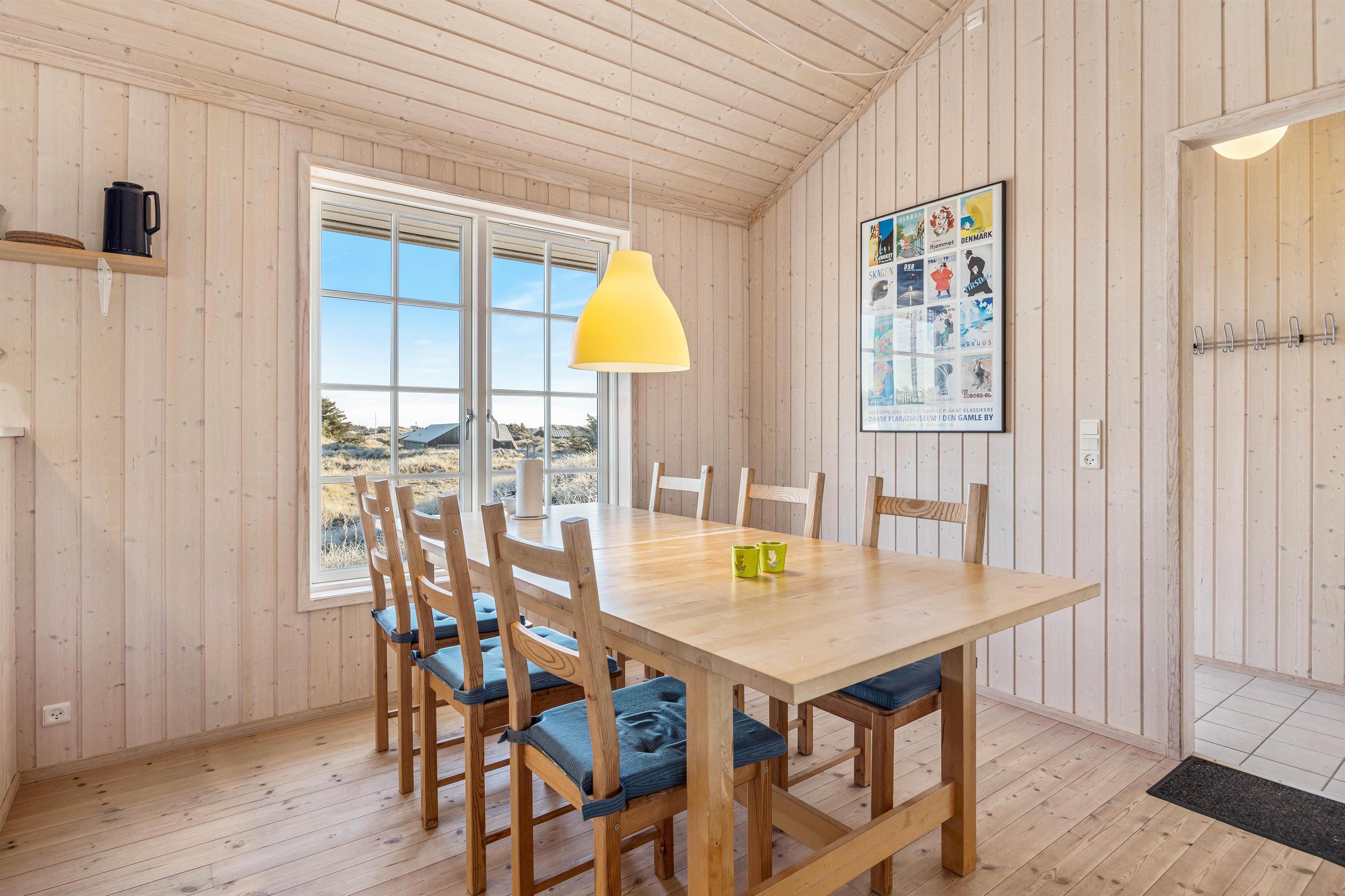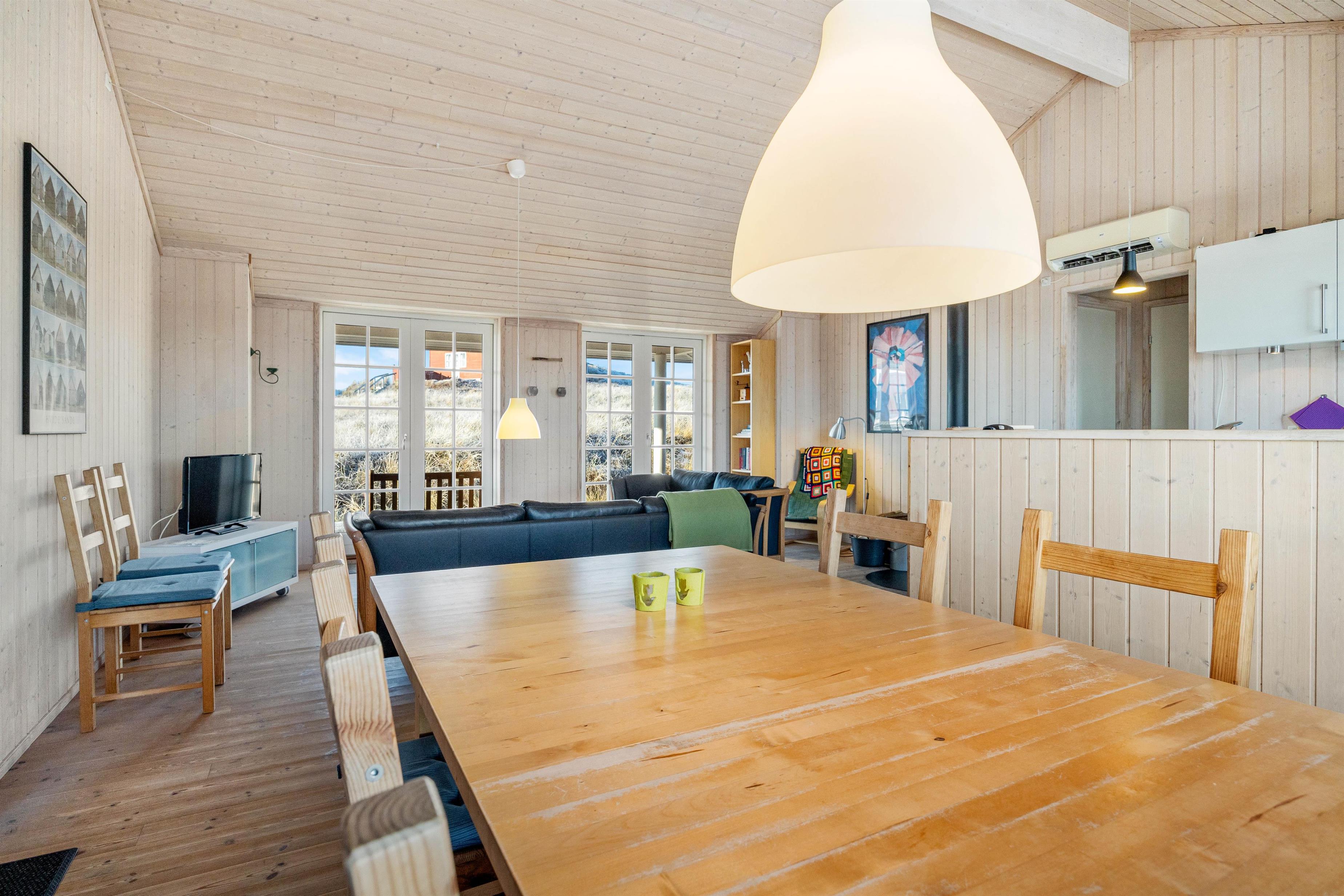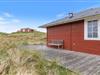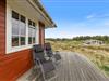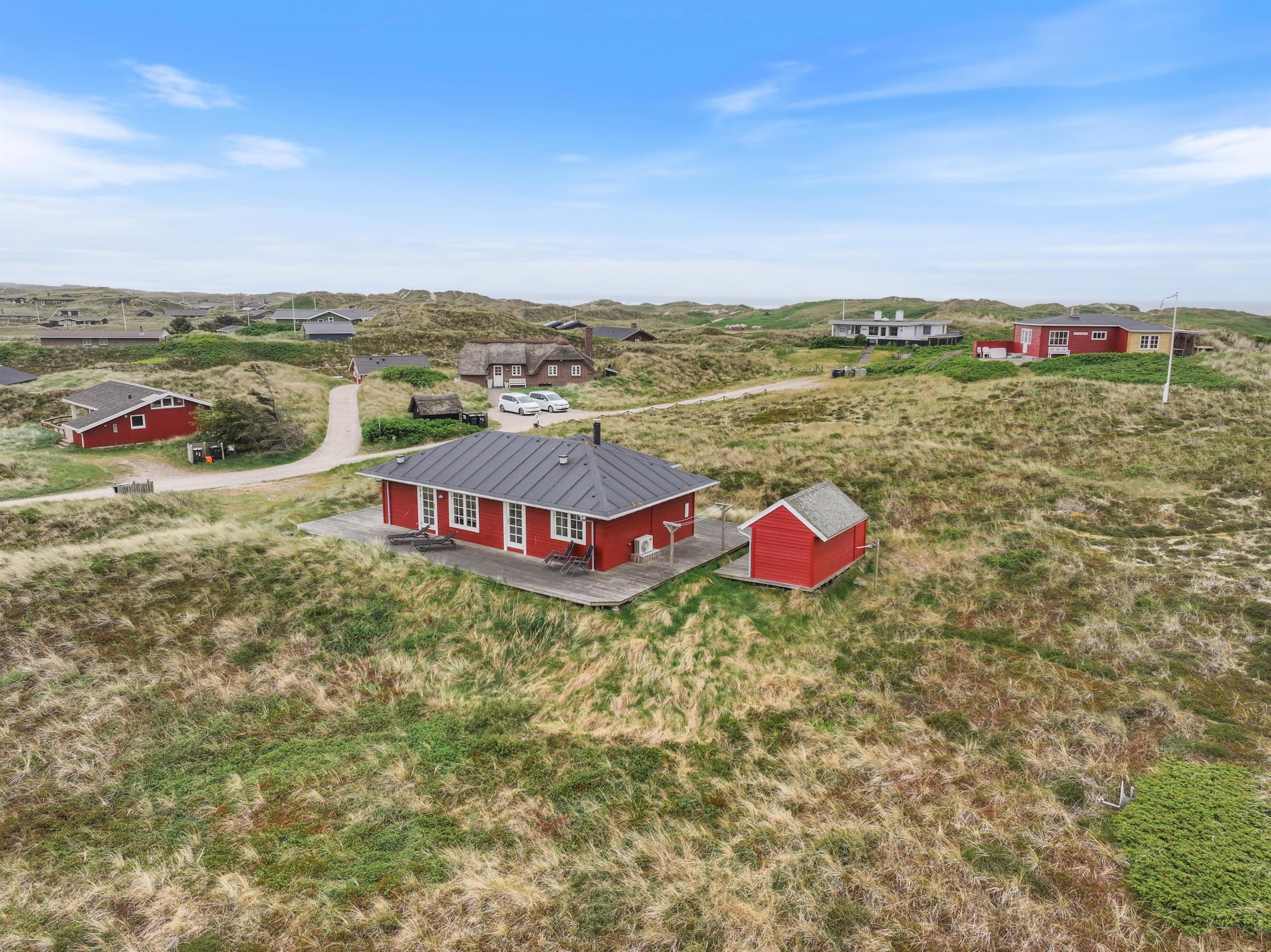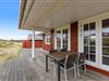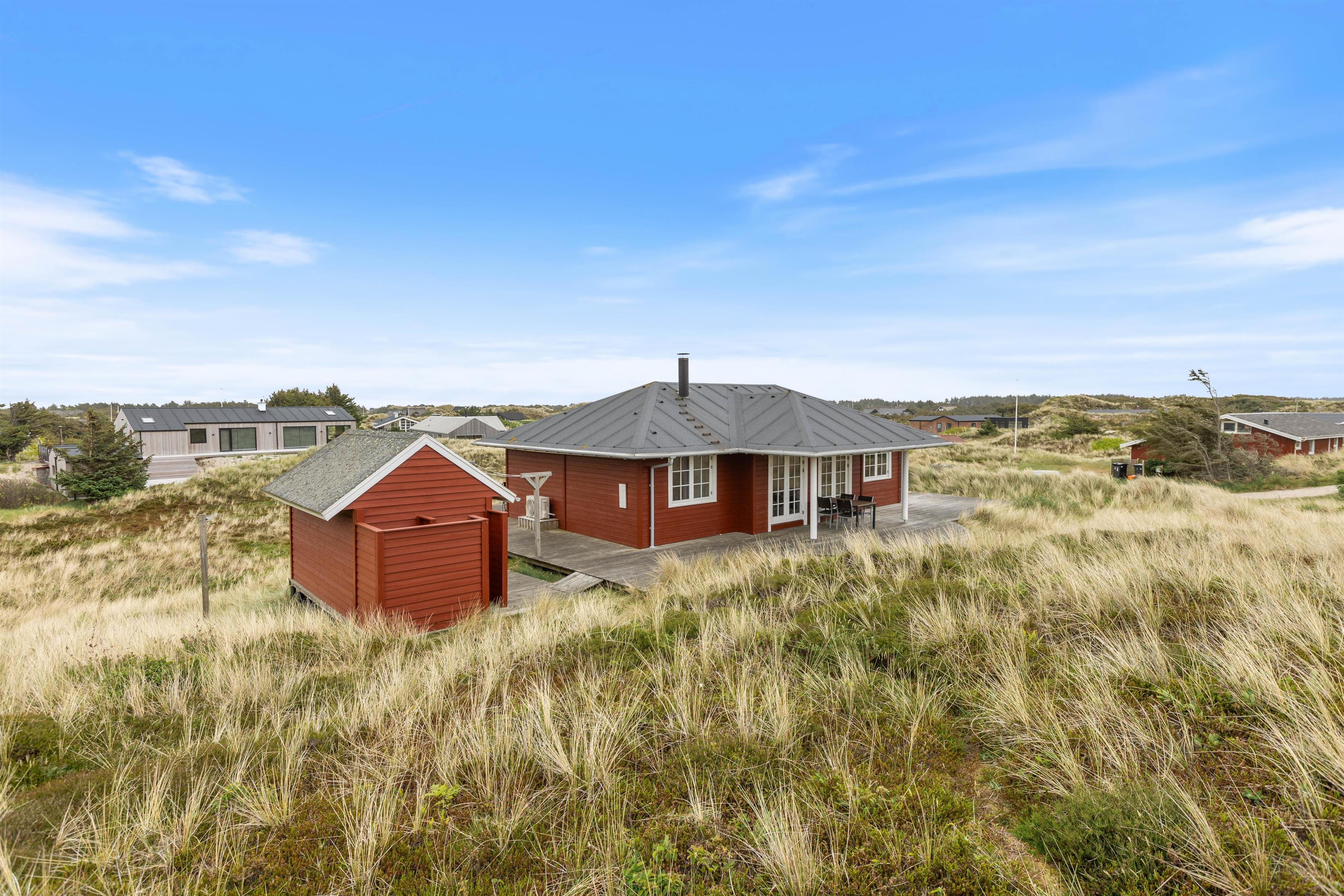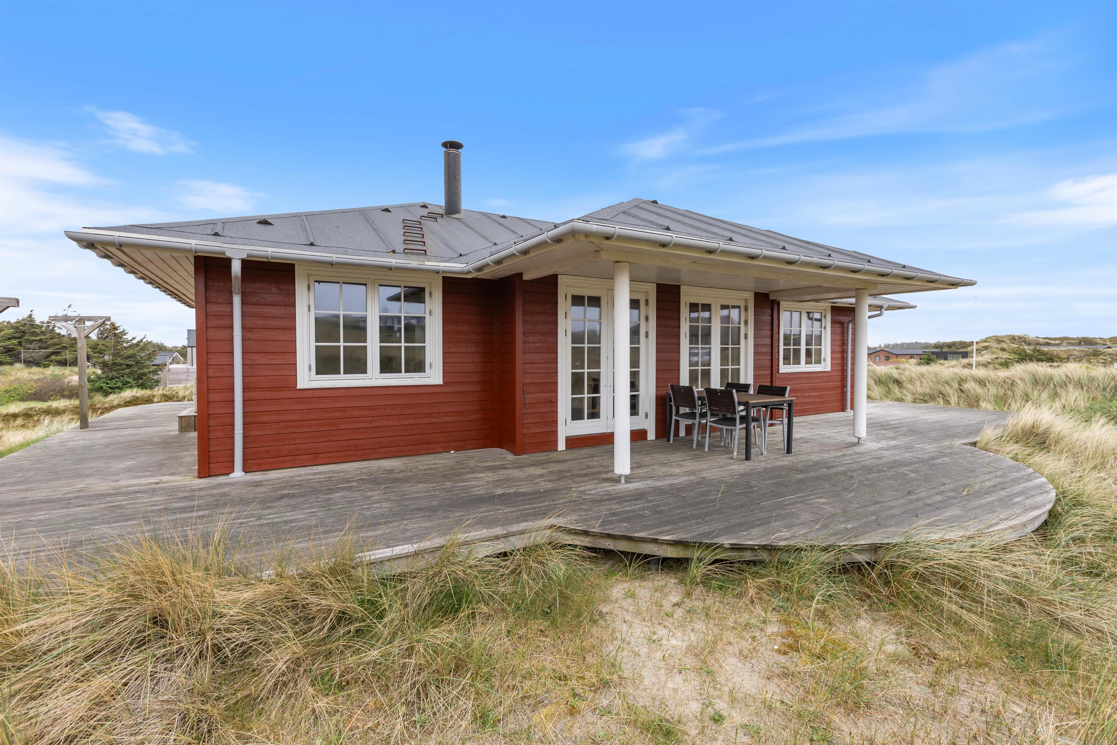 Huset ligger tæt på Vesterhavet på en herlig naturgrund og med et helt enestående udsigt ud over området. En stor dejlig terrasse omkranser dette flotte røde hus. Fra stuen kan man åbne de to terrasse døre og stuen fortsætter ud til en skøn, overdækket terrasse. Uanset hvor vinden kommer fra kan man altid finde læ, da terrassen fortsætter hele vejen rundt om huset.